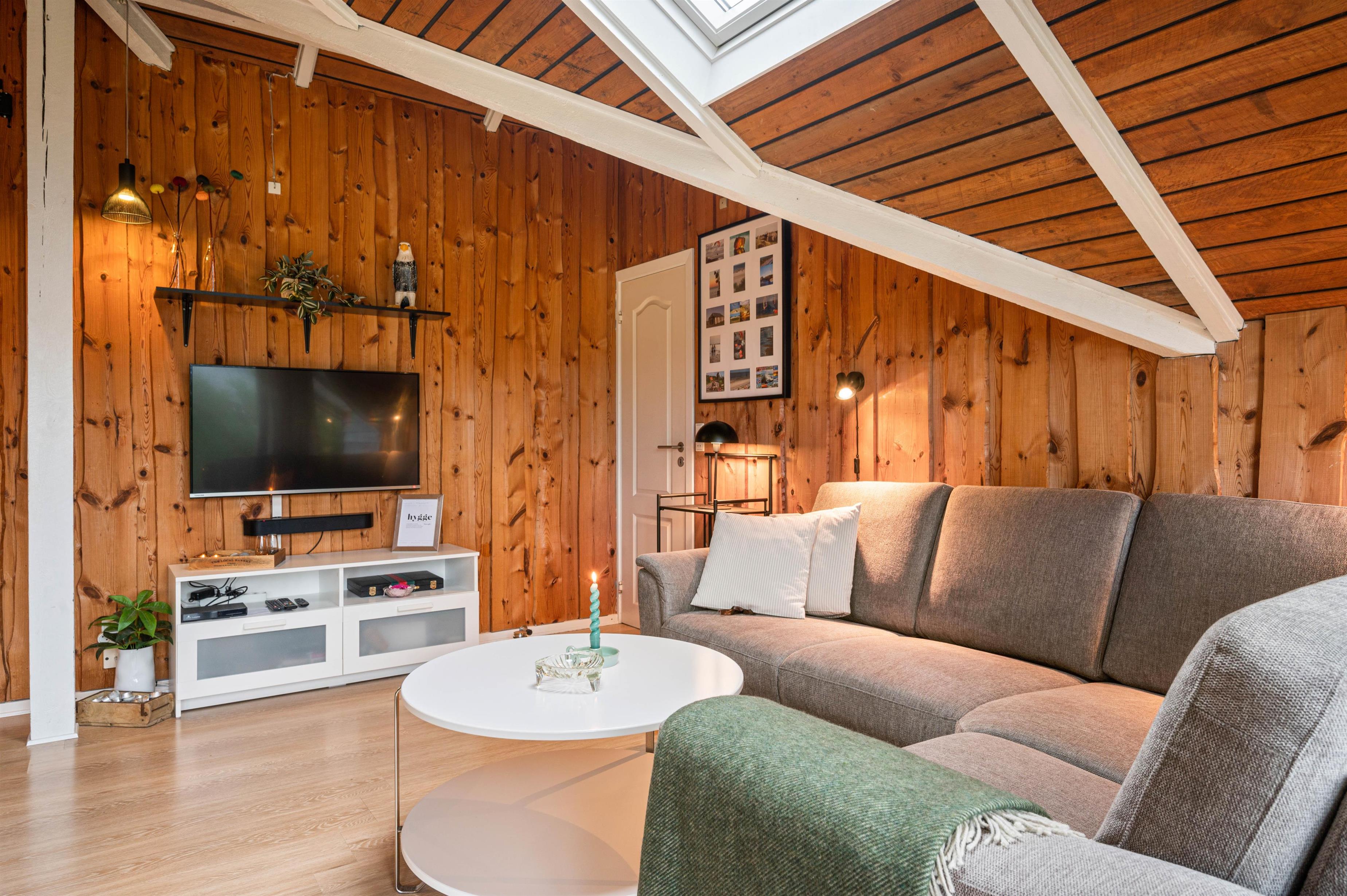 Opholdsrum med hyggeligt sofahjørne og brændeovn