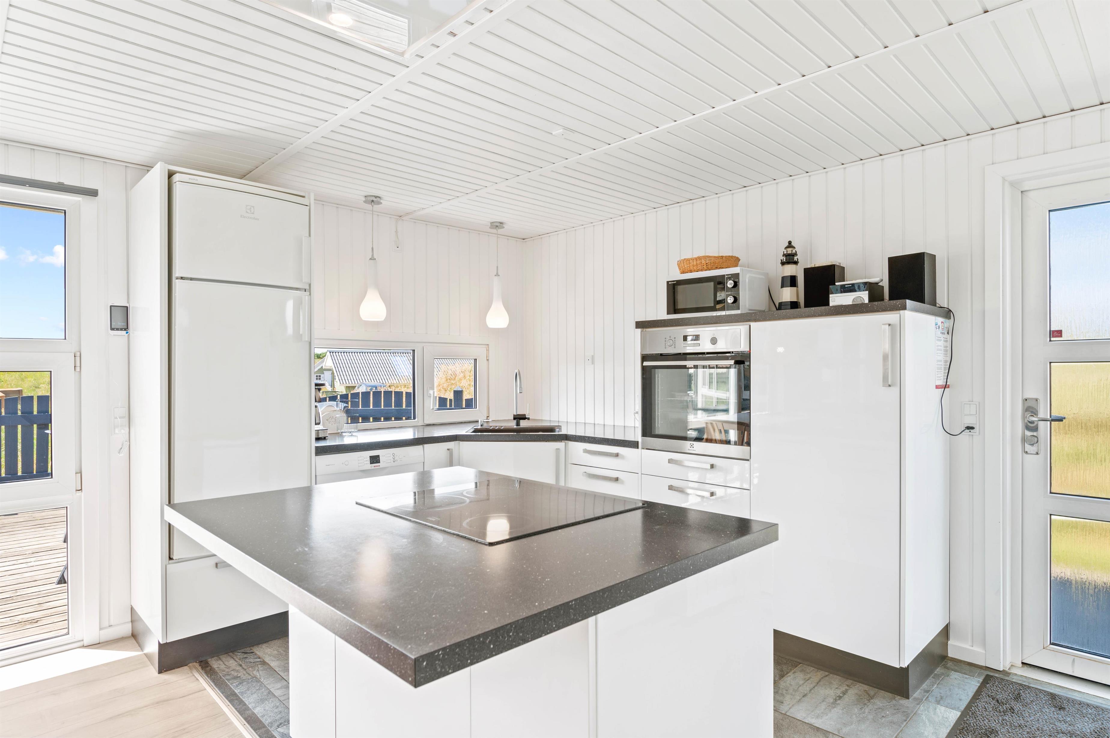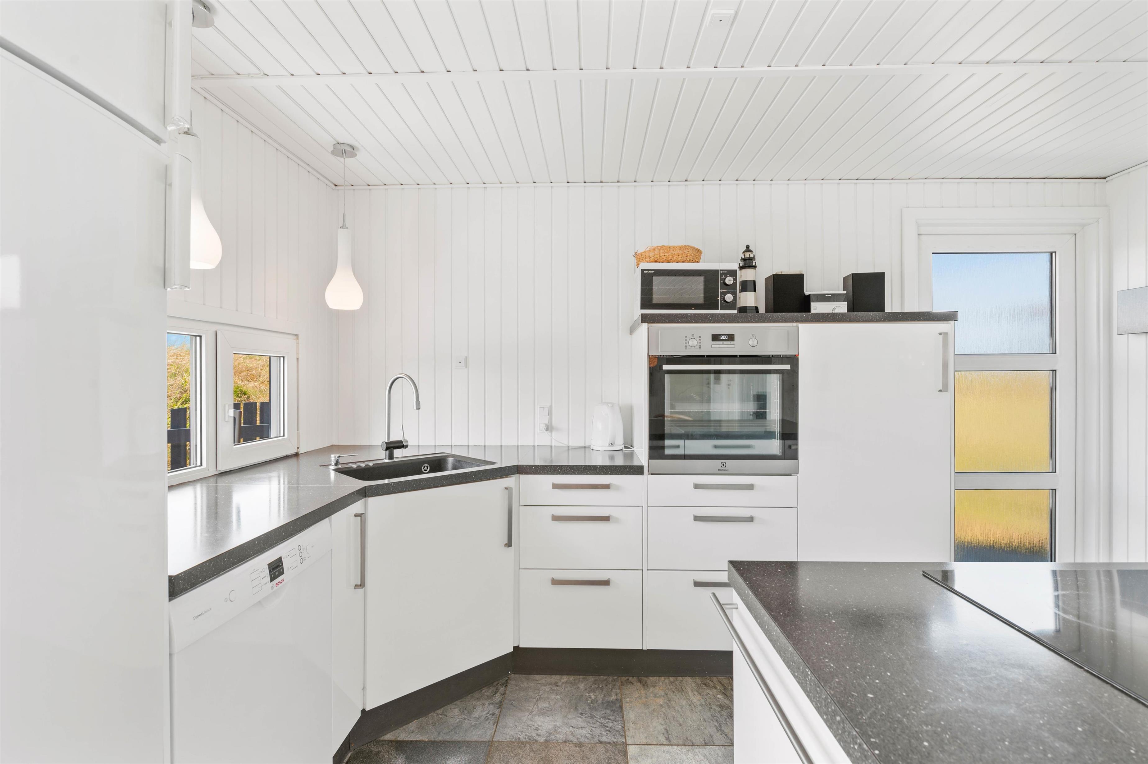 Sommerhuset på Julianevej 88 i Bjerregård er renoveret i 2022. Her er plads til 8 personer og eventuelt et par firbenede venner. Det lyse og praktisk indrettede køkken er åbent i forbindelse med den rummelige stue. Her er spiseplads til 8 personer og en sofaafdeling med brændeovn og fladskærms-TV, så I kan arrangere fælles madlavning i køkkenet samtidig med brætspil ved spisebordet - eller nogle ønsker måske i stedet at læse en god bog foran brændeovnen eller tjekke nyhederne på TV’et.
