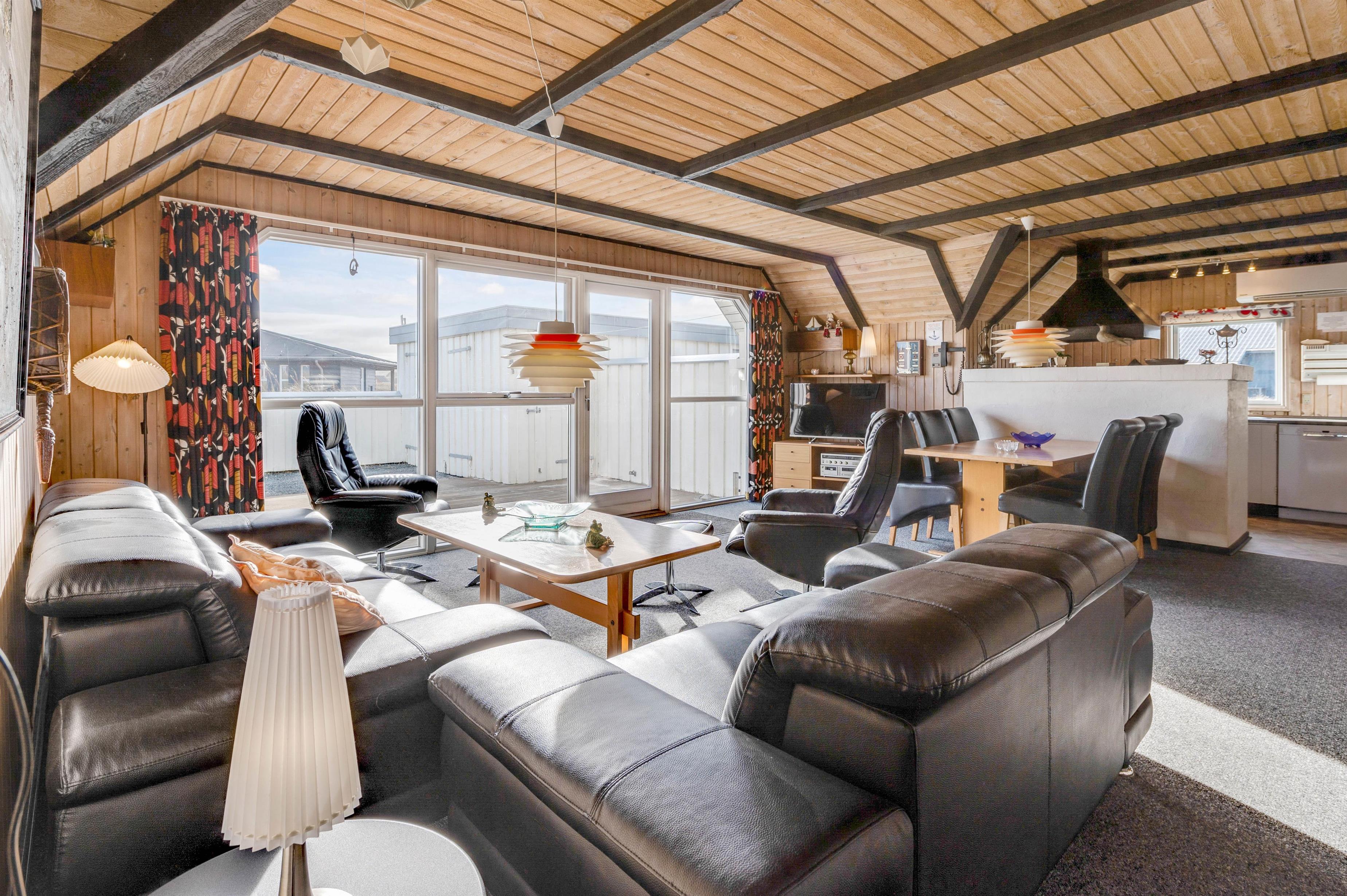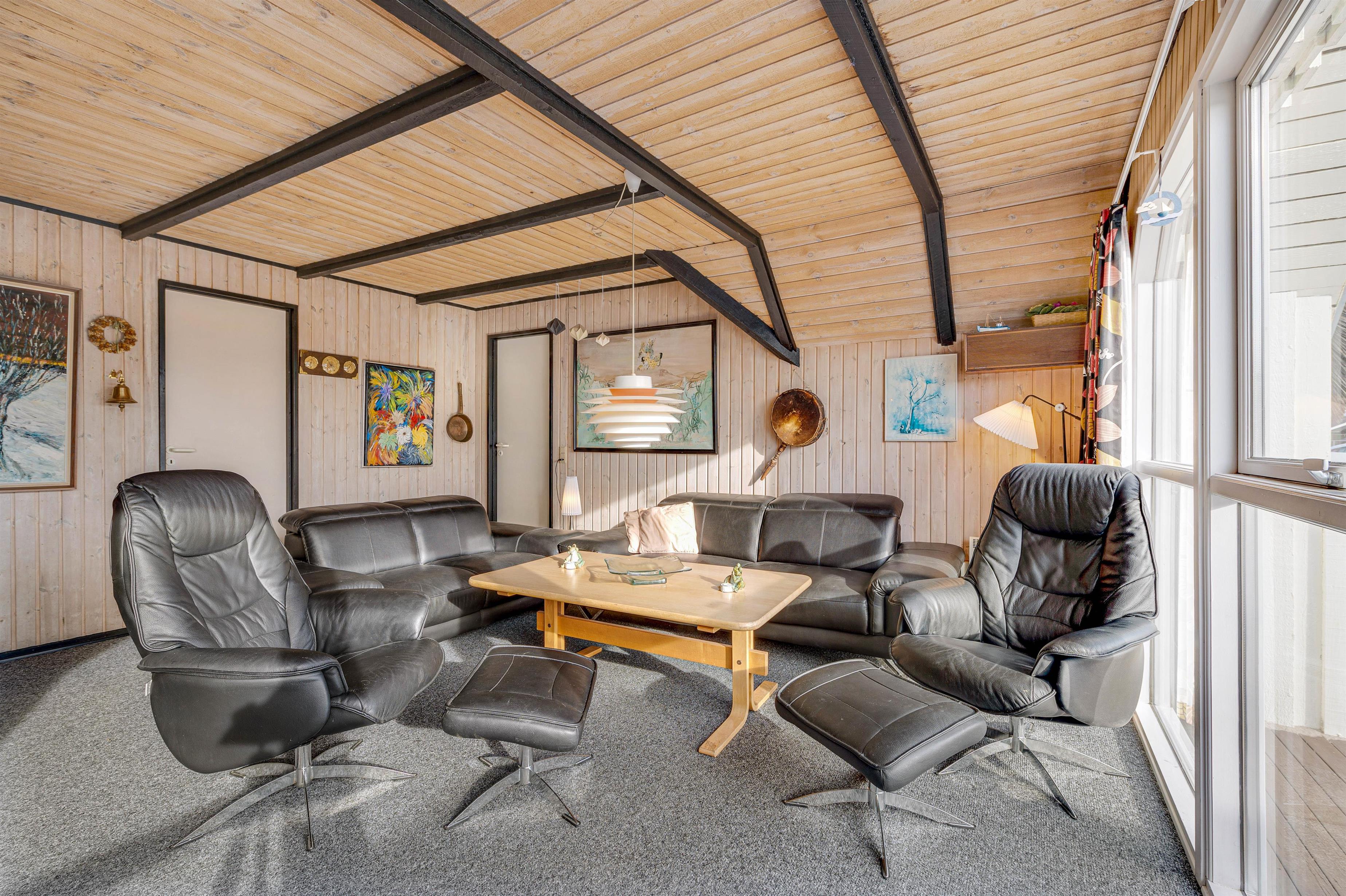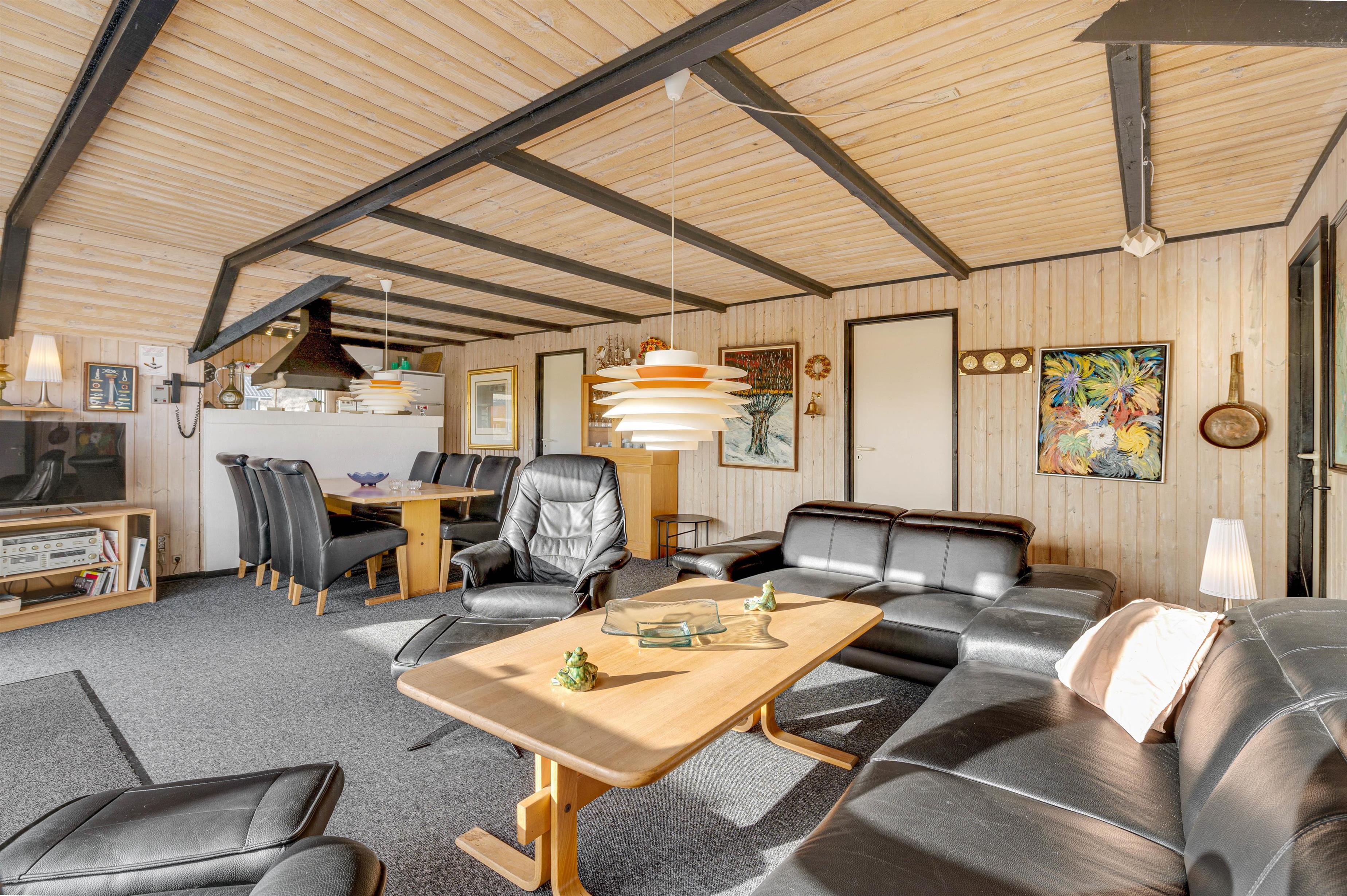 Et sommerhus i træ og med stråtag er for mange et rigtigt sommerhus. Her er det basale for at holde en dejlig ferie, og så er beliggenheden nær stranden et plus! Indenfor er der plads til, at familien kan samles i stuen – både til afslapning sammen og hver for sig. Den hyggelige stue har gulvtæppe og bløde lædermøbler, som indbyder til en god bog i sofaen.