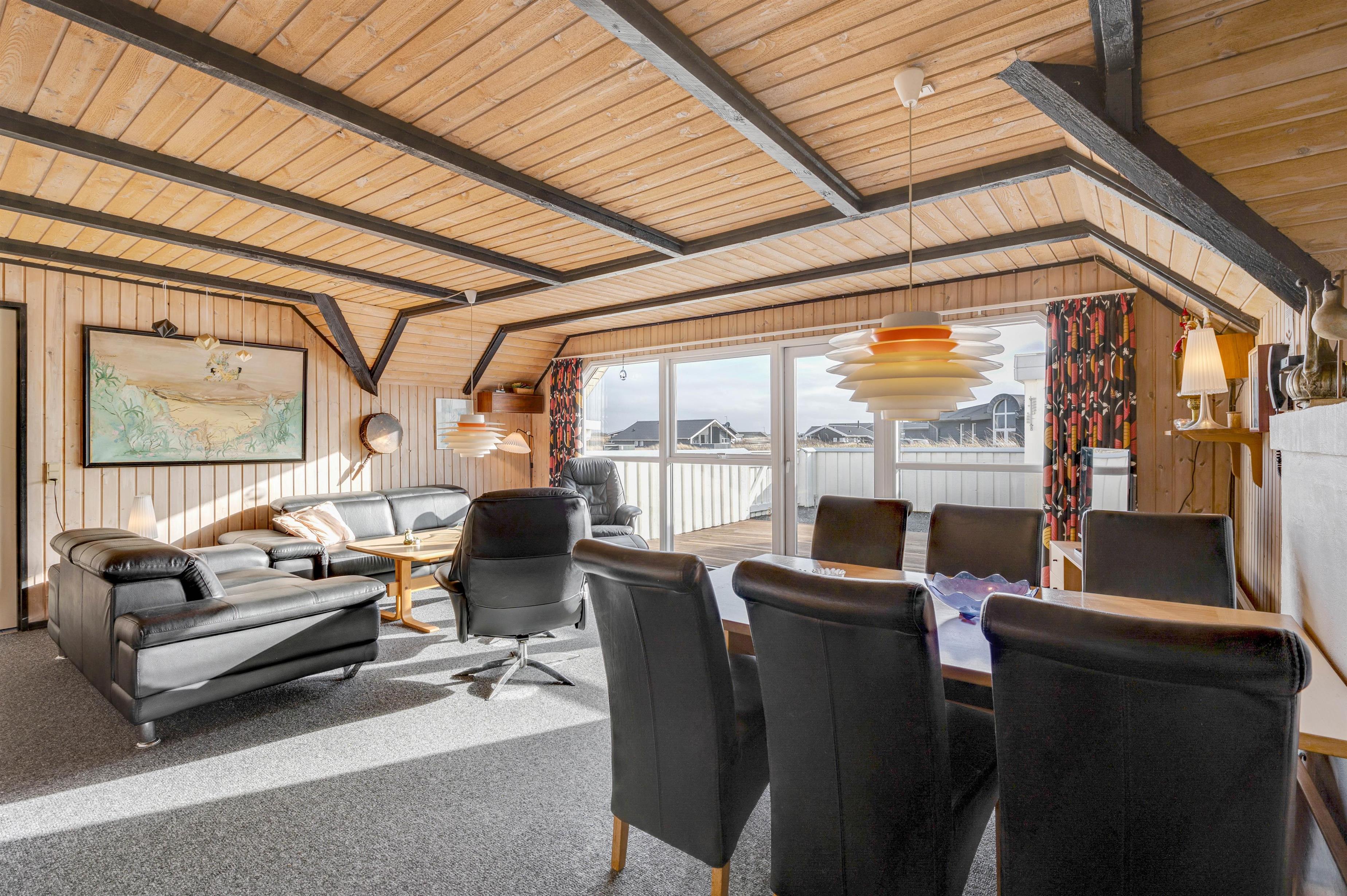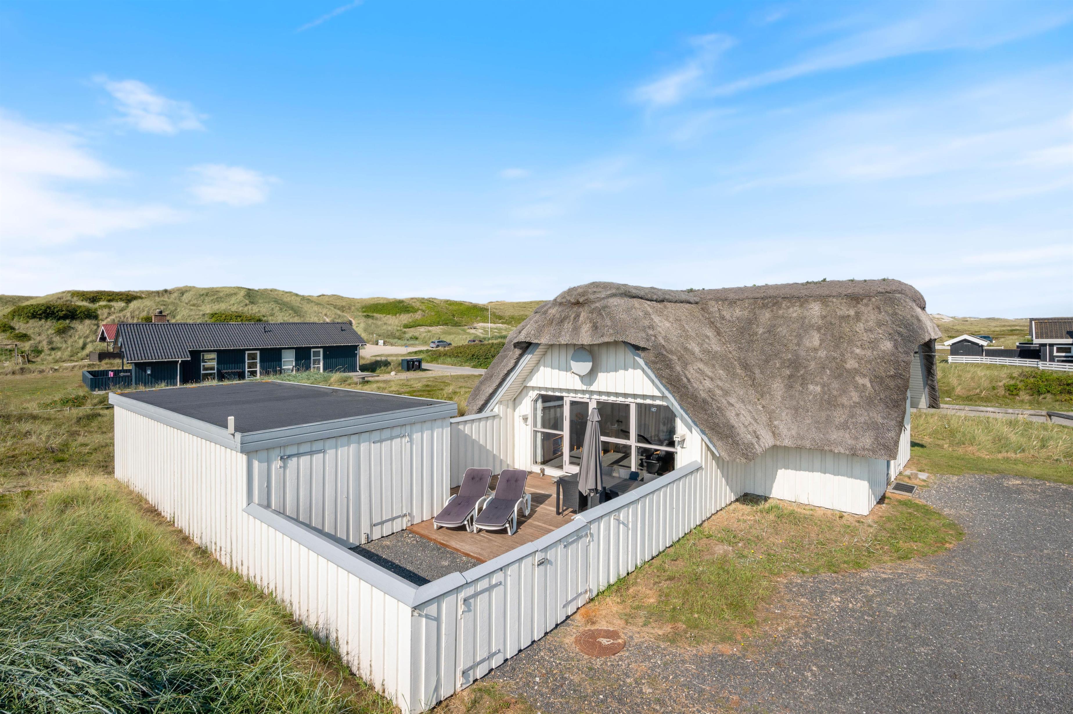 Dette fine klassiske sommerhus med stråtag er beliggende på Bjerregårdsvej 400 få minutter fra Vesterhavet, der kun er 100 meter væk. På den lukkede terrasse kan de mindste boltre sig, og det samme gælder familiens hund, som også er velkommen.