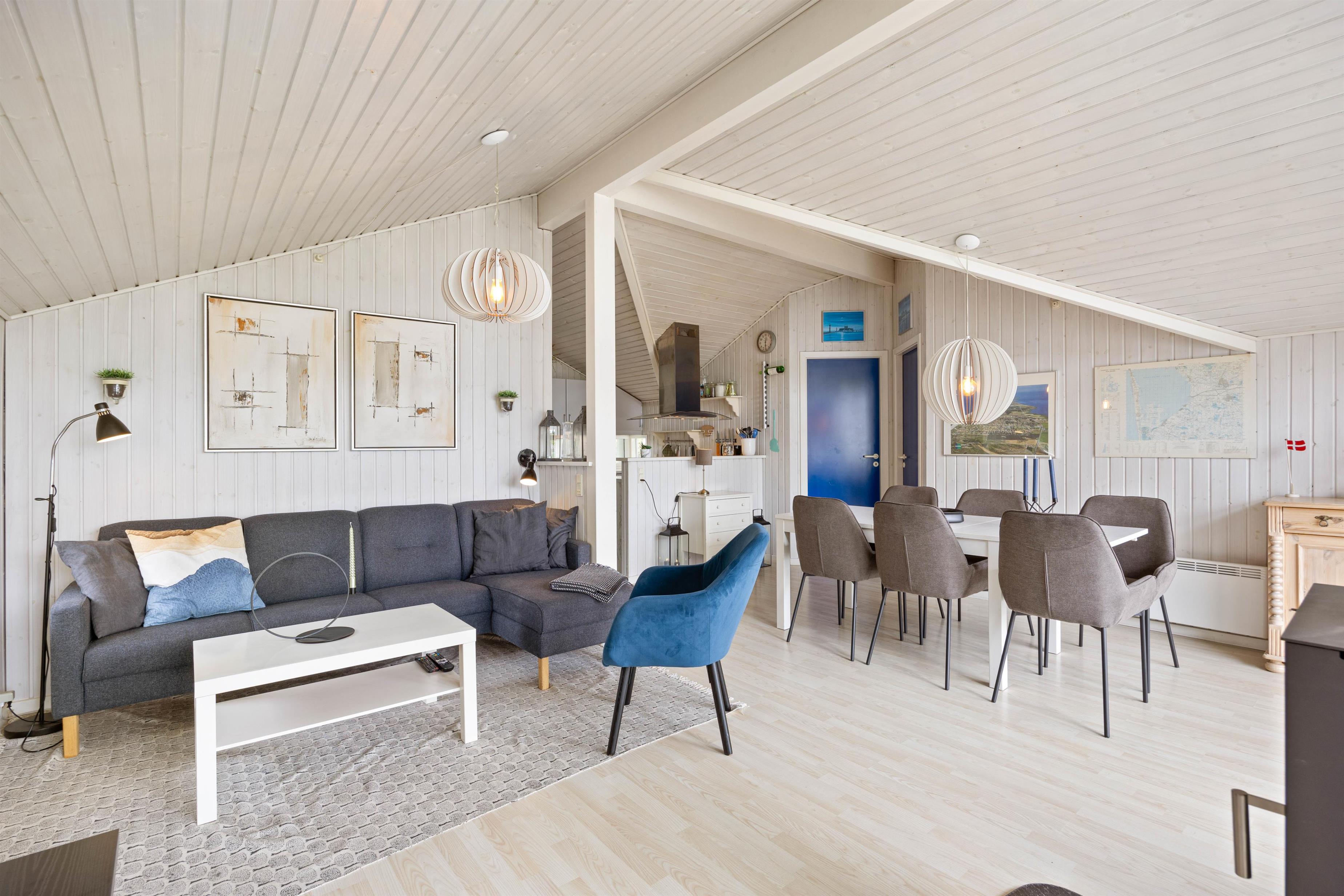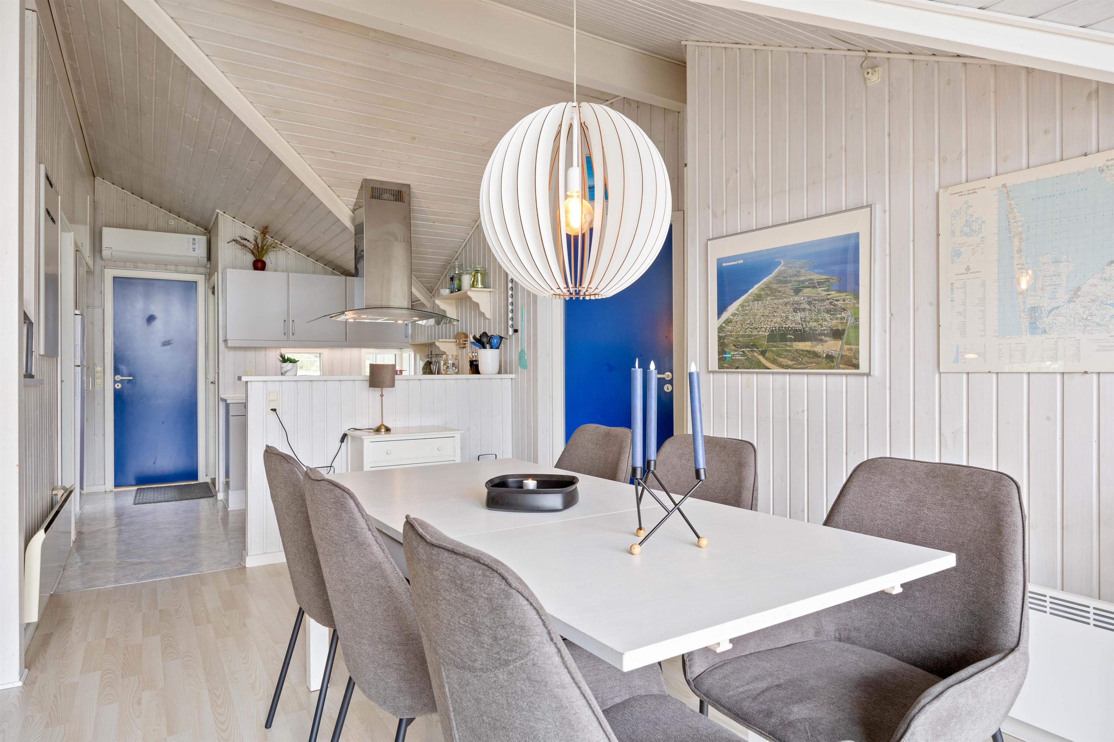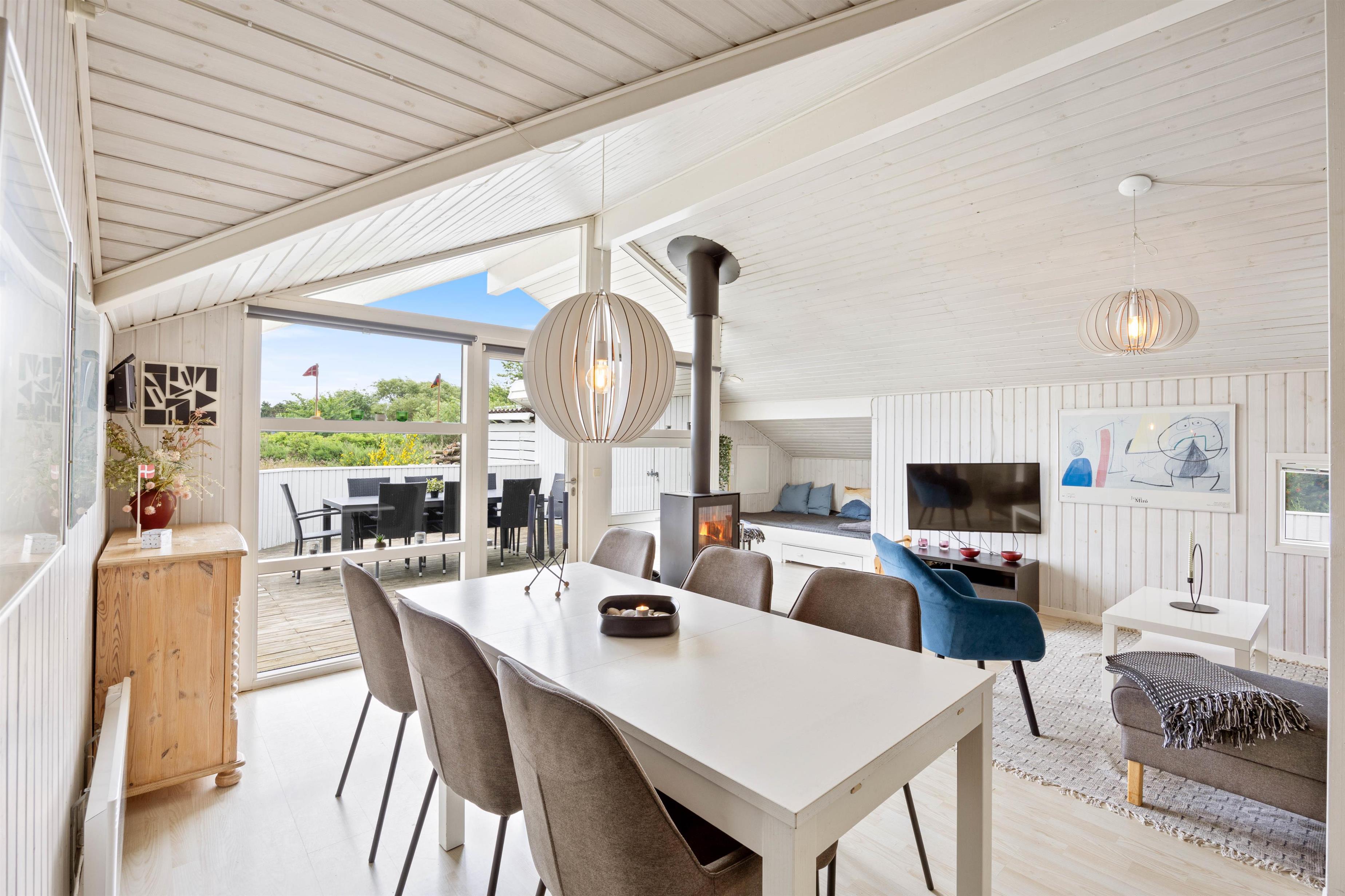 Indvendigt præsenterer sommerhuset sig også dejlig lyst. Feriehusets hjerte er den fine spisestue med integreret køkken, hvor I sammen kan slappe af, lave mad og spise.