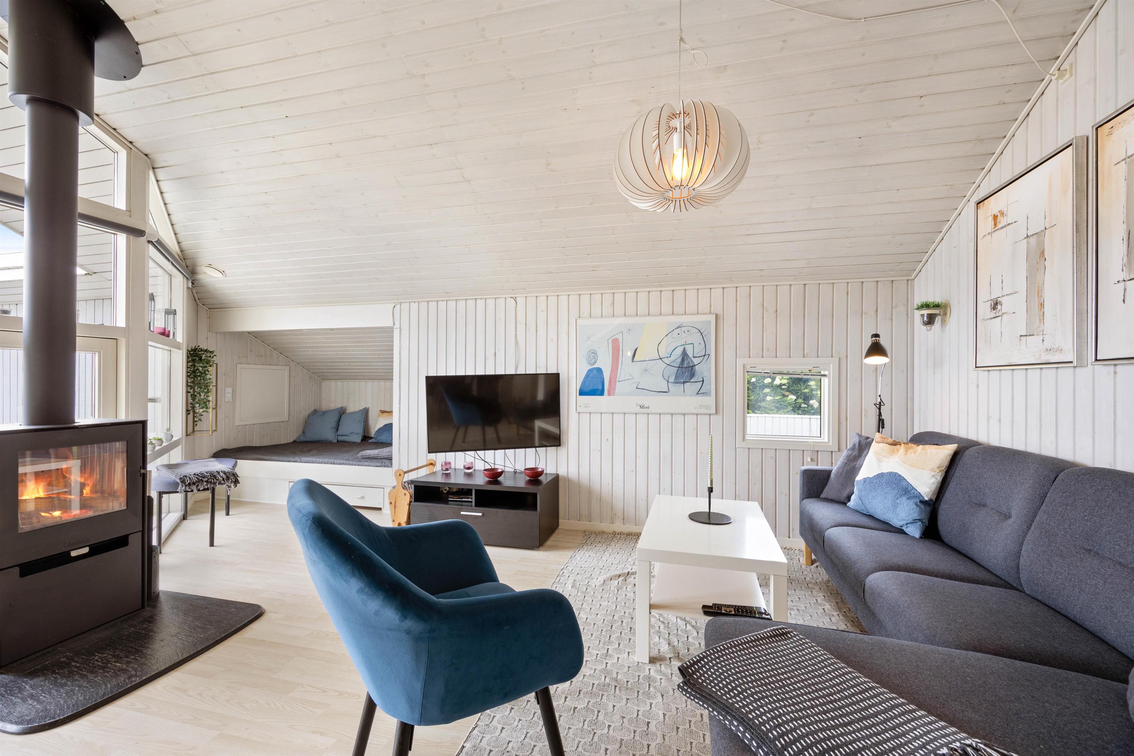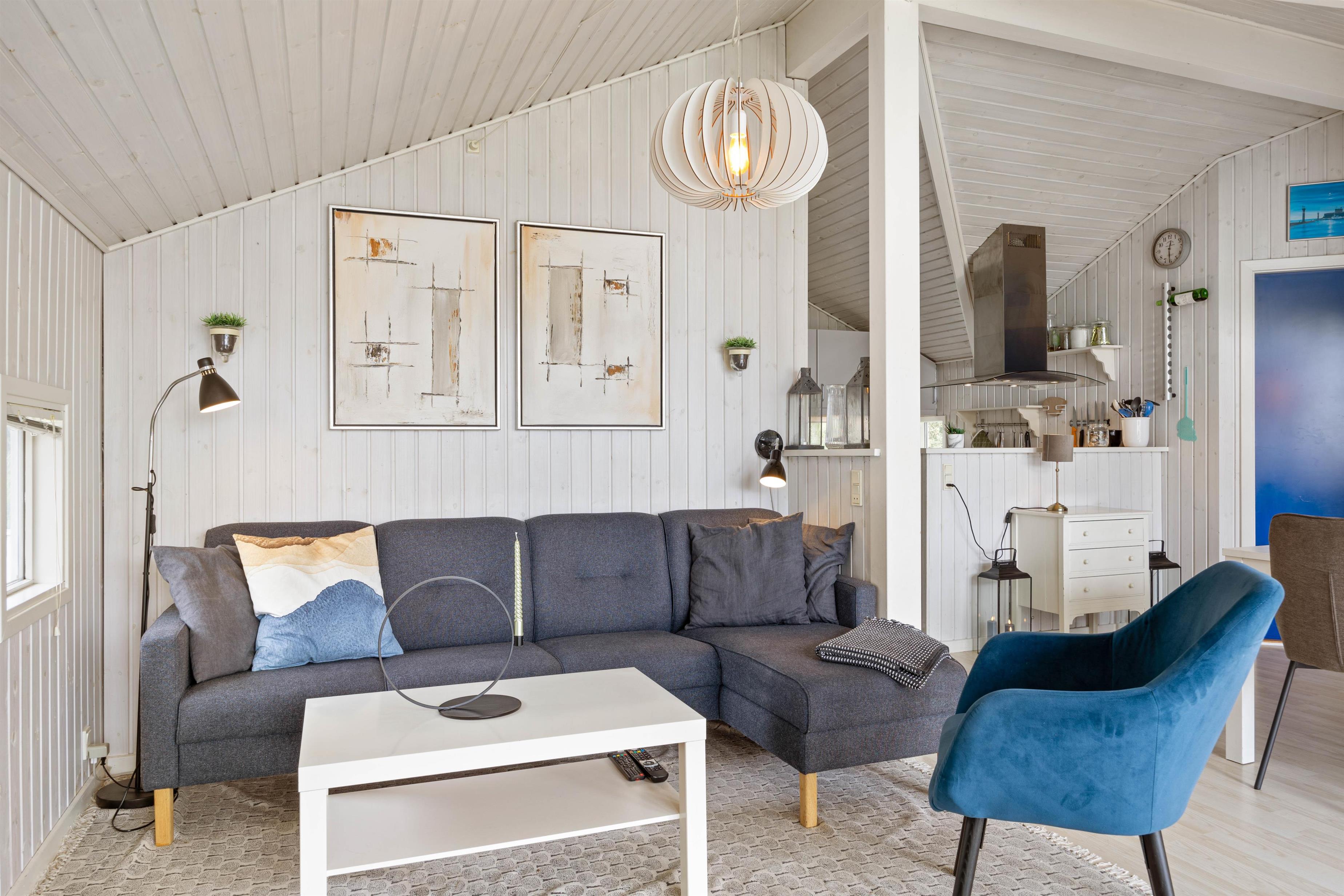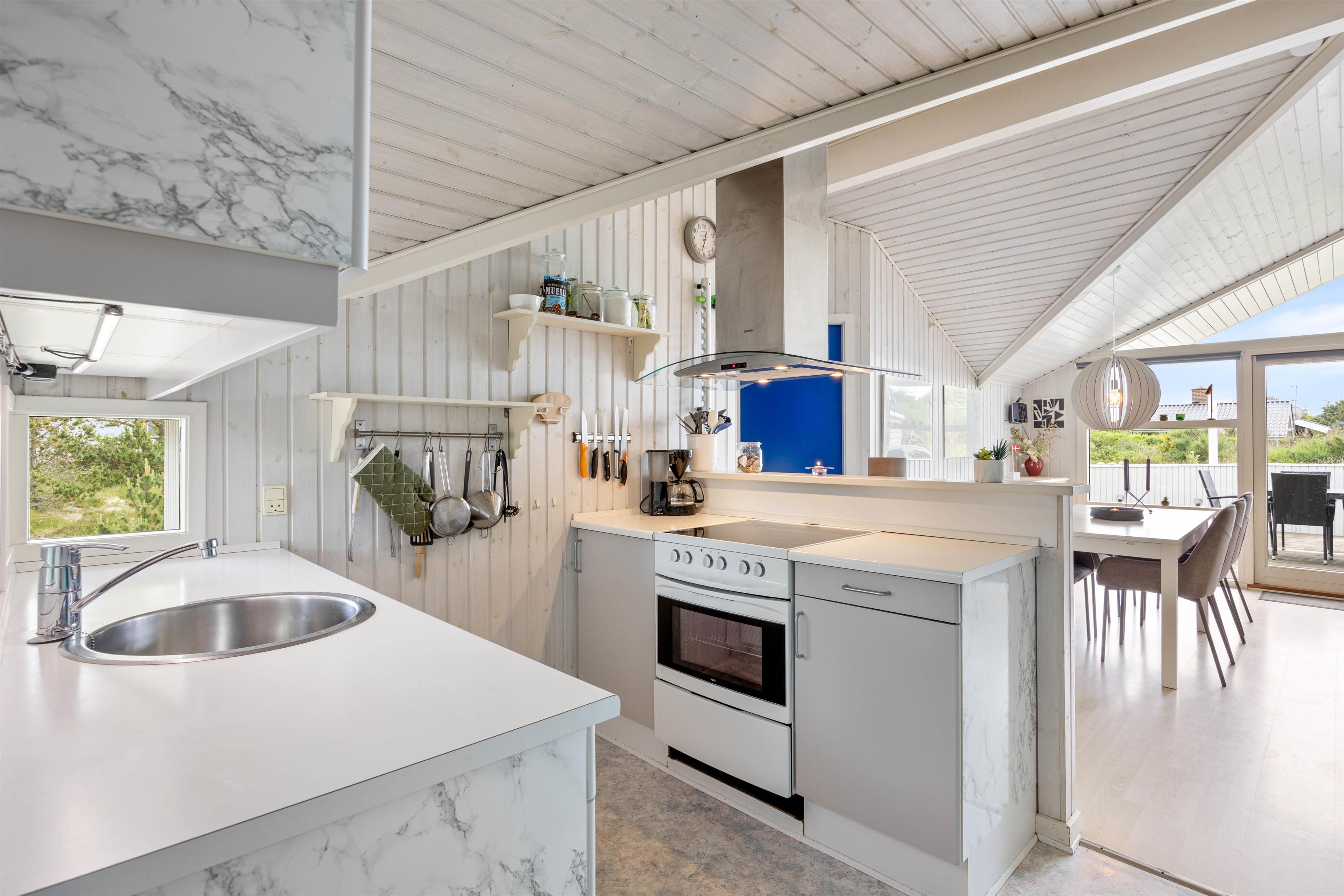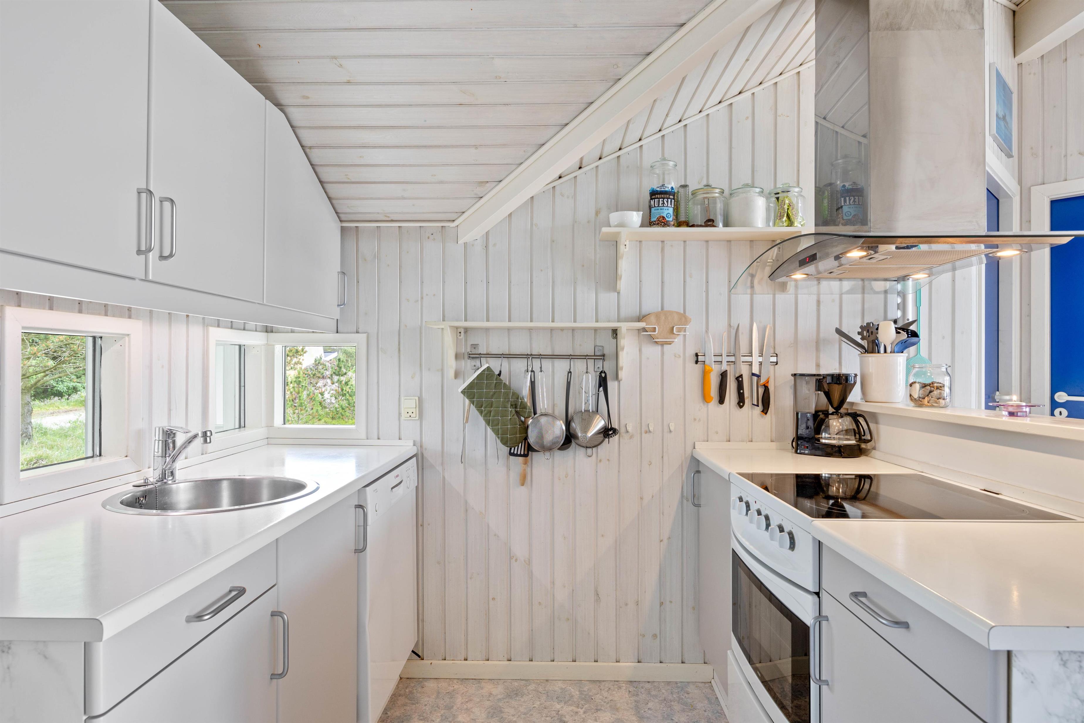 Indvendigt præsenterer sommerhuset sig også dejlig lyst. Feriehusets hjerte er den fine spisestue med integreret køkken, hvor I sammen kan slappe af, lave mad og spise.