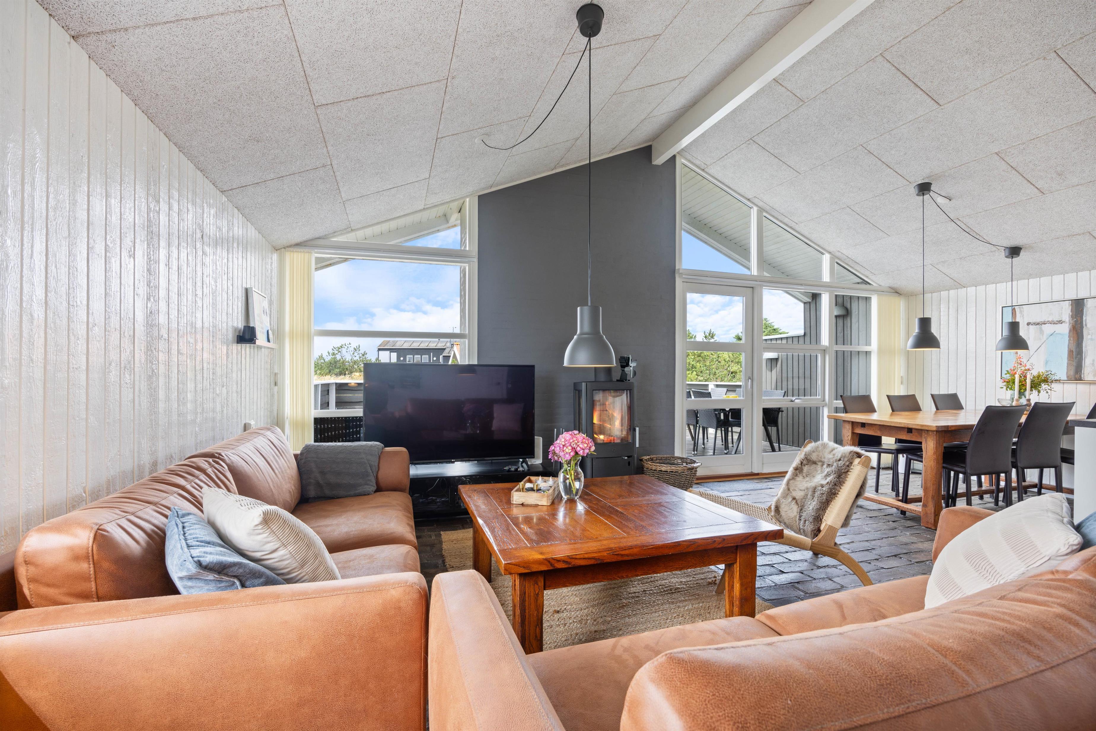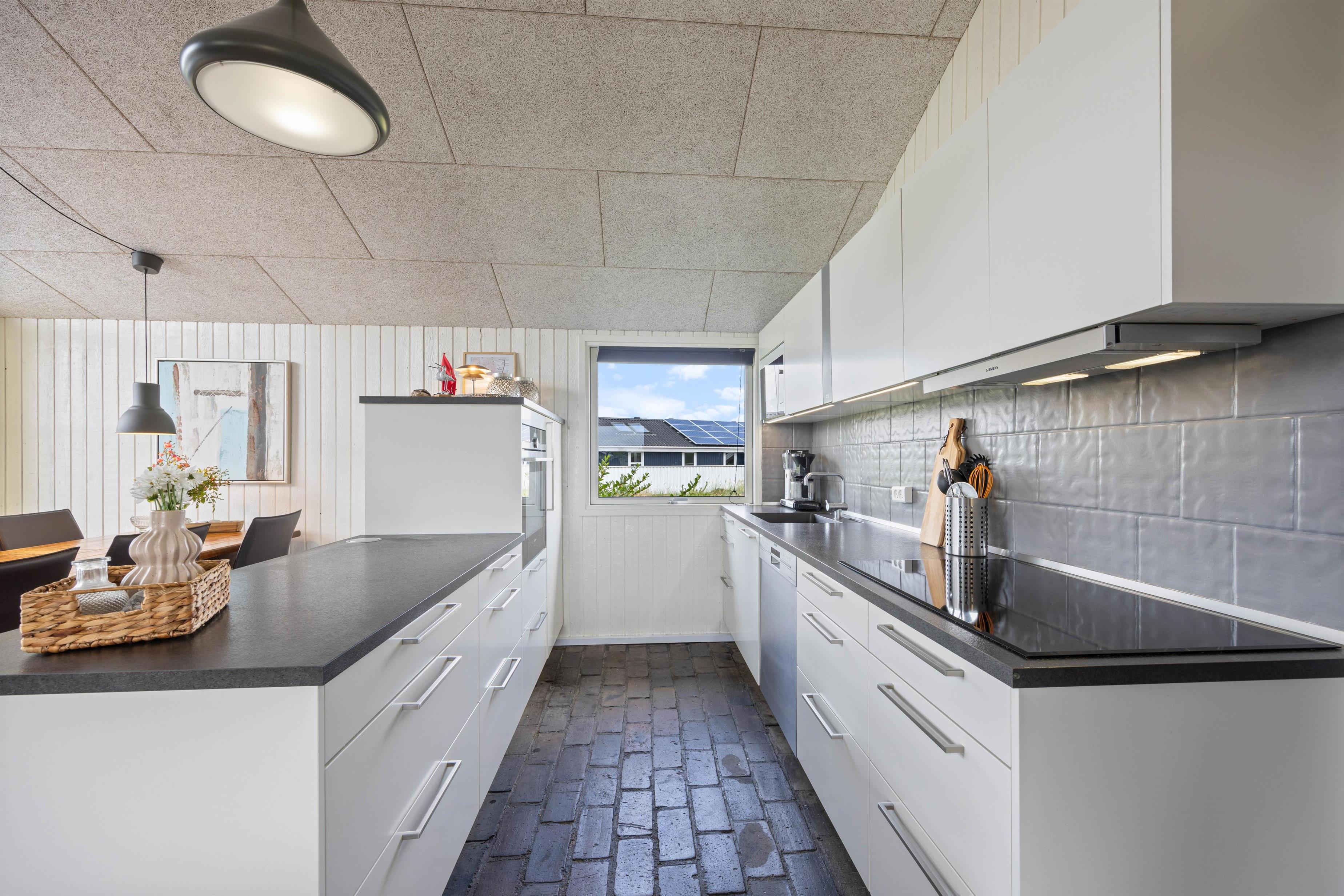Sommerhusets hjerte er det hyggelige og åbne køkken- og stueområde, som ved første blik indbyder til fælles hygge, madlavning og samvær generelt. Det store vinduesparti lader masser af lys slippe ind og giver samtidig en flot udsigt ud over området. Den stilfulde indretning er afstemt i hele huset og giver en følelse af harmoni og komfort. Her vil I med det samme føle jer hjemme og nyde ferien i fulde drag.