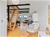 Feriehuset på Julianevej 128 indeholder i stueplan ét stort, åbent køkken/alrum/stue samt badeværelse med brus. I alrummet kan I nyde hinandens selskab med en god film eller et spil, mens brændeovnen knitrer og skaber en ekstra hyggelig feriestemning.