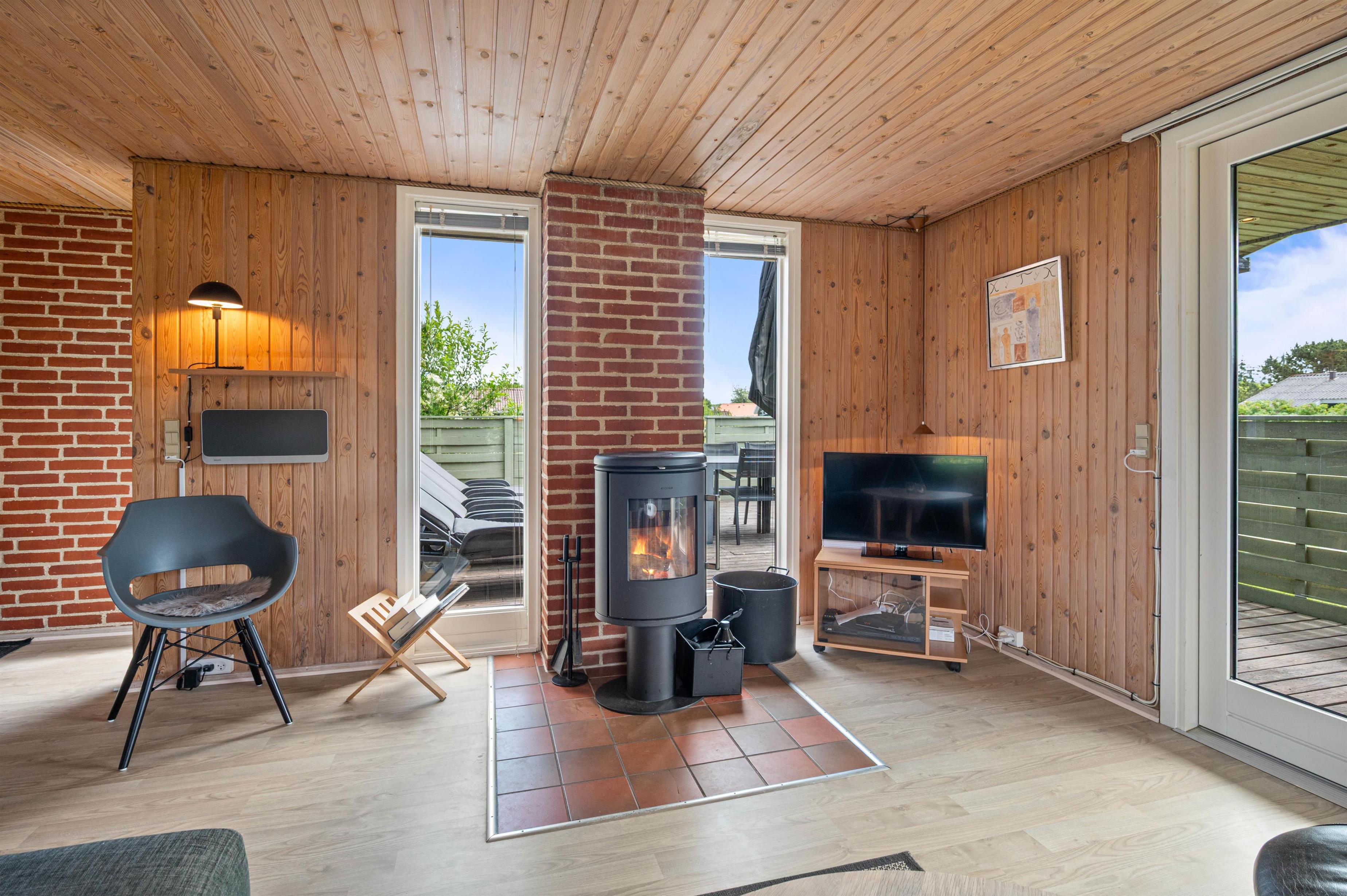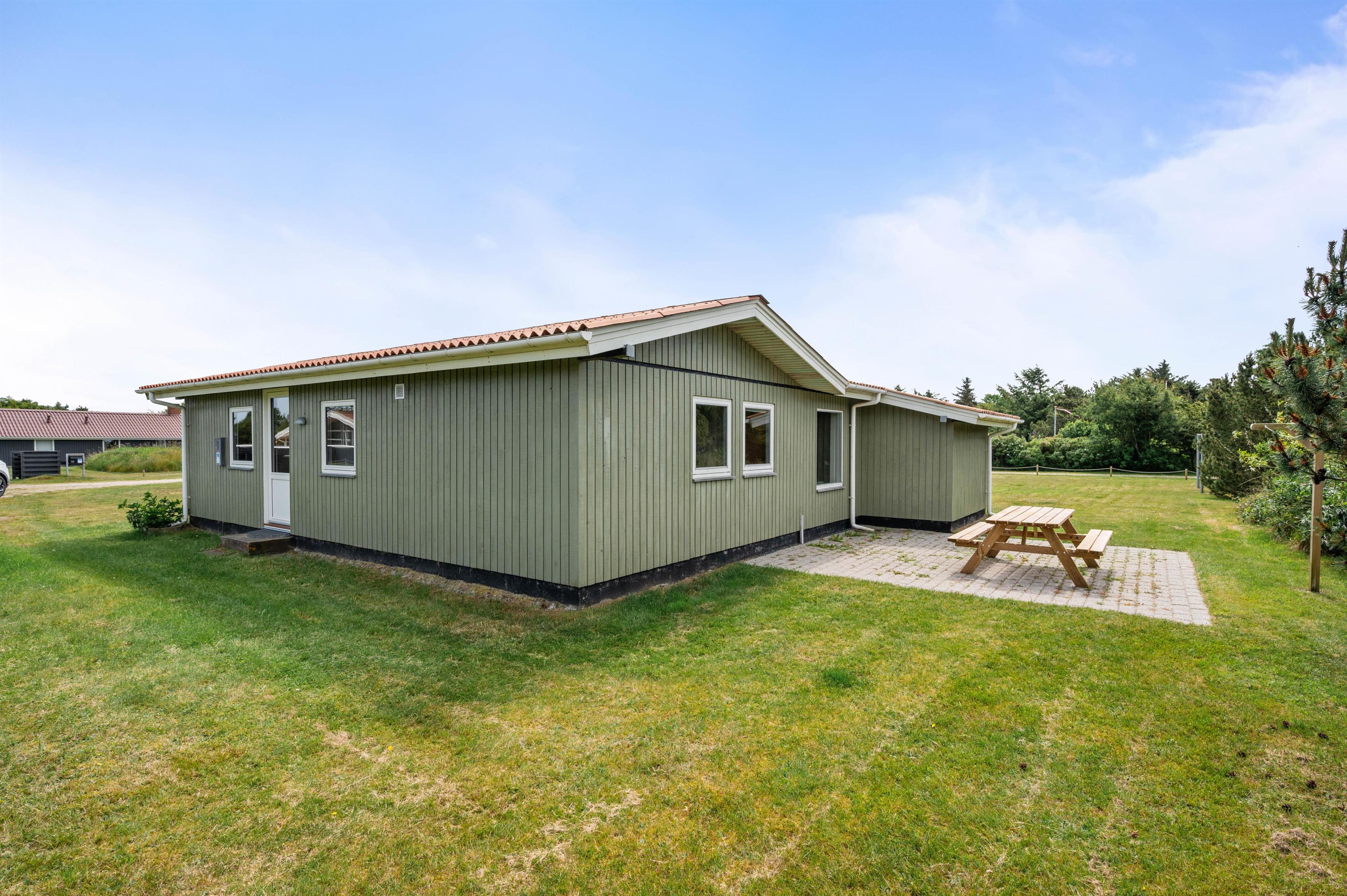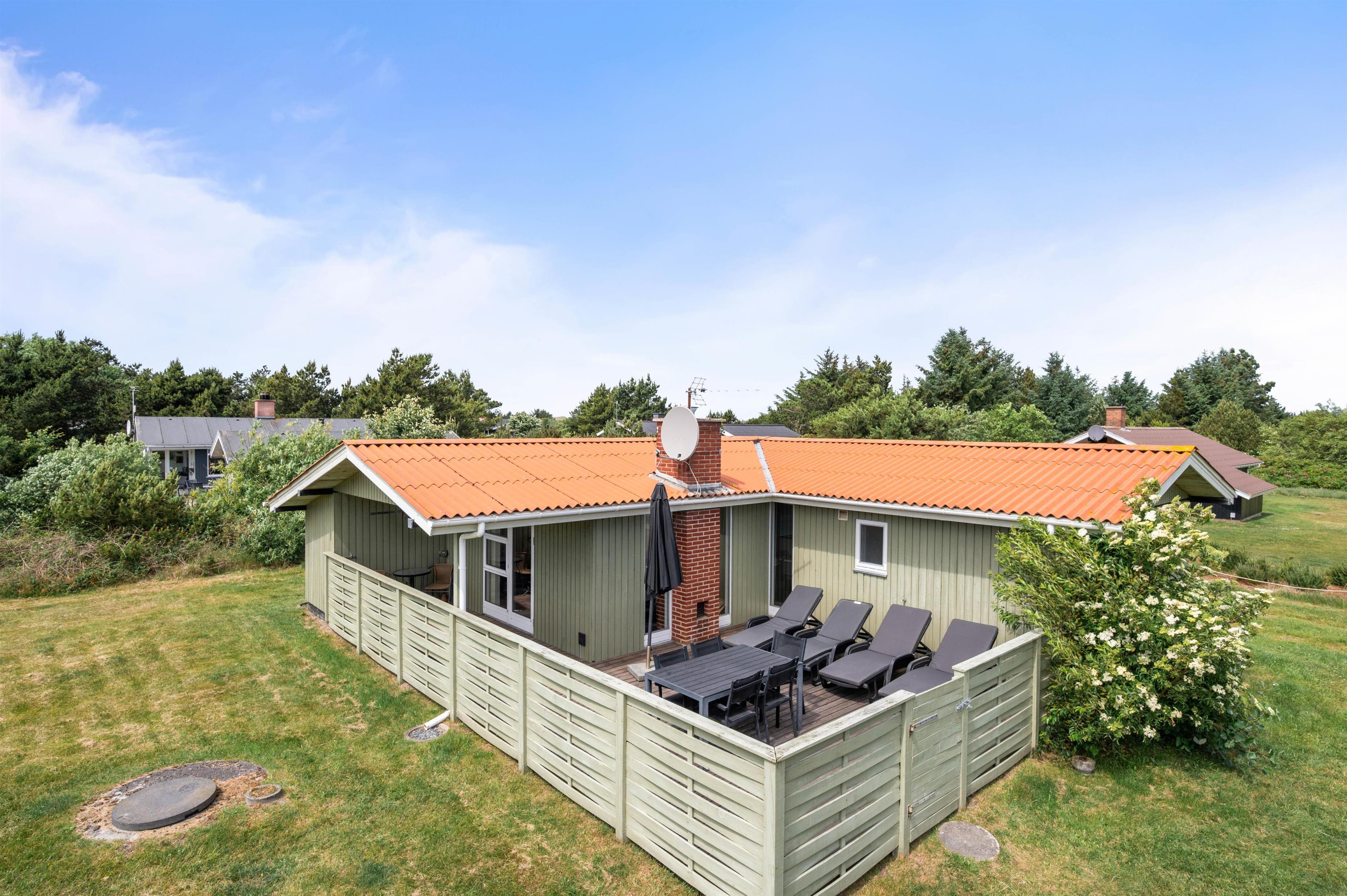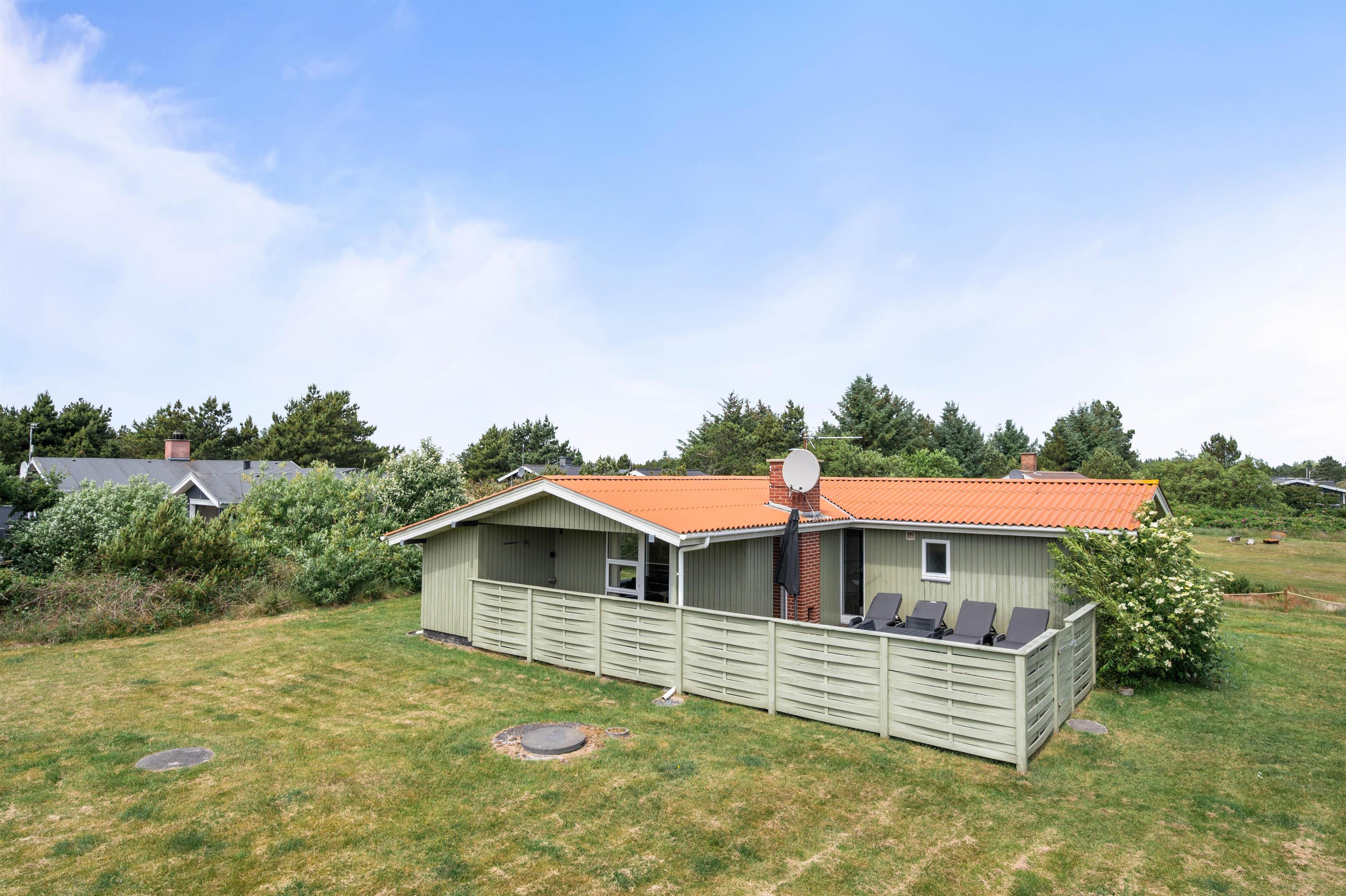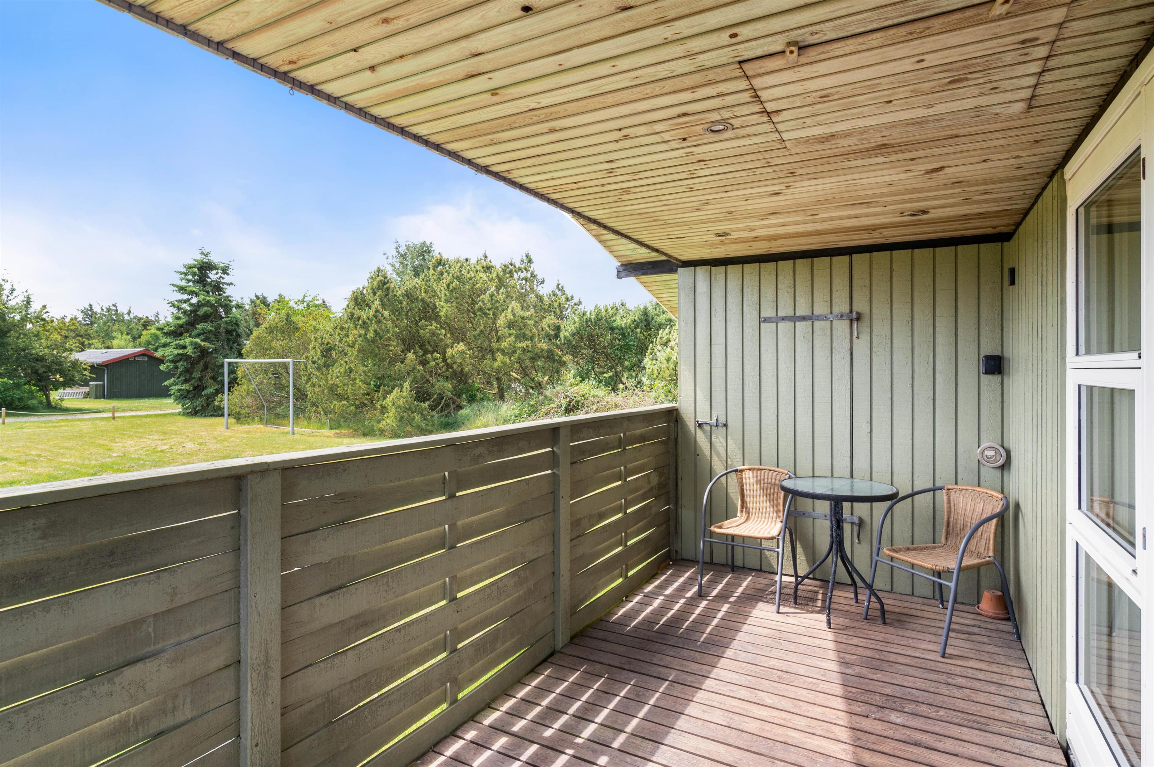 Den afskærmede terrasse gør sommerhuset praktisk for familier med små børn eller hunde. Terrassen har grill, liggestole og havemøbler, og den lille overdækkede del giver en enkel beskyttelse mod vind og vejr. Sommerhuset ligger kun 400 meter fra stranden og 950 meter fra de nærmeste indkøbsmuligheder, hvilket gør det nemt at kombinere afslapning med praktiske ærinder.
