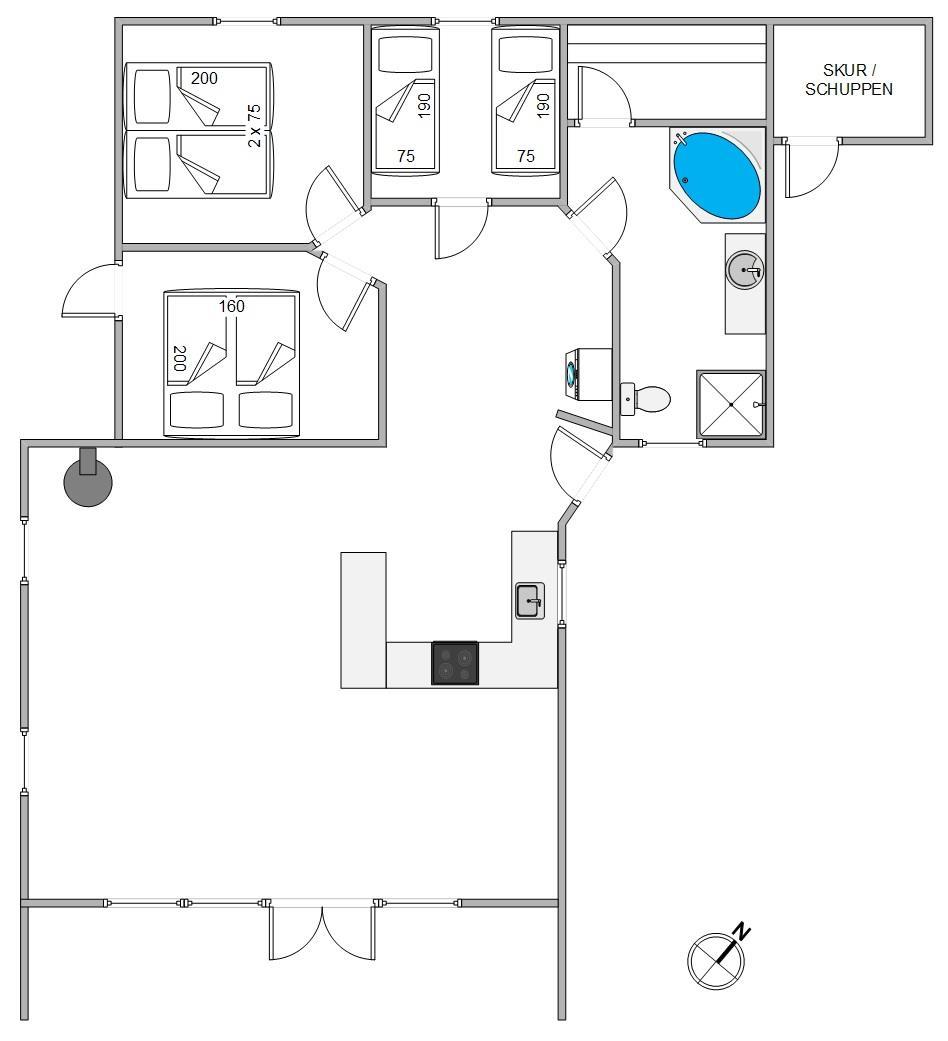 Sommerhuset har 3 fine værelser, hvor I kan samle energi til næste dags aktiviteter. Der er 2 værelser med gode dobbeltseng, mens det sidste værelse er indrettet med 2 gode enkeltsenge. Fra det ene soveværelse har I direkte udgang til den nordvest-vendte terrasse.