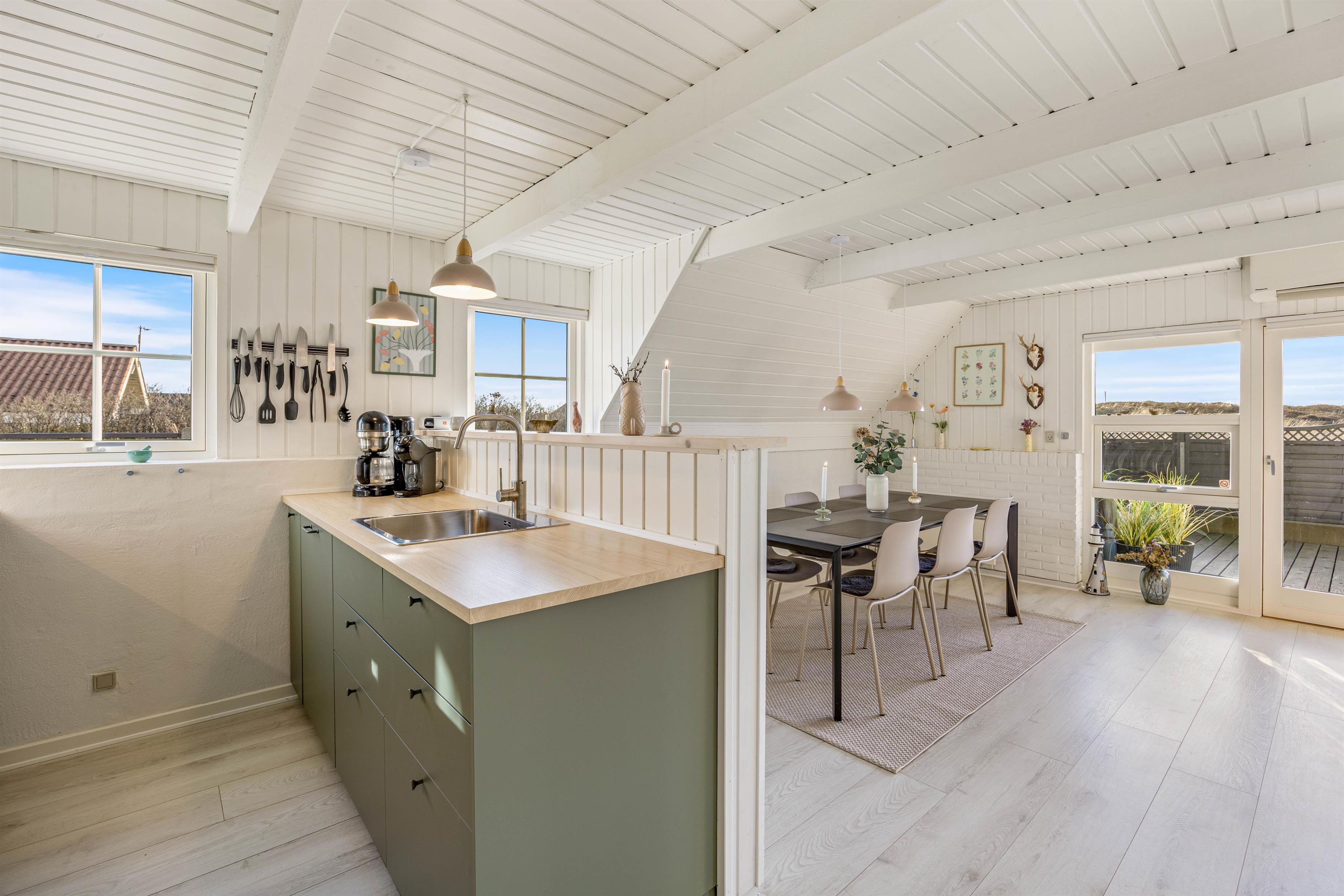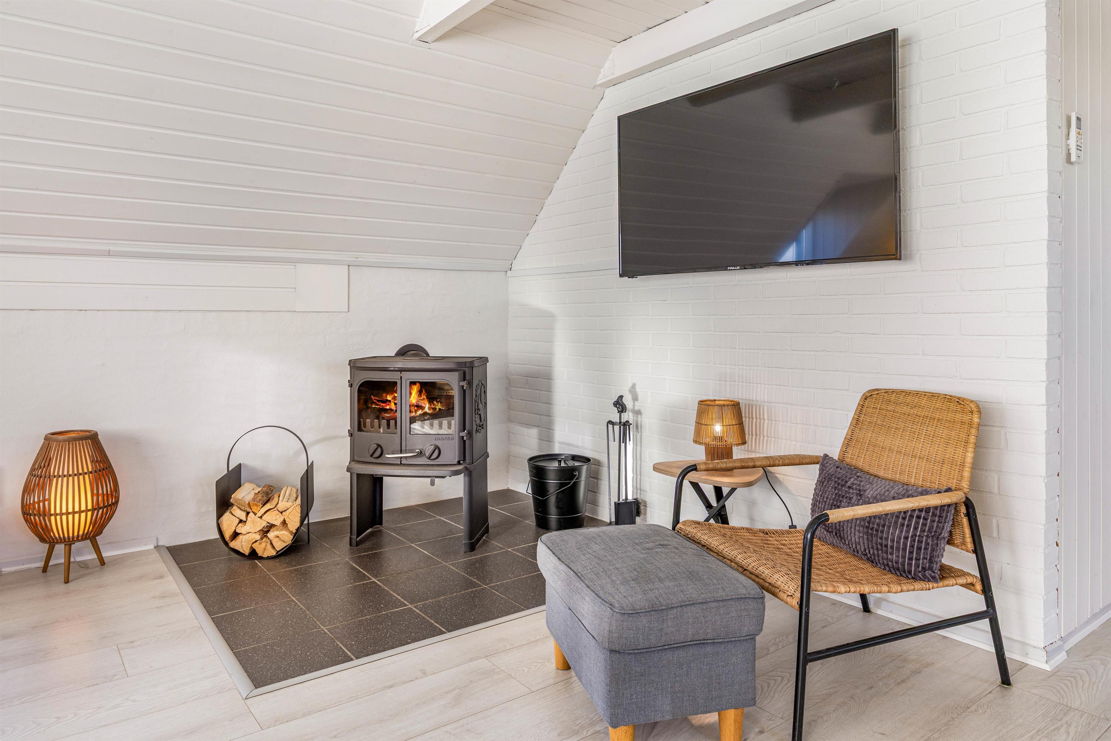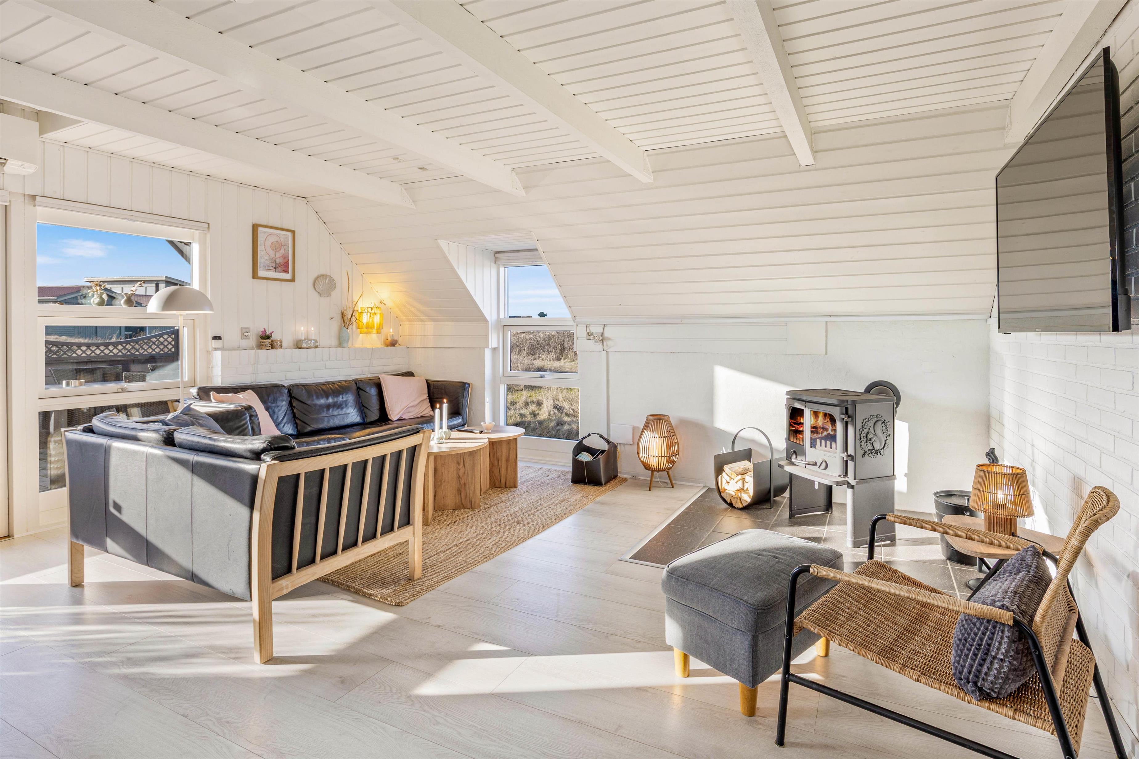 Det hyggelige sommerhus er lyst og venligt indrettet. I det åbne opholdsrum, som kombinerer stue, køkken og spiseplads, kan du sætte dig godt til rette i sofaen, tænde op i brændeovnen og føle feriestemningen brede sig.