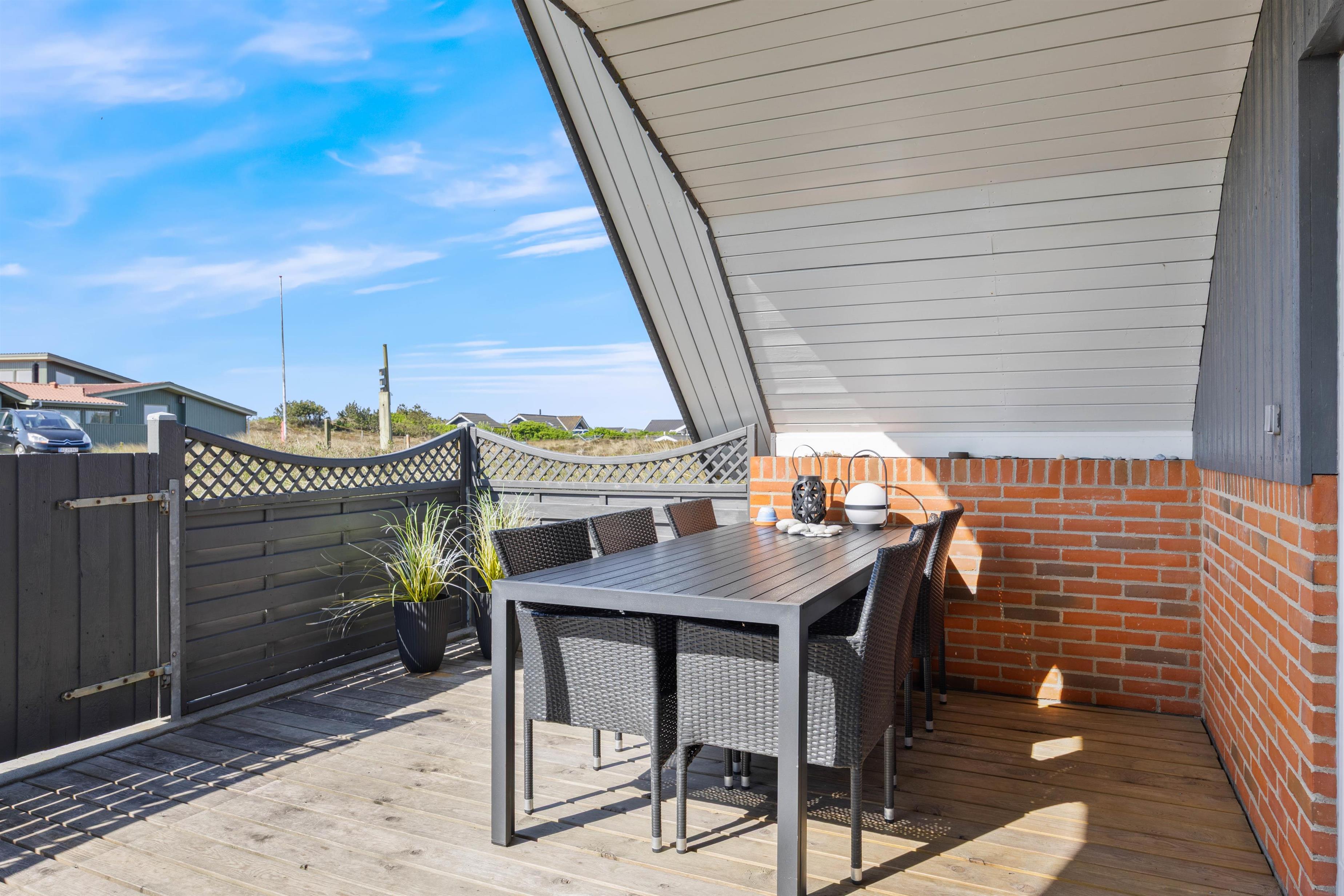 Der er forskellige terrasser rundt om sommerhuset, så I altid kan finde en rolig plet at slappe af på. Den lukkede terrasse er særlig praktisk, hvis I har små børn eller hund med. Bilen kan stå beskyttet i carporten i løbet af ferien.