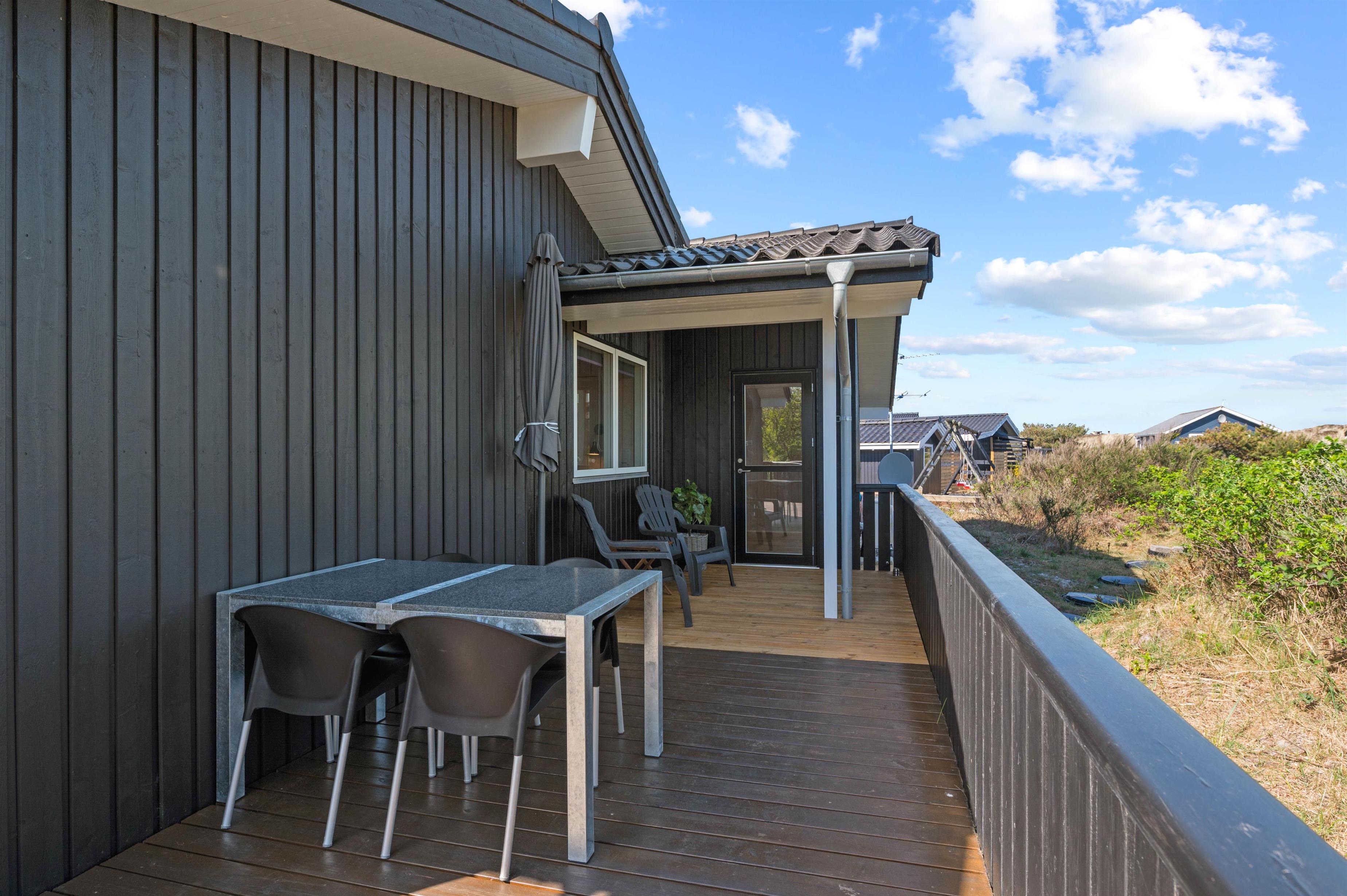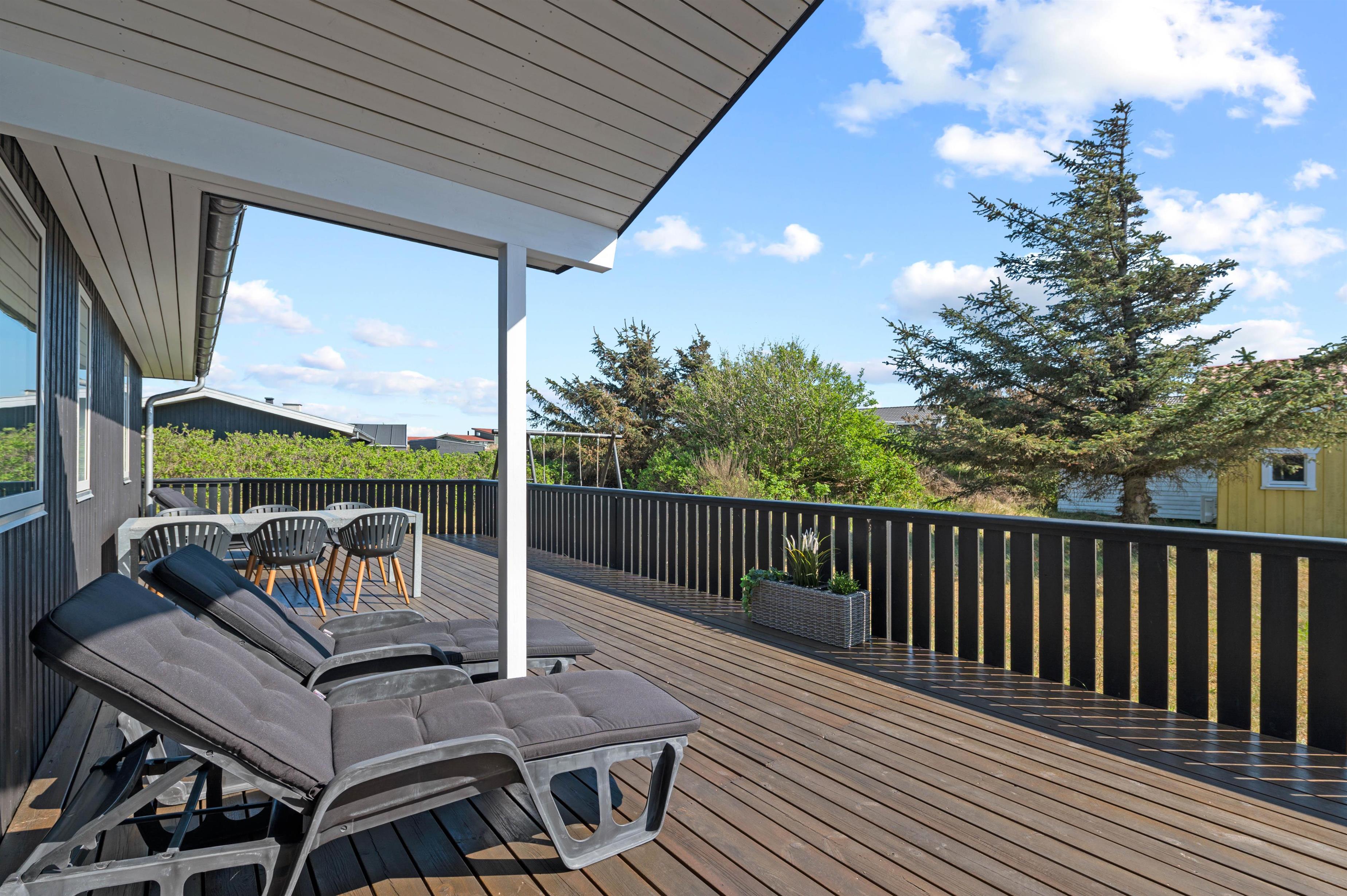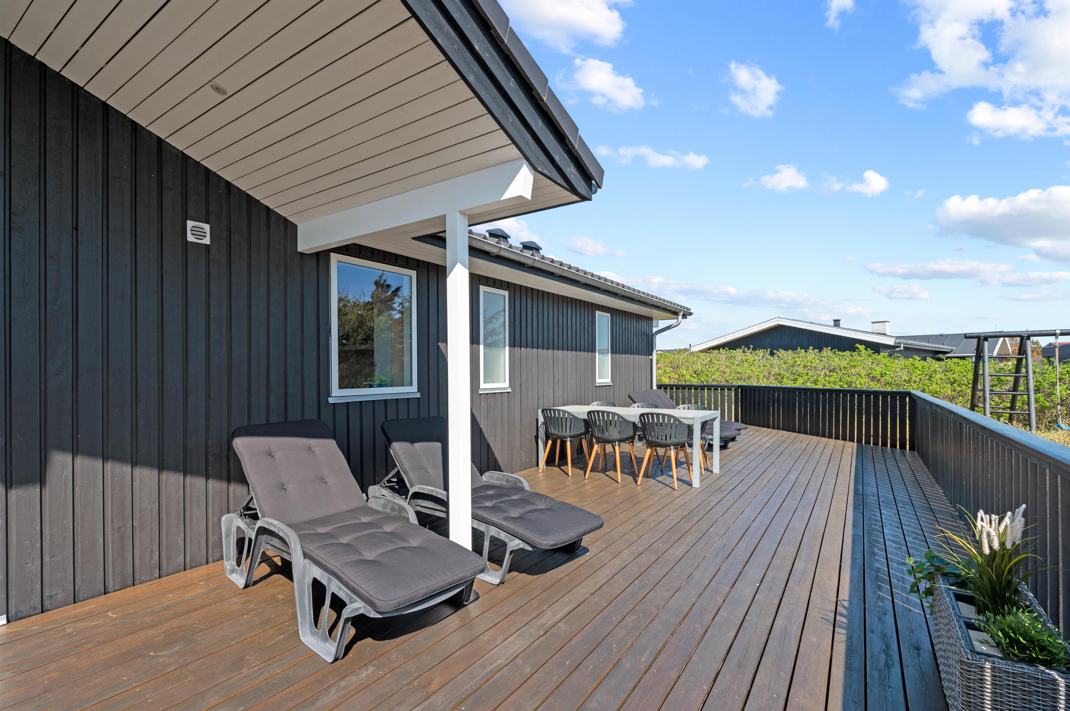 Rundt om huset finder I den store flotte afskærmede terrasse, som kan anvendes fra morgen til aften. Morgenkaffe kan nydes i øst, følge solen rundt mod syd og slutte dagen af med at se solen gå ned i vest. Terrassen mod vest er også delvist overdækket. Ellers er terrassen udstyret med gode havemøbler, liggestol og grill. For de mindste er der opstillet gyngestativ