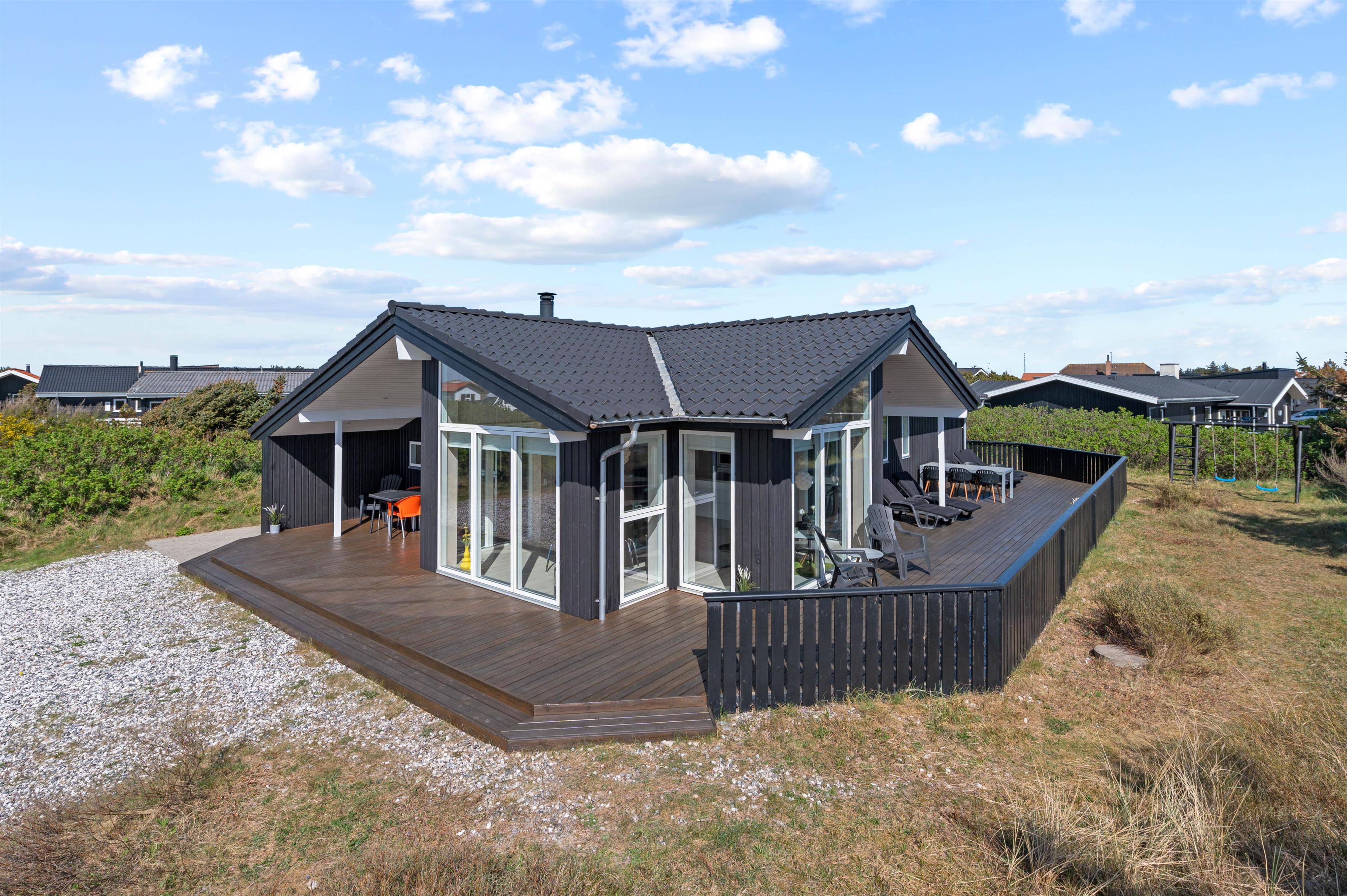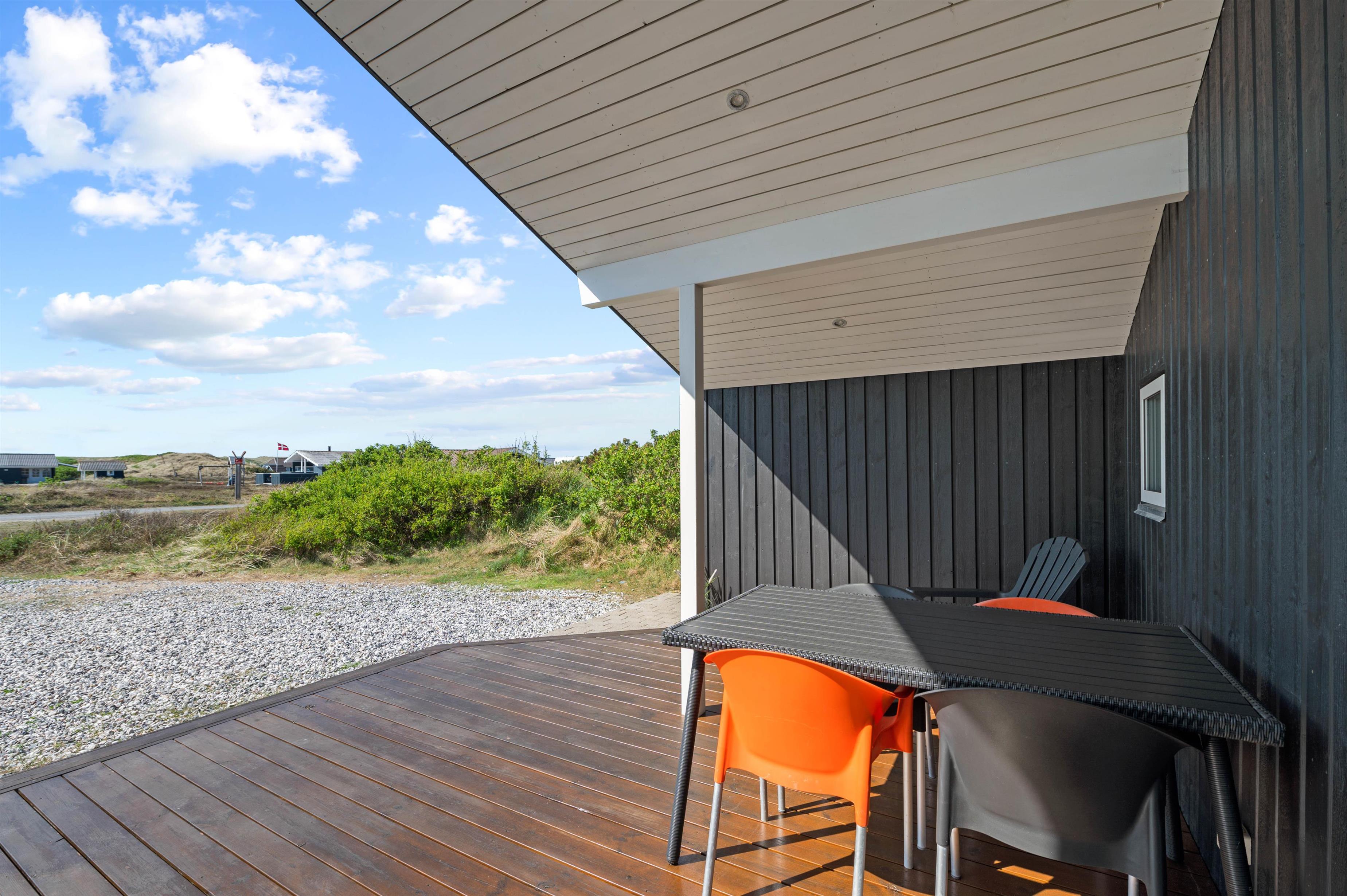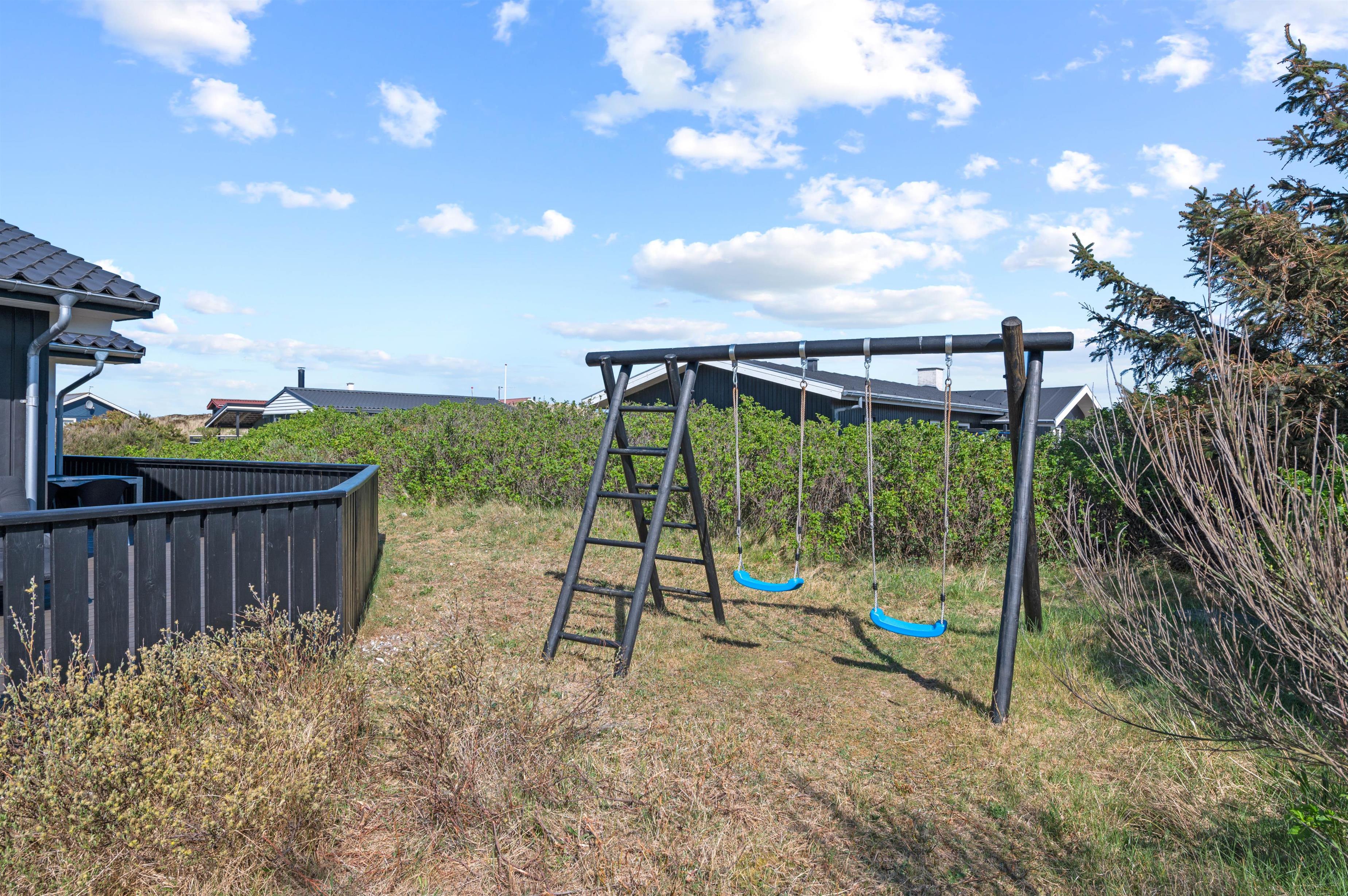 Rundt om huset finder I den store flotte afskærmede terrasse, som kan anvendes fra morgen til aften. Morgenkaffe kan nydes i øst, følge solen rundt mod syd og slutte dagen af med at se solen gå ned i vest. Terrassen mod vest er også delvist overdækket. Ellers er terrassen udstyret med gode havemøbler, liggestol og grill. For de mindste er der opstillet gyngestativ