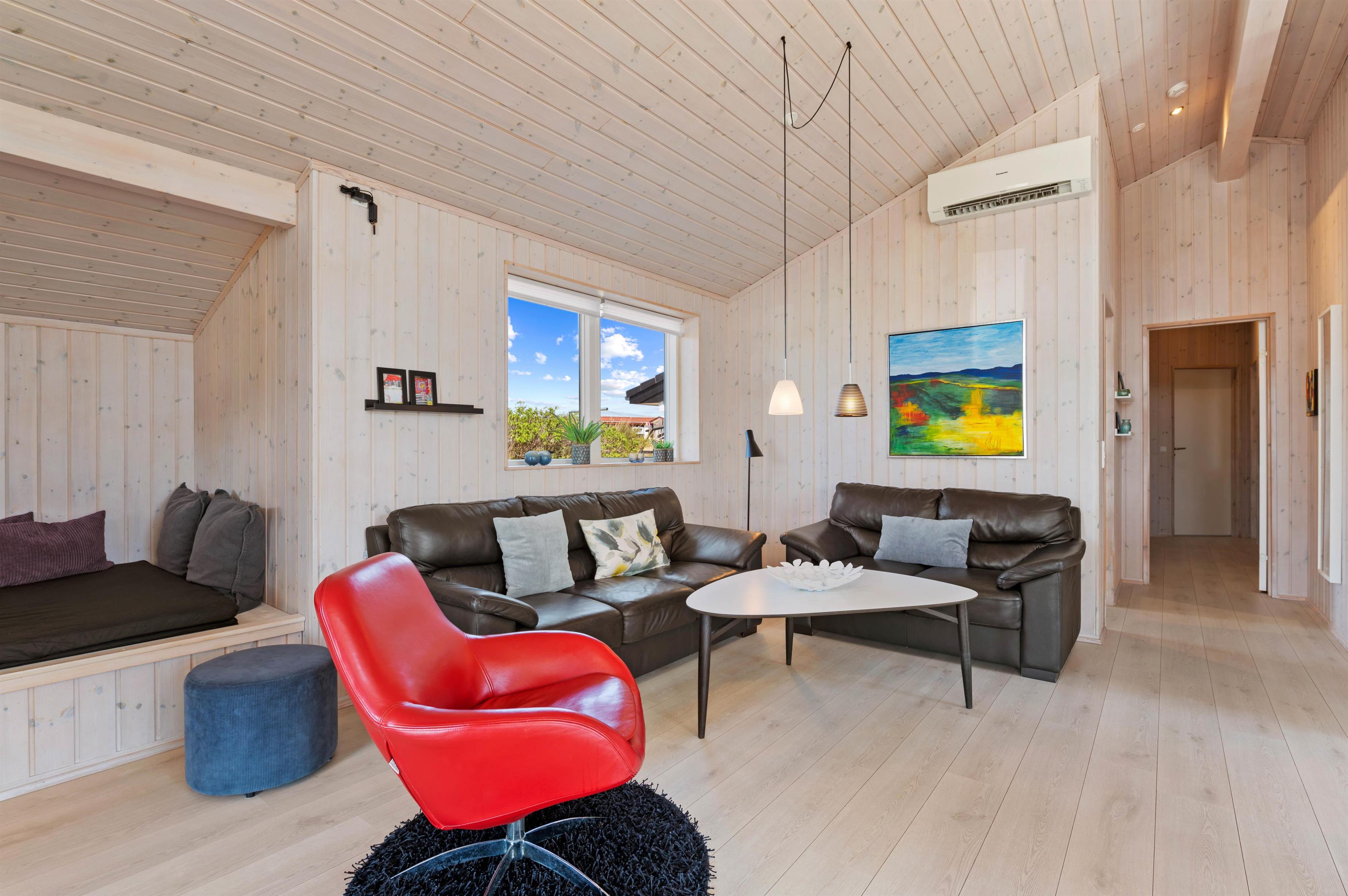 Sommerhusets hjerte er det skønne opholdsrum, hvor der er åbent til kip og masser af lysindfald fra de store vinduespartier mod syd og vest. Nyd ferien i den hyggelige glaskarnap med en bog og en kop te eller hyg jer i alkoven med en god streaming film i fjernsynet via Chromacast eller nyd en hyggelig middag rundt om spisebordet med venner og familie. Der er nemlig plads til i alt 8 personer.