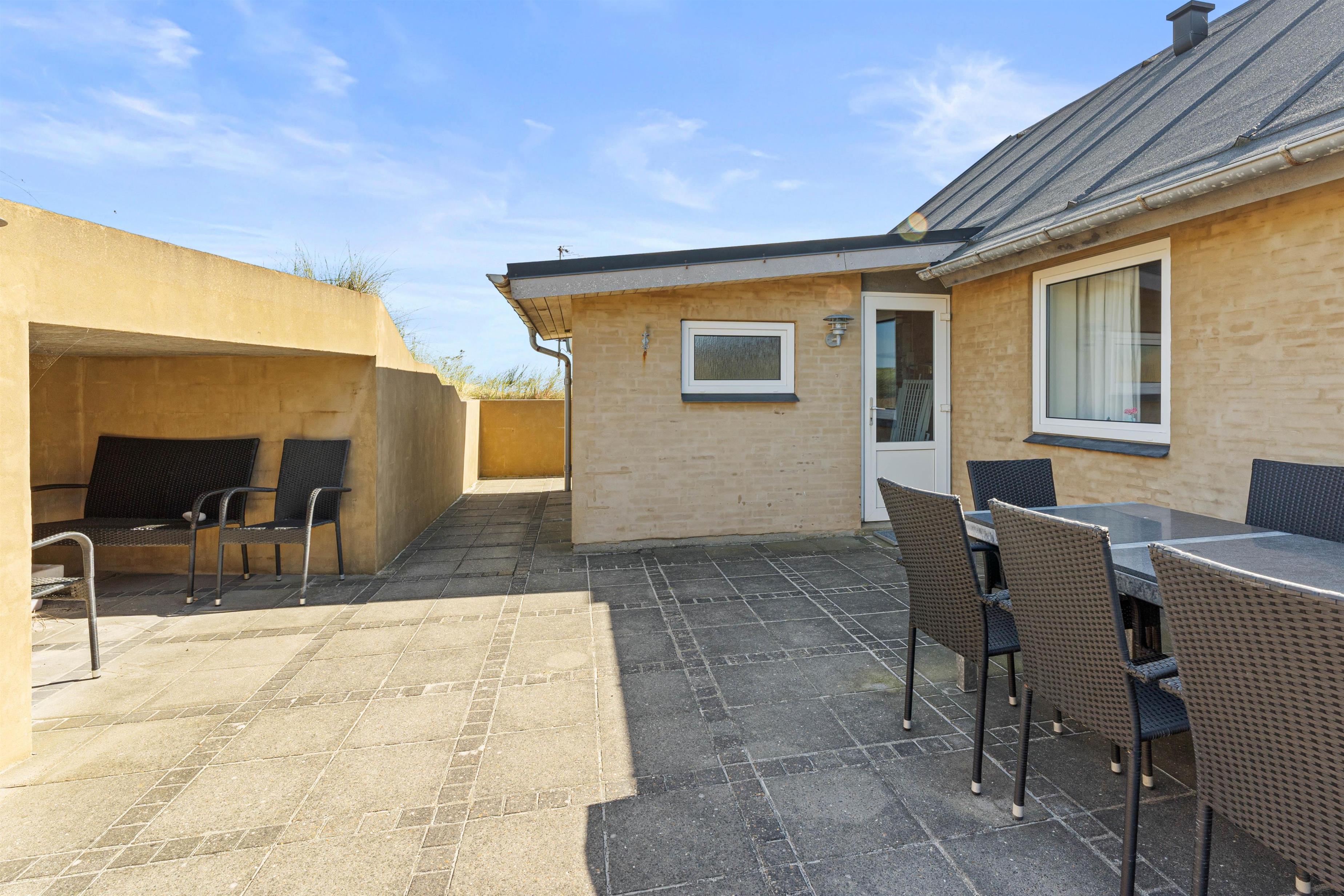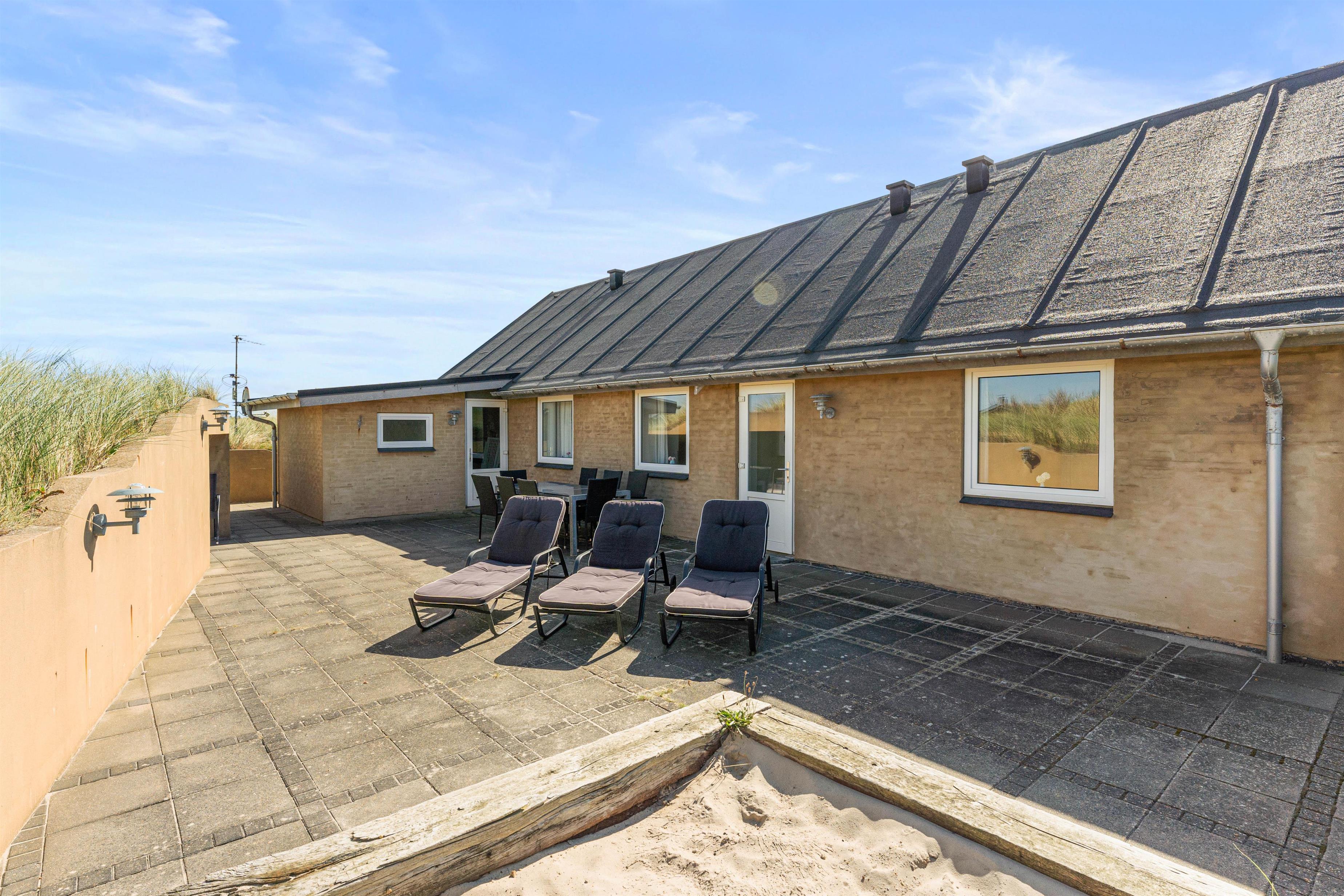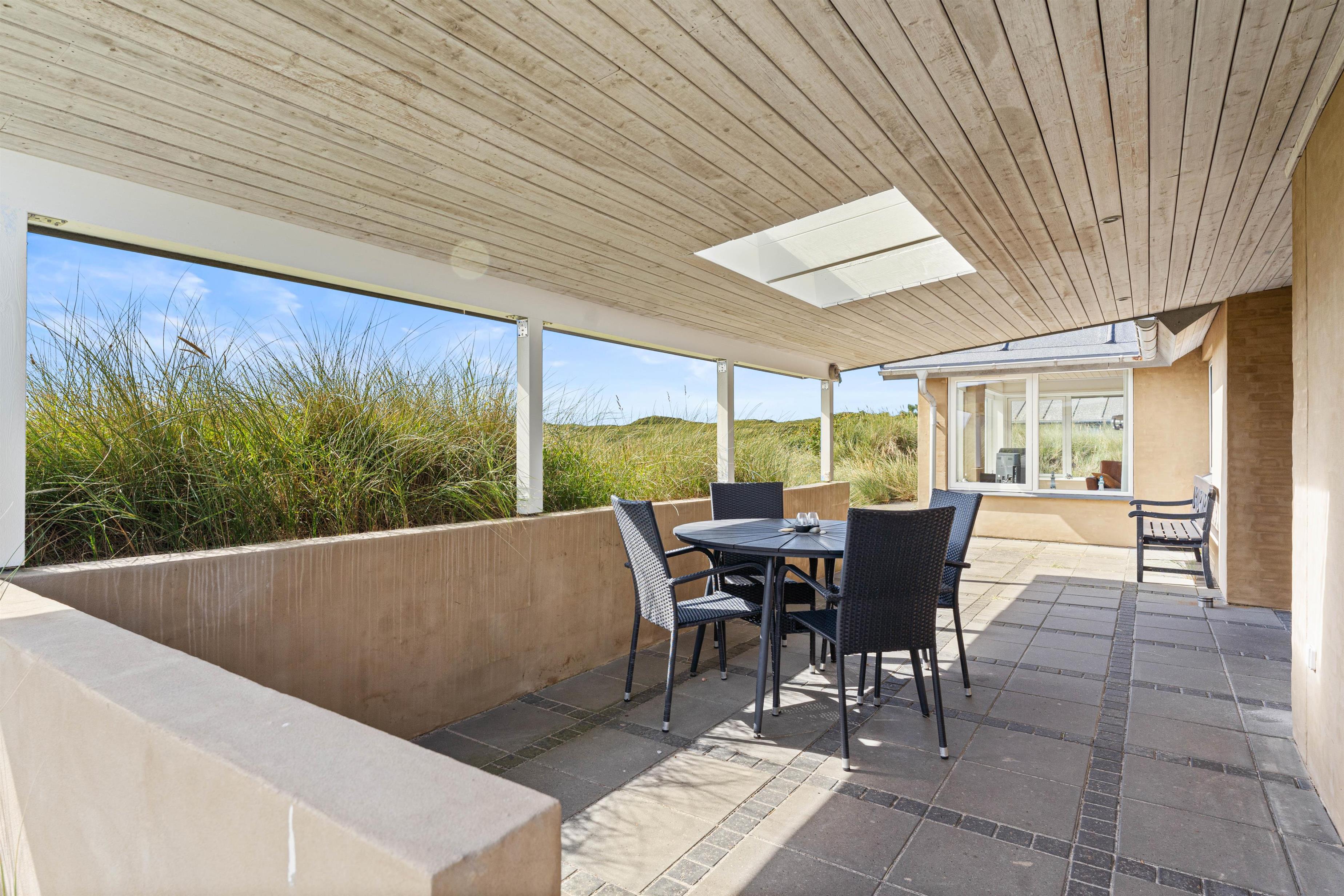 Fra sommerhusets terrasse har I en skøn udsigt til det naturskønne område, som består af hede- og klitlandskab.