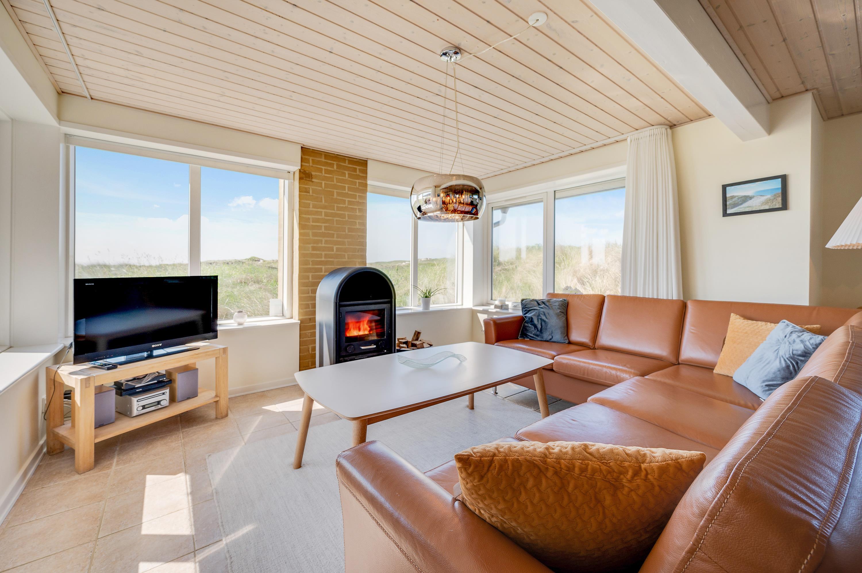 Den stilfuldt indrettede stue er i åben forbindelse med det moderne og veludstyrede køkken, og overalt i feriehuset er der et fantastisk lysindfald og her findes den hyggelige brændeovn sammen med TV/parabol, DVD og stereoanlæg. Sommerhusets trådløse internet benyttes gratis ligesom opvarmningen af sommerhuset via jordvarmeanlægget er uden beregning. Det er således kun strømforbruget, der afregnes for.