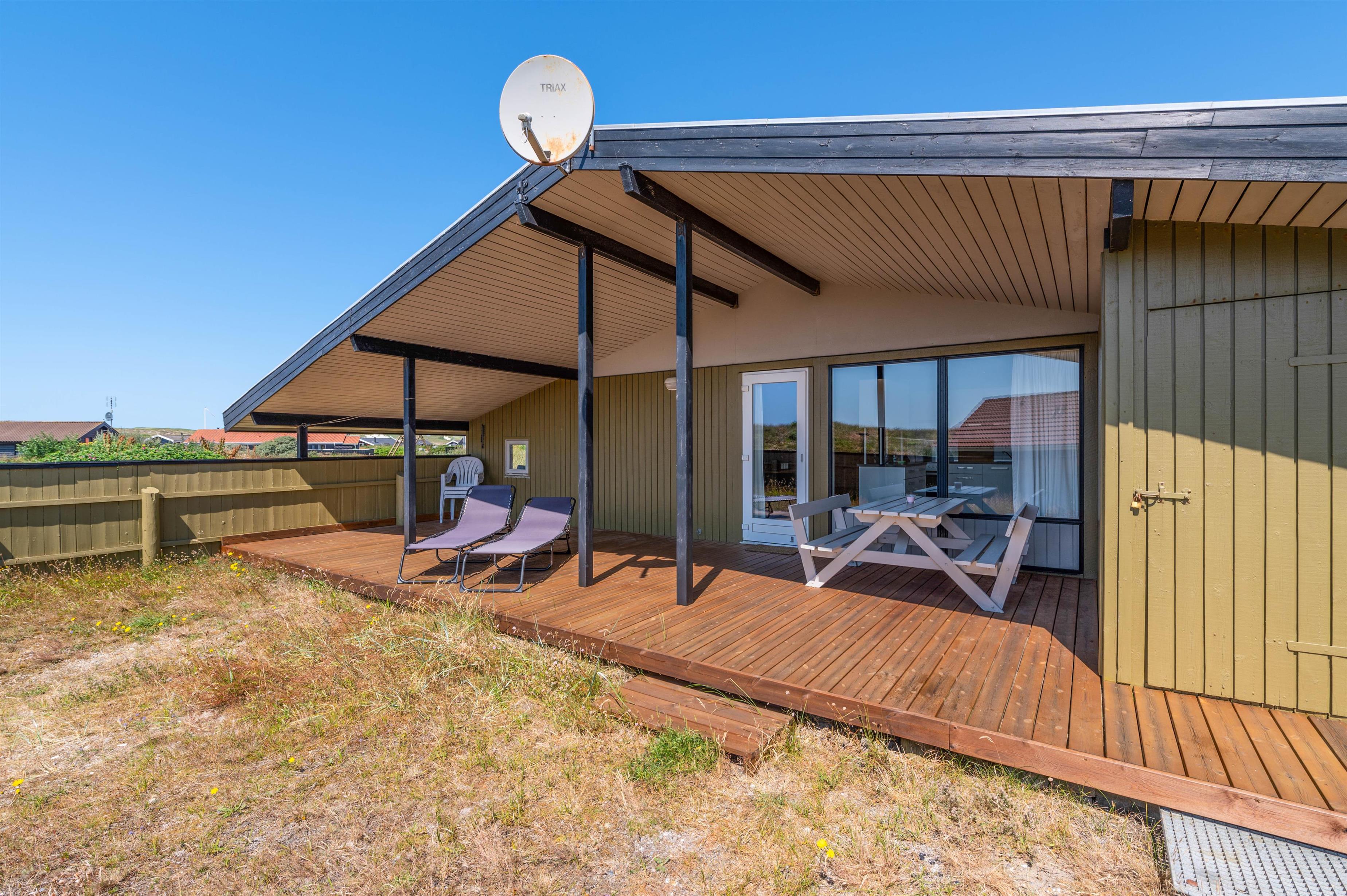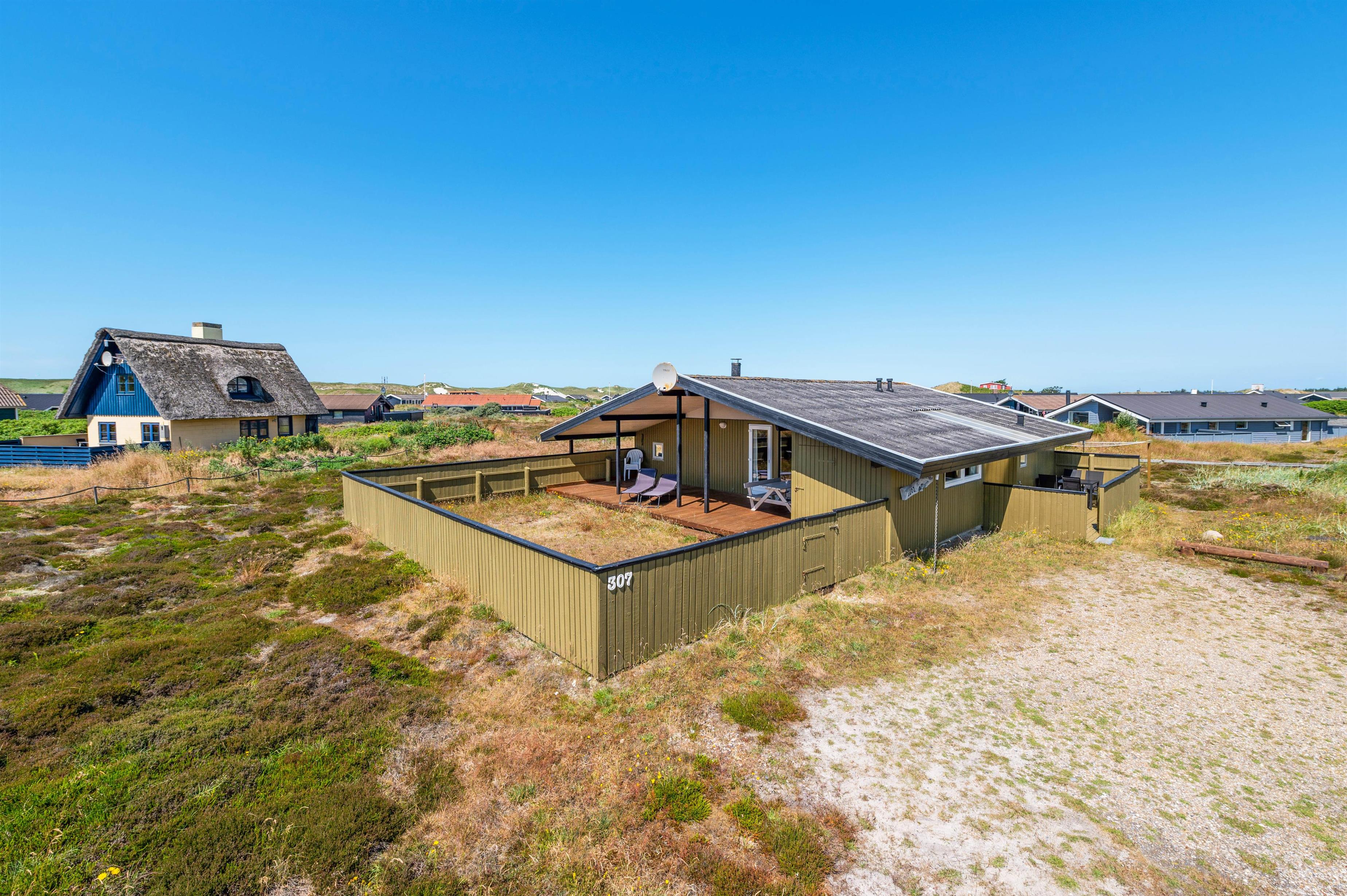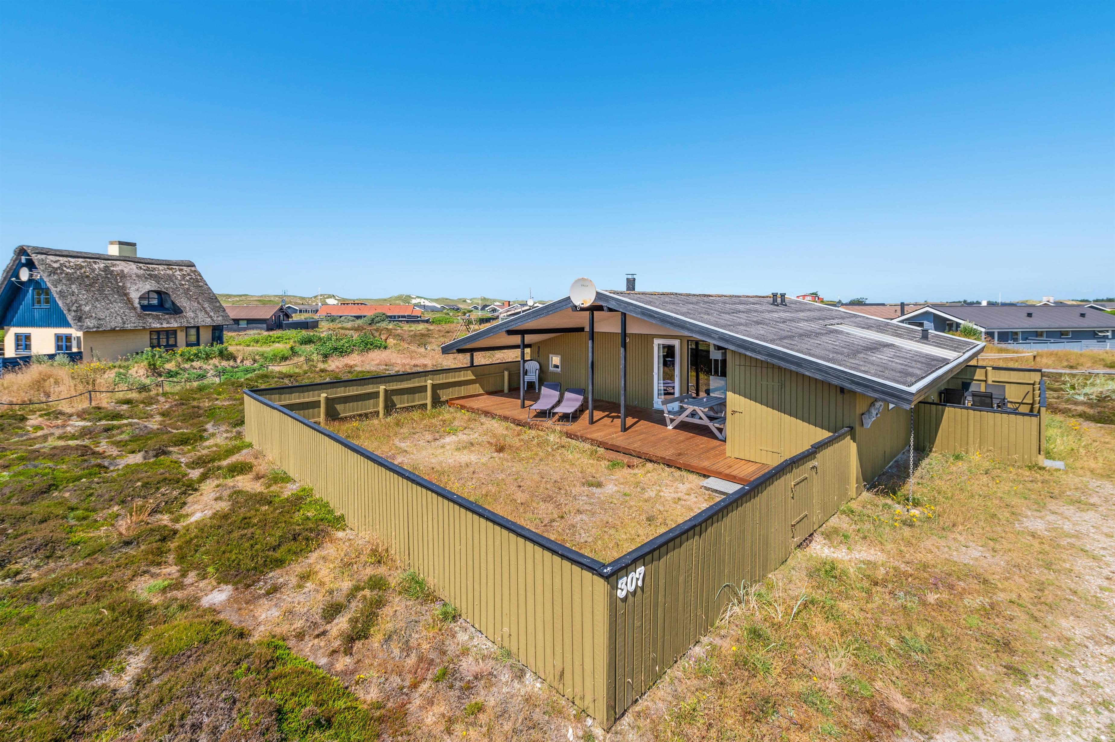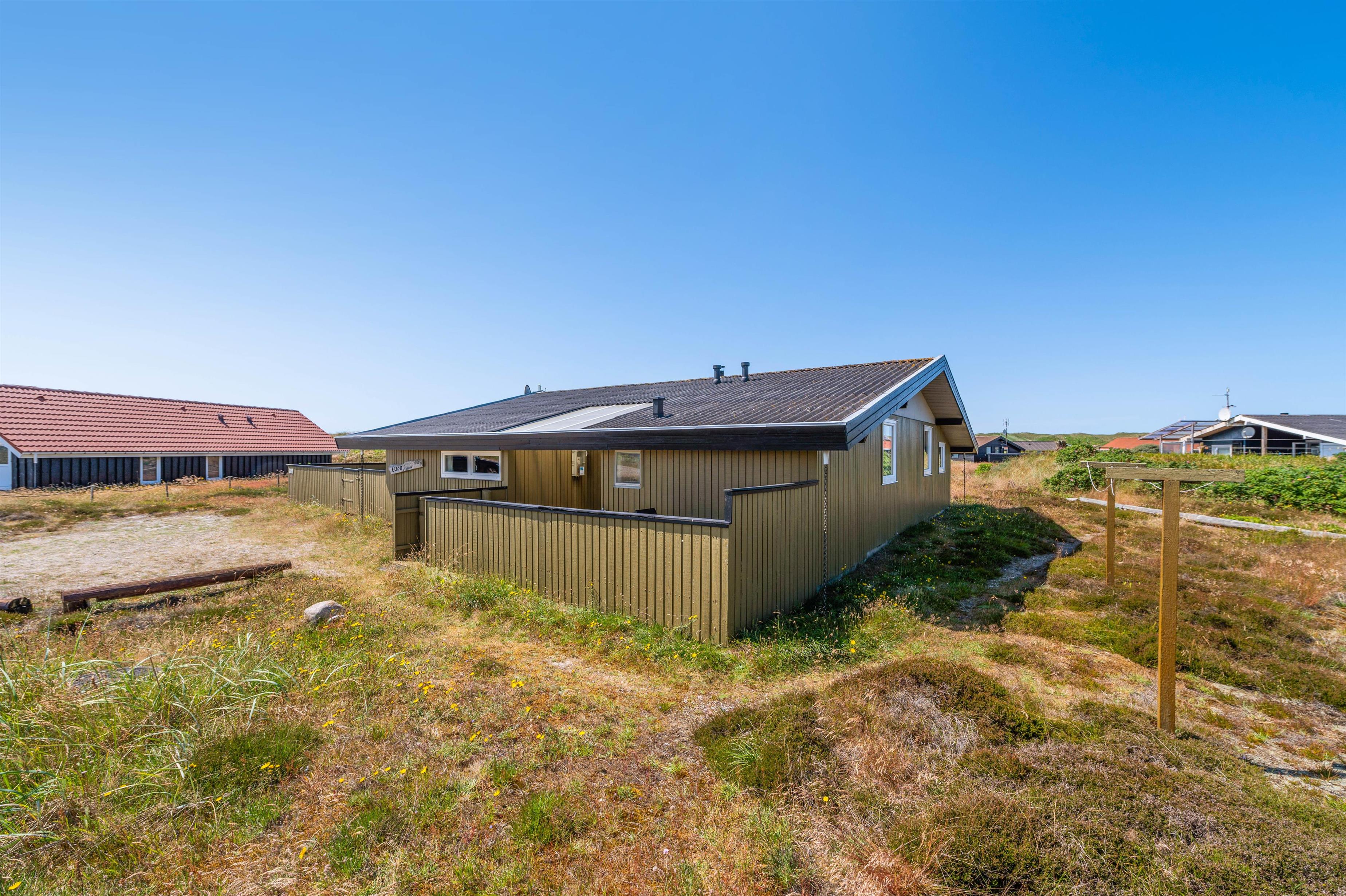 Sommerhuset er ideelt beliggende i Bjerregård i det vestlige hjørne af Danmark med en smuk udsigt over klitterne. Sommerhuset har en rigtig dejlig, lukket terrasse mod sydvest med god plads til, at de små kan rende rundt og lege, mens de voksne nyder solen og den friske havluft med en friskbrygget kop kaffe.