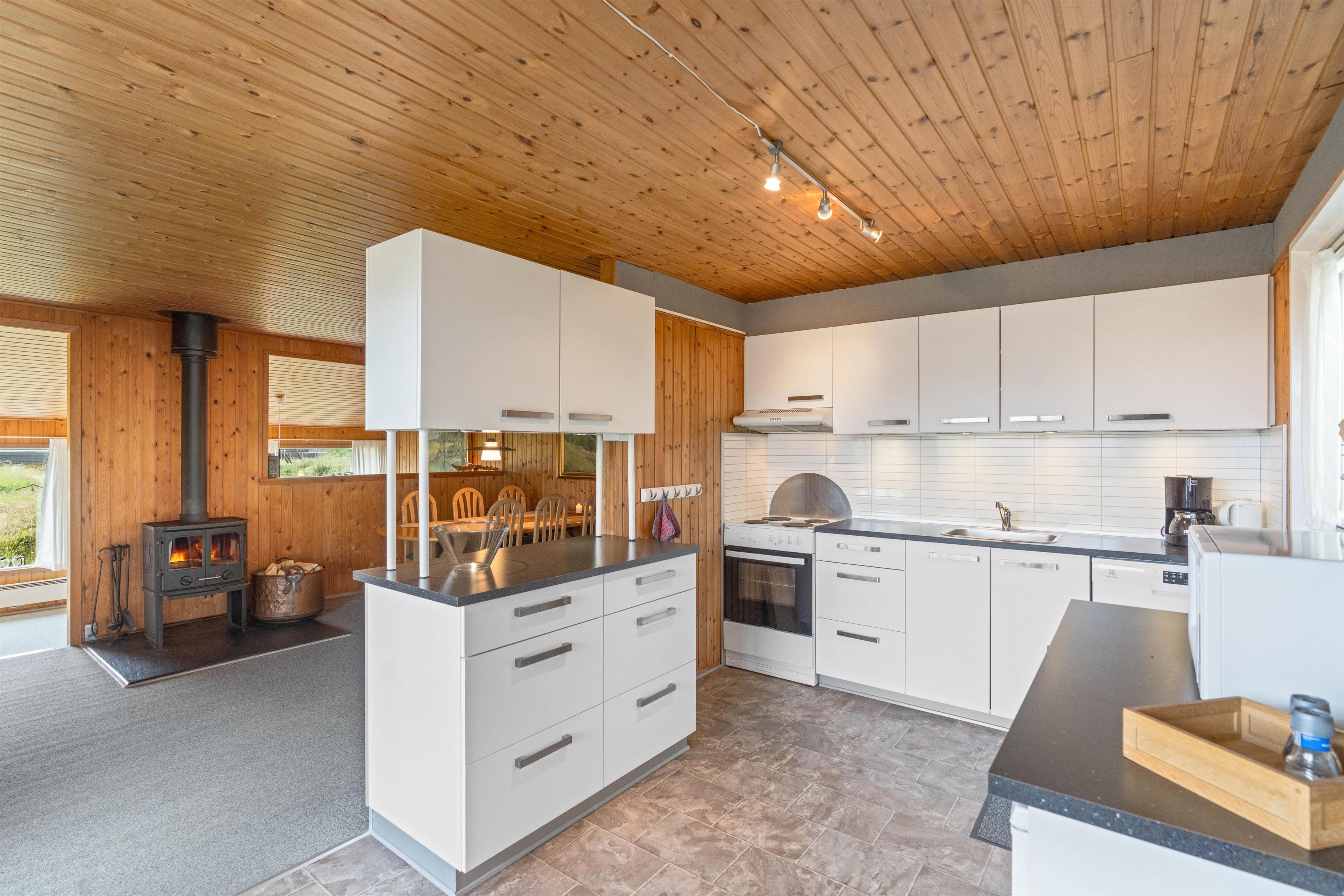 Feriehuset har desuden en lille tv-stue og en større stue med spiseplads og brændeovn.