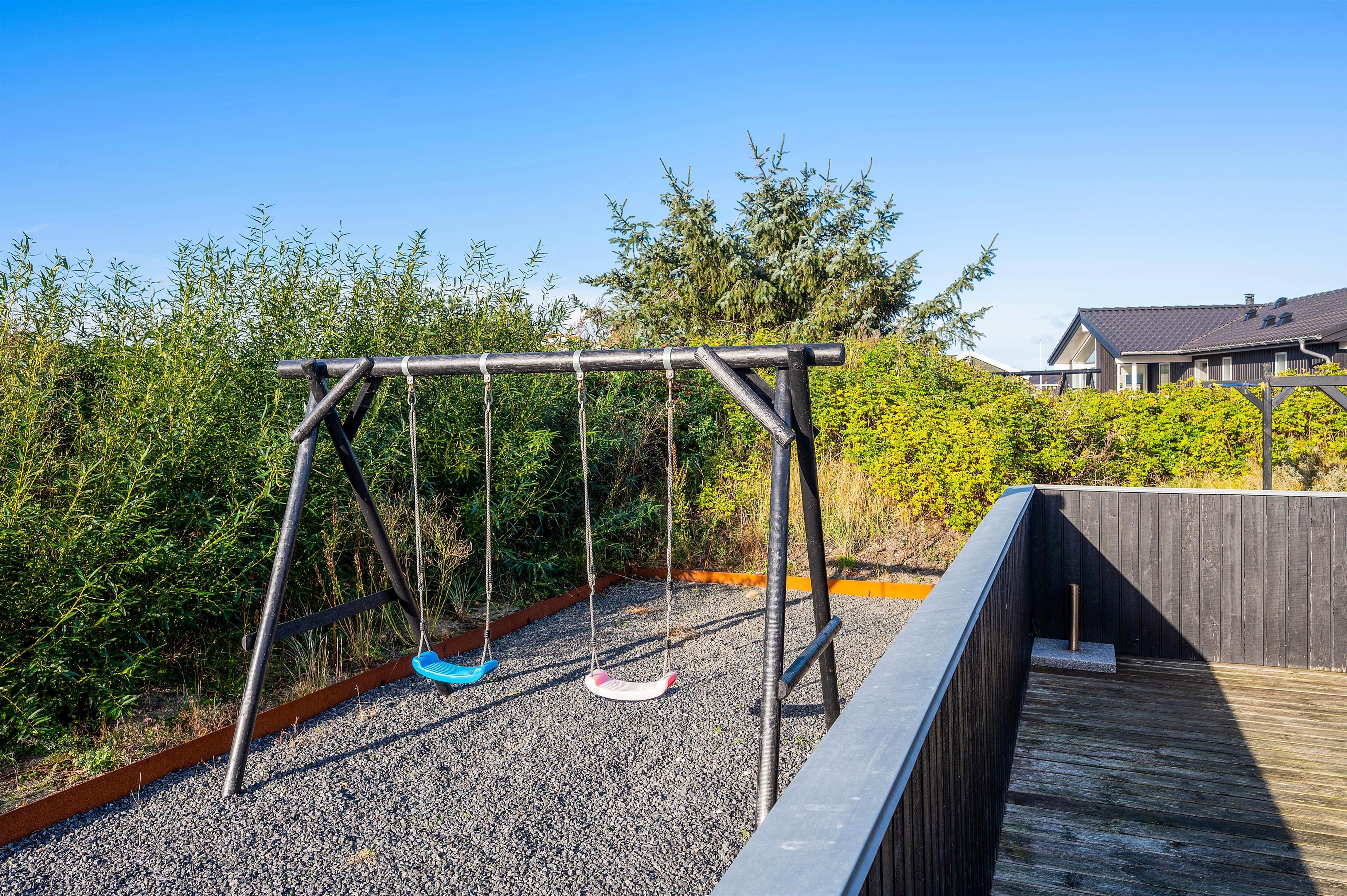 Sommerhuset er roligt beliggende for enden af en lille stikvej, kun få hundrede meter fra stranden. Her er en fin lukket terrasse med havemøbler, liggestole og grill. Til de mindste er der opsat gynger på den fine naturgrund.