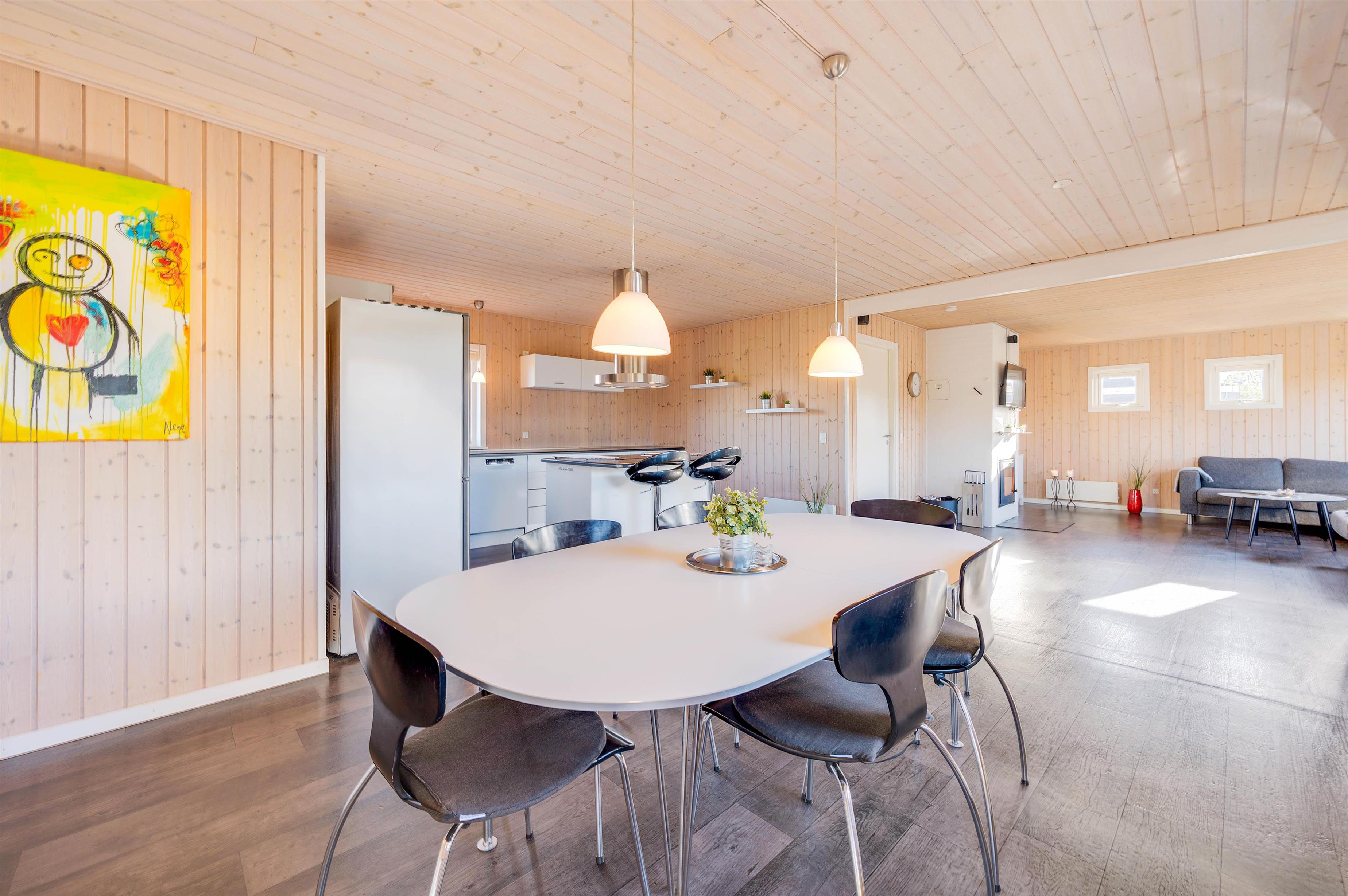 Stuen er stor og rummelig, smagfuldt møbleret og står i åben forbindelse med det flotte køkken, som har opvaskemaskine og stort “amerikaner” køleskab med fryser. Feriehuset har desuden gratis trådløst internet.