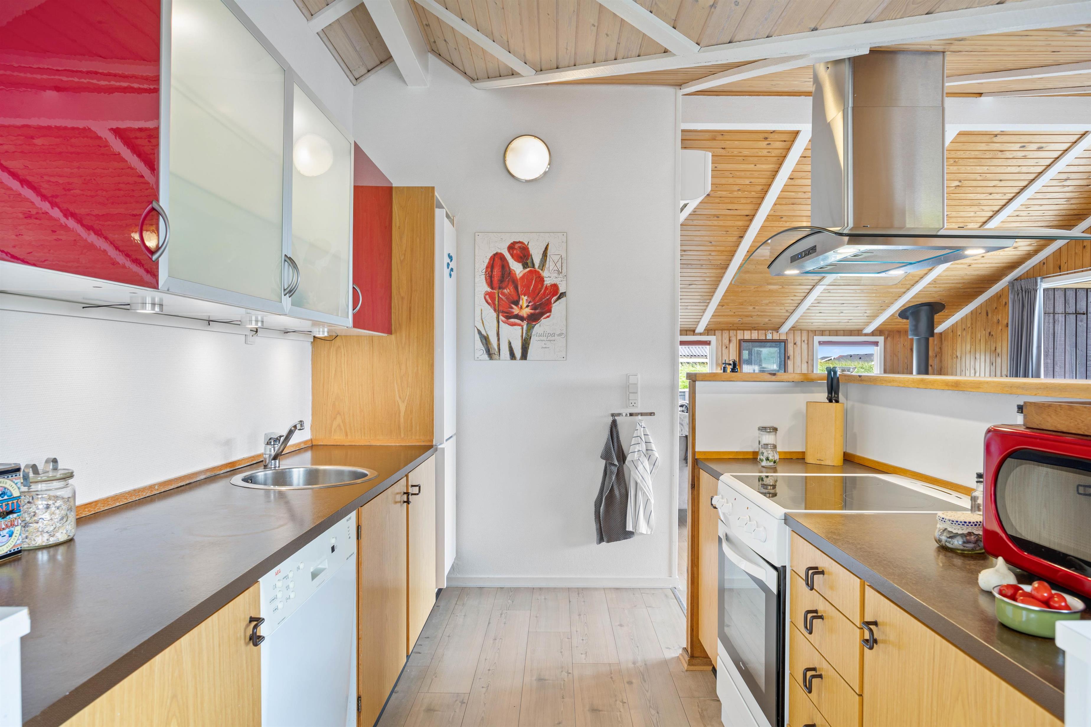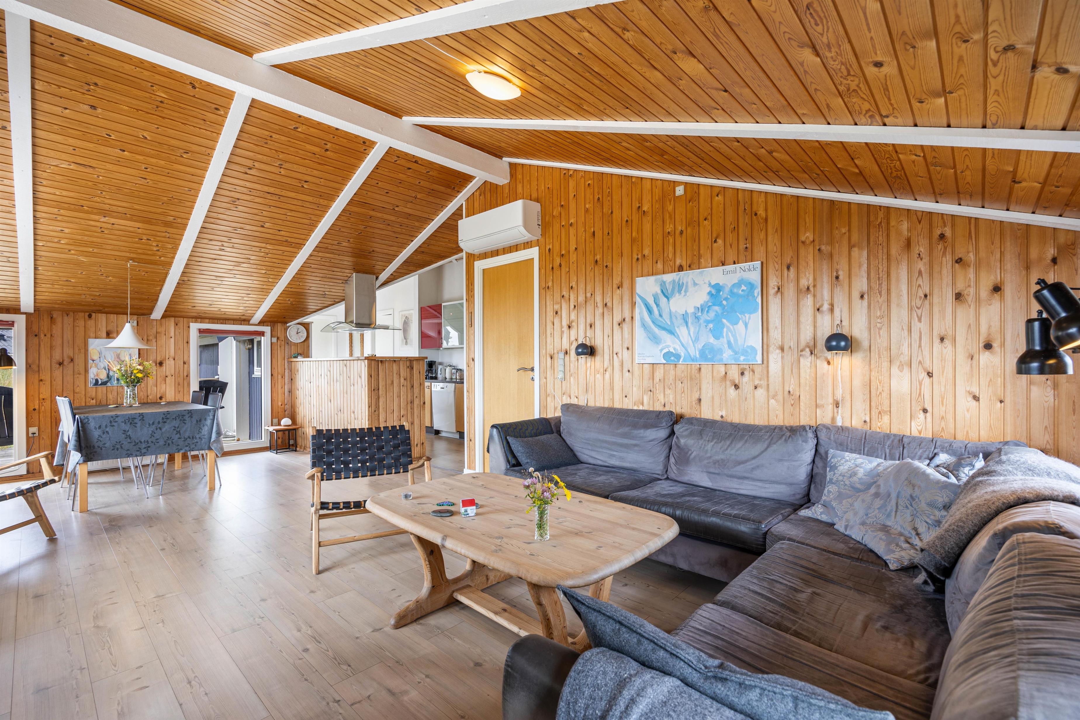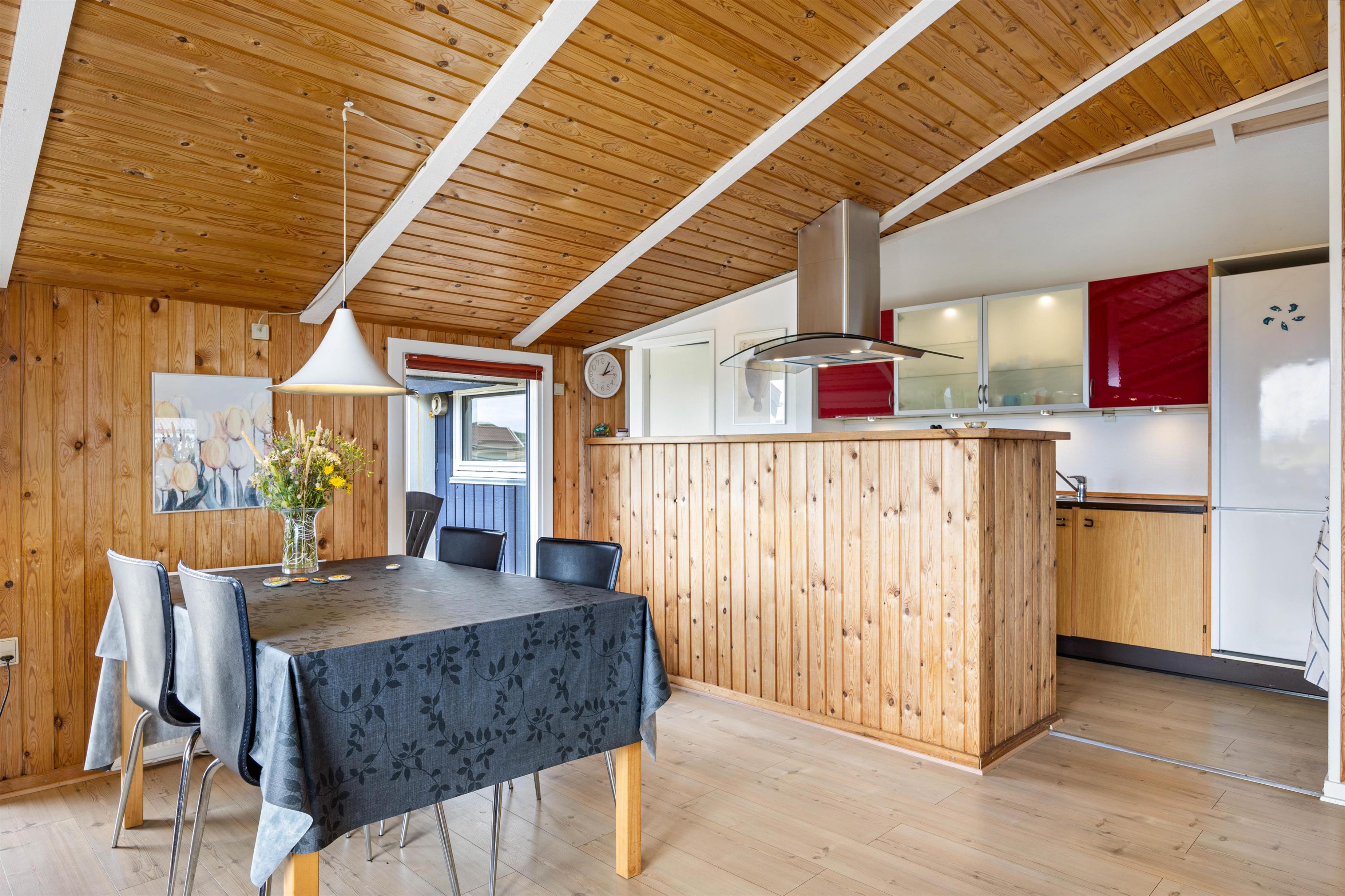 Køkkenet med opvaskemaskine og en separat fryser på 84 liter er åbent i forbindelse med spiseområdet og sofagruppen, så her kan alle have forskellige beskæftigelser, mens I alligevel er i kontakt med hinanden. Nyd varmen fra ilden i brændeovnen på kølige dage eller i aftentimerne. Den omkostnings- og energibesparende varmepumpe giver hurtigt en tilpas temperatur i sommerhuset.