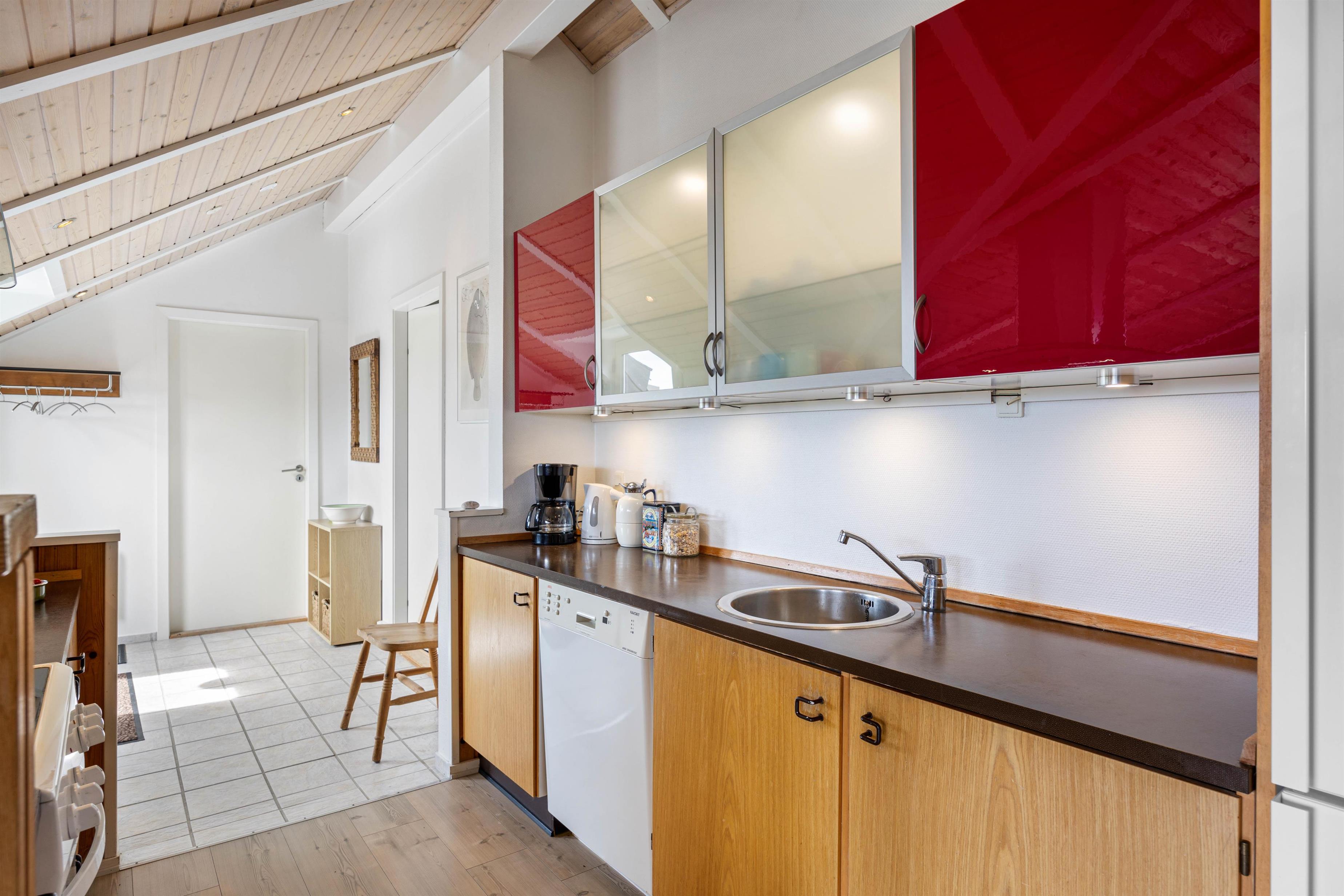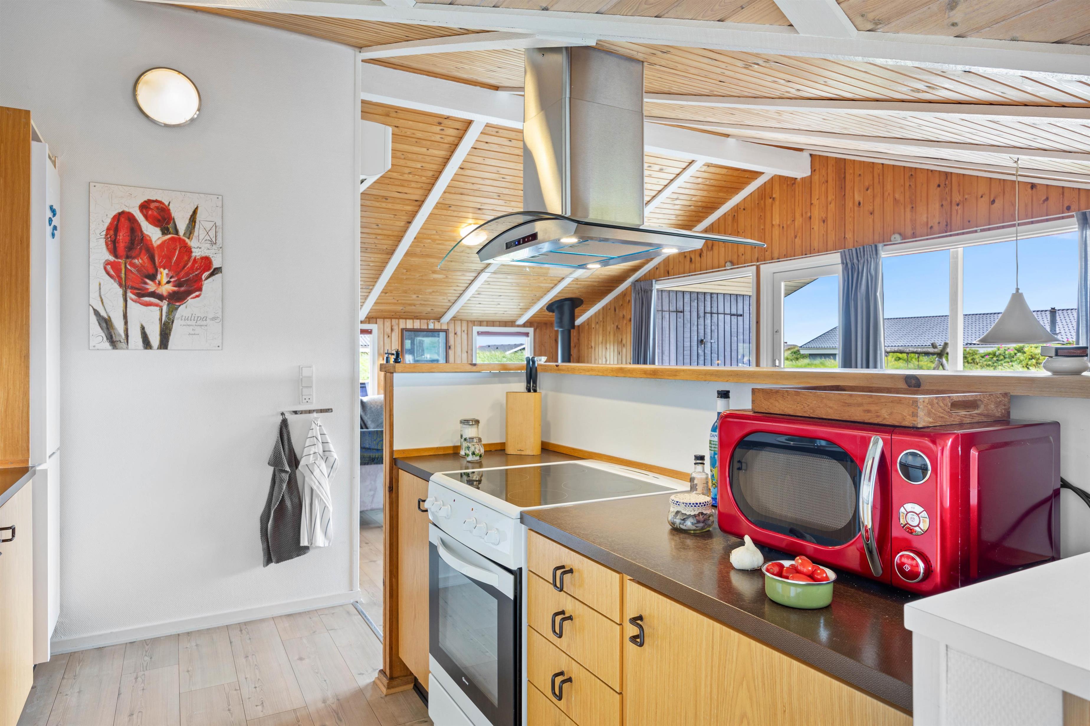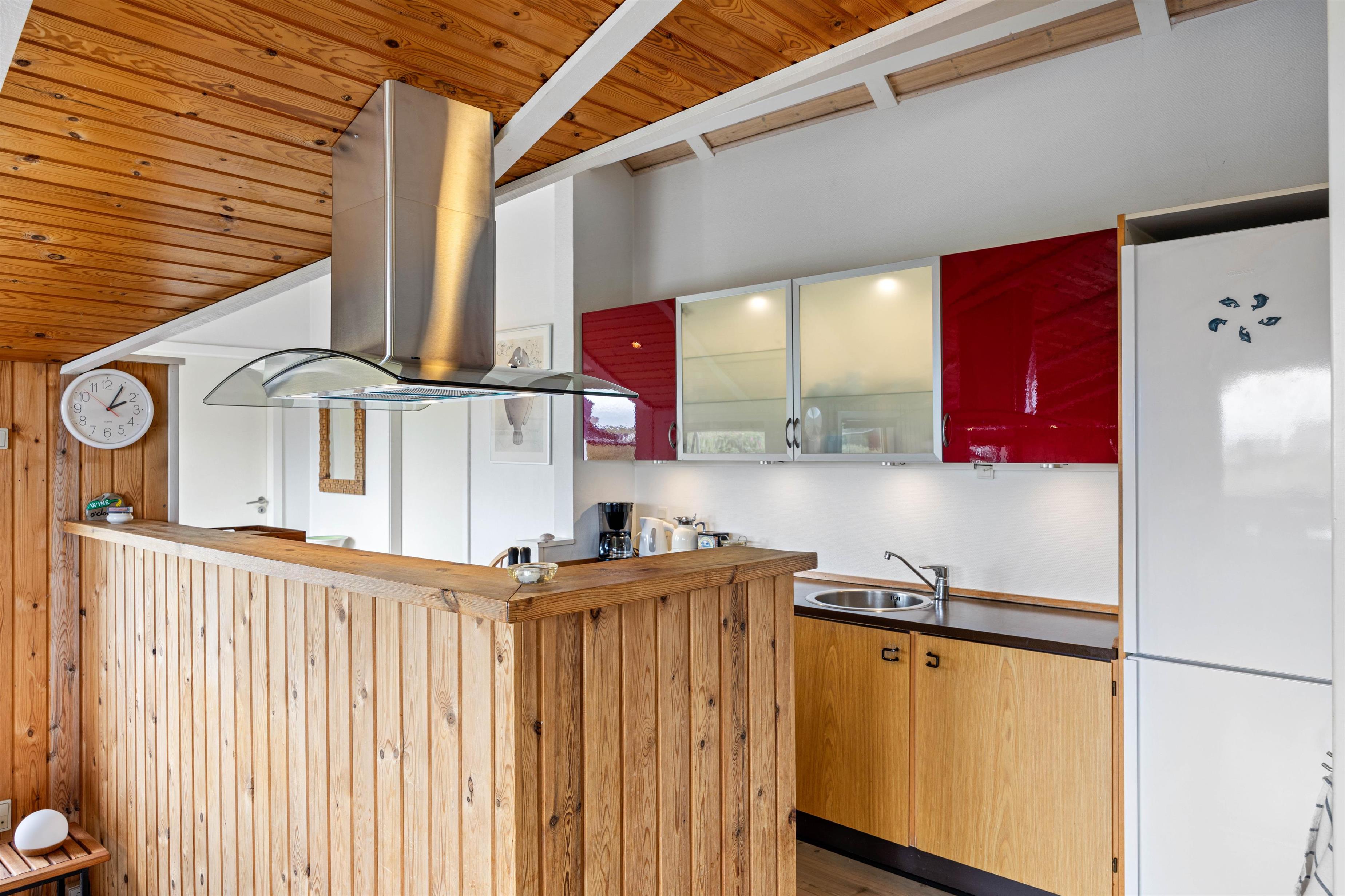 Køkkenet med opvaskemaskine og en separat fryser på 84 liter er åbent i forbindelse med spiseområdet og sofagruppen, så her kan alle have forskellige beskæftigelser, mens I alligevel er i kontakt med hinanden. Nyd varmen fra ilden i brændeovnen på kølige dage eller i aftentimerne. Den omkostnings- og energibesparende varmepumpe giver hurtigt en tilpas temperatur i sommerhuset.