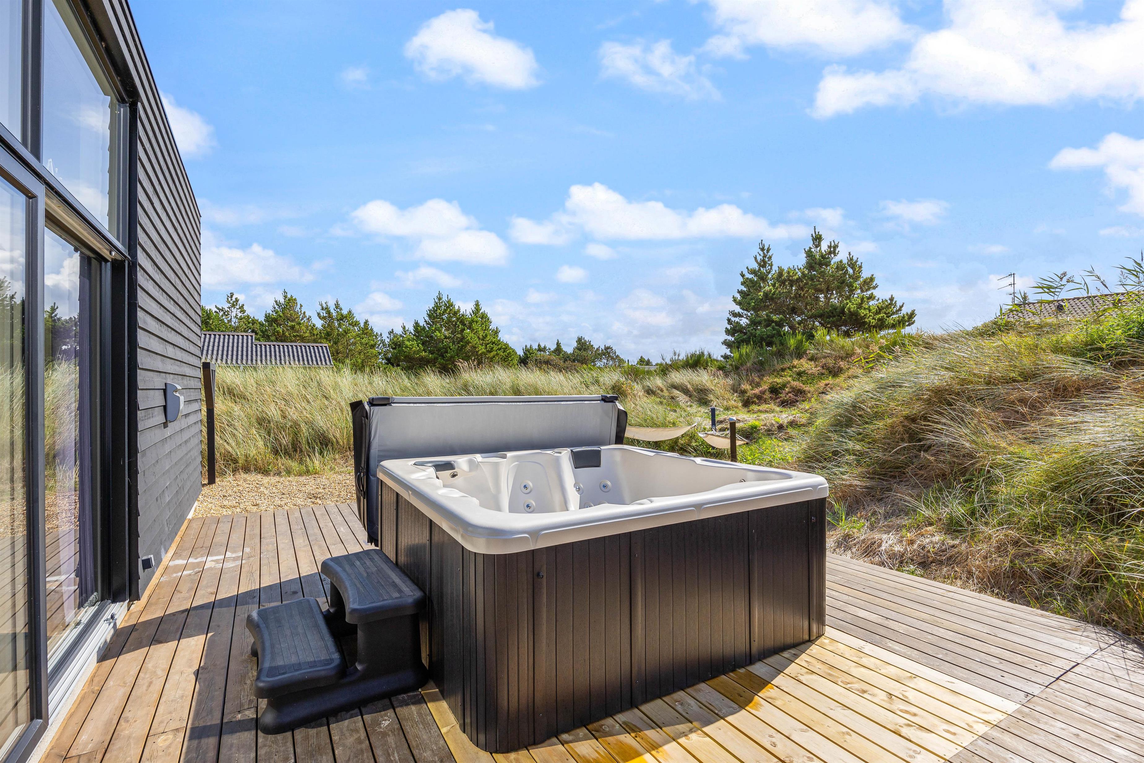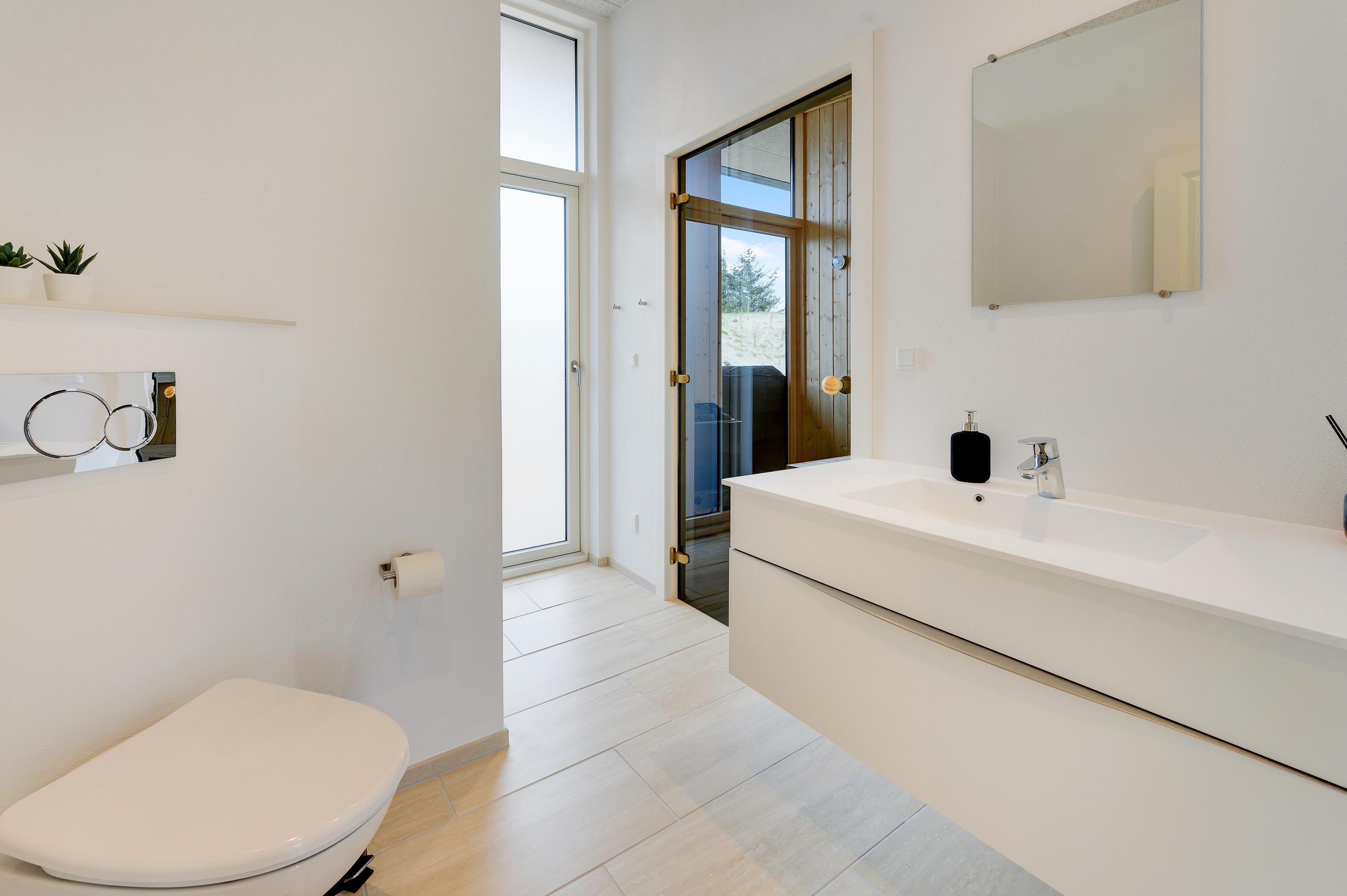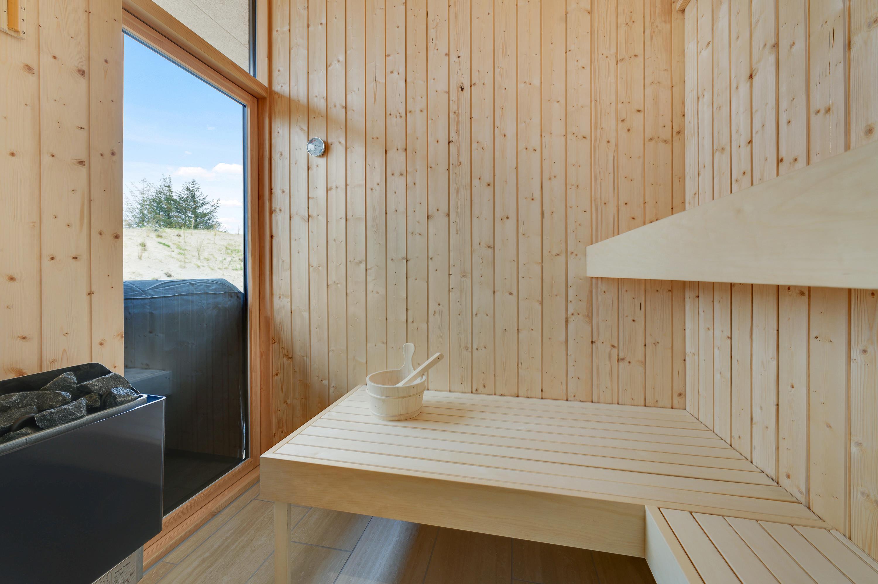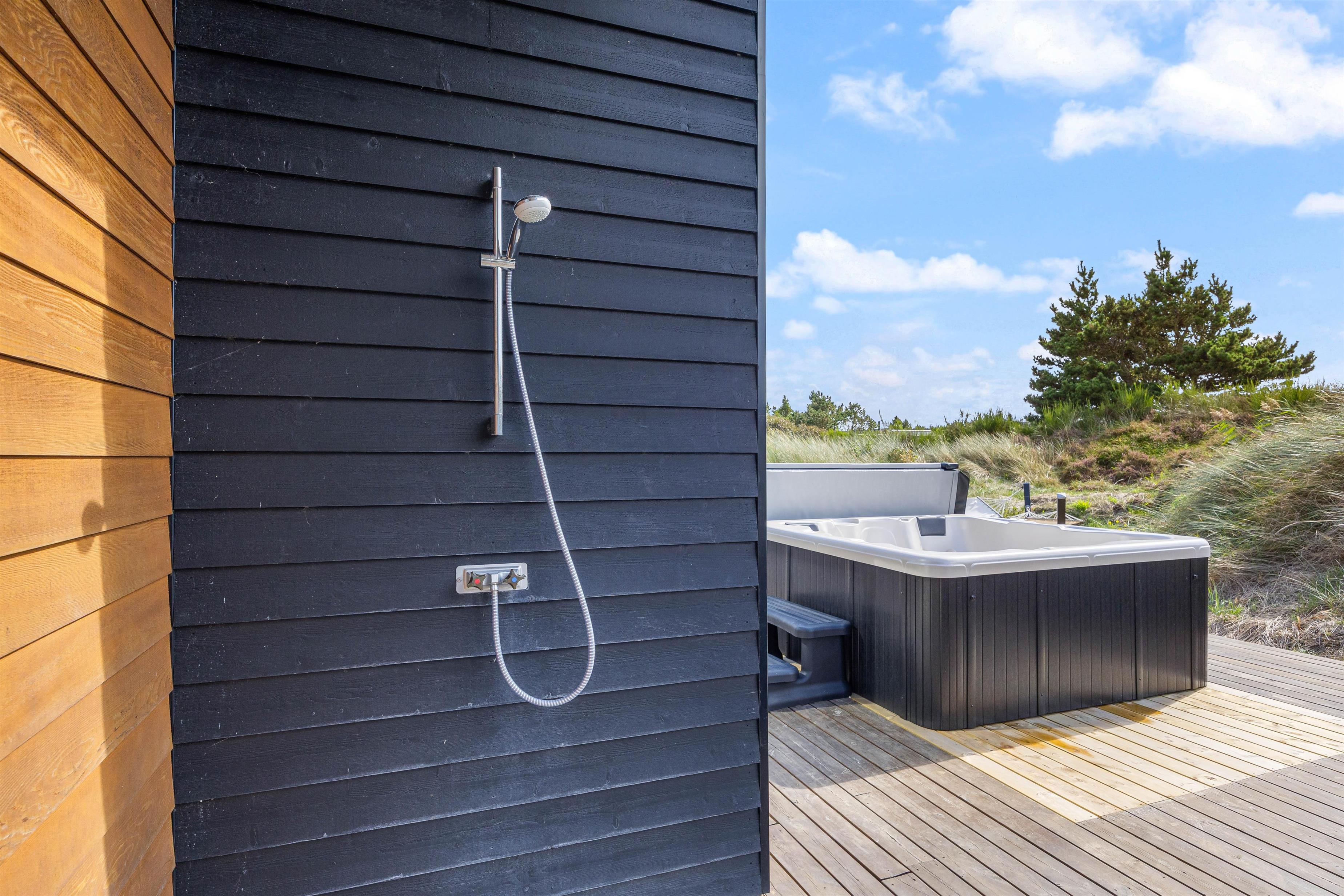 I kan også læne jer tilbage i udespaen og nyde stjernehimmelen med et glas vin på kanten for derefter at tage et friskt brus under udebruseren (kan benyttes fra april til november) eller slappe af i saunaen, som altsammen er en del af husets wellnessområde.