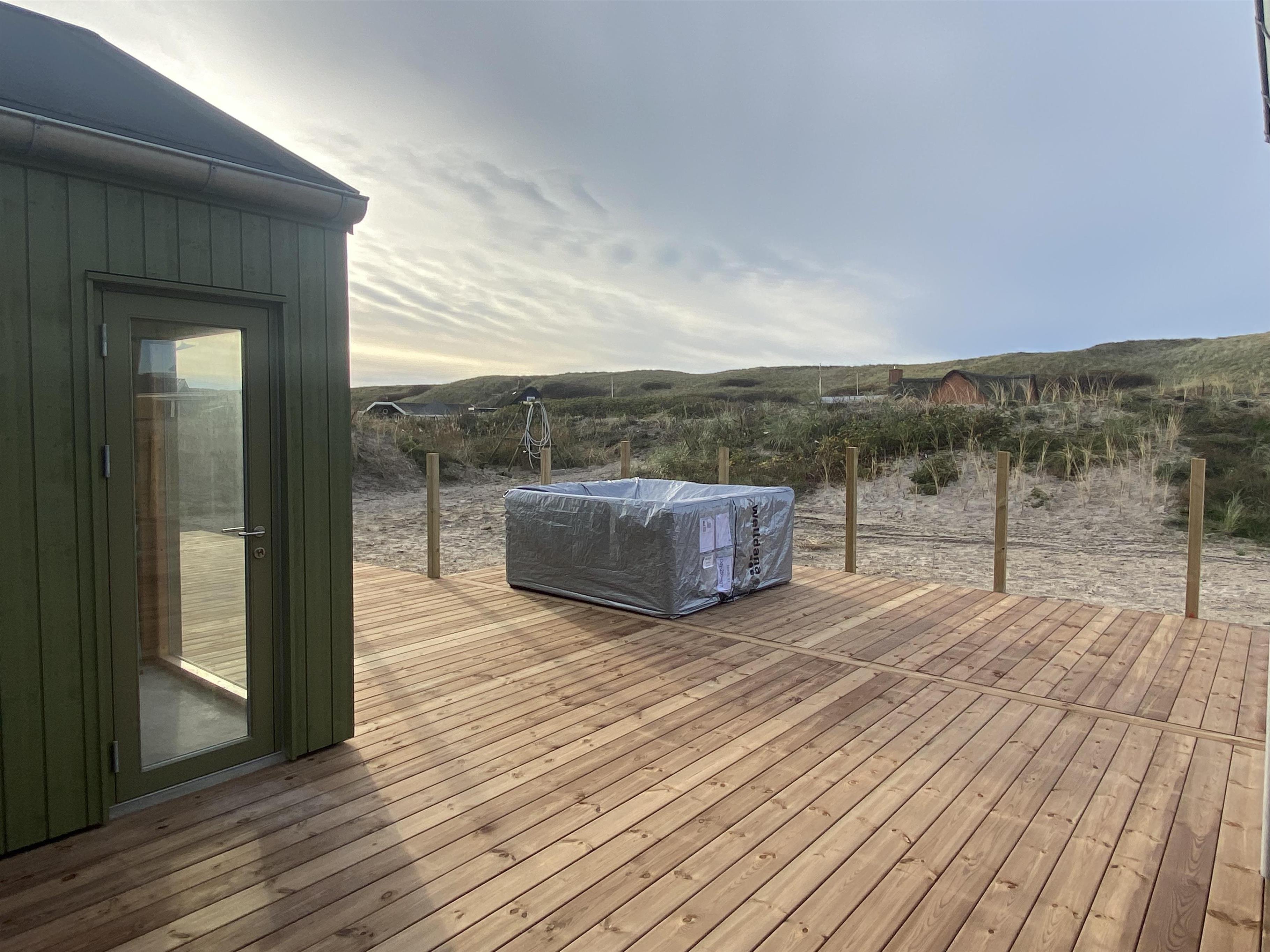 Udenfor venter en 2483 m² stor naturgrund med plads til leg, afslapning og fællesstunder. Den lukkede og delvist overdækkede terrasse indbyder til måltider i det fri, solbadning og hyggelige stunder i læ. Her finder I også en udespa og en udebruser med både koldt og varmt vand, der kan benyttes året rundt – perfekte faciliteter til en afslappende stund under åben himmel. Fra terrassen er der desuden adgang til sommerhusets sauna, hvor I kan nyde varmen efter en oplevelsesrig feriedag.