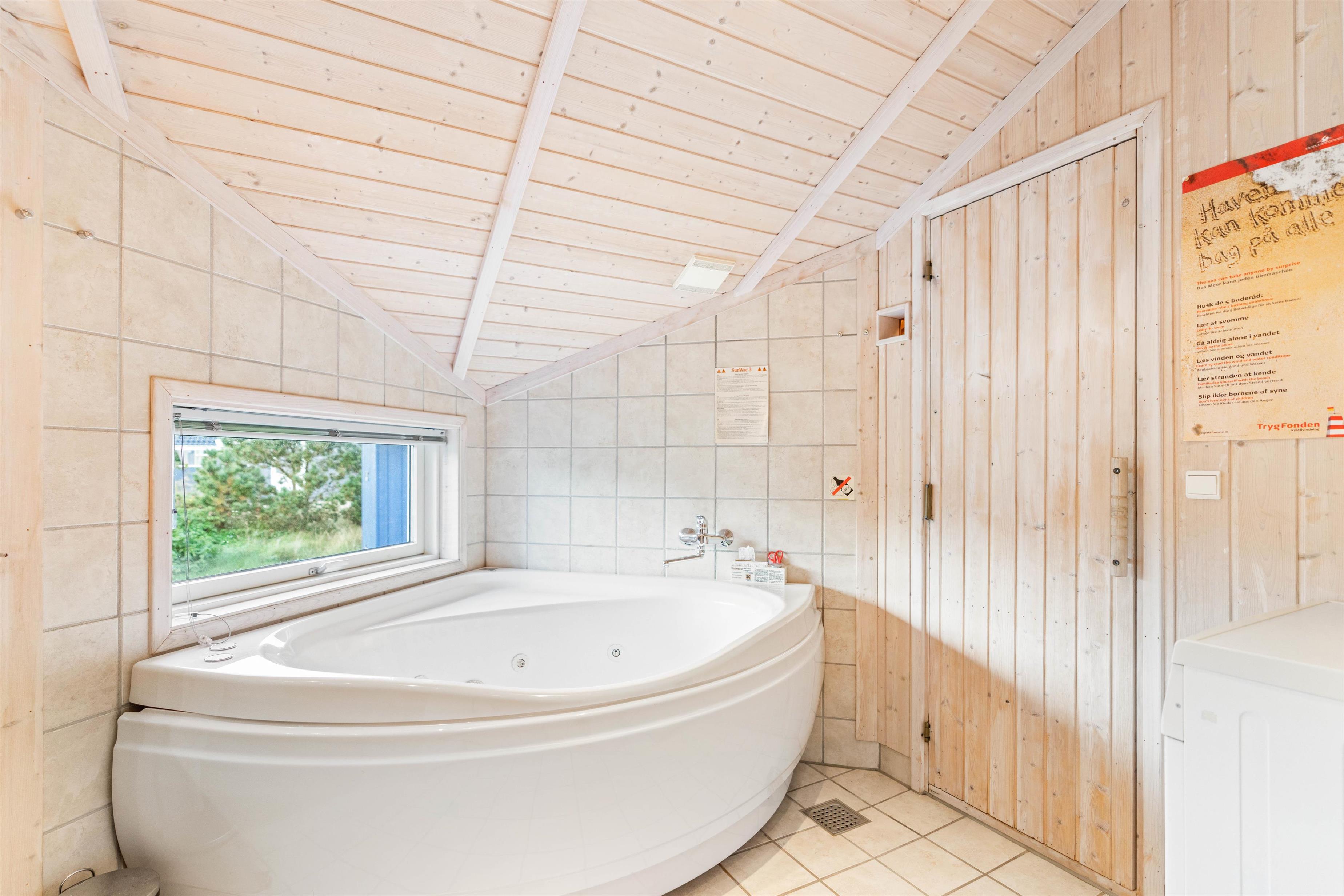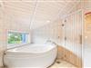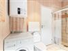 Der er et flot badeværelse med hjørnespa, sauna og bruseniche, en vaskemaskine, og så er der også gulvvarme. Gæstetoilettet ligger umiddelbart ved siden af det store badeværelse og sørger for, at der ikke bliver for lang kø om morgenen.