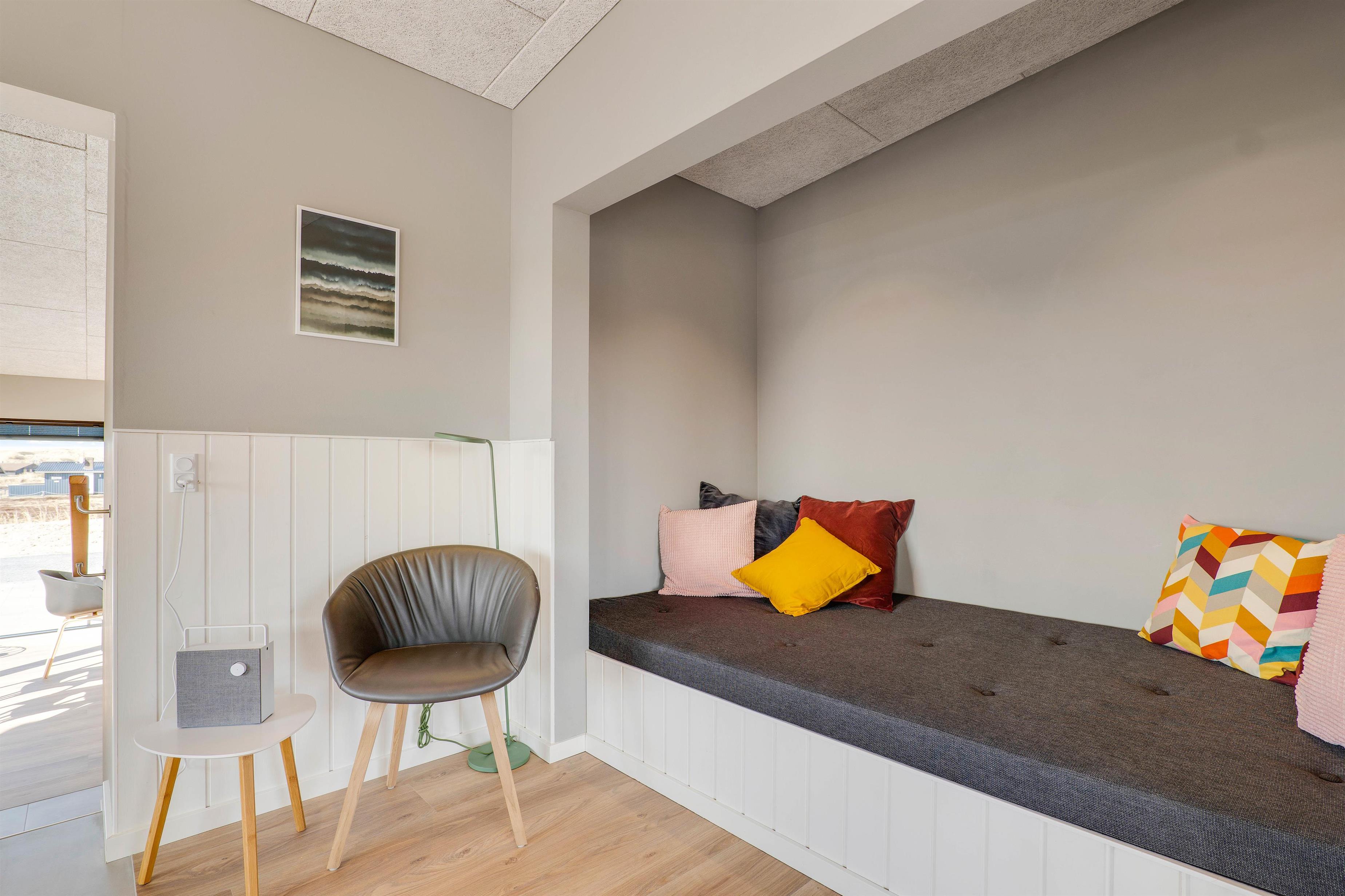 Centrum i det moderne sommerhus er stuen og køkkenet. Her kan I hygge jer ved den knitrende brændeovn med et sjovt spil kort. I mellemtiden kan familiens kok tilberede et lækkert måltid i køkkenet – her er der både induktionskomfur, mikroovn og opvaskemaskine til rådighed.