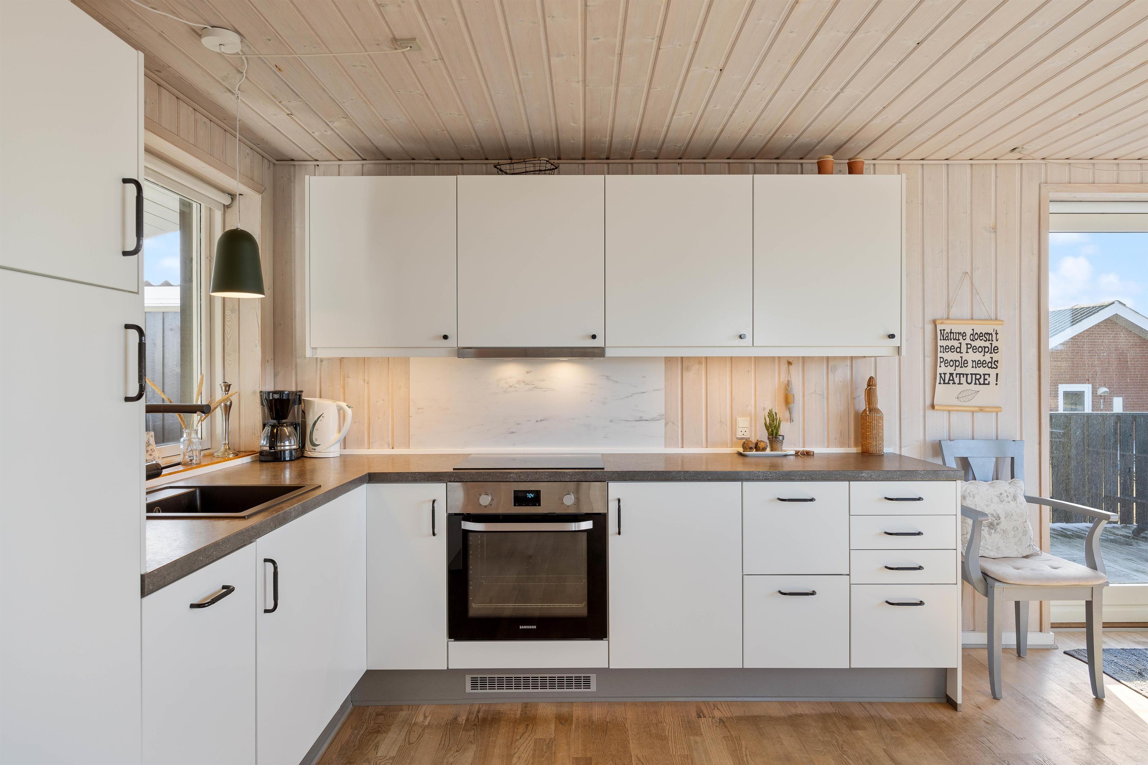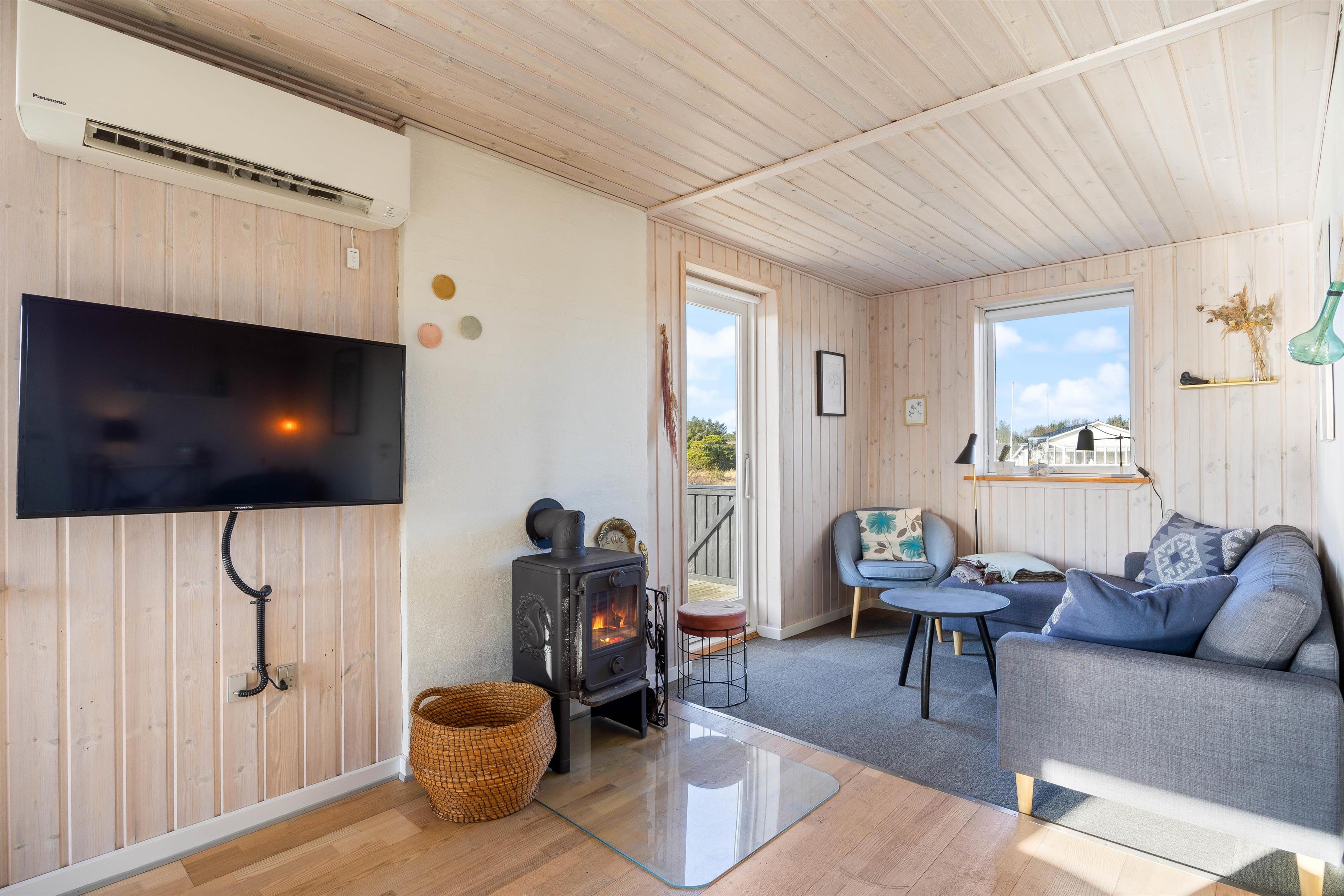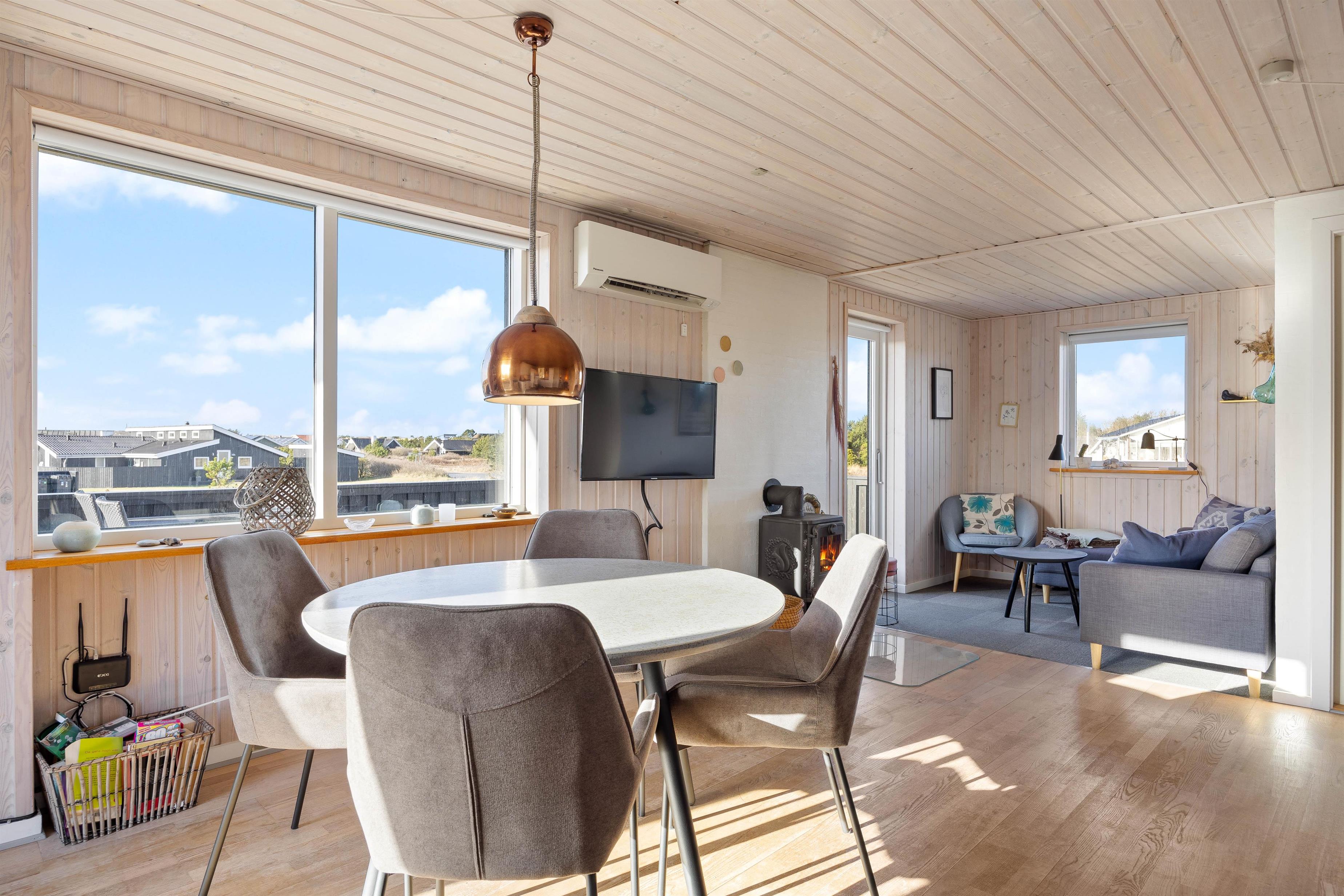 Man mærker feriestemningen straks, man træder ind ad døren til Sigfred Jensens Vej 4. De træbeklædte vægge og lofter samt det fine lysindfald giver en dejlig, luftig stemning. Den åbne planløsning gør, at stue, køkken og spisestue er samlet i et enkelt rum, hvor familien kan nyde at holde ferie sammen. Her vil alle føle sig hjemme, uanset om I bager eller laver mad i det lille, veludstyrede køkken med opvaskemaskine og induktionskomfur, eller I lægger puslespil sammen ved spisebordet. Tænd op i brændeovnen for hyggens skyld, den omkostnings- og energibesparende varmepumpe sørger for behagelige temperaturer i feriehuset. I sofagruppen kan I slappe af med en god bog, imens I nyder ilden i brændeovnen og den hyggelige varme.