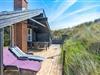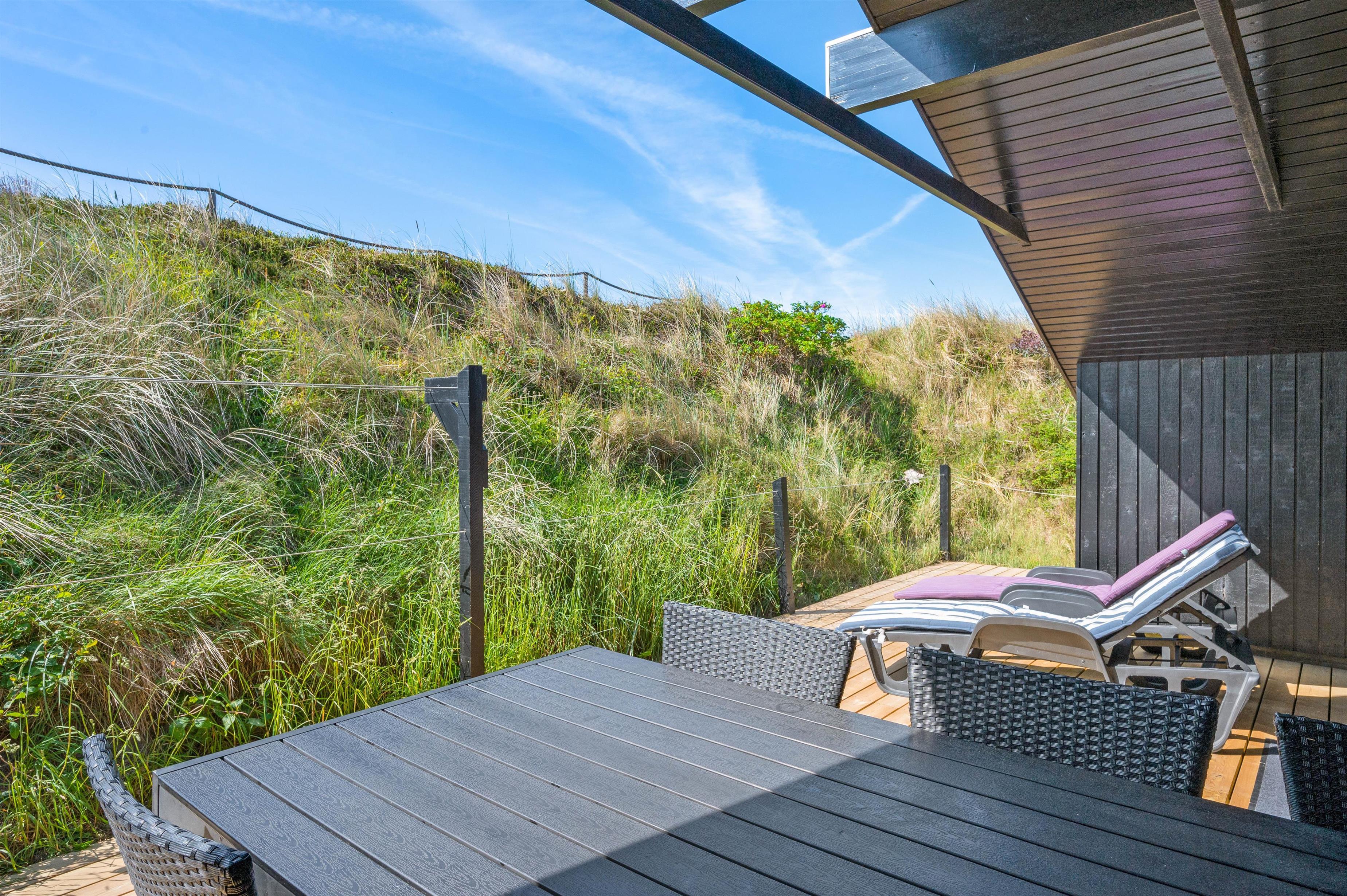 Den store møblerede terrasse har altid gode lækroge til ugeneret nydelse af solen og den friske salte havluft eller til de hyggelige grillaftener. Afstanden til sandstranden er kun ca. 250 meter, og efter bade- eller traveturen har sommerhuset en udendørs bruser til den hurtige skylning eller afsvaling. Udebruseren kan benyttes fra april til november.