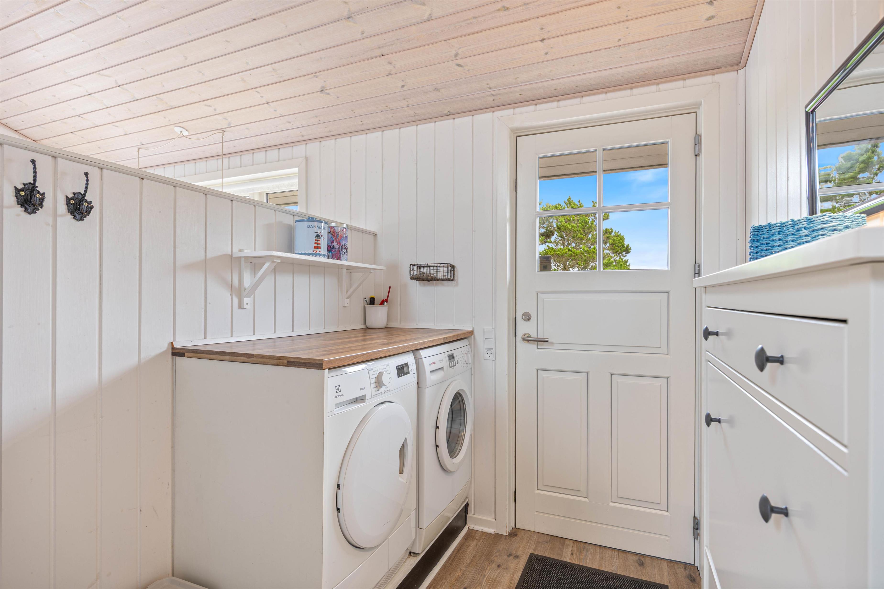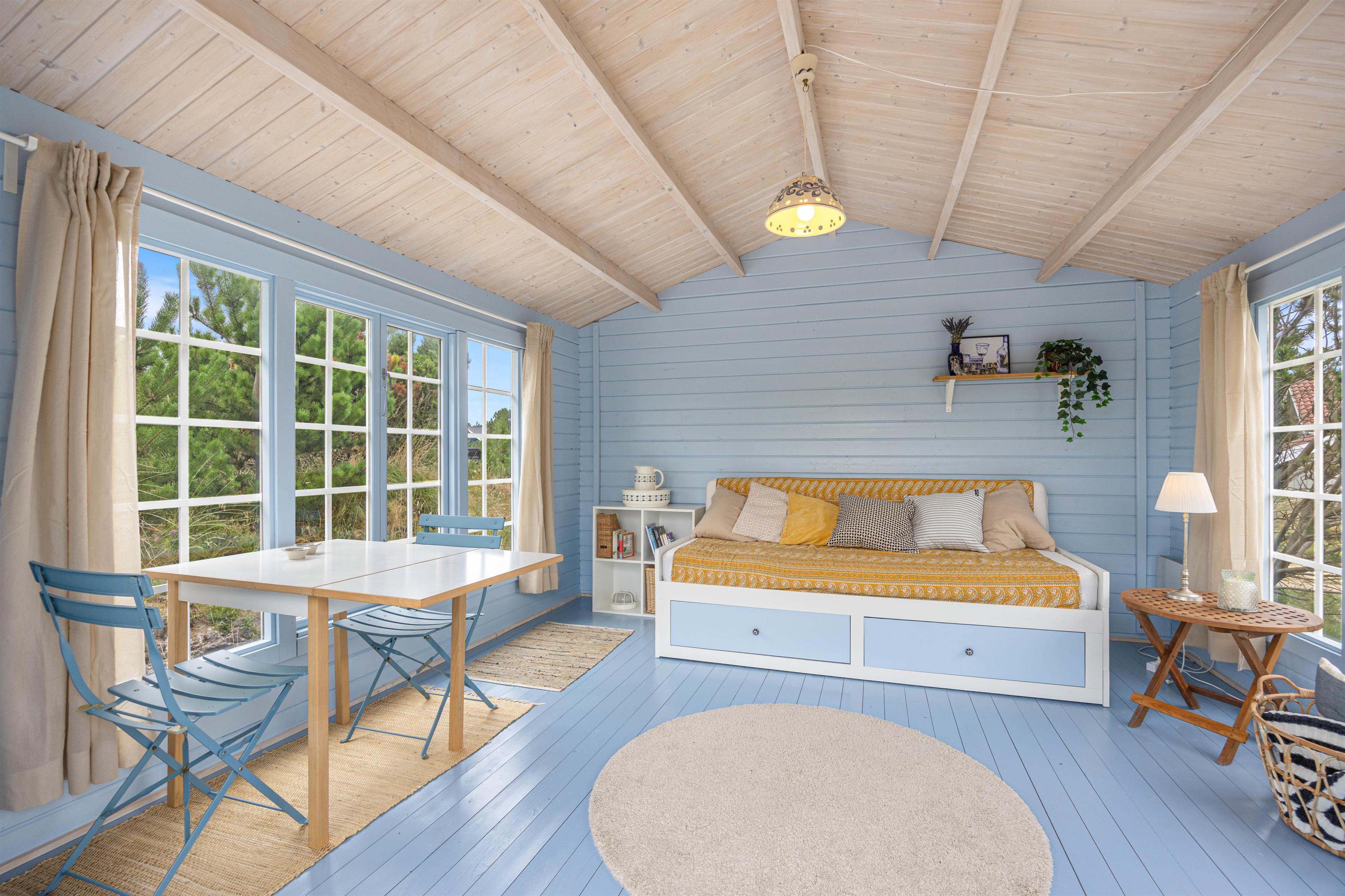 Sommerhuset har en varm og hjemlig atmosfære med personlige detaljer, der skaber den helt rette feriestemning. Køkken, spiseafdeling og stue ligger i åben forbindelse, så der er rig mulighed for at samles om madlavning, spil eller afslapning. Efter en dag fyldt med oplevelser kan I nyde en hyggelig aften foran den knitrende brændeovn, der giver både varme og ekstra hygge.