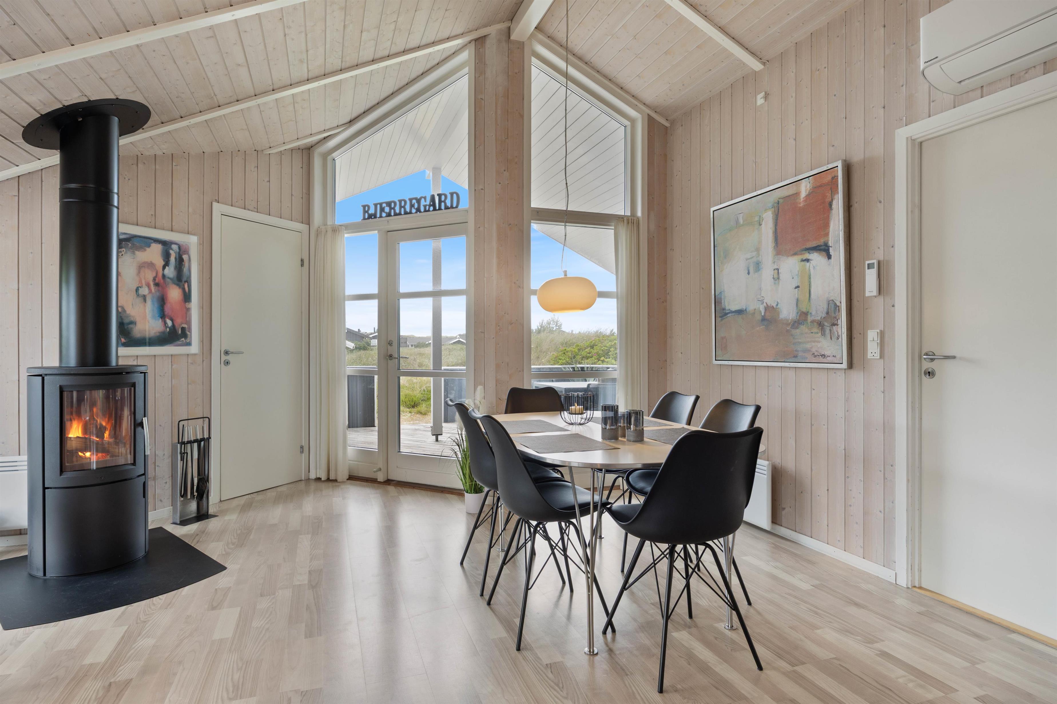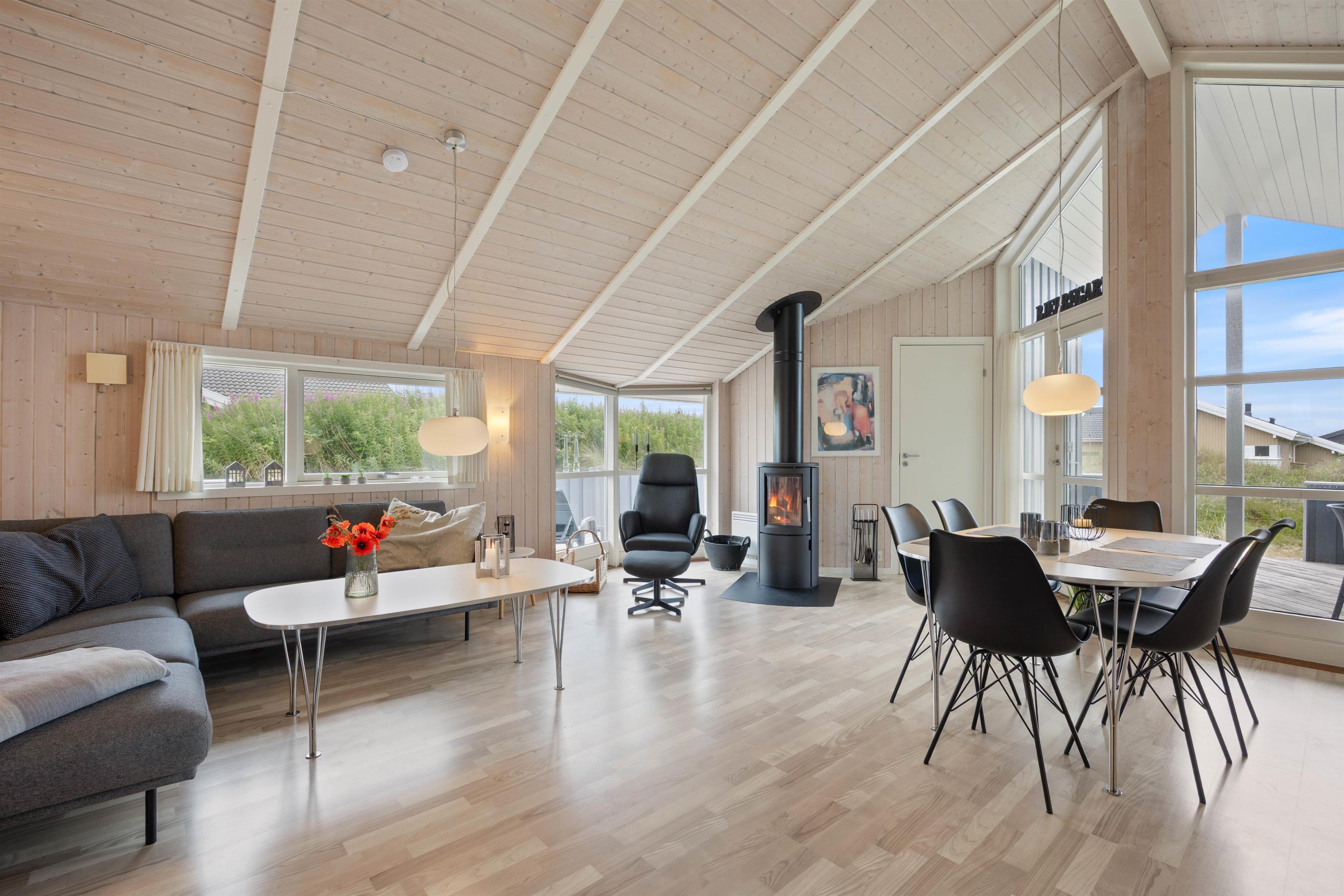 Stuen er smagfuldt indrettet, lys og hyggelig og med et sofahjørne, som indbyder til familiehygge - måske brætspil eller en god bog ved brændeovnen. Som et ekstra plus er der også varmepumpe i sommerhuset