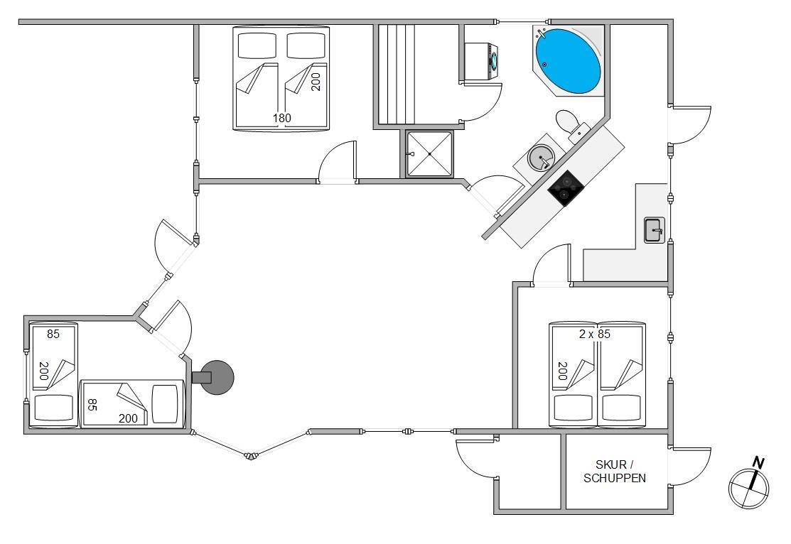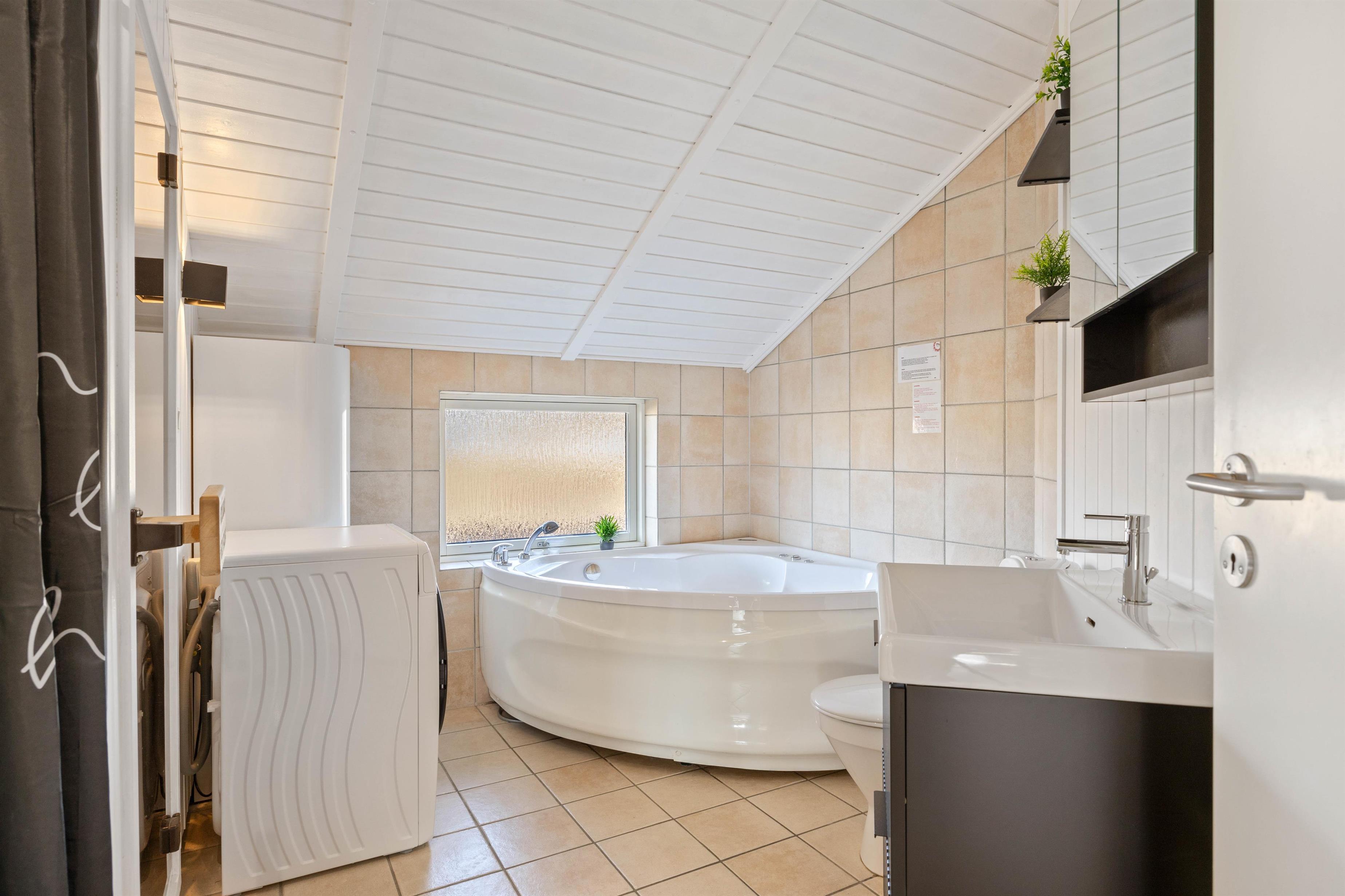 Badeværelset er praktisk indrettet og har alt, hvad man har brug for, inklusiv sauna og spabad, og i skuret finder man både vaskemaskine og tørretumbler, hvilket gør feriepakningen let.