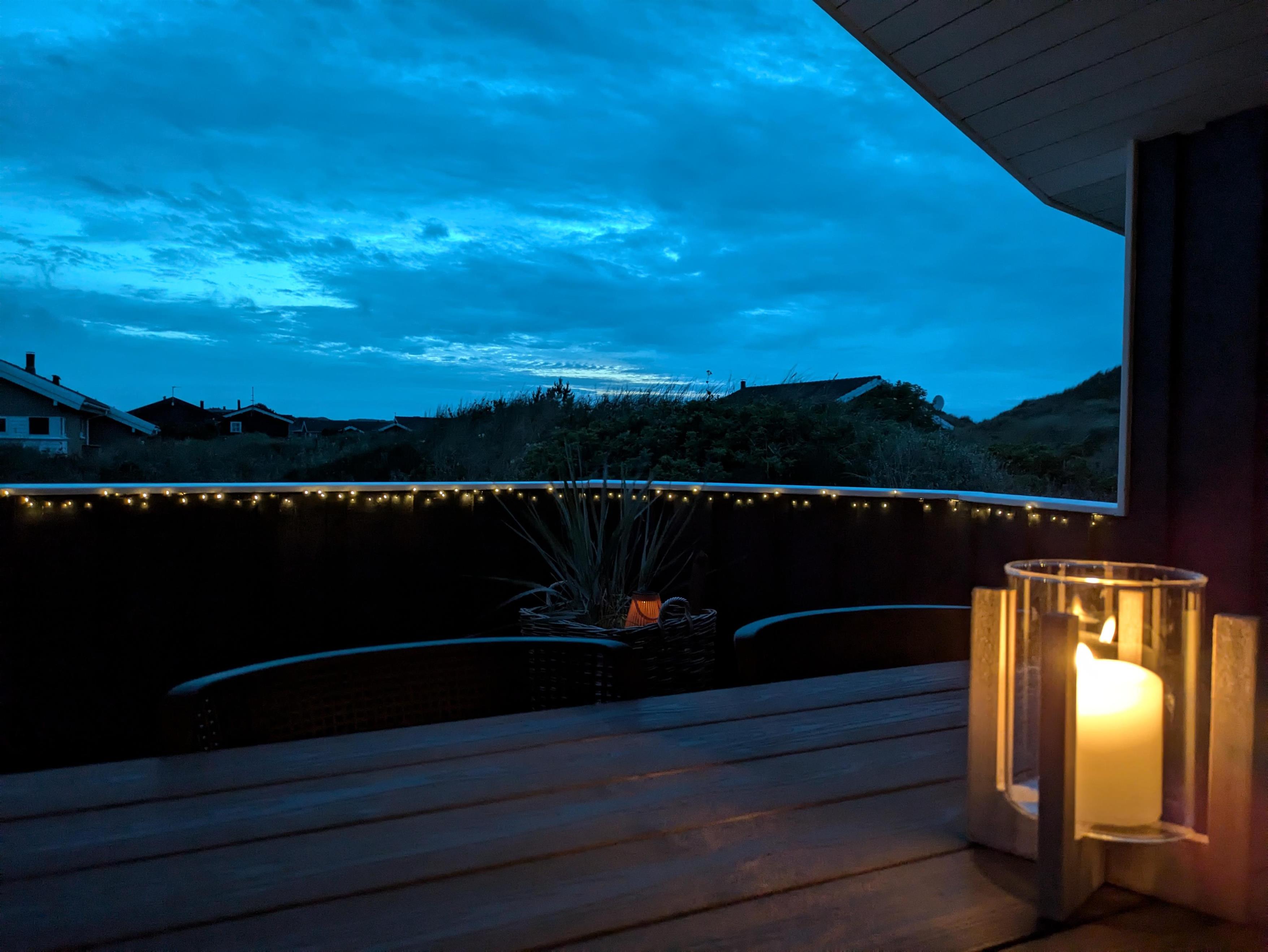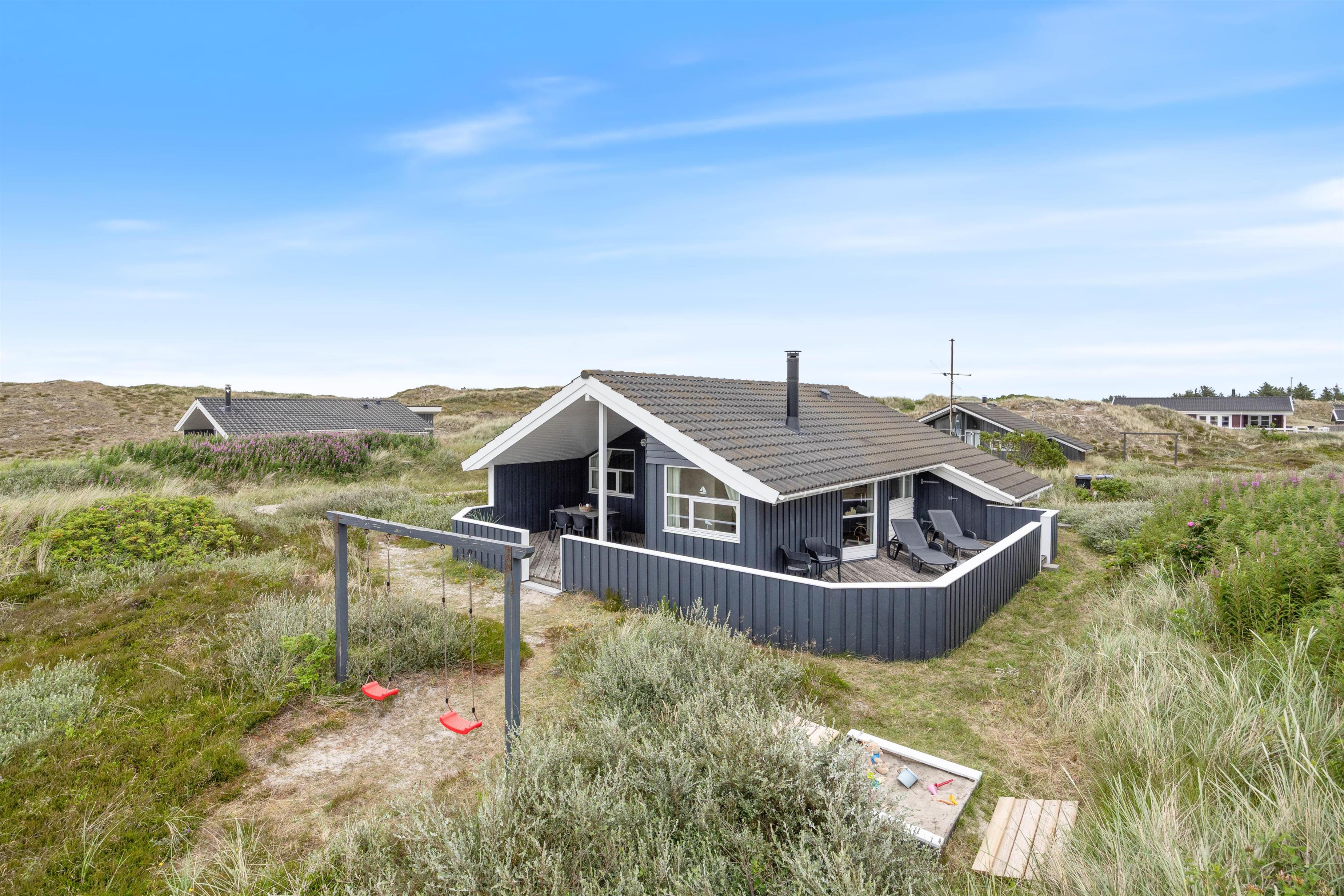 En hyggelig og lukket terrasse mod syd indbyder til masser af udendørs aktivitet. Her kan man nyde morgenkaffen til solopgangen over Ringkøbing Fjord mod øst, mens børnene gynger eller leger i sandkassen. – Sidst på dagen kan man nyde solnedgangen over klitterne mod vest, måske sammen med en veltilberedt grillmiddag på terrassen – og med havets beroligende brusen i baggrunden.