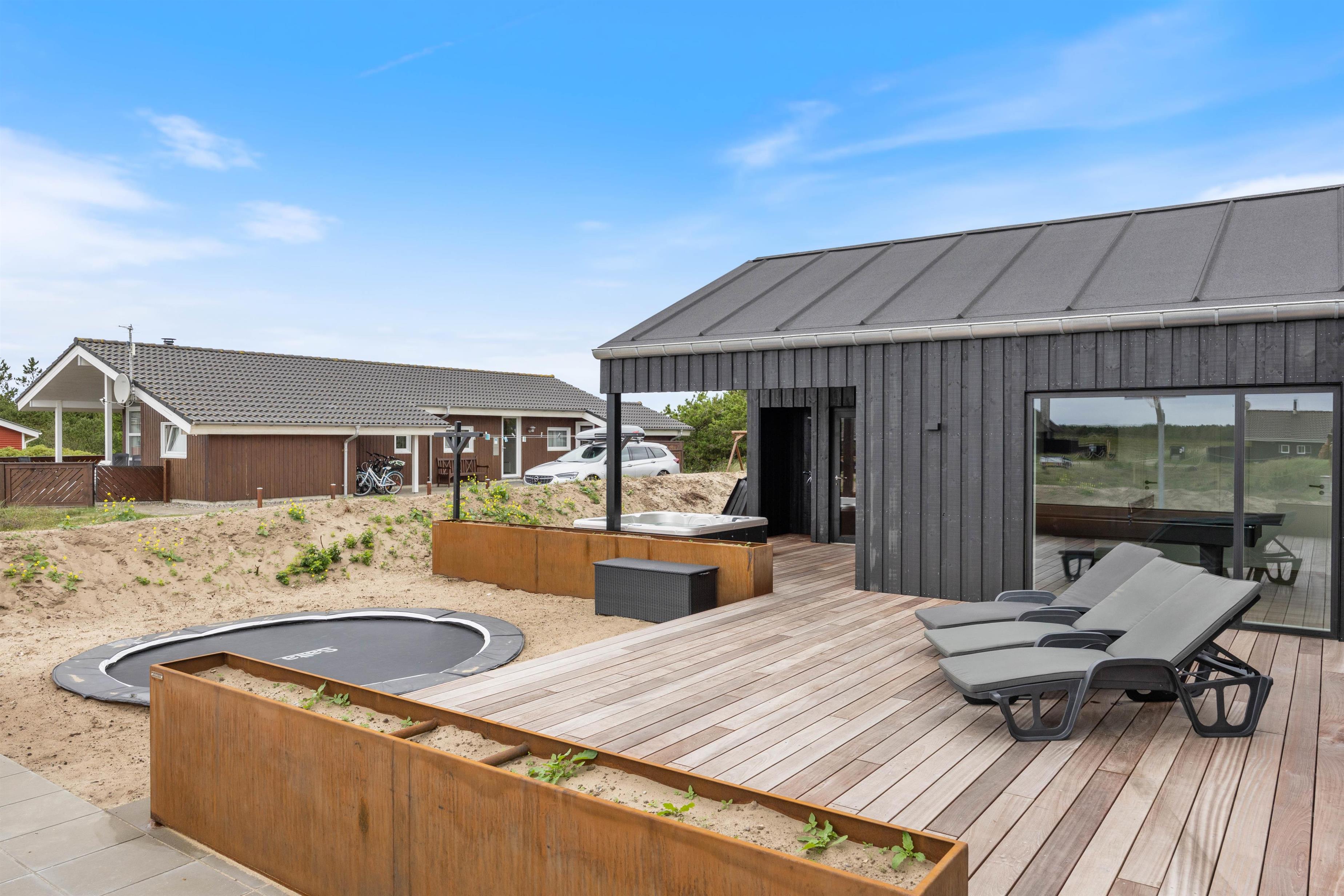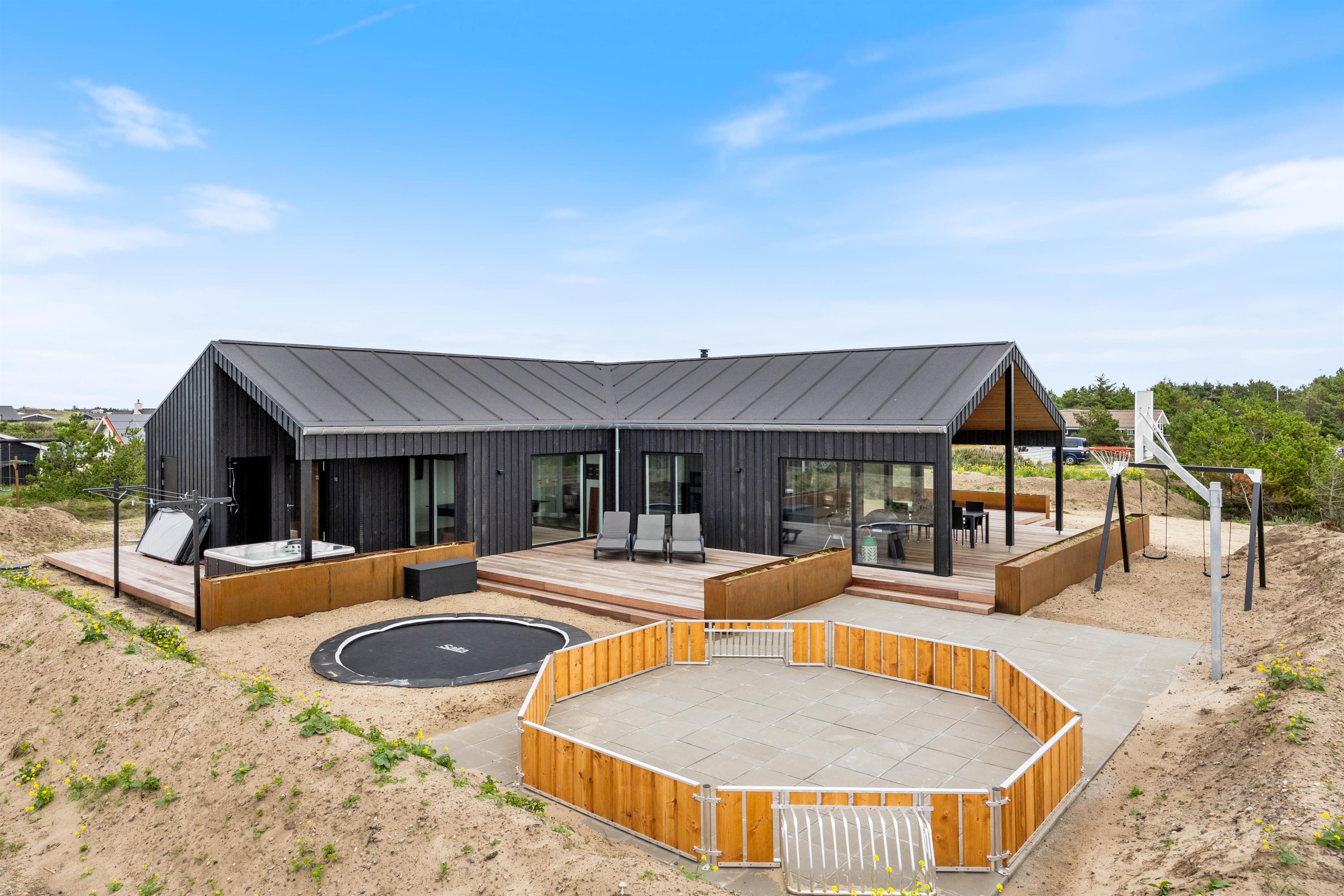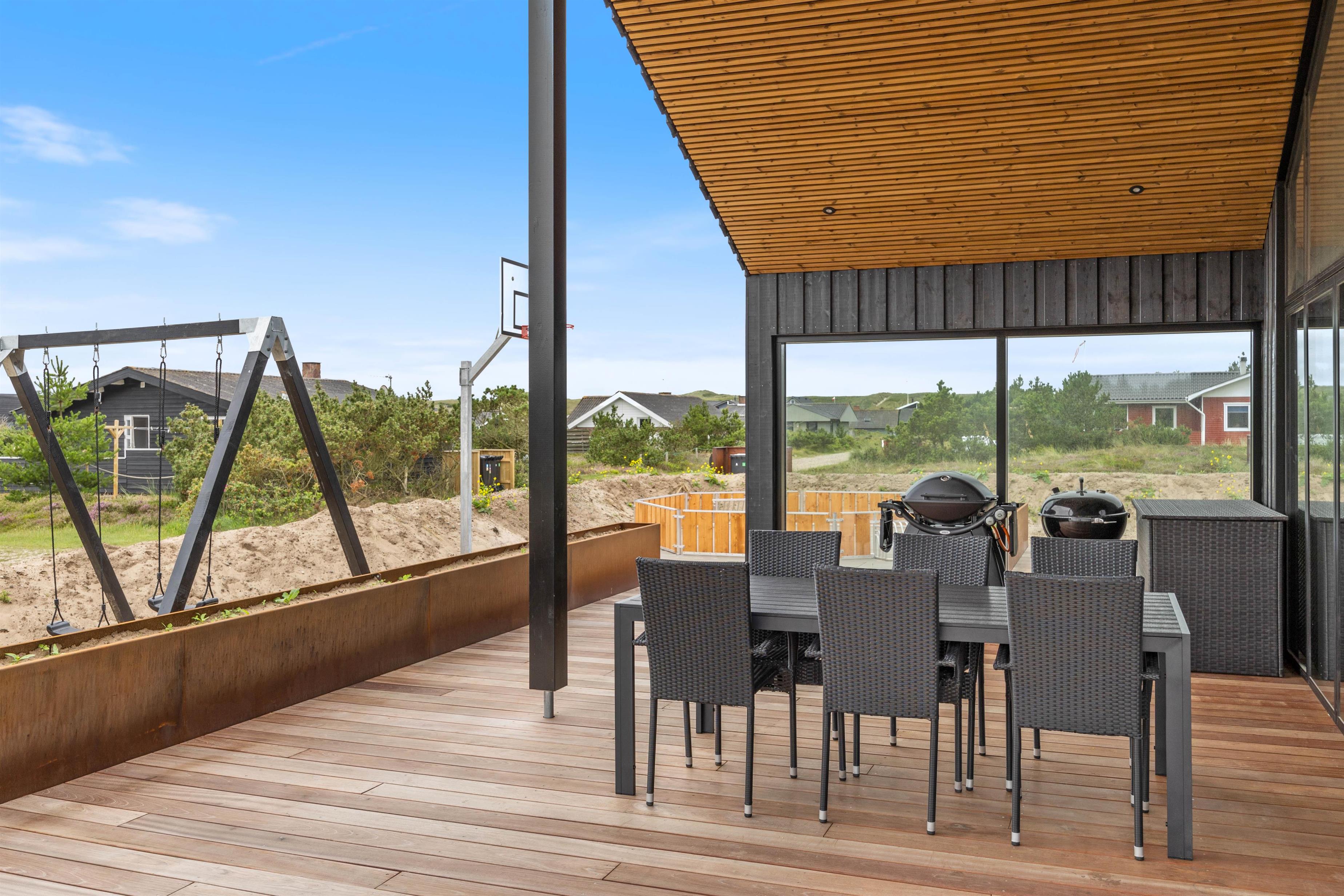 Fra sommerhuset har I flere udgange til den store terrasse, der er afskærmet og delvist overdækket. Her kan I slappe af på en lun sommerdag, mens børnene leger på naturgrunden, som både har gyngestativ, trampolin og panna bane.