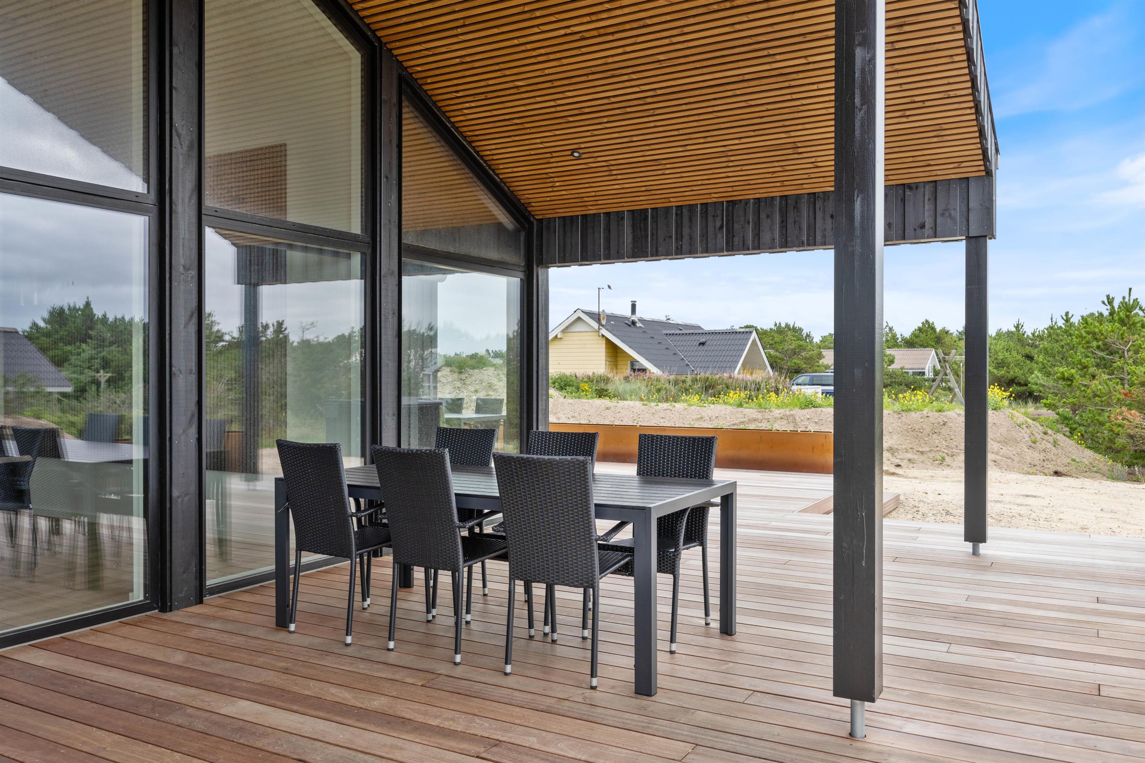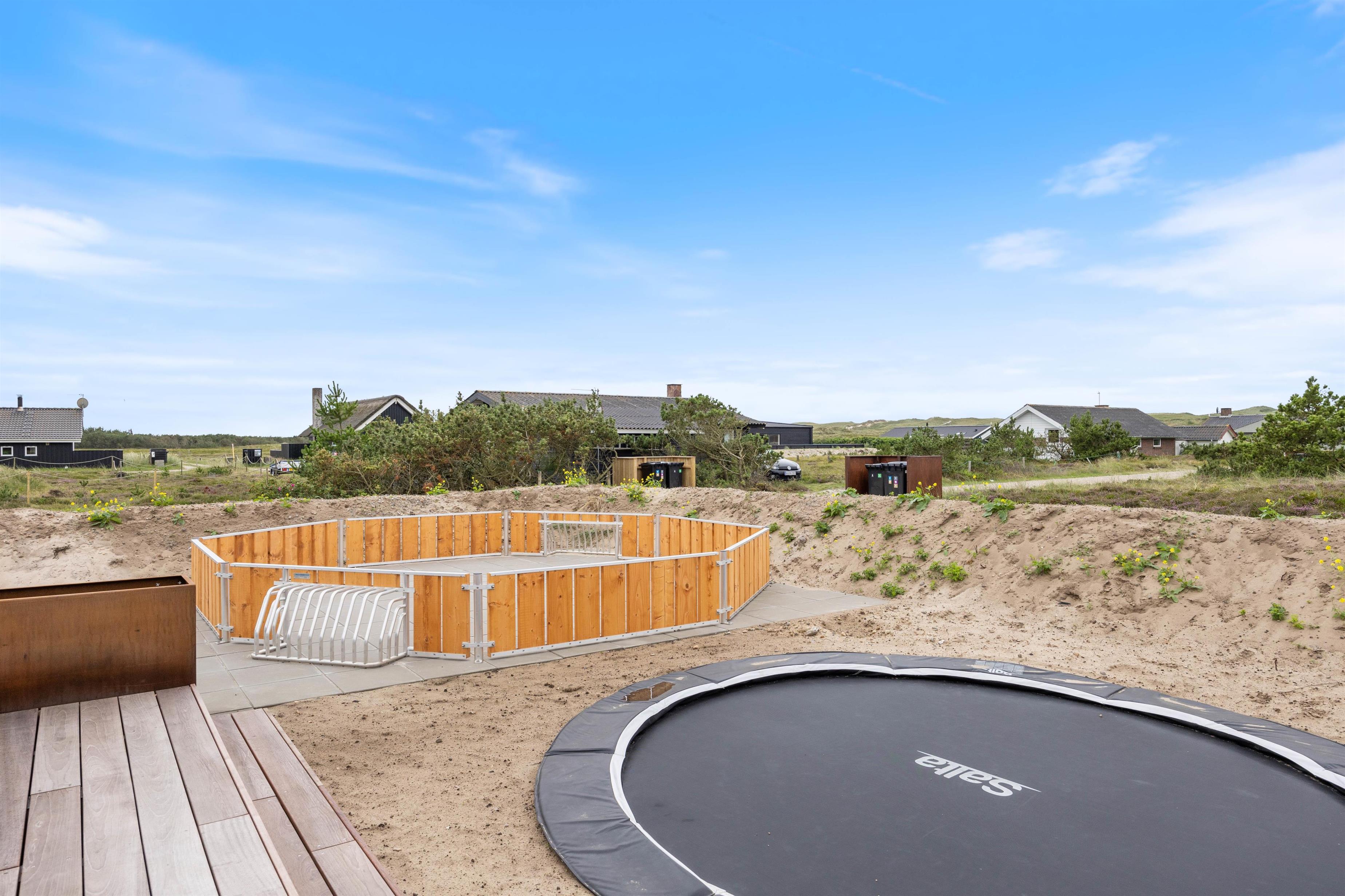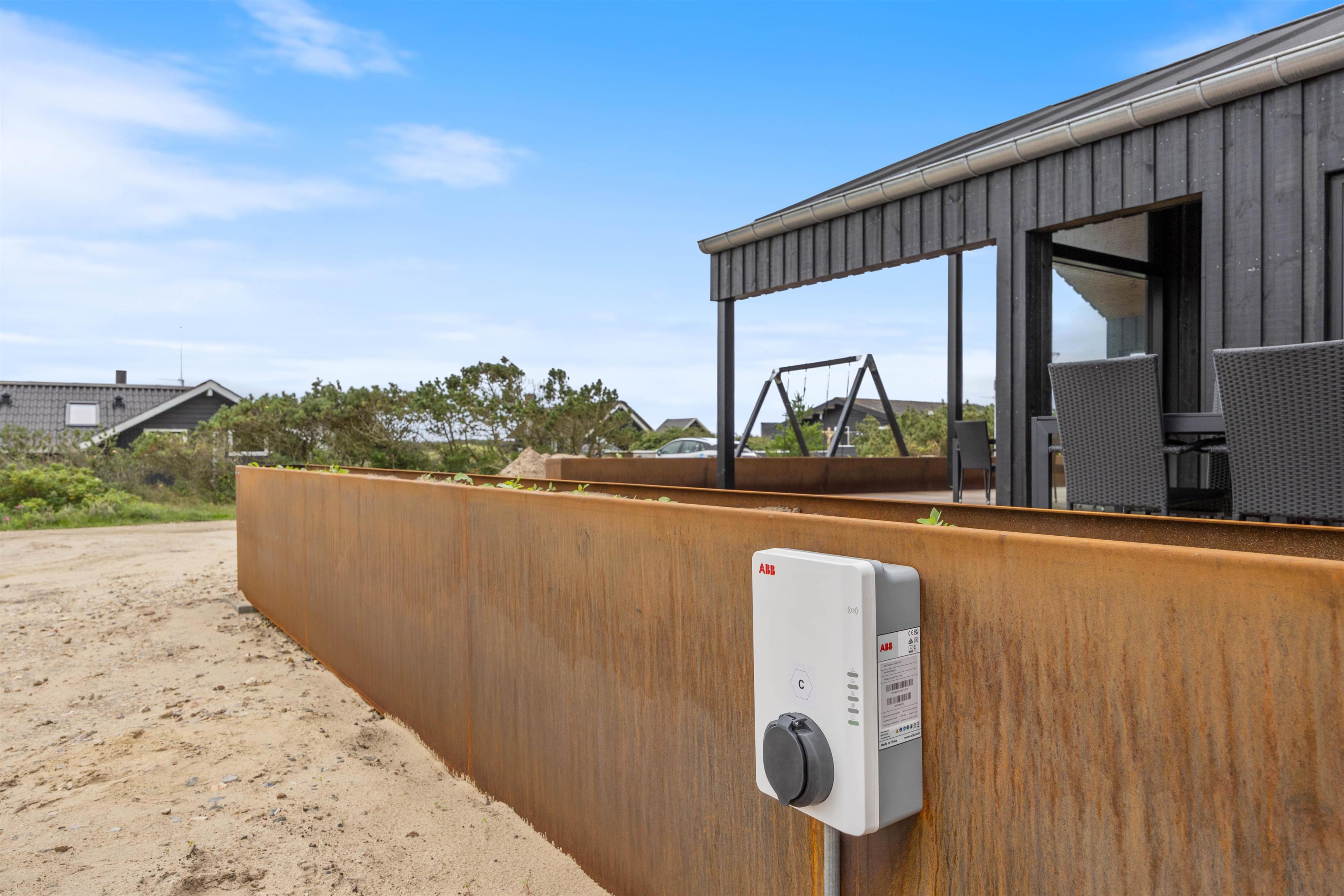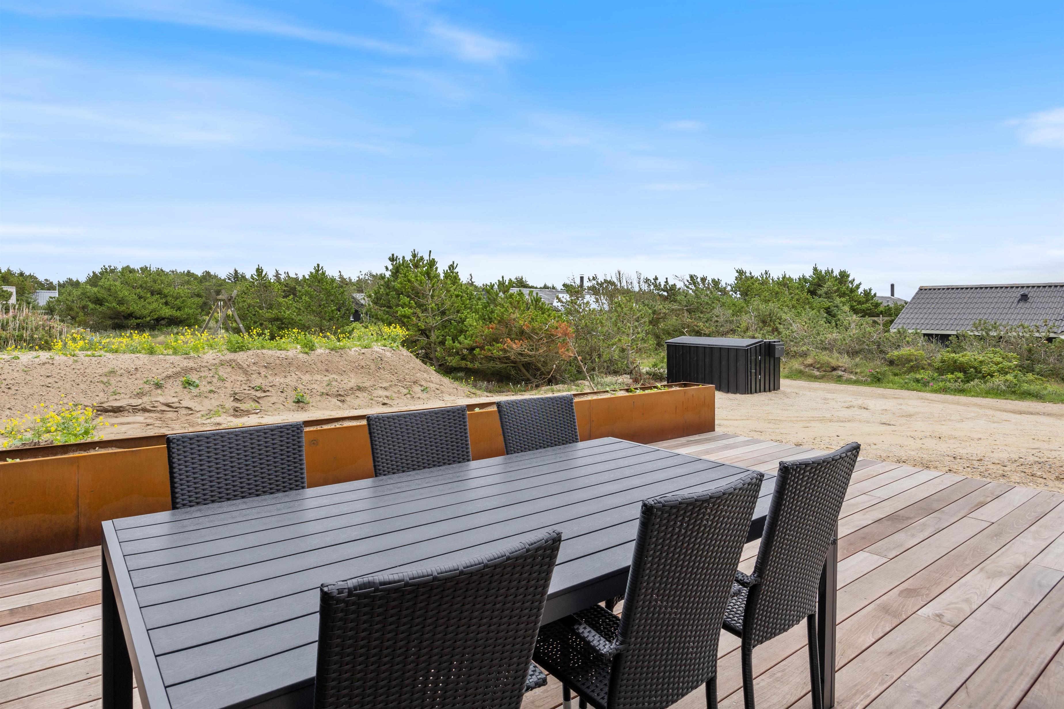 Fra sommerhuset har I flere udgange til den store terrasse, der er afskærmet og delvist overdækket. Her kan I slappe af på en lun sommerdag, mens børnene leger på naturgrunden, som både har gyngestativ, trampolin og panna bane.