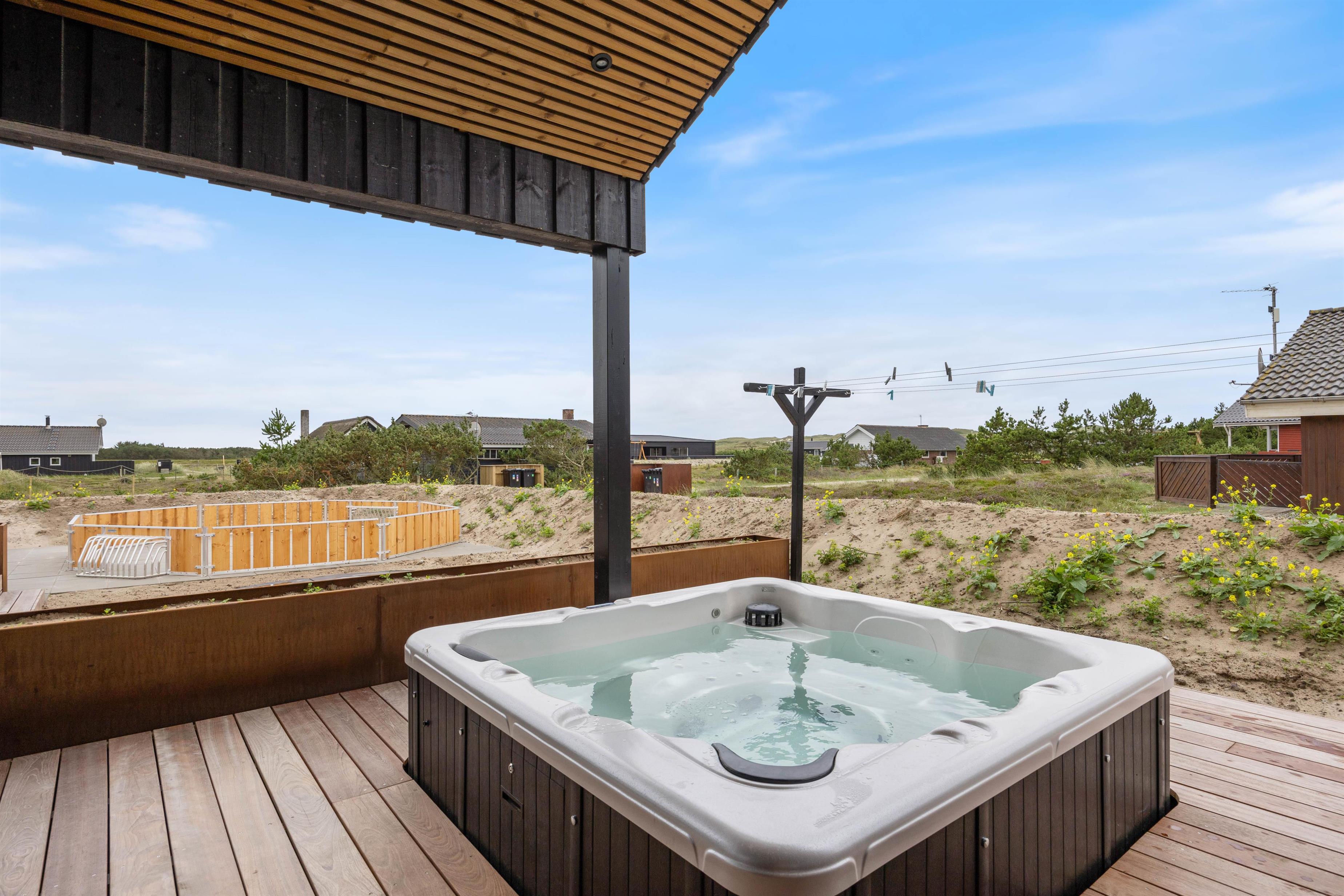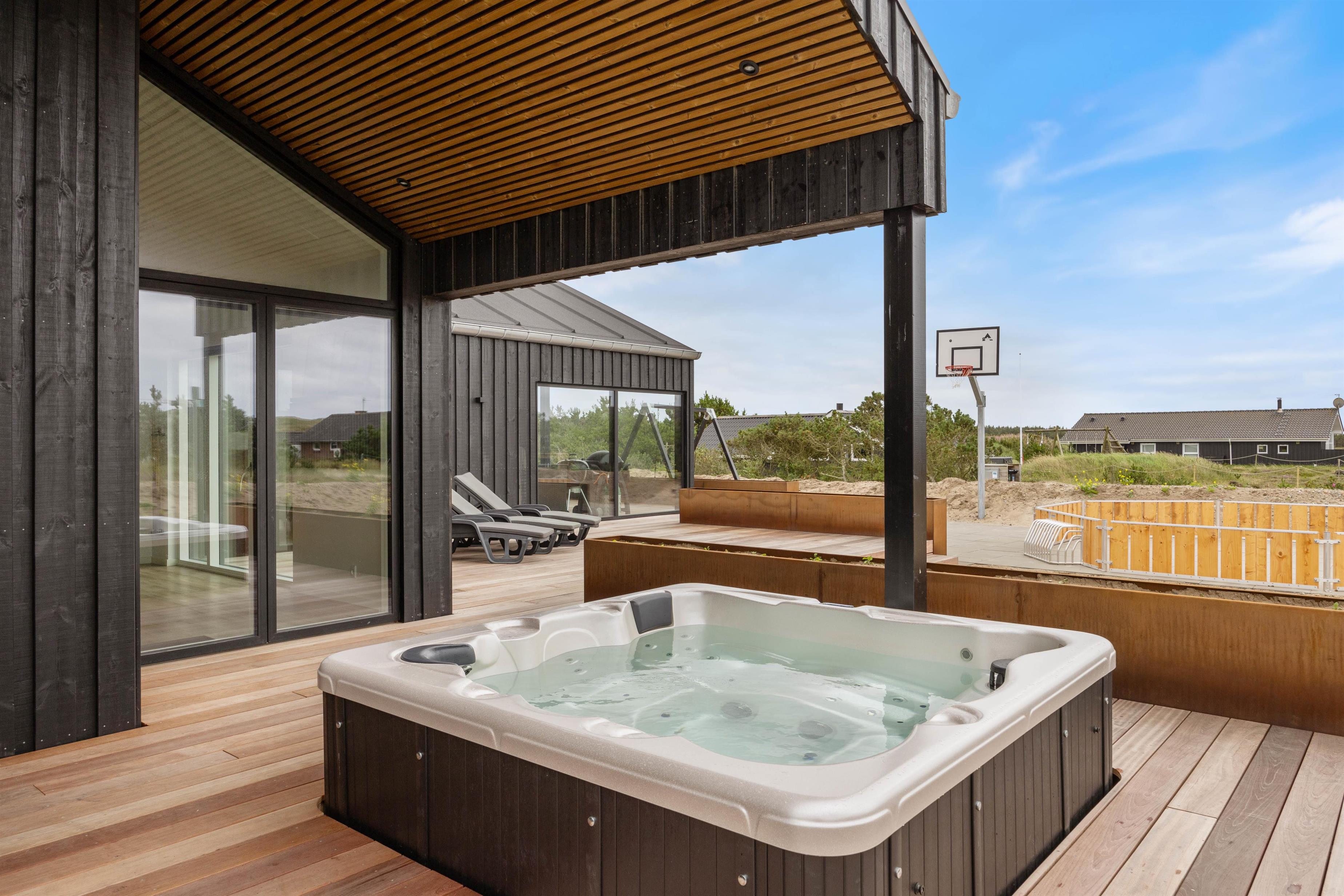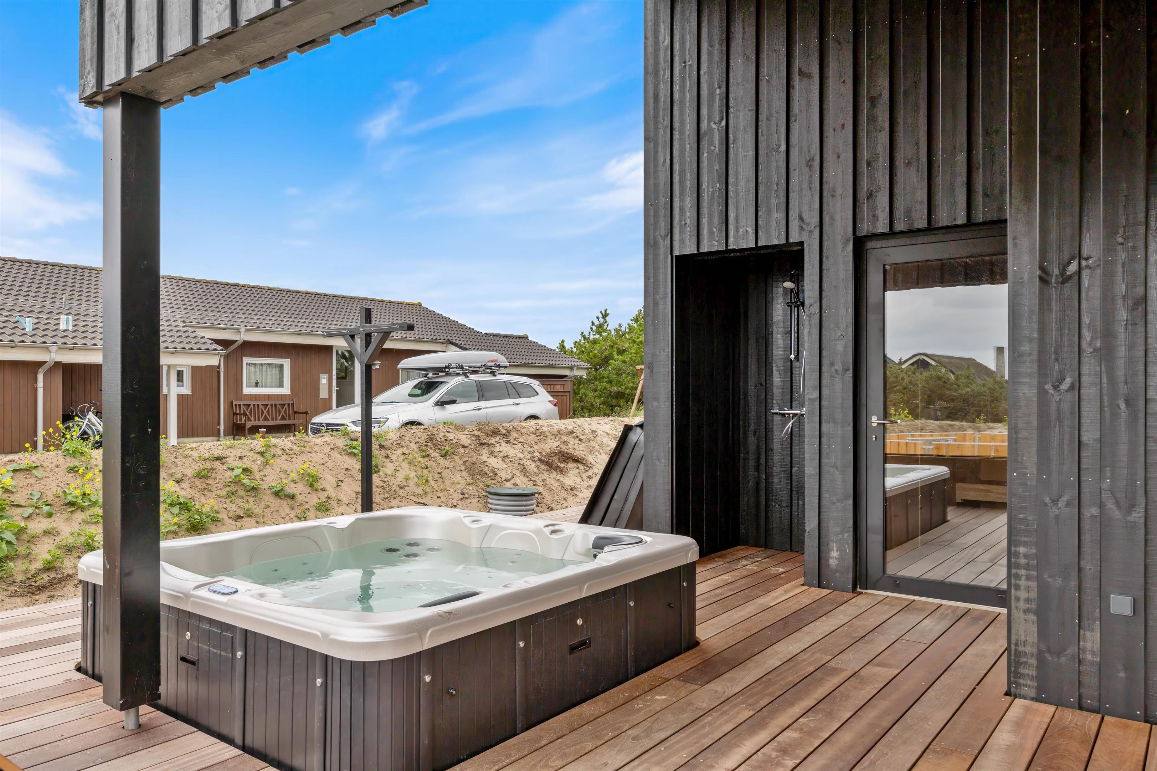 På terrassen har I en lækker udespa samt indgang til sommerhusets sauna, som er helt perfekt til afslapning og velvære efter en god gåtur i det naturskønne område. Udespaen og saunaen giver jer mulighed for at nyde udeområdet året rundt, da varmen i spaen og saunaen føles ekstra godt på en kold vinterdag.