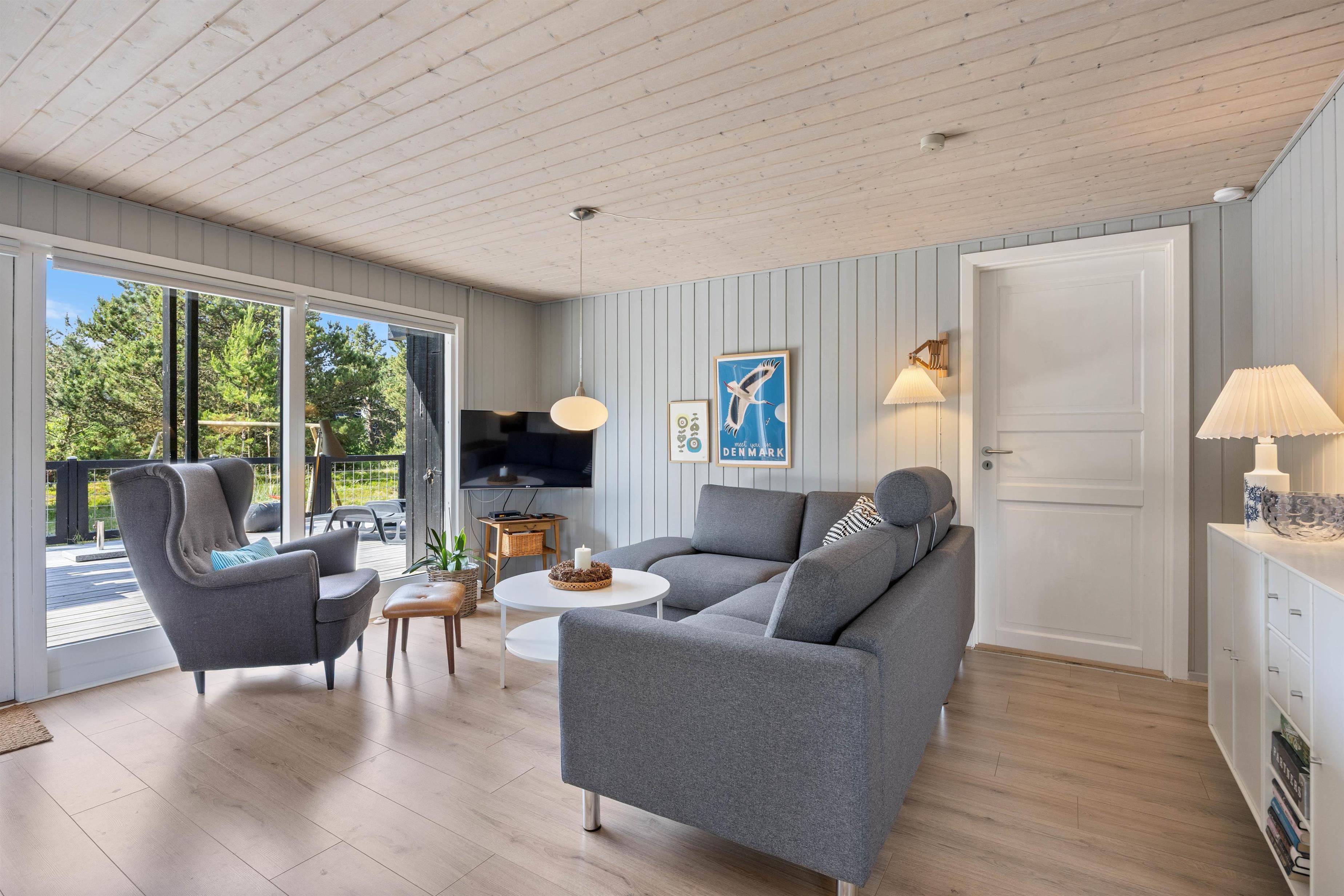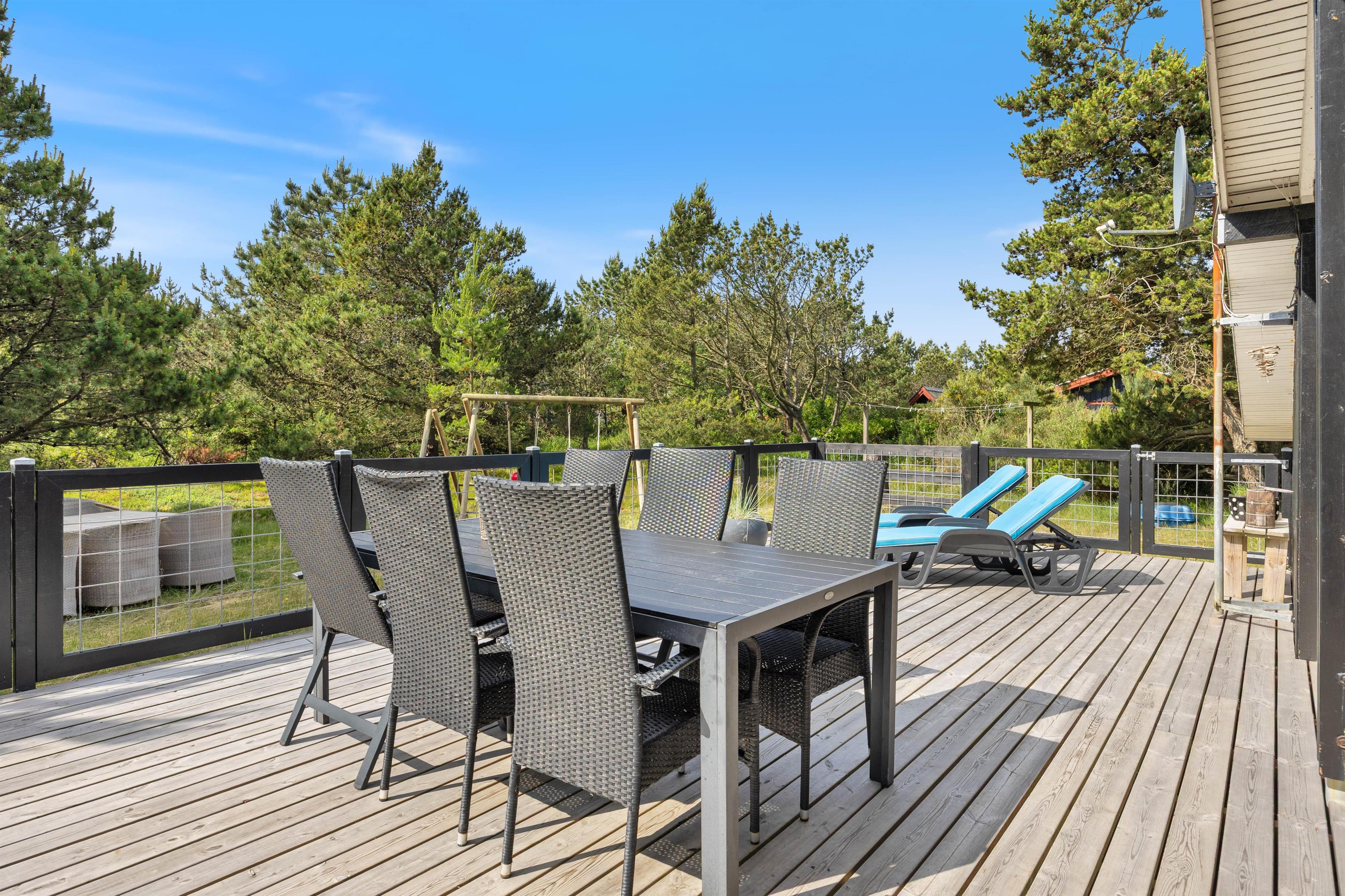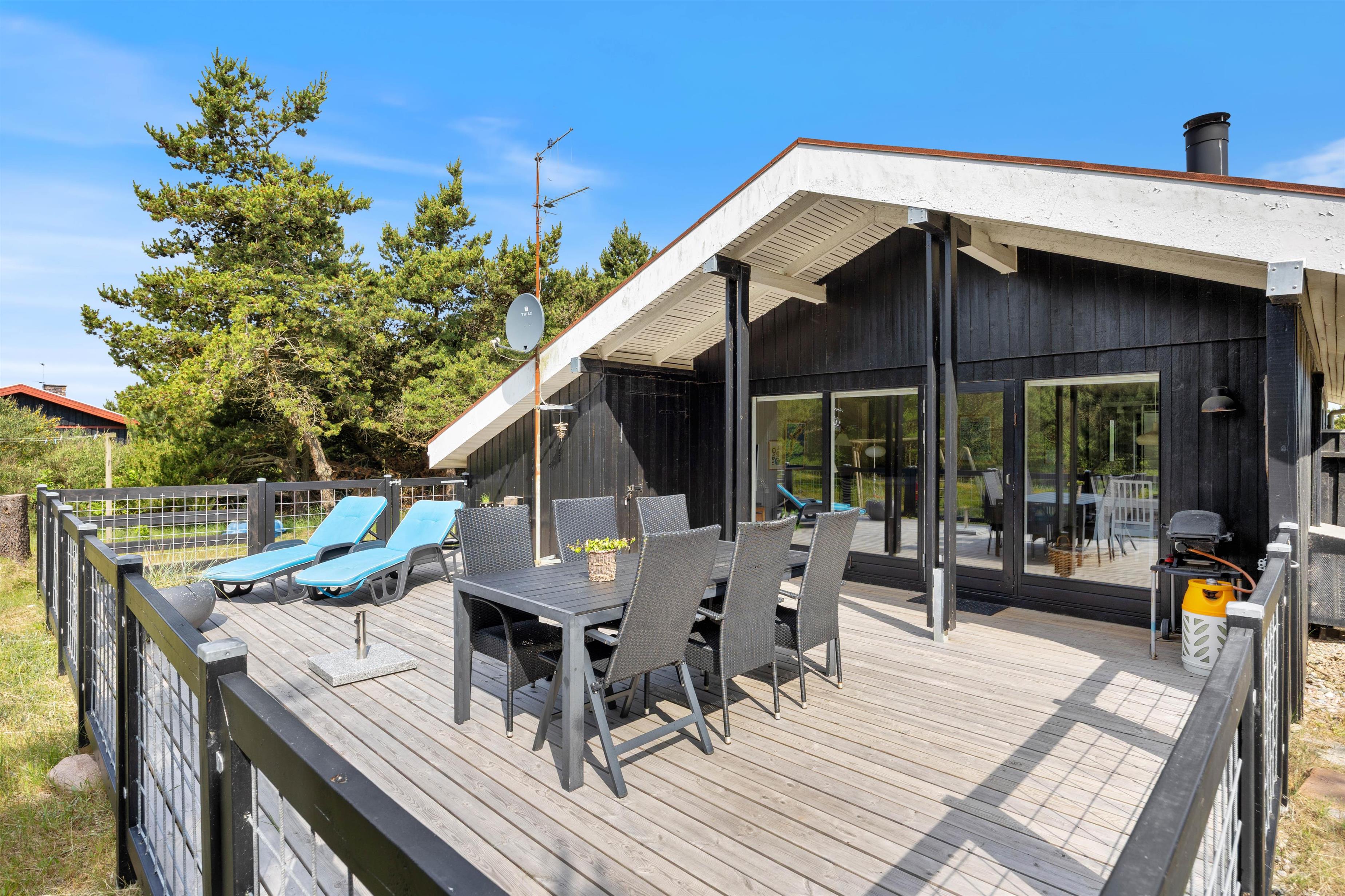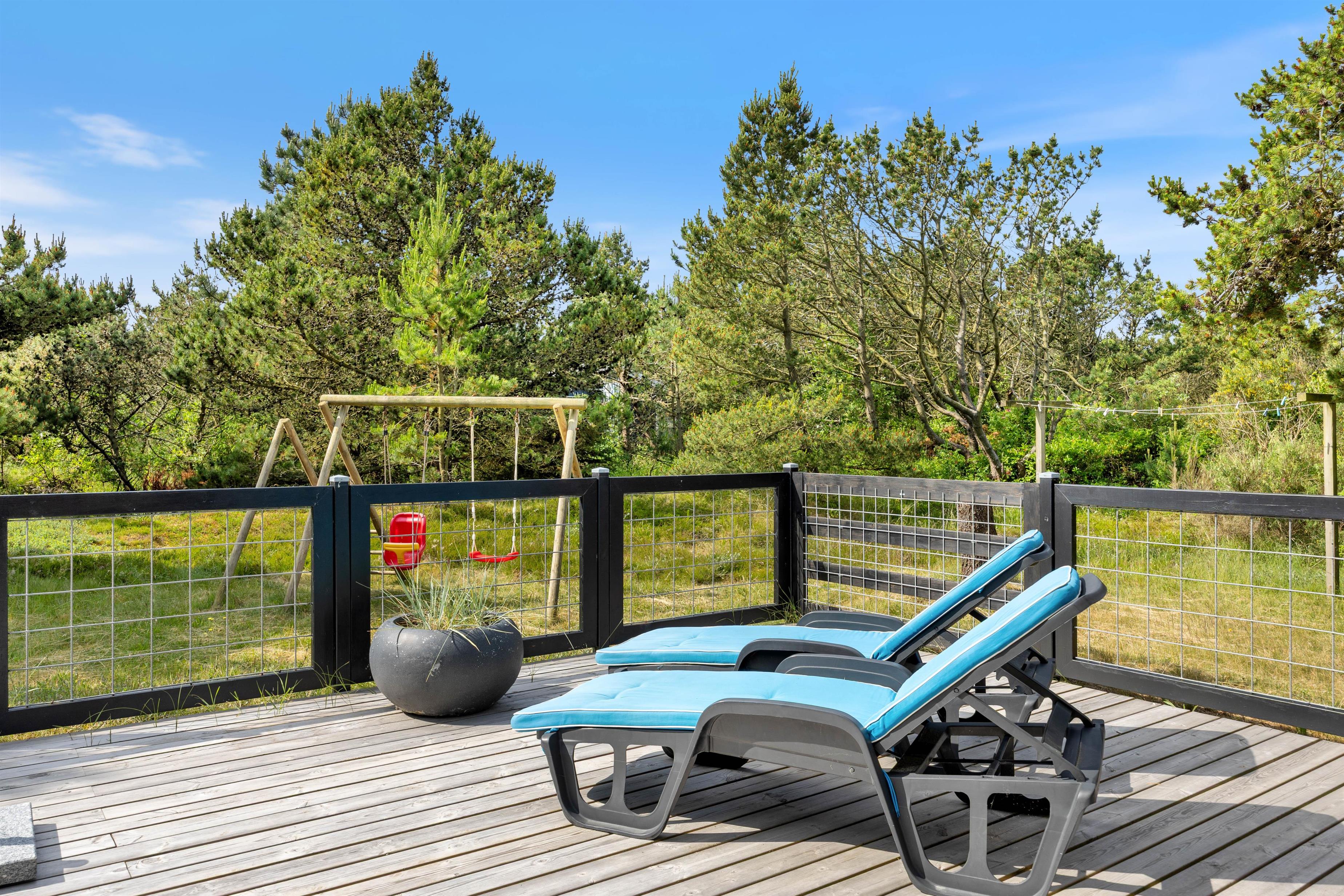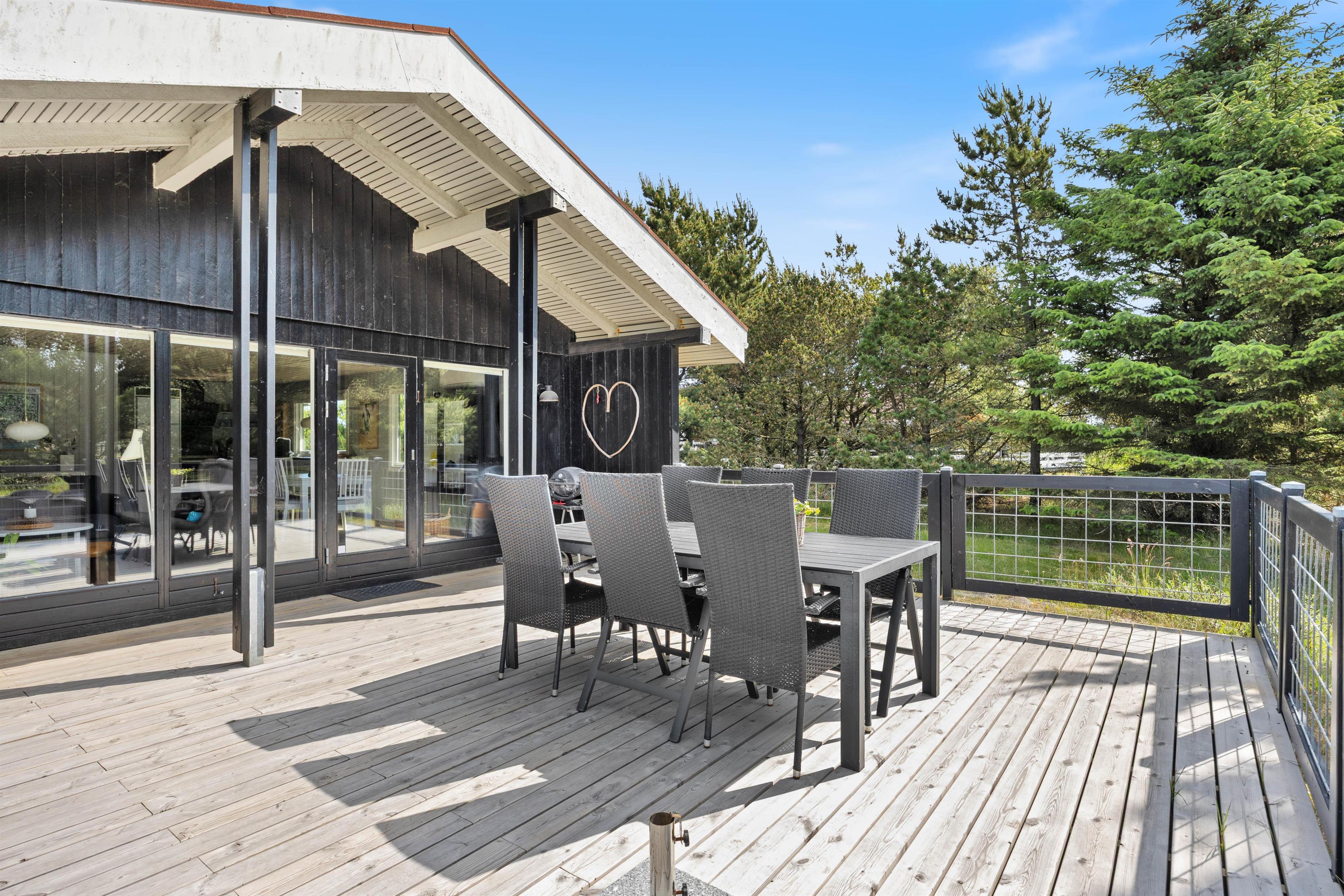 Med direkte adgang fra den hyggelige stue i sommerhuset kommer I ud på den lukkede træterrasse. Mens de yngste gæster leger i sandkassen på terrassen, kan forældrene nyde en god kop kaffe i de komfortable havemøbler. På varme sommerdage kan I slappe af på sommerhusets liggestole med en spændende bog i hånden.