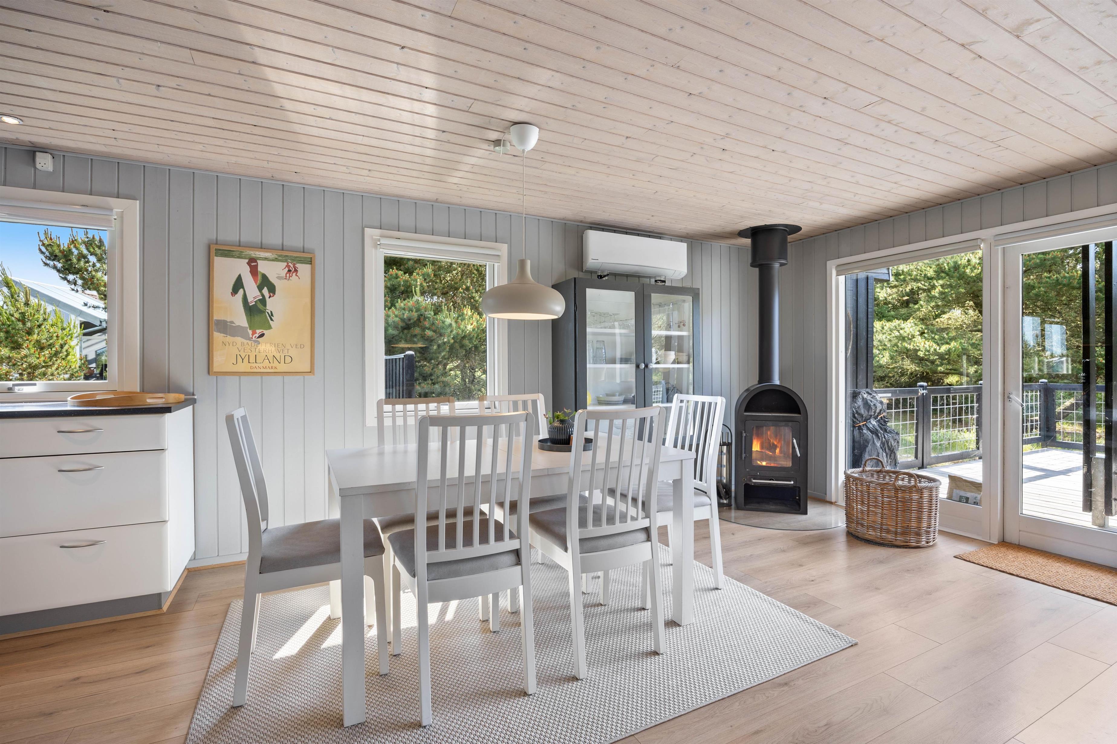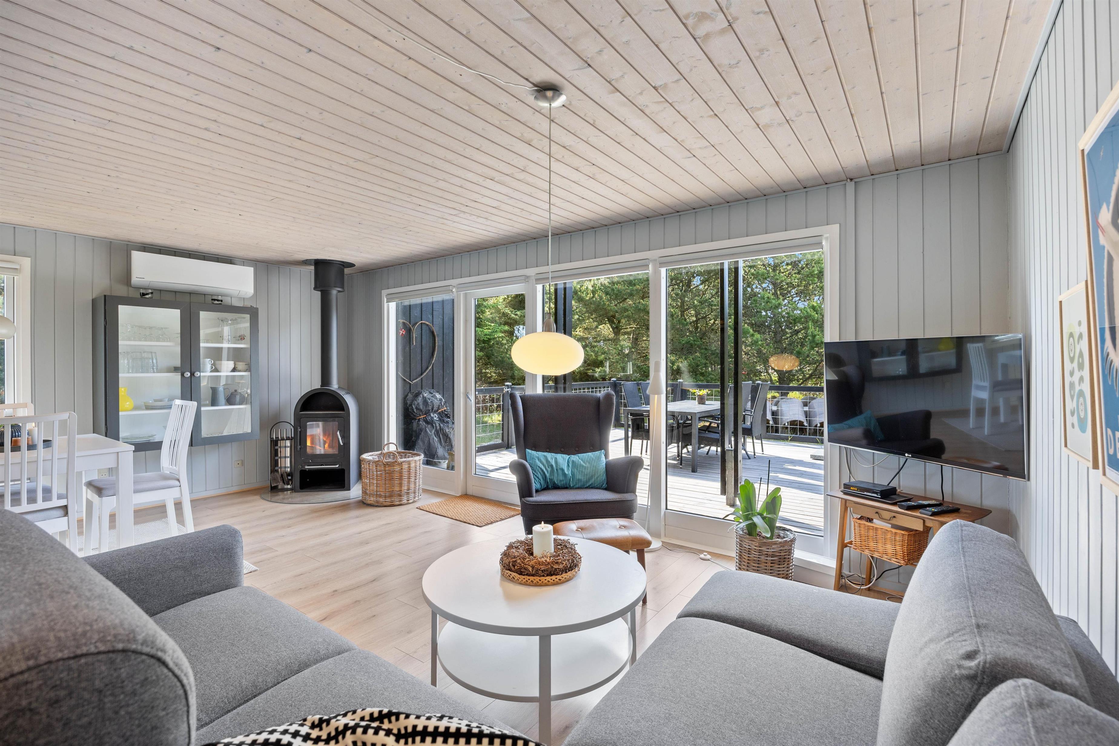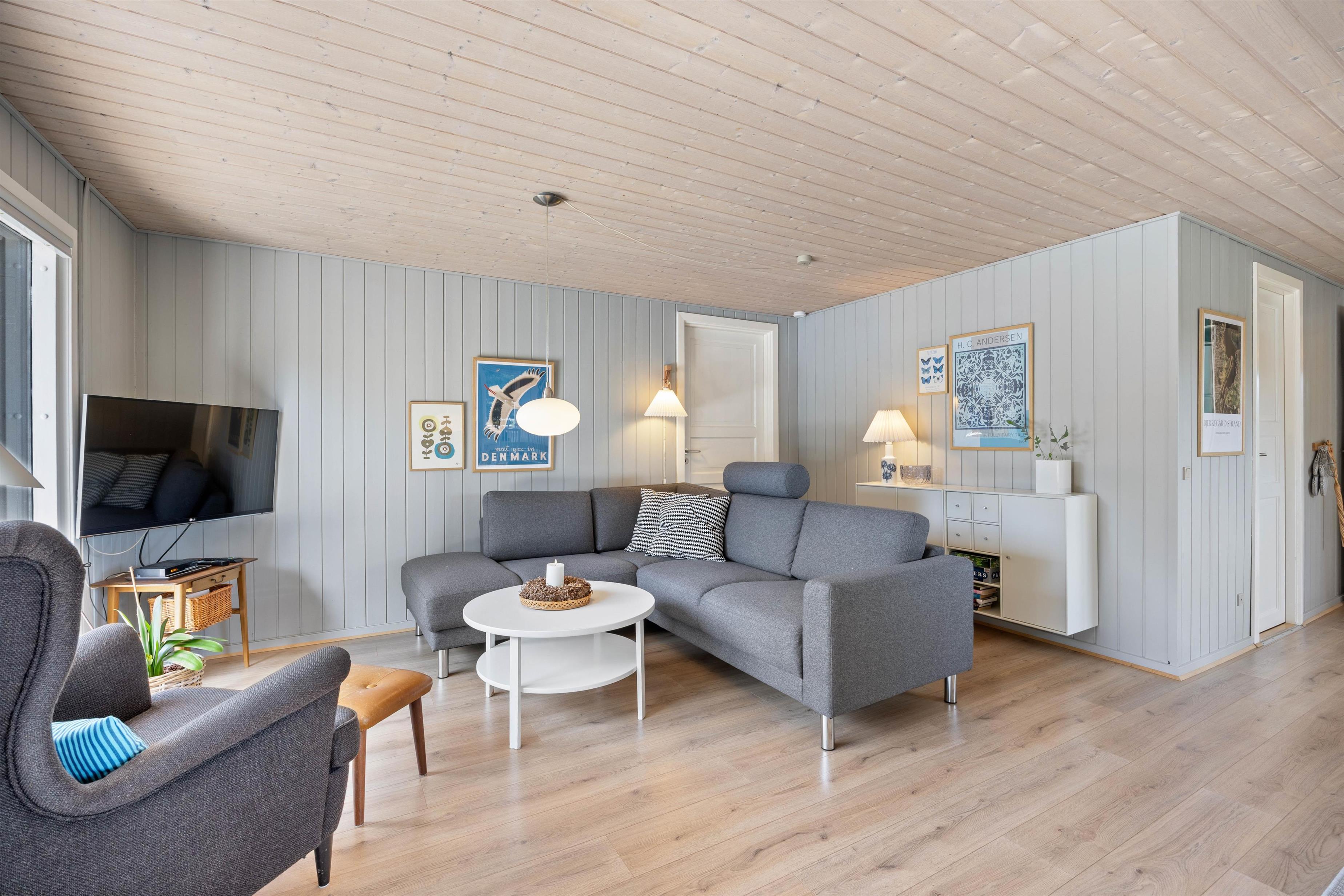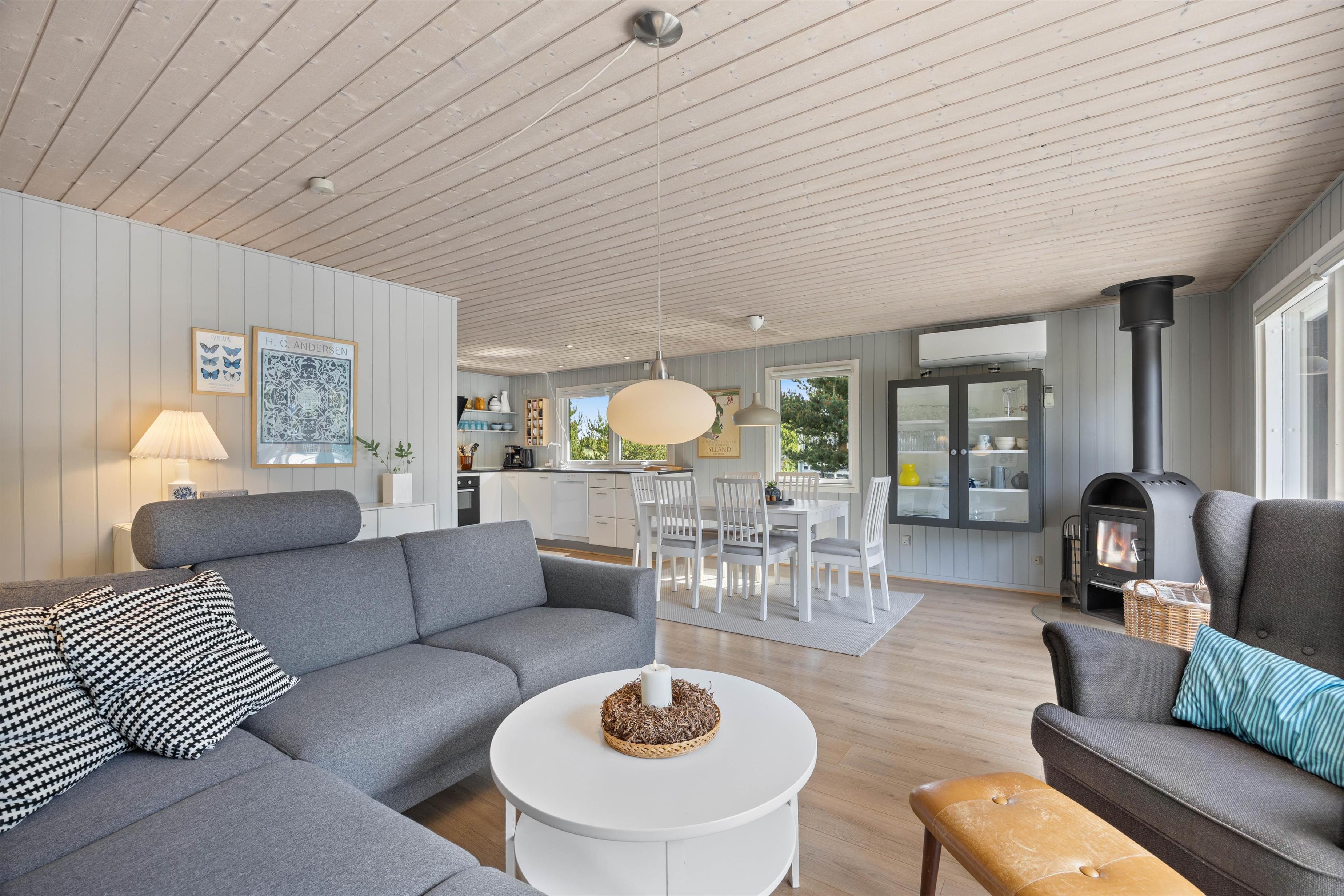 I det hyggelige sommerhus finder I et velmøbleret alrum, som består af køkken, stue og spiseplads i ét. I det komfortable sofahjørne kan I nyde en afslappende aften, mens I varmer jer ved brændeovnen. Her er også en varmepumpe, som I med fordel kan benytte jer af. Det store, sydvendte vinduesparti skaber et godt lysindfald i rummet, så det fremstår lyst og indbydende.