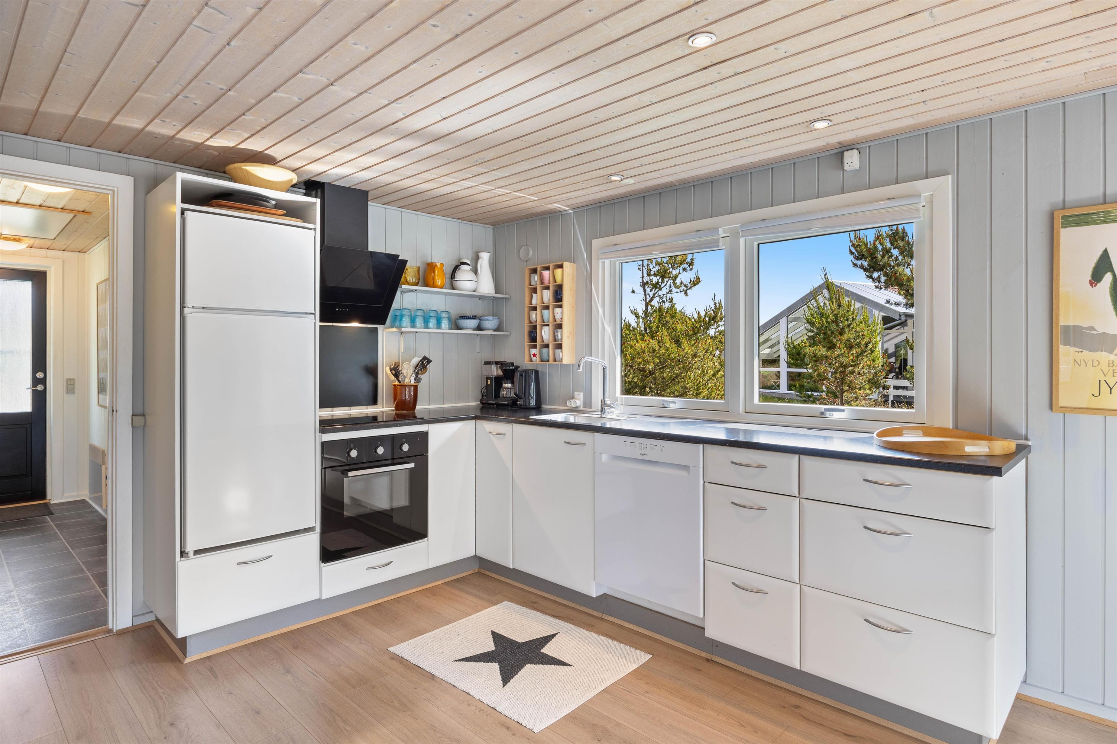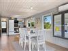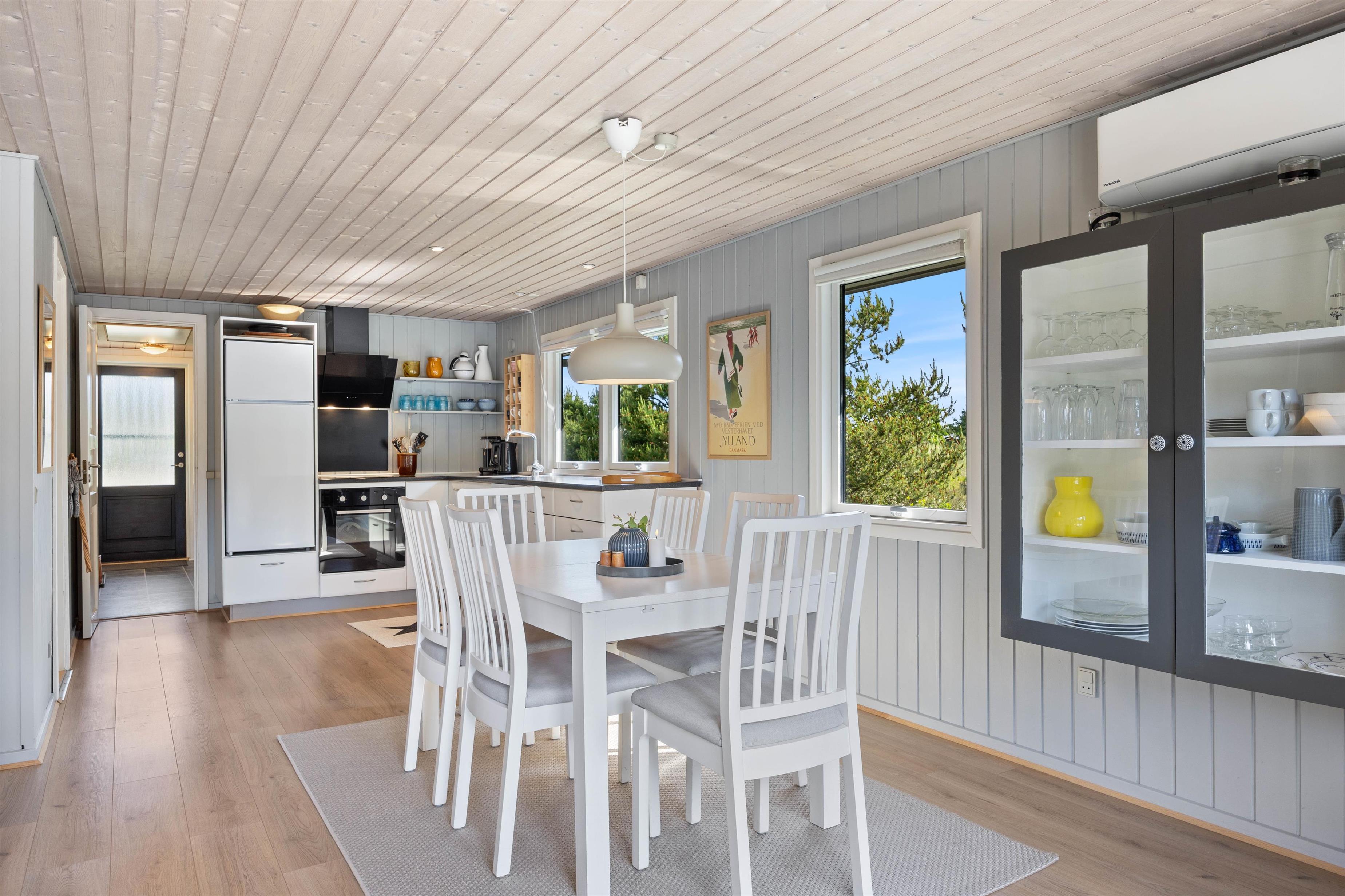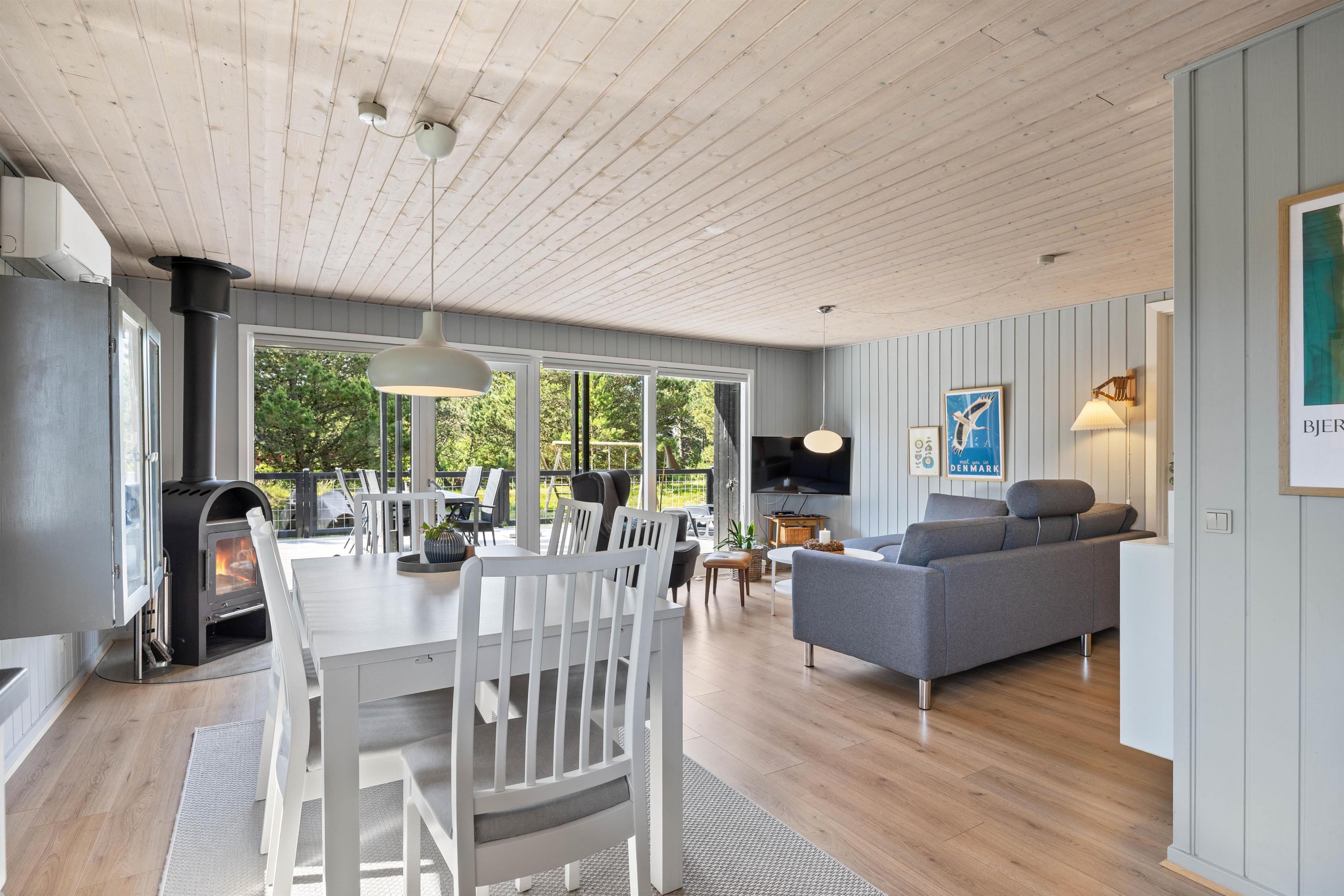 I det hyggelige sommerhus finder I et velmøbleret alrum, som består af køkken, stue og spiseplads i ét. I det komfortable sofahjørne kan I nyde en afslappende aften, mens I varmer jer ved brændeovnen. Her er også en varmepumpe, som I med fordel kan benytte jer af. Det store, sydvendte vinduesparti skaber et godt lysindfald i rummet, så det fremstår lyst og indbydende.