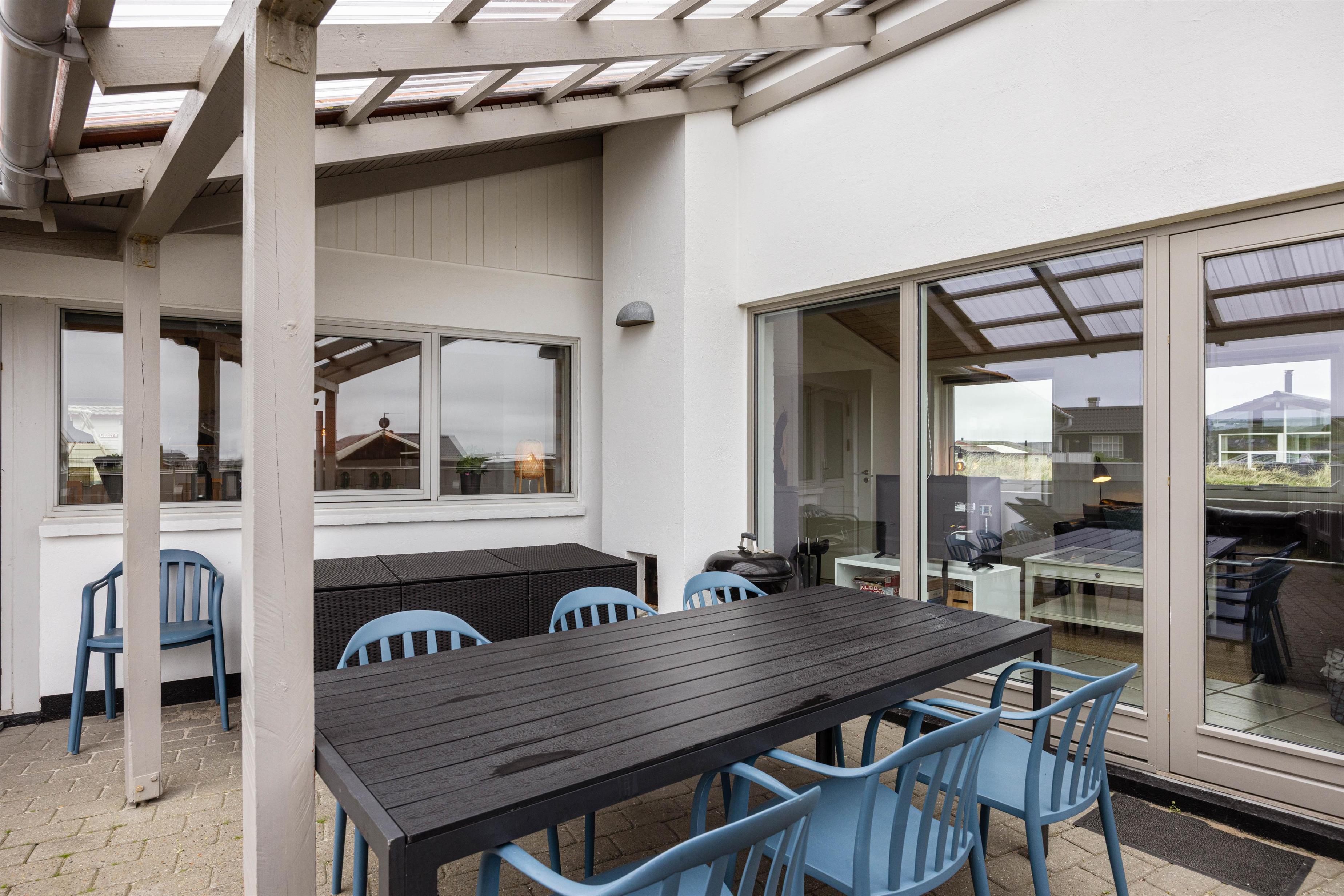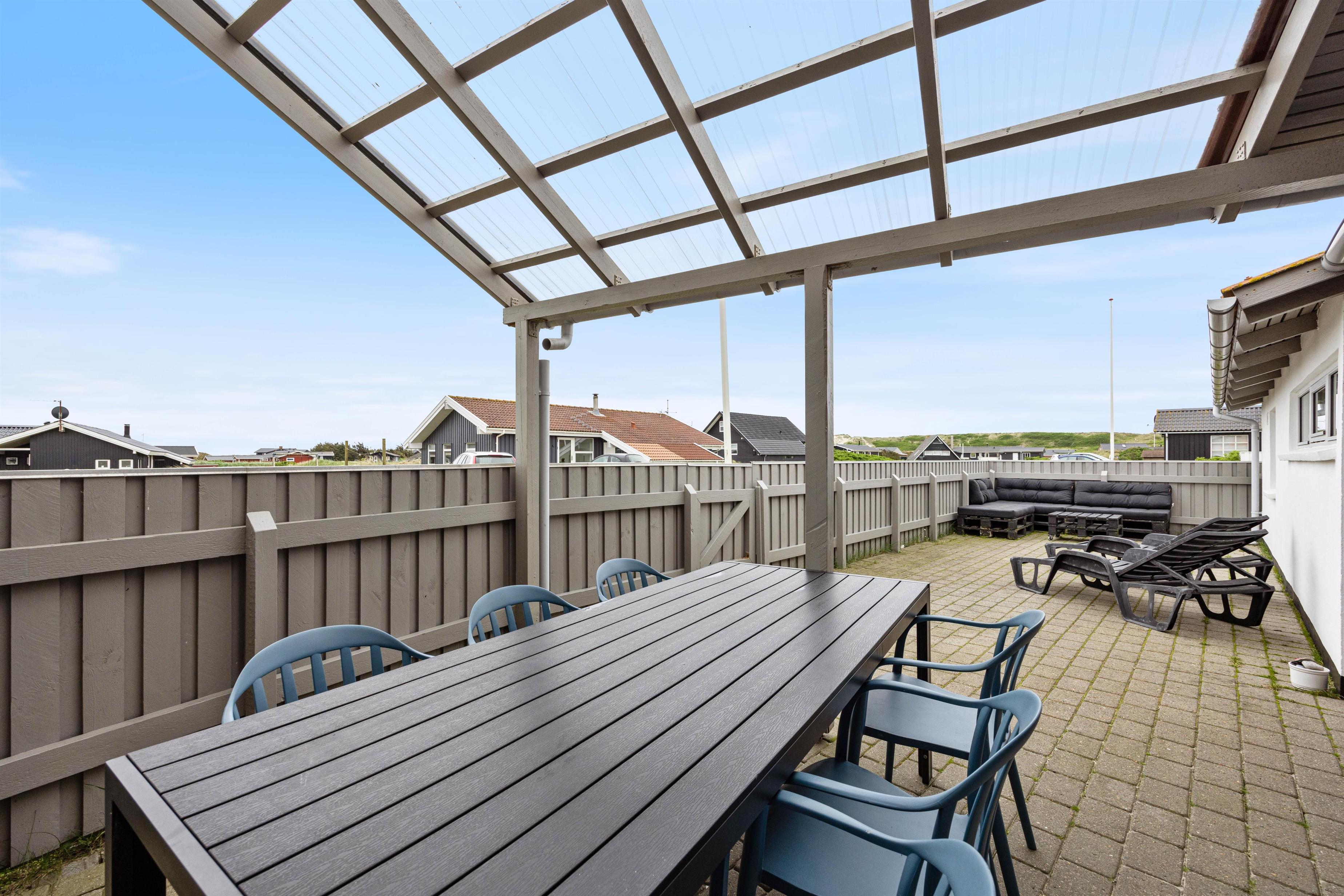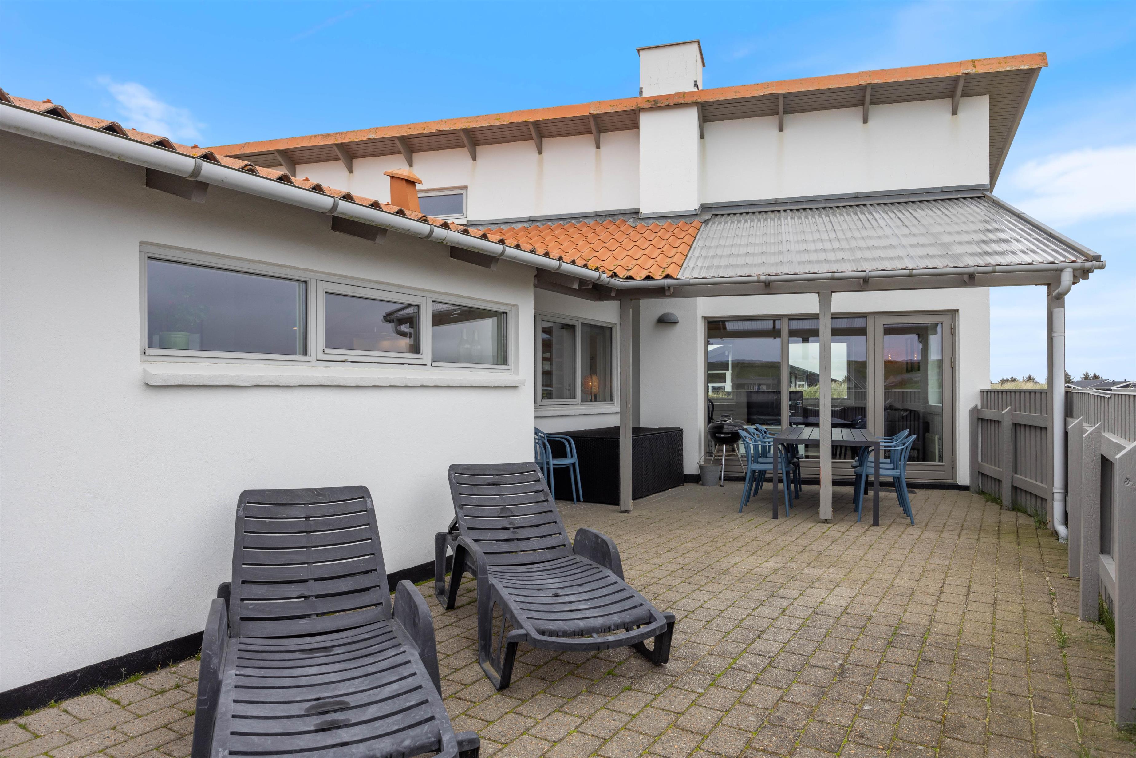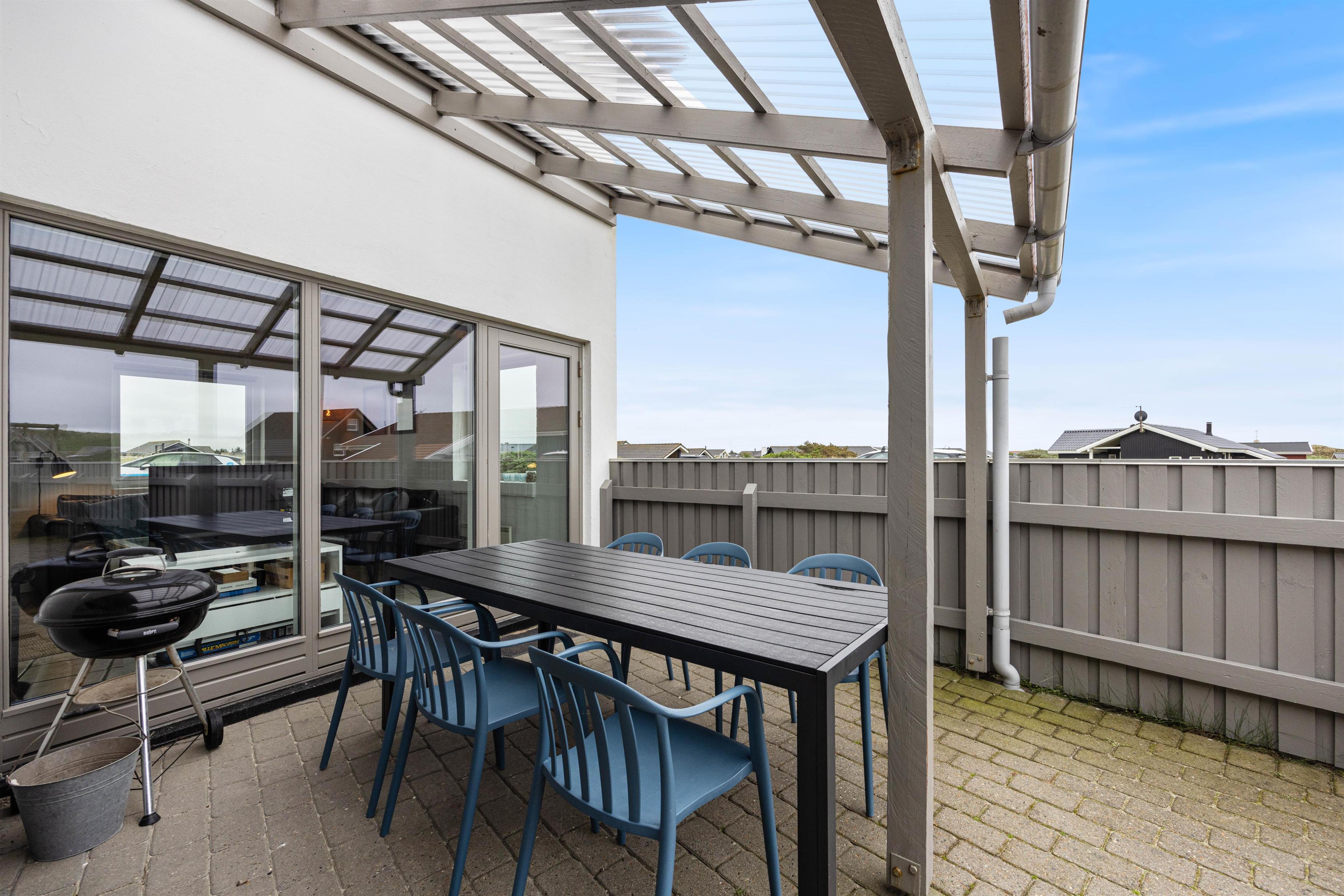 Fra stuen har I adgang til terrassen, som er lukket og delvist overdækket. Det er her I skal nyde tilværelsen på de varme dage – havemøblerne står klar! Her kan hundene bevæge sig frit. En begivenhedsrig dag afsluttes selvfølgelig på terrassen med et lækkert grillmåltid! Tænd op i grillen, dæk bordet og lad grillmesteren trylle! Nyd hertil et dejligt glas vin. Som den perfekte afslutning, kan I bevæge jer mod stranden for at se den maleriske og betagende solnedgang?
