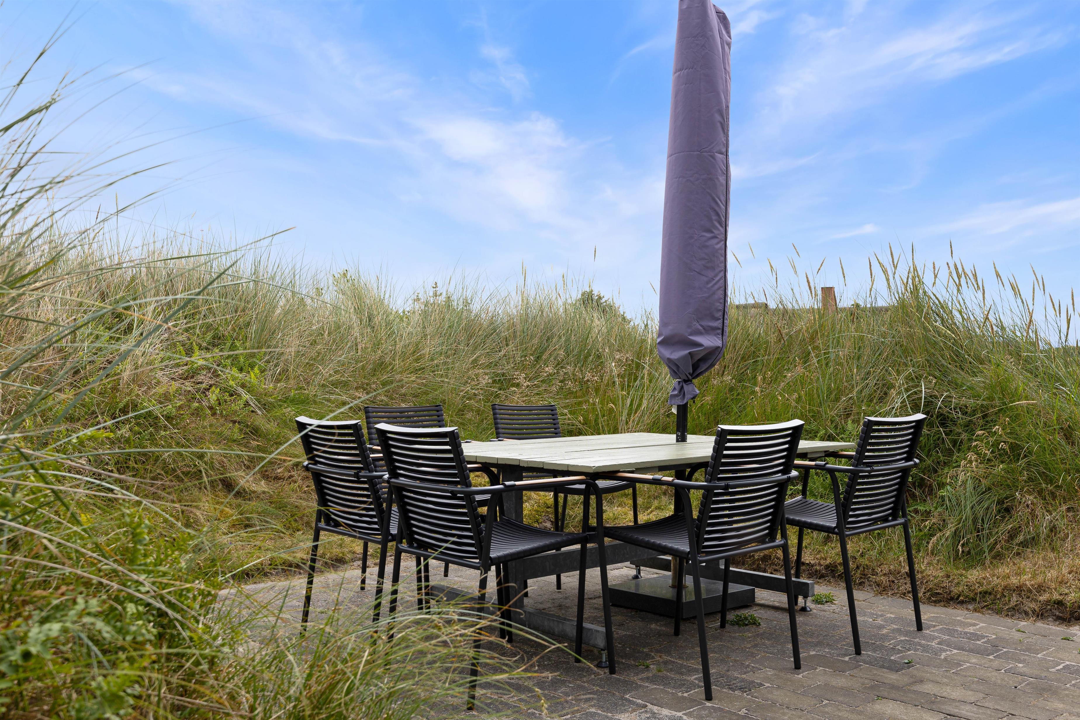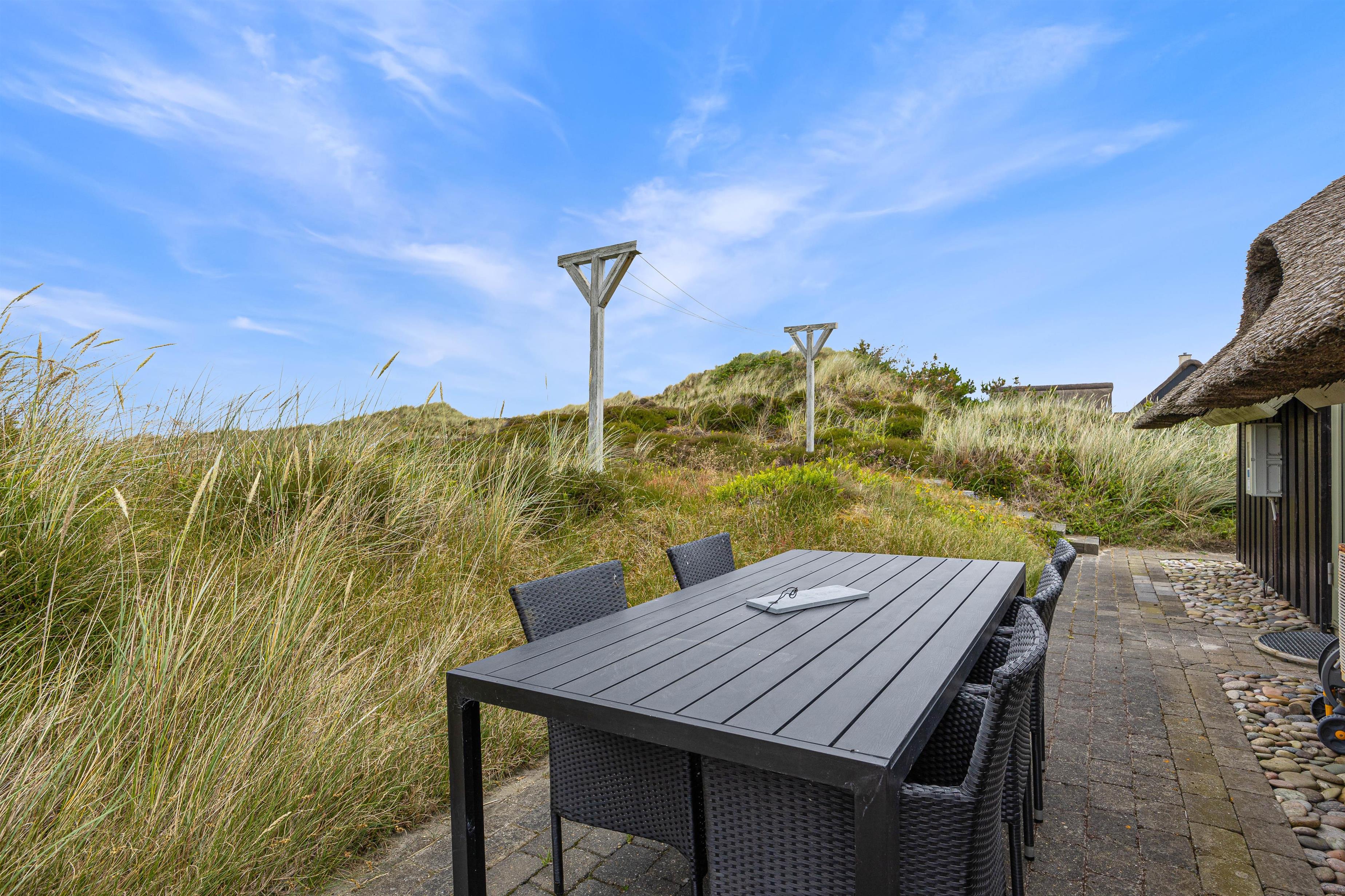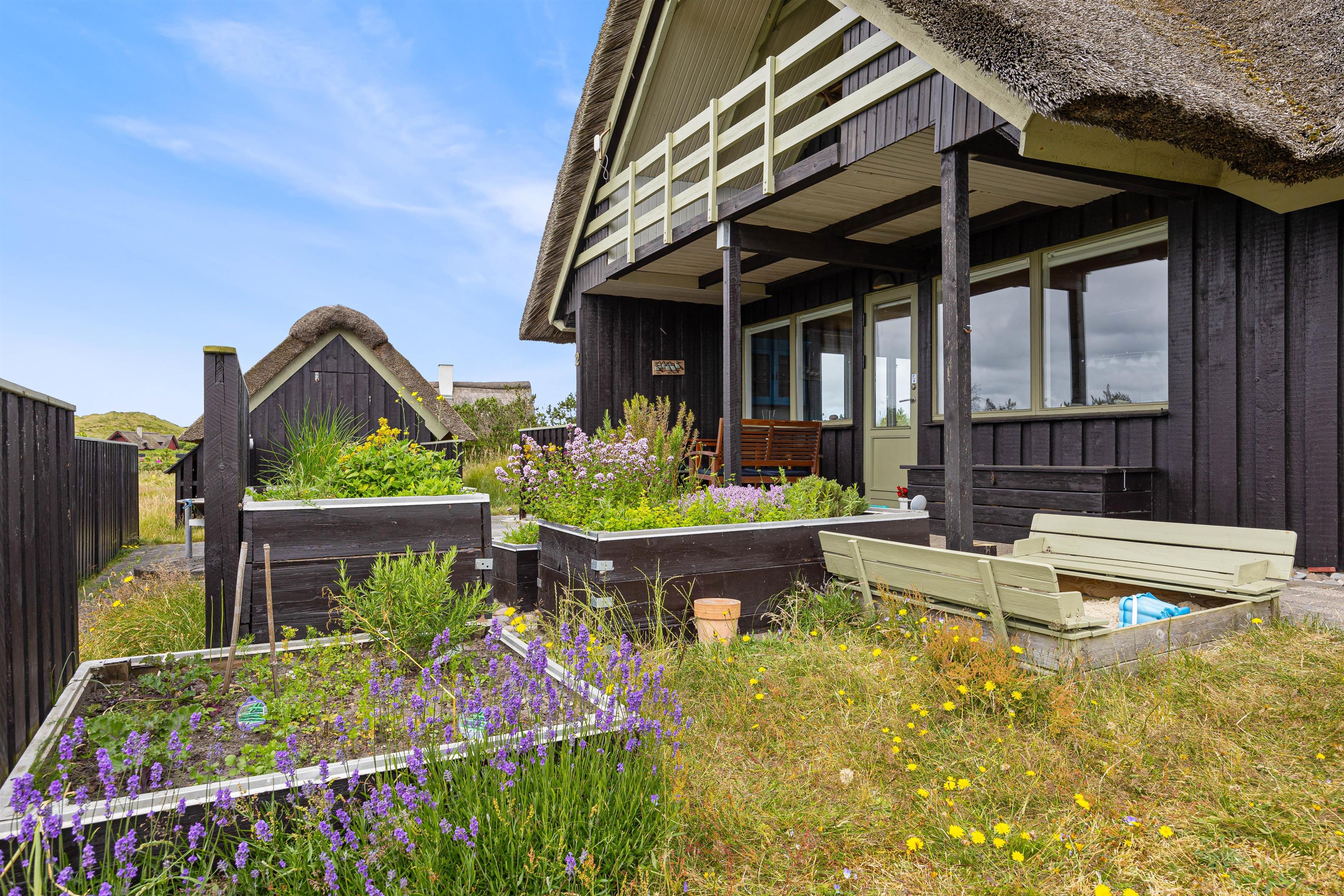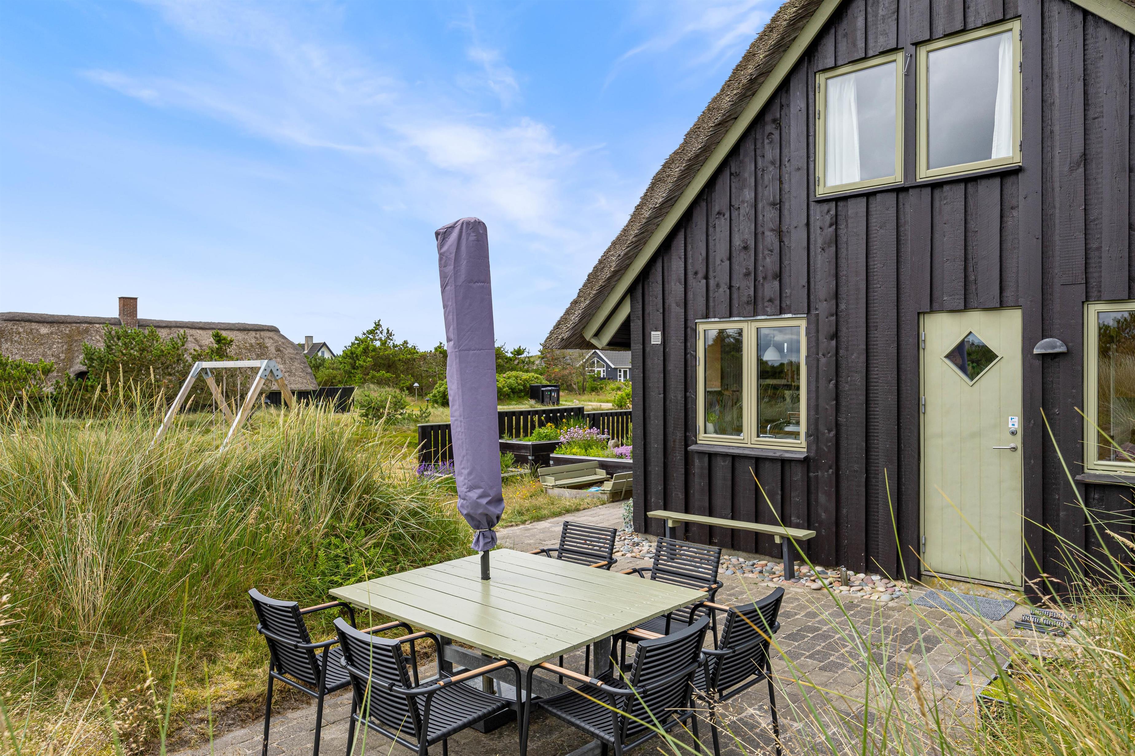 Sommerhuset har en god beliggenhed i Bjerregård tæt på Vesterhavet og direkte op til et stort fredet hedeareal på en stor kuperet naturgrund, som giver flere gode lækroge. Her er en stor, delvist afskærmet og overdækket terrasse med gode havemøbler, liggestole og grill. Solen og den smukke natur kan nydes i fred og ro.