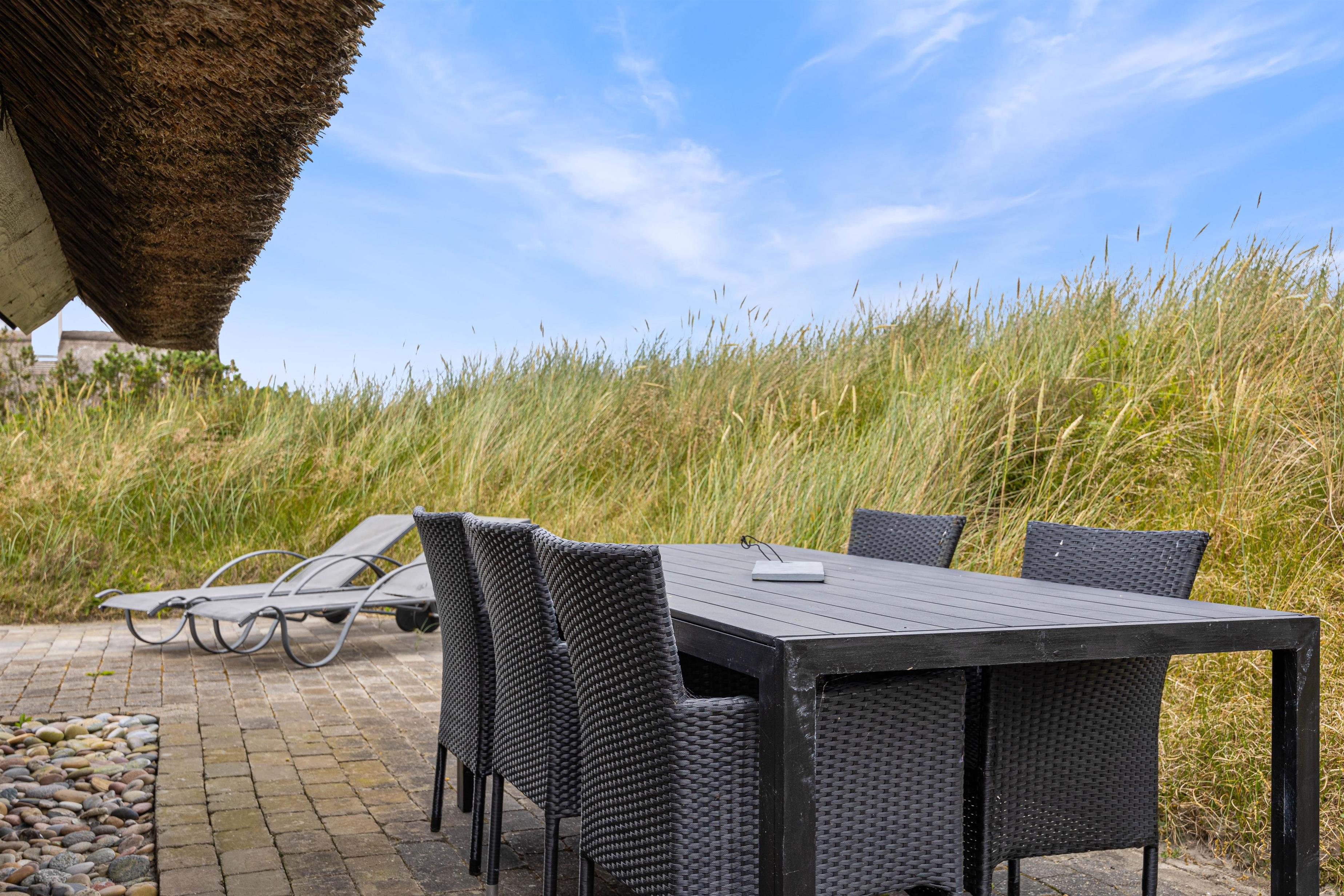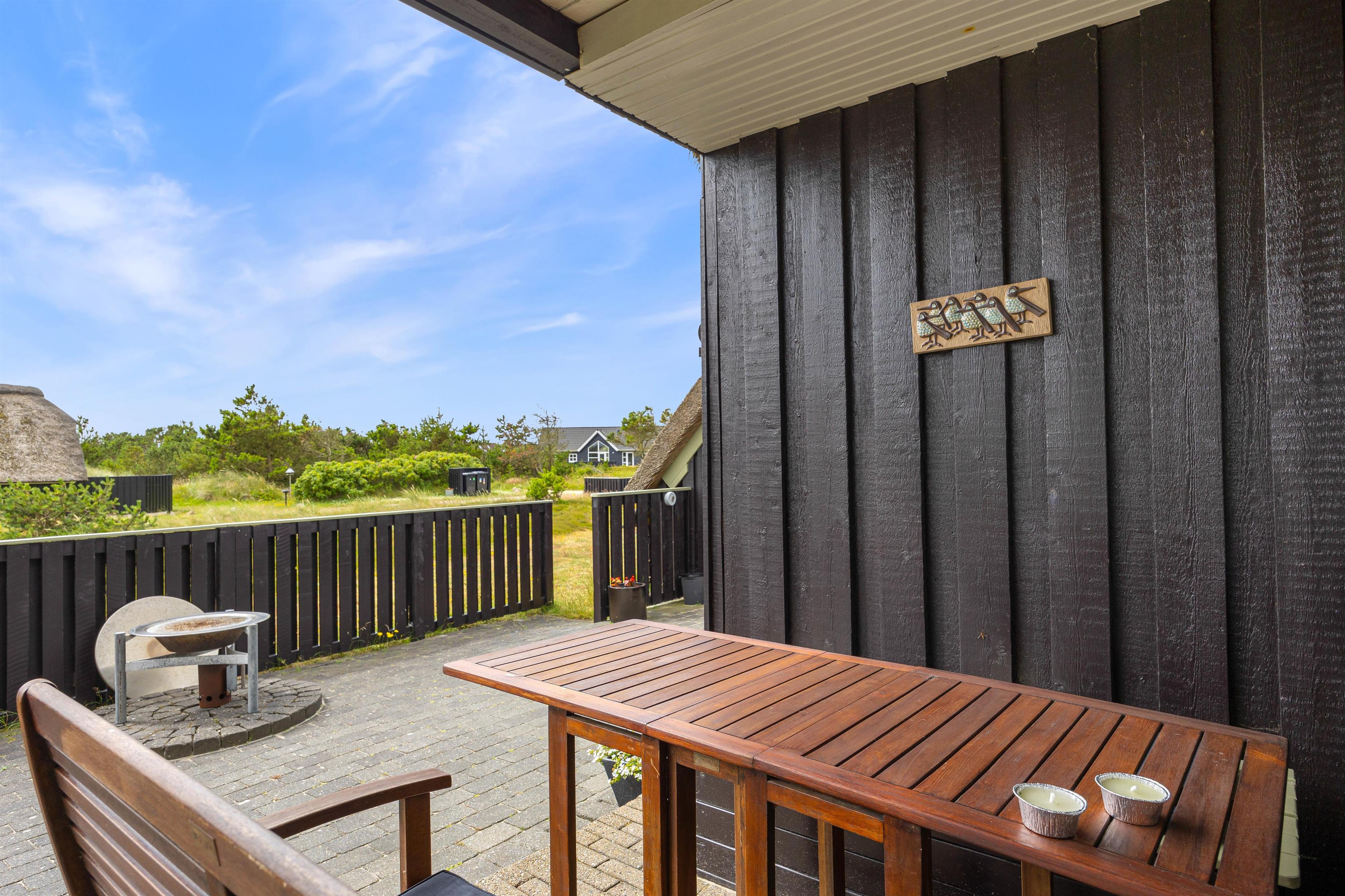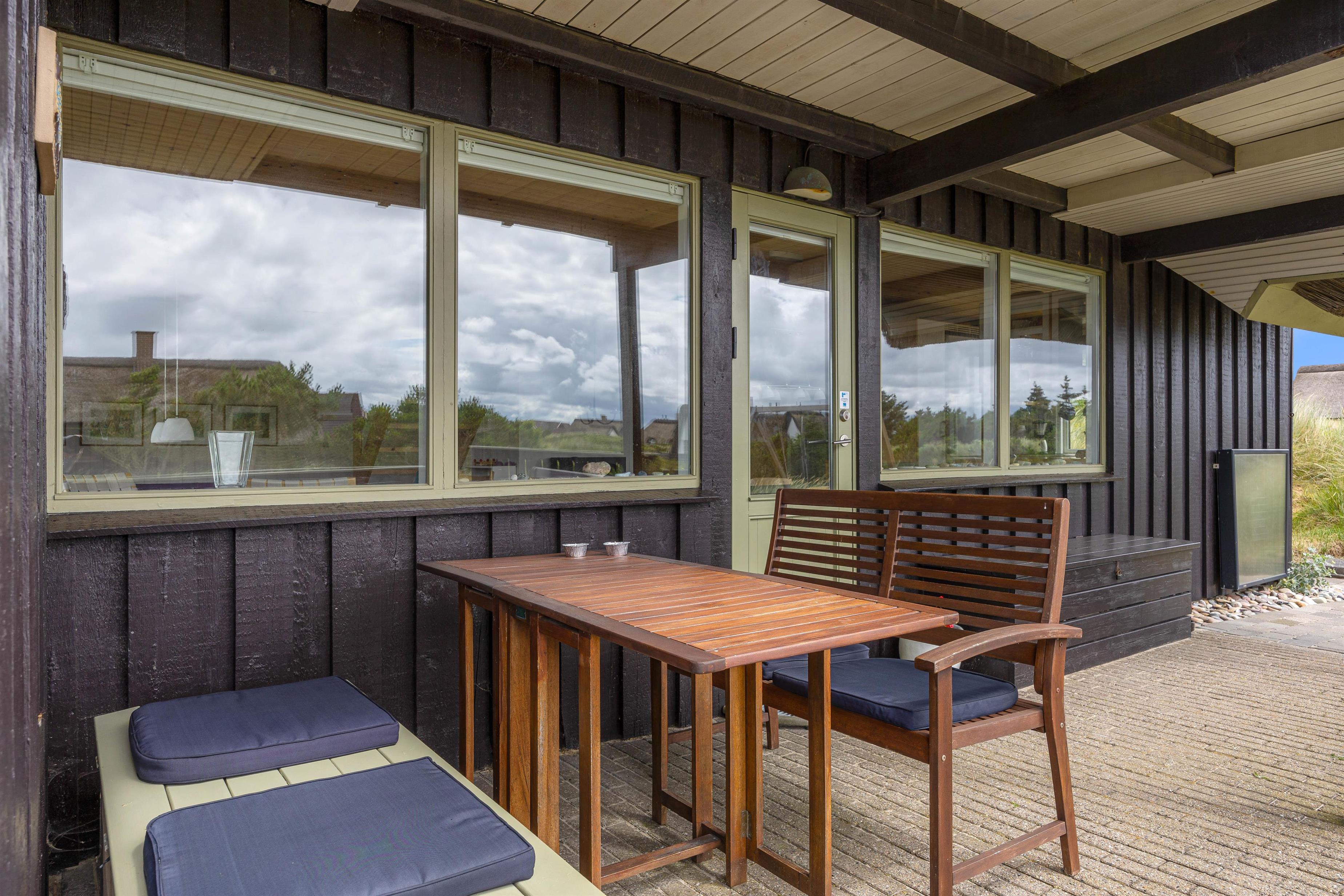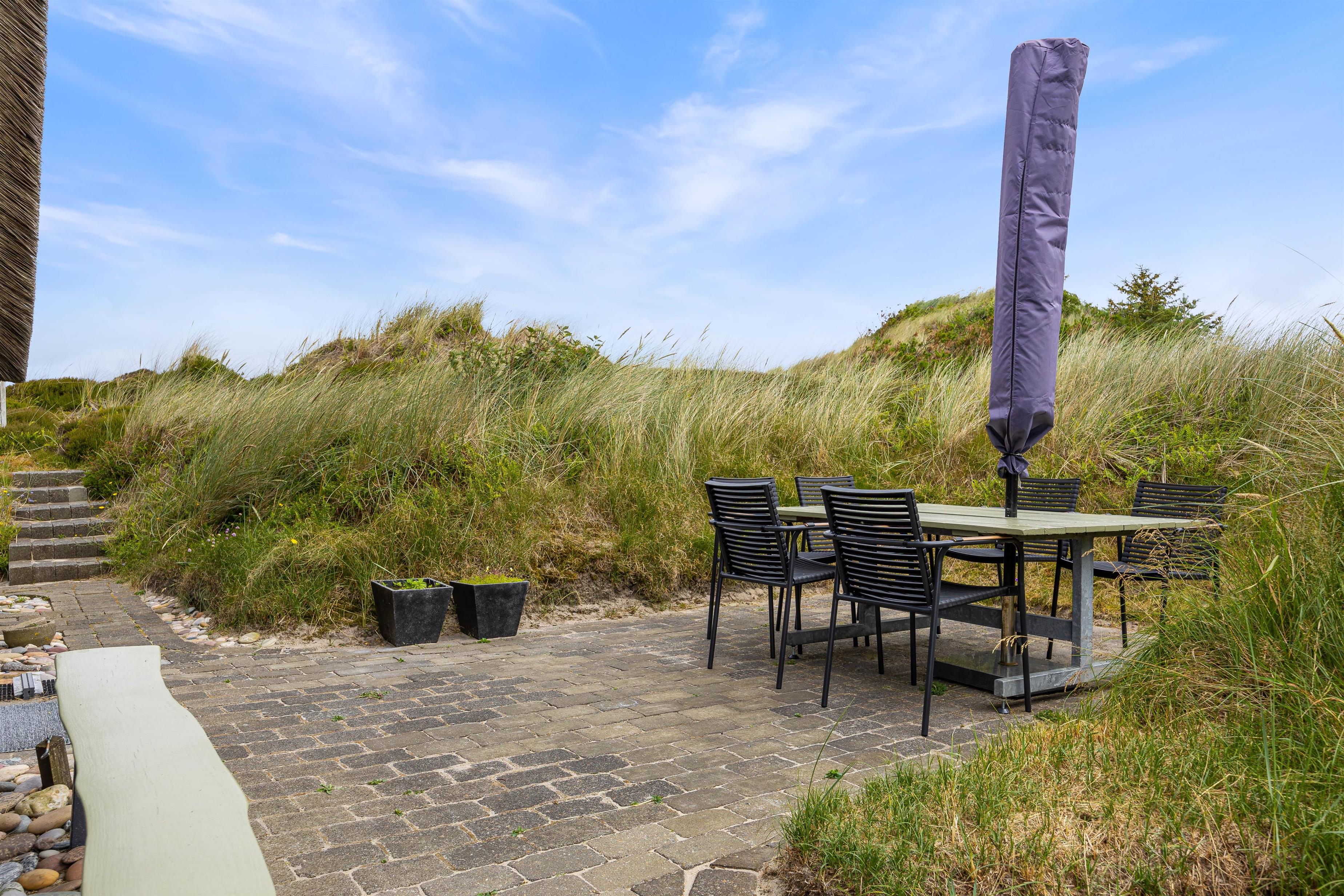 Sommerhuset har en god beliggenhed i Bjerregård tæt på Vesterhavet og direkte op til et stort fredet hedeareal på en stor kuperet naturgrund, som giver flere gode lækroge. Her er en stor, delvist afskærmet og overdækket terrasse med gode havemøbler, liggestole og grill. Solen og den smukke natur kan nydes i fred og ro.