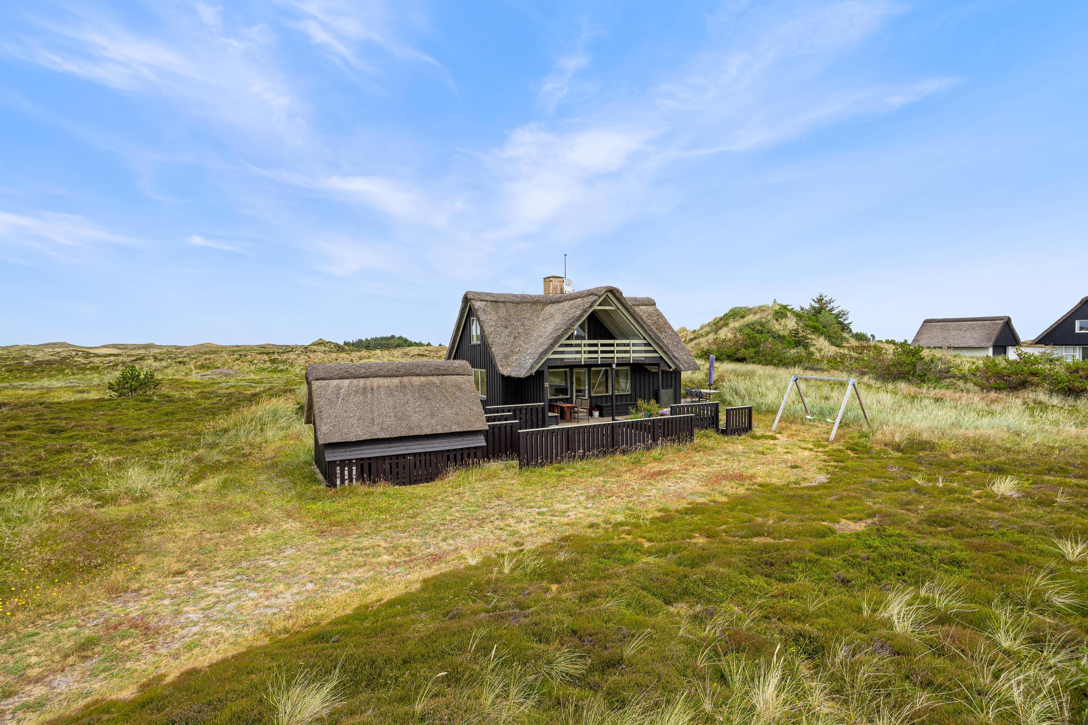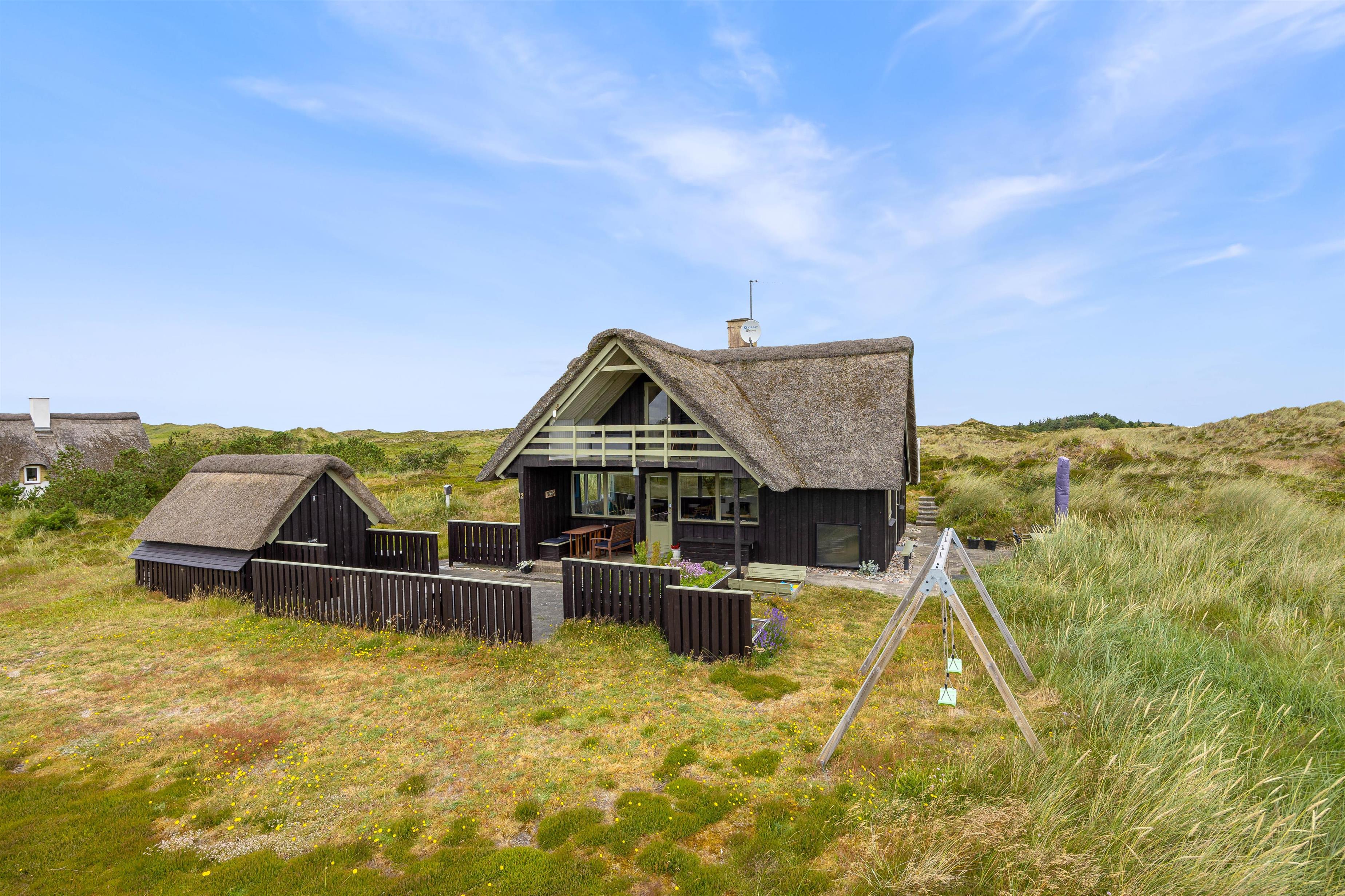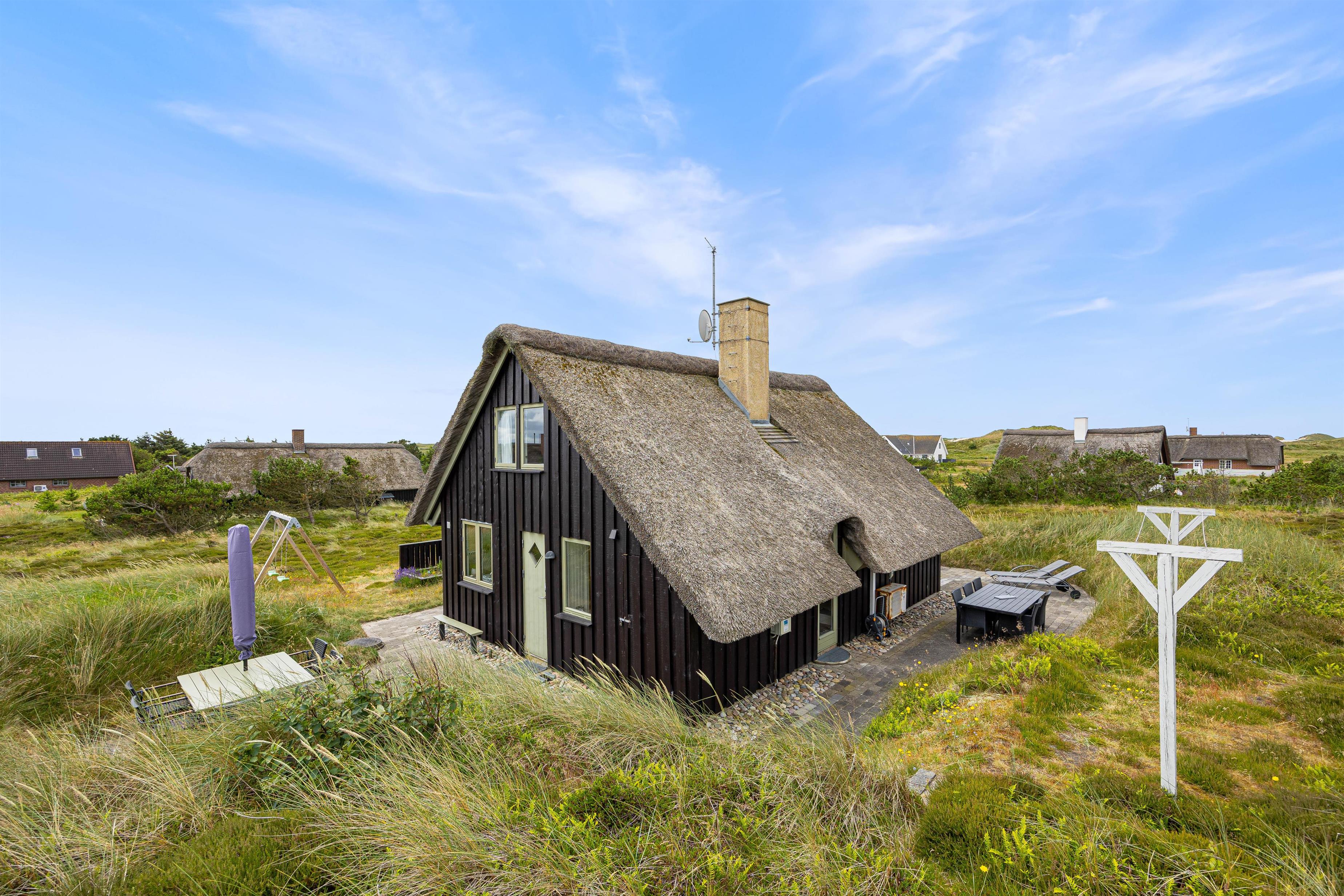 Dette stråtækte sommerhus har en lys og personlig indretning med køkken i forbindelse med både spiseafdeling og opholdsafdeling med brændeovn. Herfra fører en trappe til 1. sal, hvor der er en altan med udsigt over området samt 2 soveværelser med dobbeltsenge, som sammen med de 2 enkeltsenge i stueetagen giver plads til 6 personer. Sommerhuset har et badeværelse med gulvvarme, og kan også opvarmes med den energibesparende luft til luft varmepumpe.