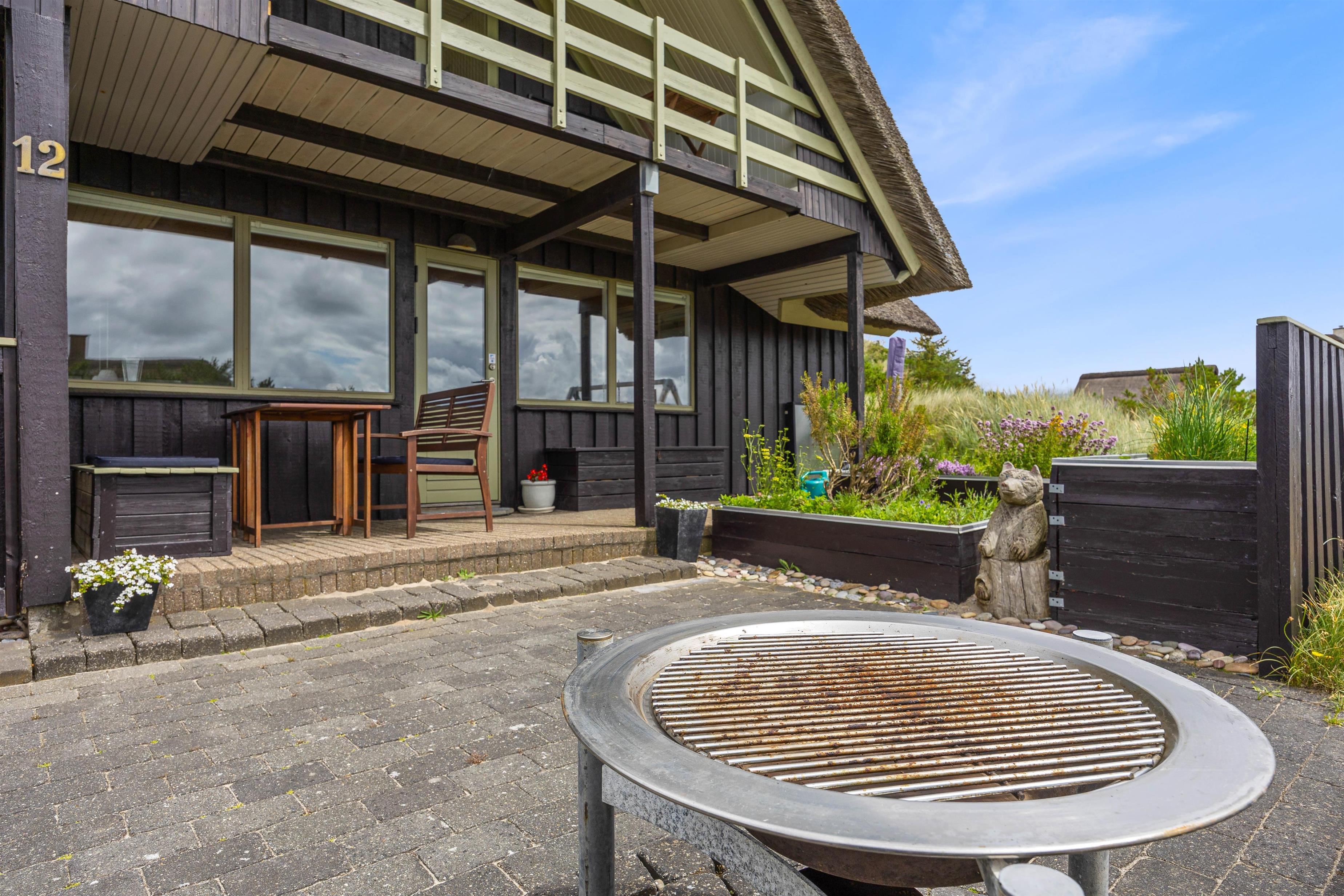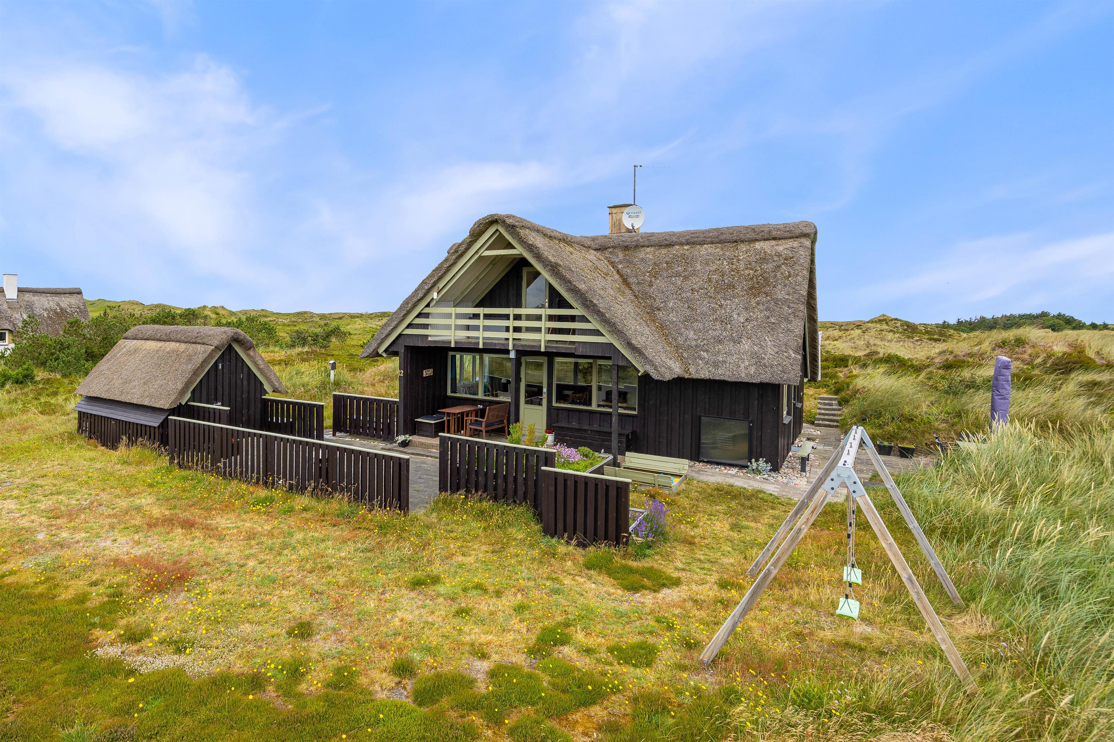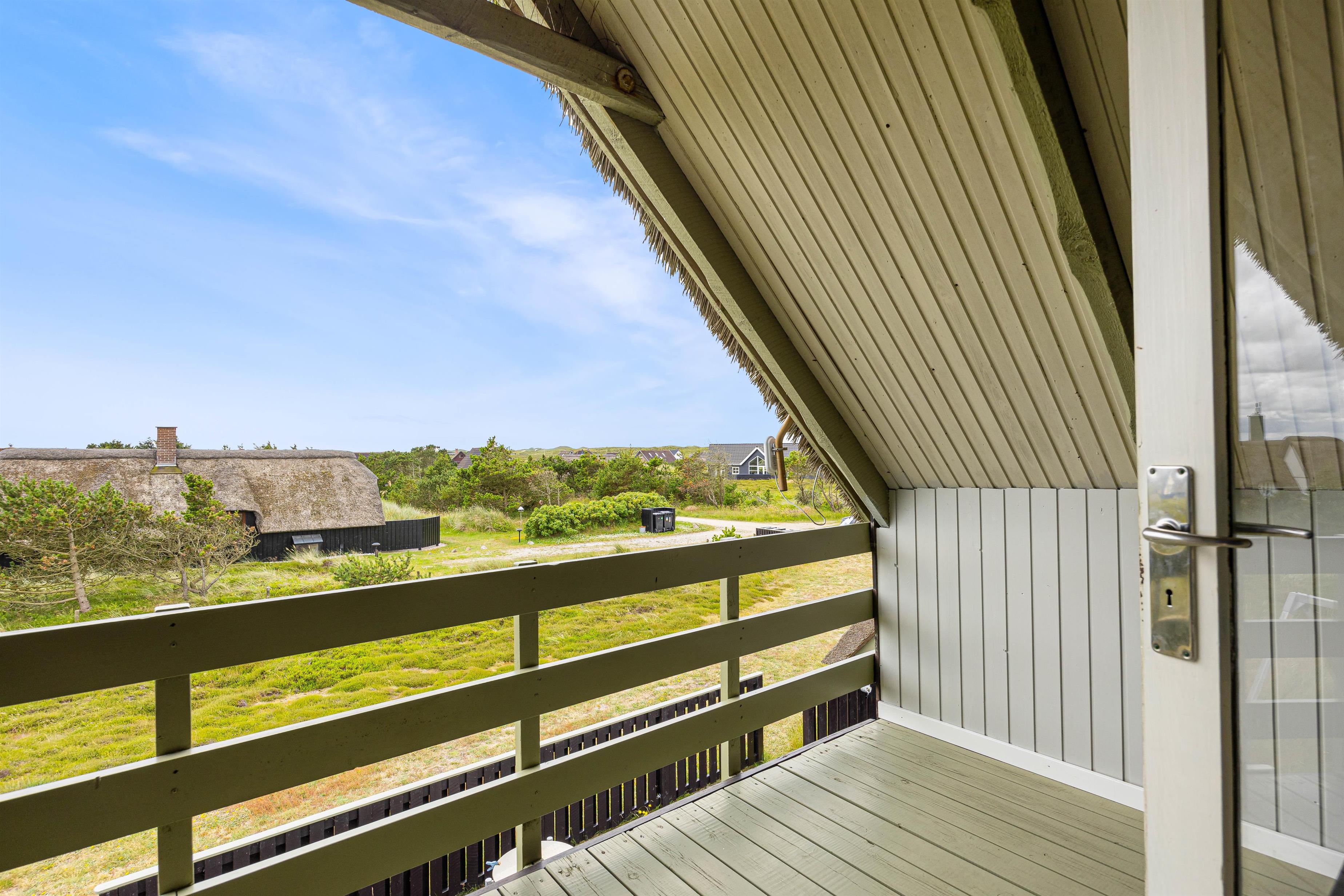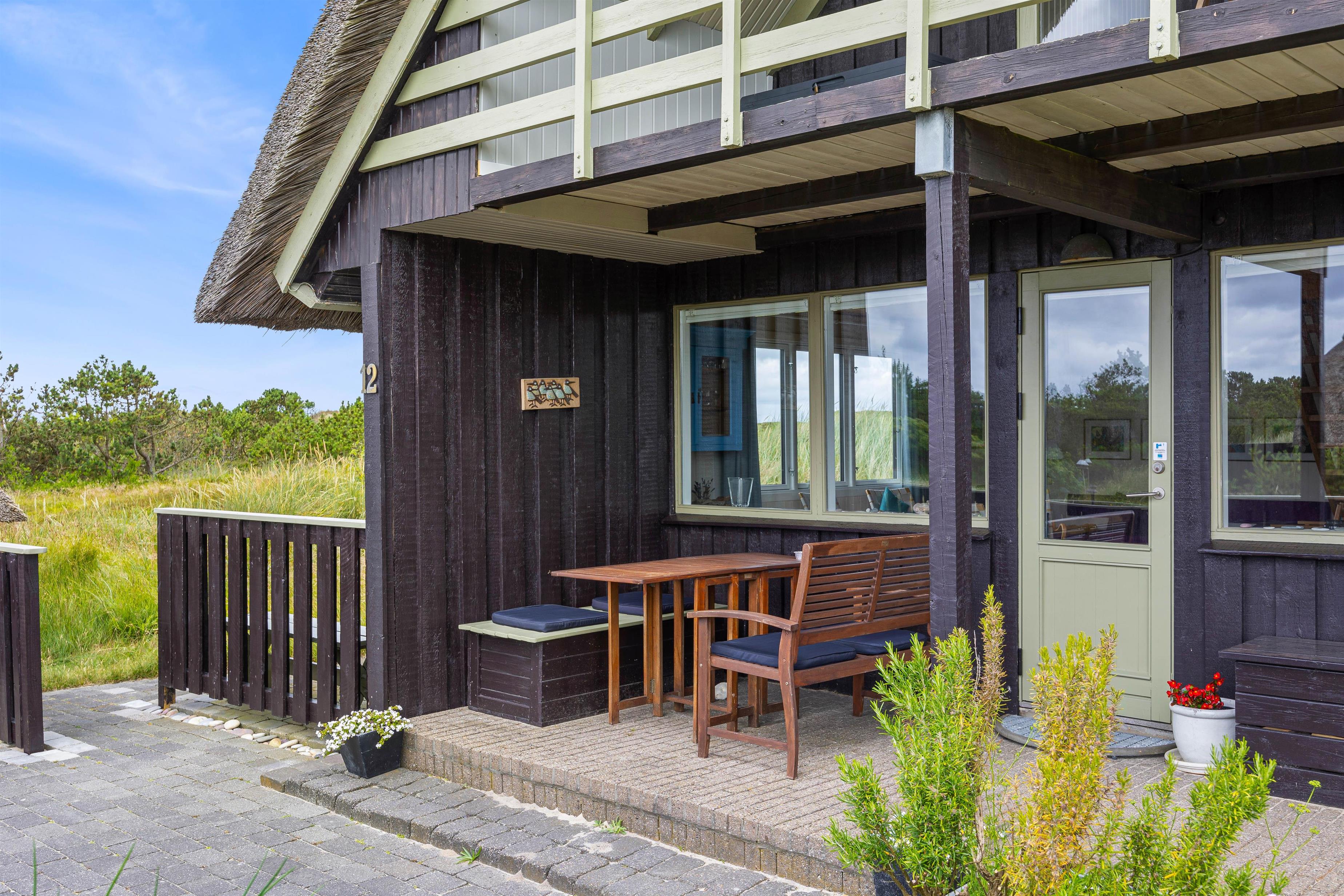 Dette stråtækte sommerhus har en lys og personlig indretning med køkken i forbindelse med både spiseafdeling og opholdsafdeling med brændeovn. Herfra fører en trappe til 1. sal, hvor der er en altan med udsigt over området samt 2 soveværelser med dobbeltsenge, som sammen med de 2 enkeltsenge i stueetagen giver plads til 6 personer. Sommerhuset har et badeværelse med gulvvarme, og kan også opvarmes med den energibesparende luft til luft varmepumpe.