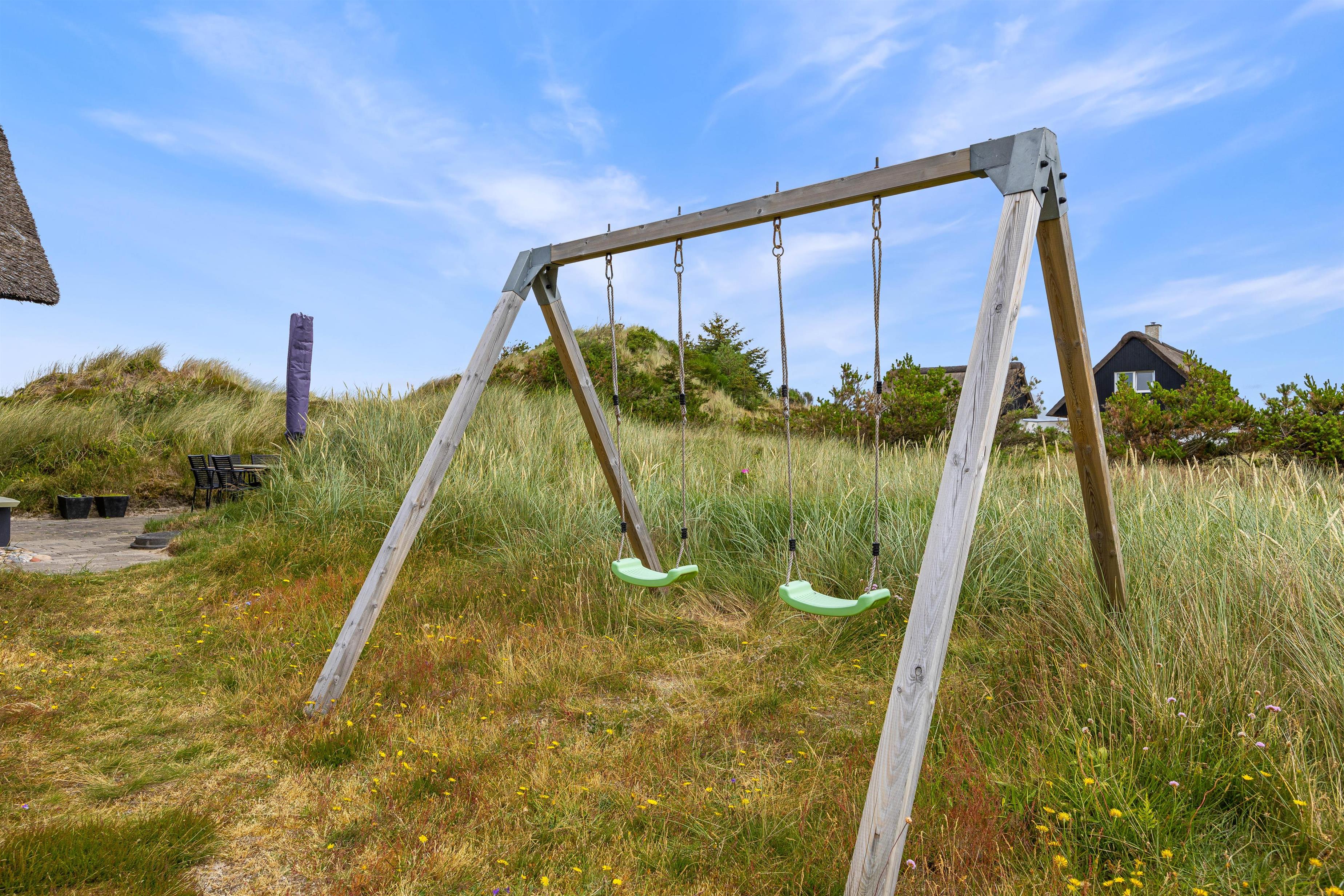 Ved sommerhuset er der også tænkt på underholdning og faciliteter for de små. Mens de voksne kan slå sig ned i havemøblerne og på liggestolene, kan børnene bruge tid i sandkassen og på gyngestativet. Om aftenen kan I lave mad på sommerhusets grill, hvilket helt sikkert falder i god smag hos både børn og voksne.