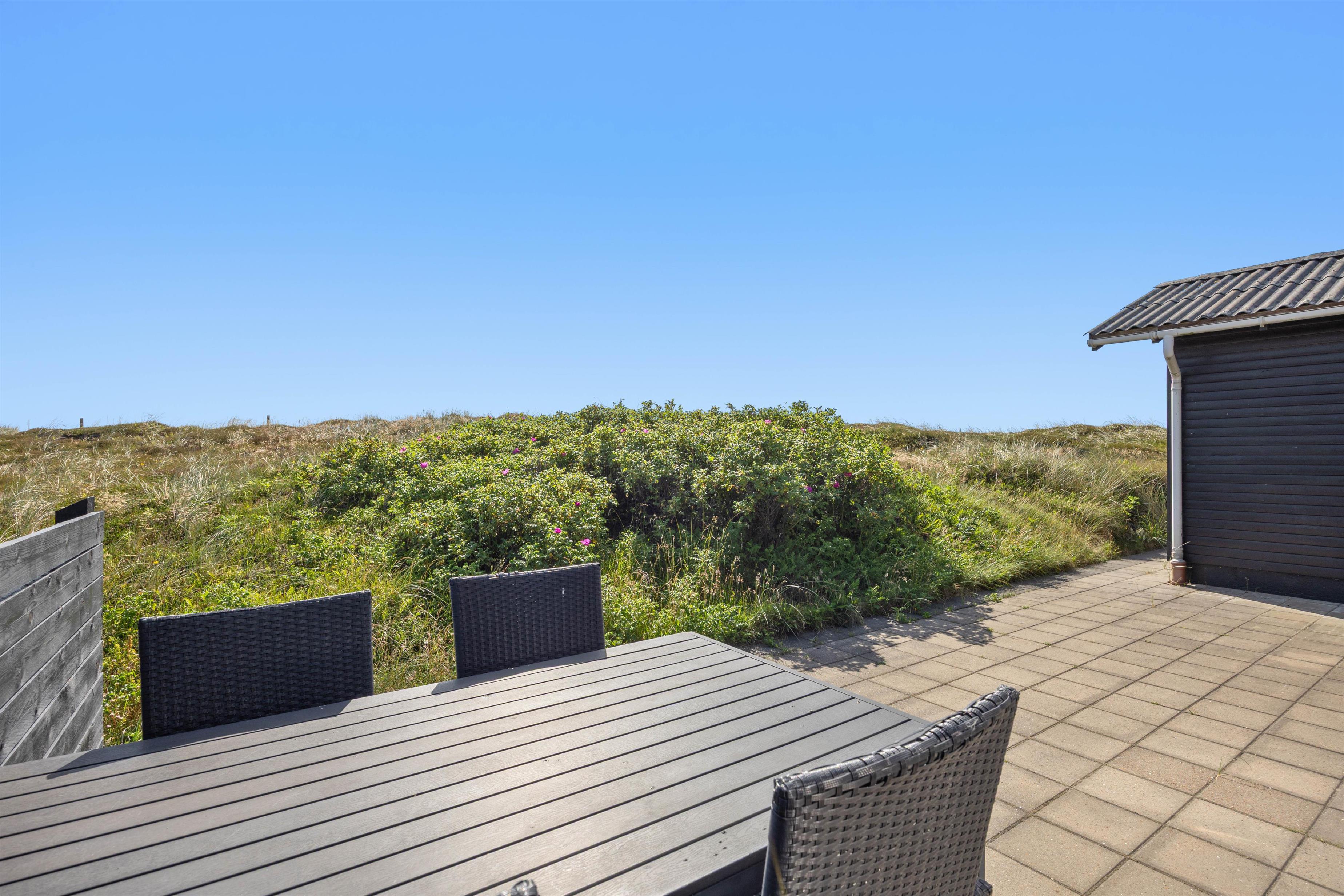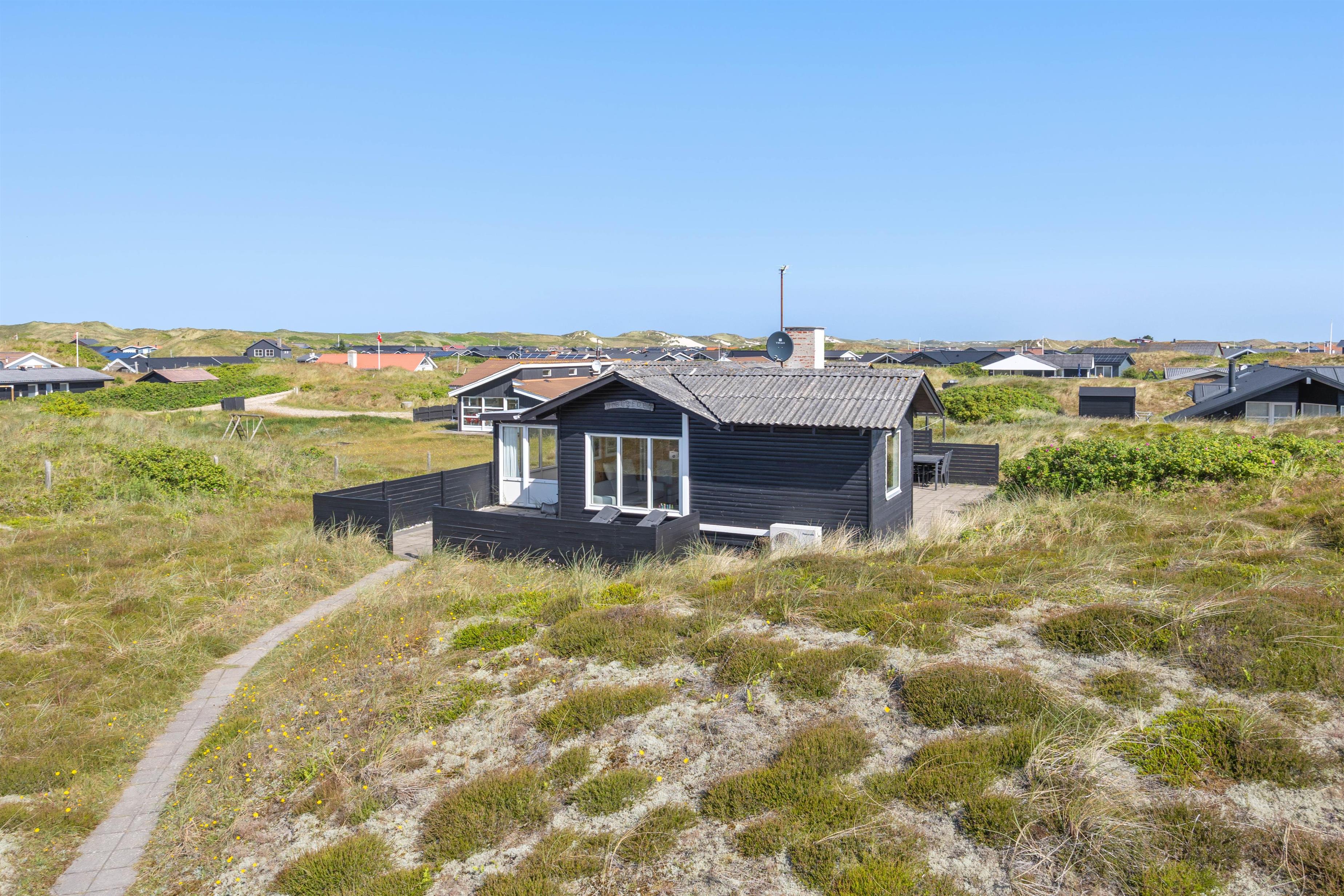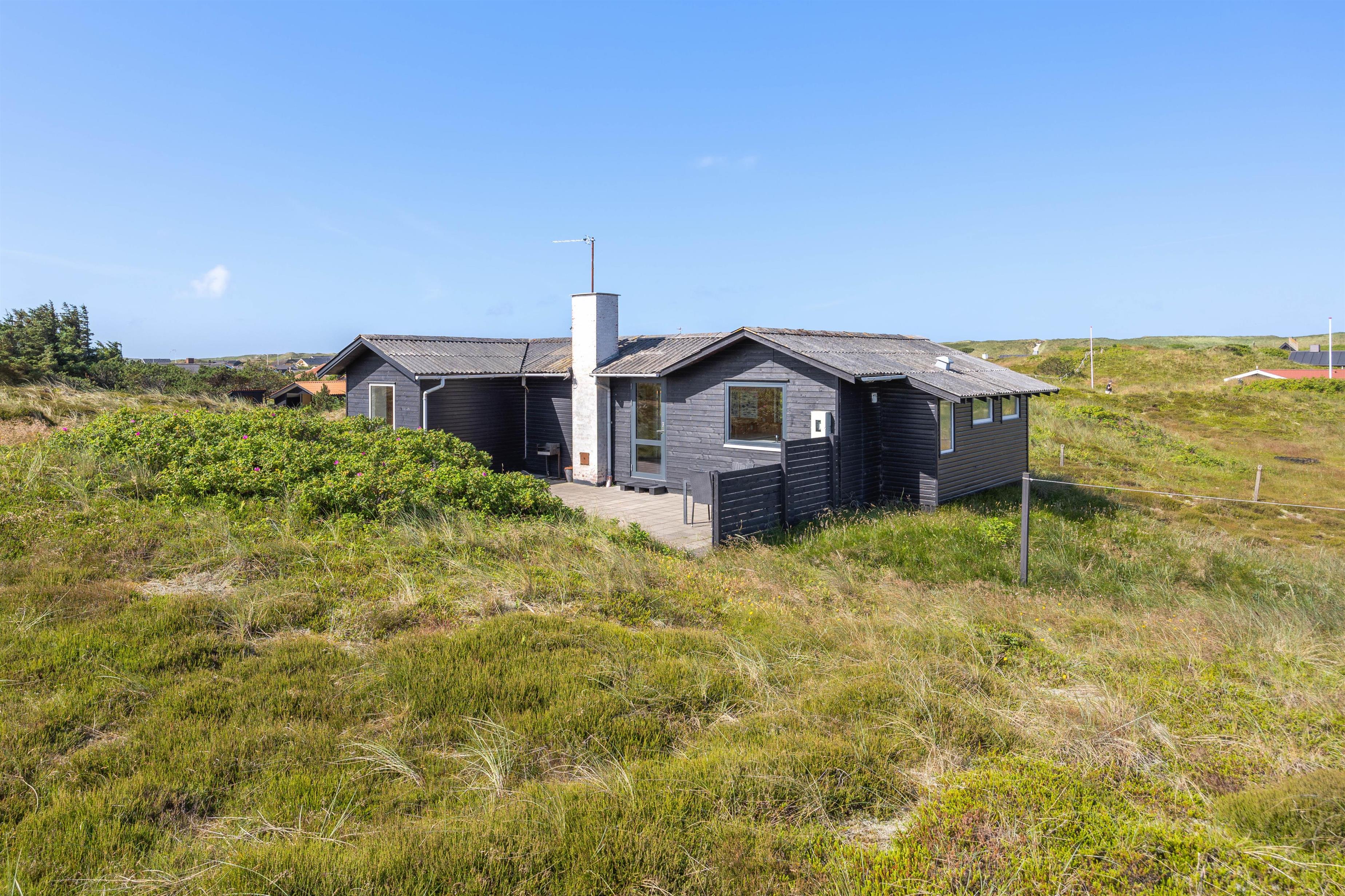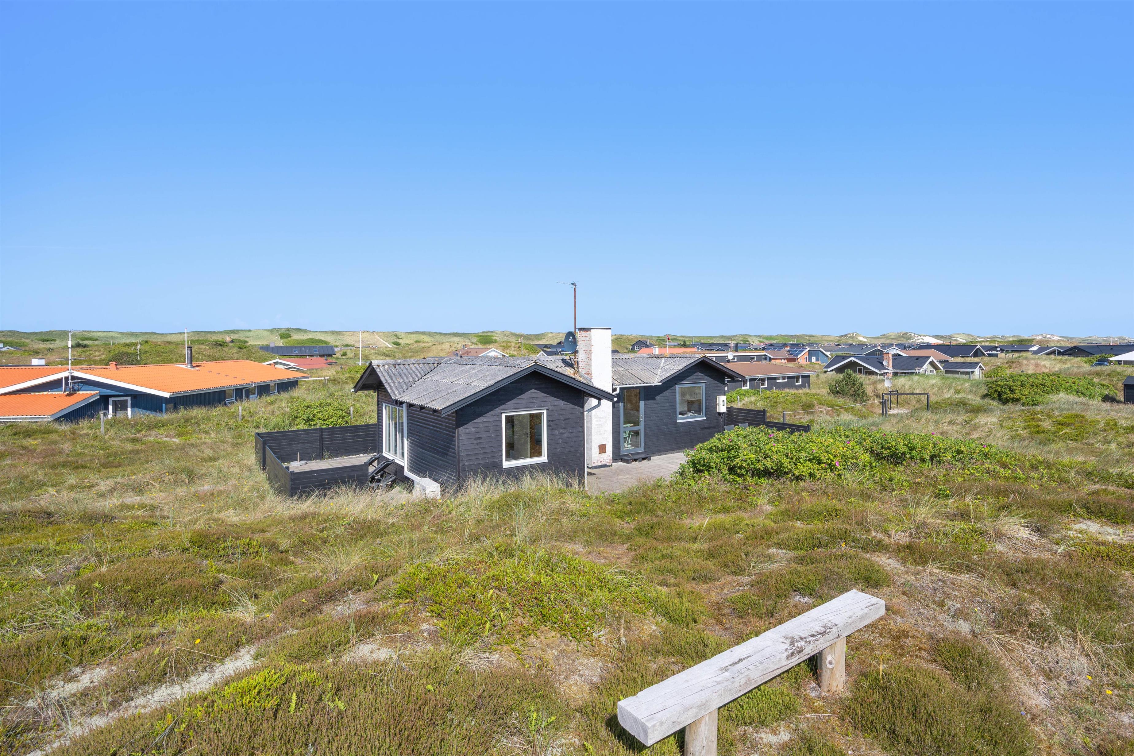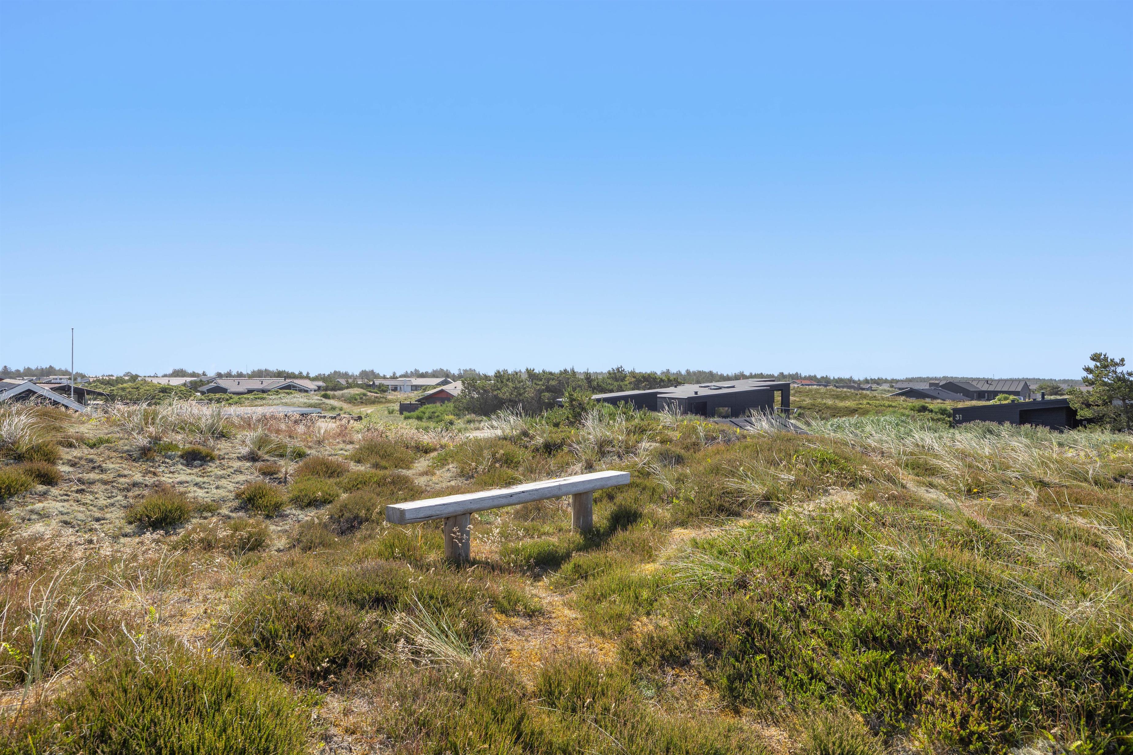 Feriehuset ligger på en højtliggende og kuperet naturgrund i Bjerregård - tæt på sandstrand og Vesterhavet mod vest, samt indkøbsmuligheder og Ringkøbing Fjord mod øst. Her er en afskærmet terrasse med siddepladser og solvogne. Nyd den farverige himmel under solnedgangen med et glas vin i hånden, mens du sidder på bænken på toppen af en klit.