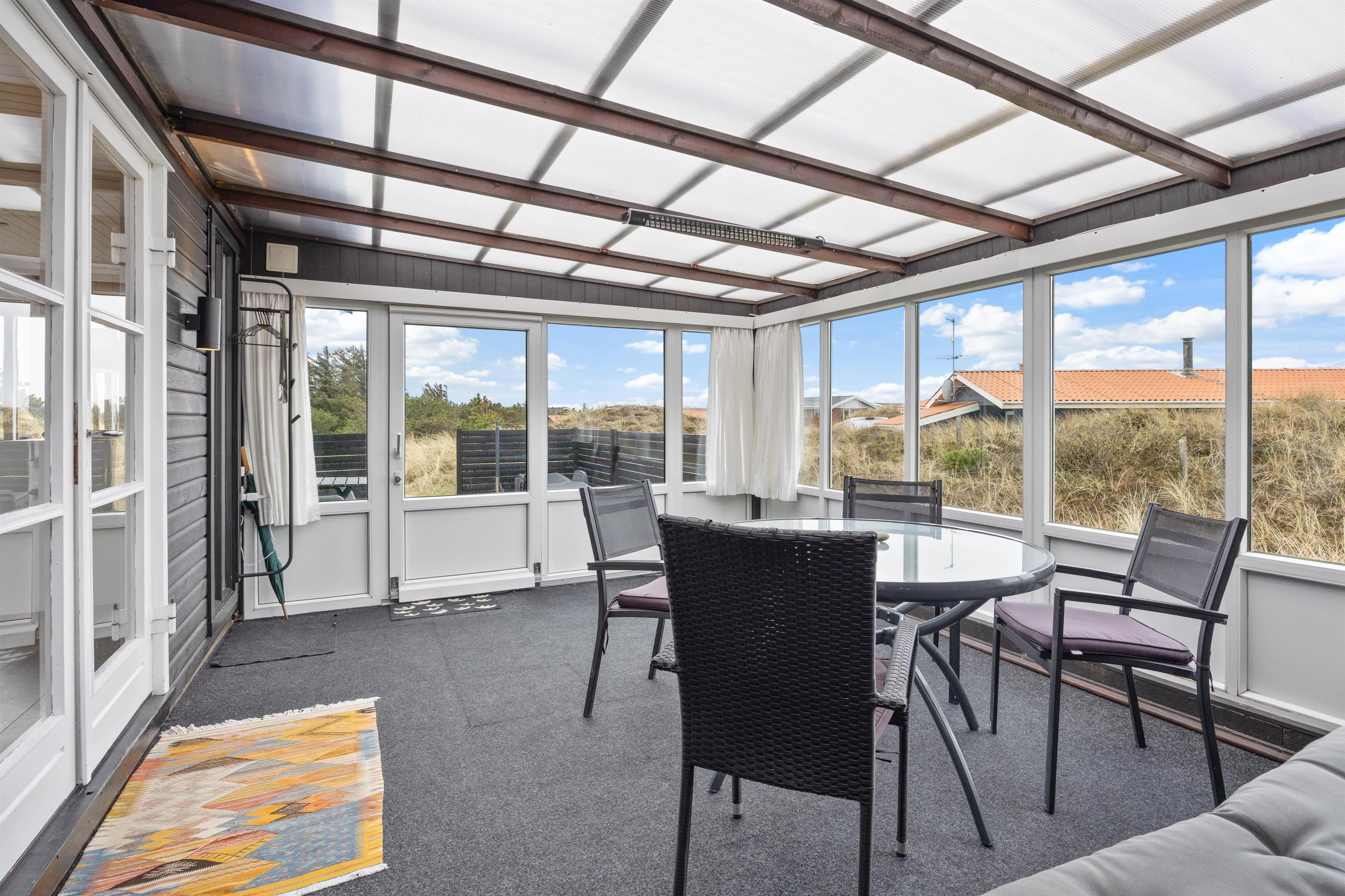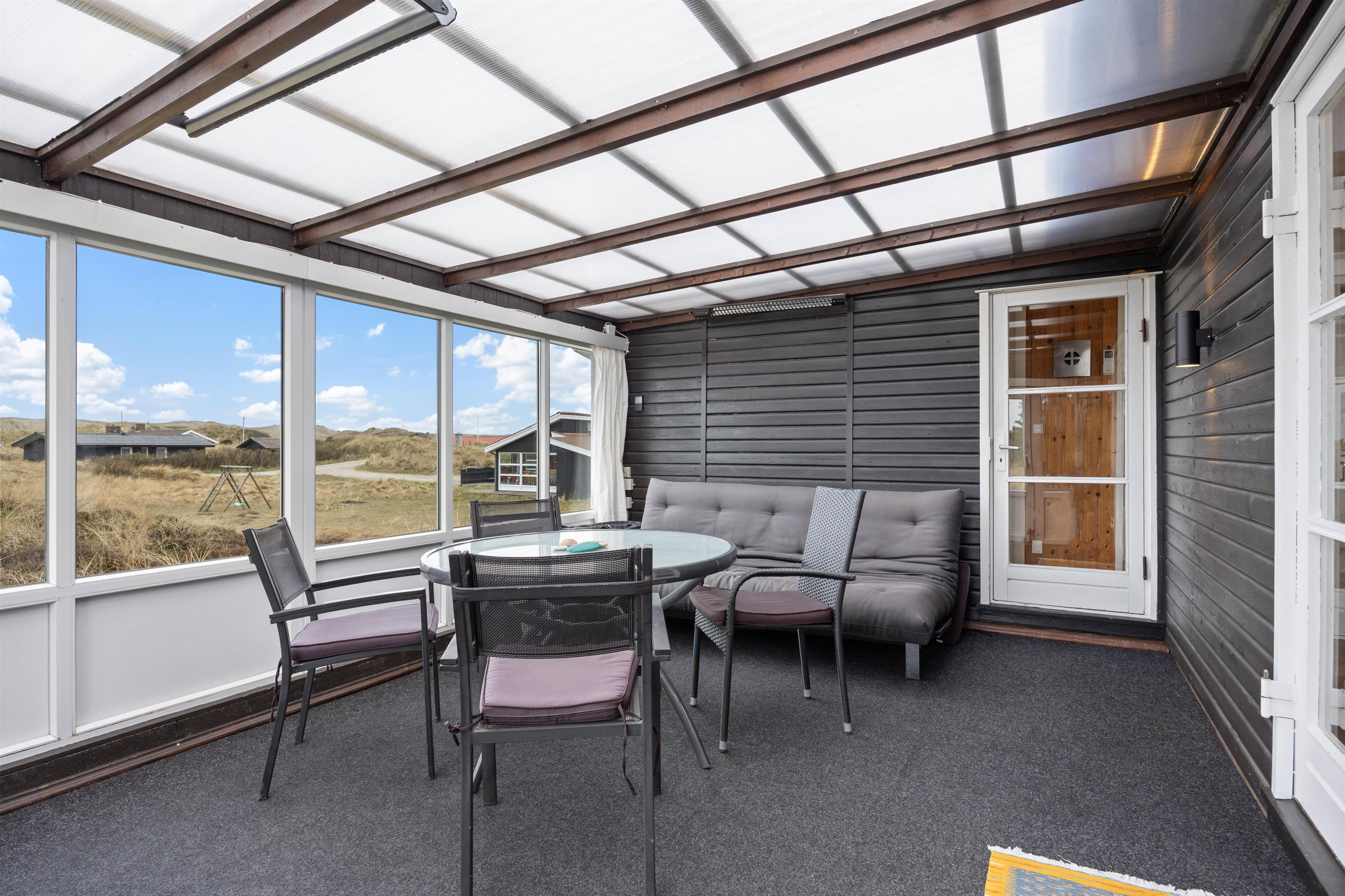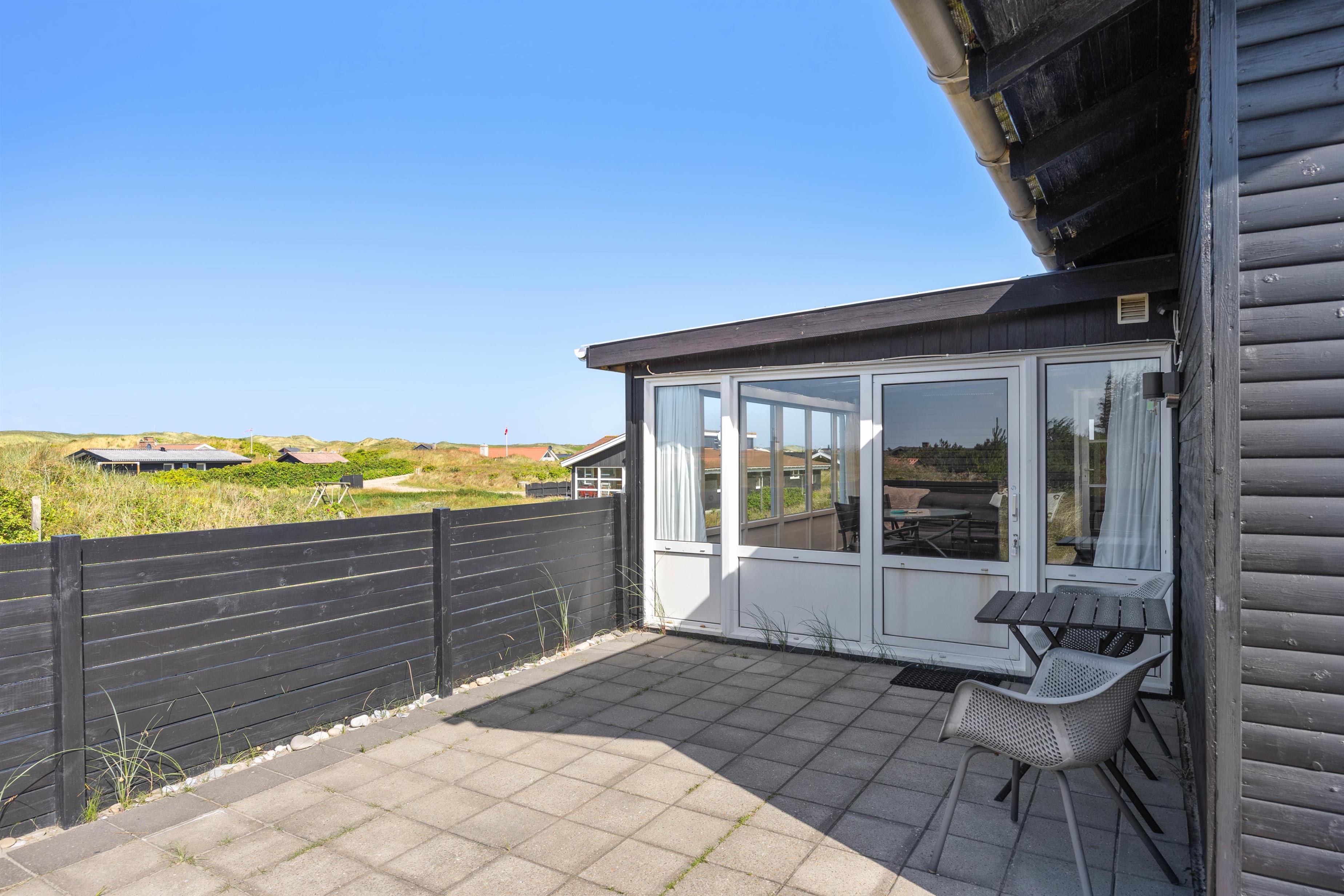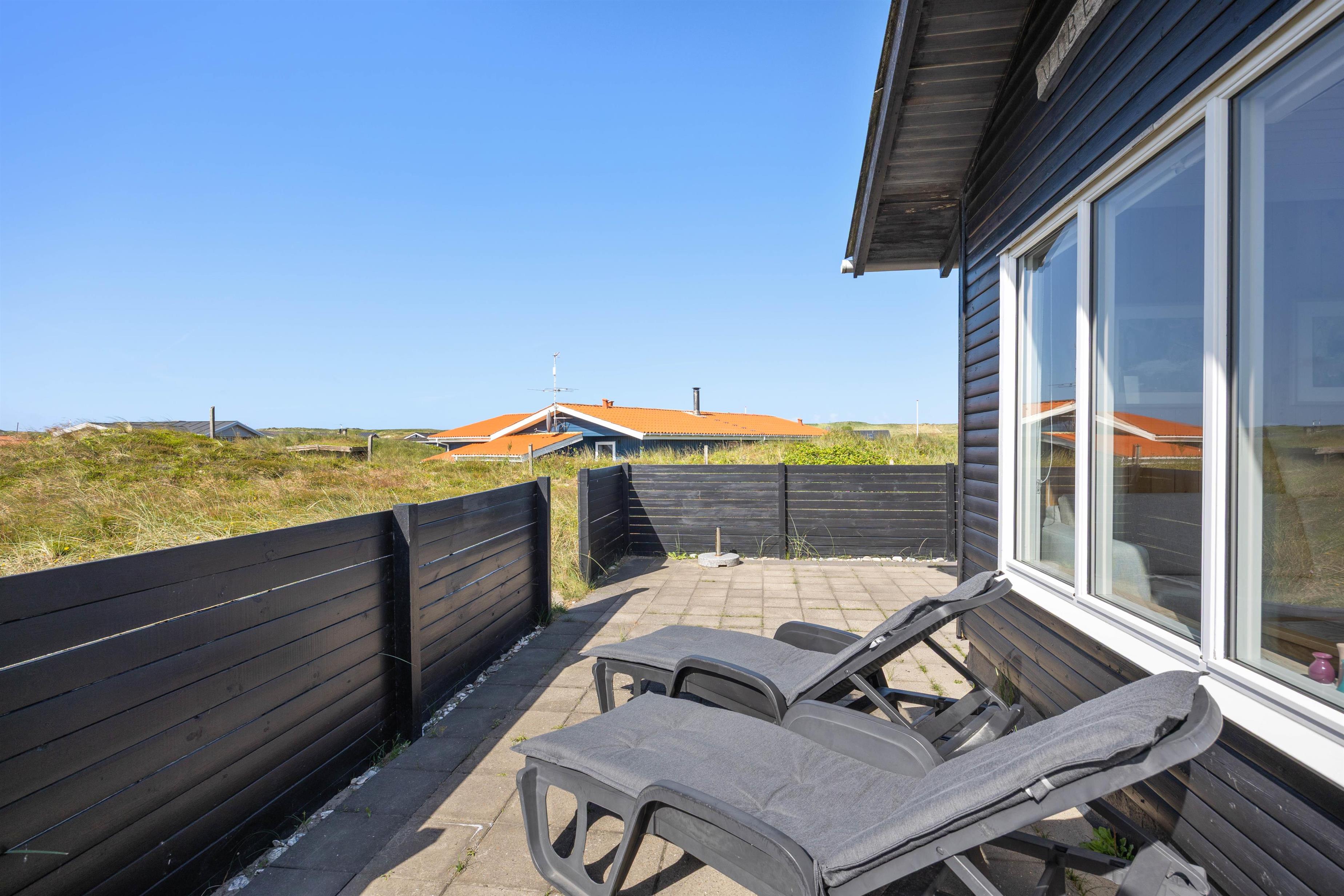 Feriehuset ligger på en højtliggende og kuperet naturgrund i Bjerregård - tæt på sandstrand og Vesterhavet mod vest, samt indkøbsmuligheder og Ringkøbing Fjord mod øst. Her er en afskærmet terrasse med siddepladser og solvogne. Nyd den farverige himmel under solnedgangen med et glas vin i hånden, mens du sidder på bænken på toppen af en klit.