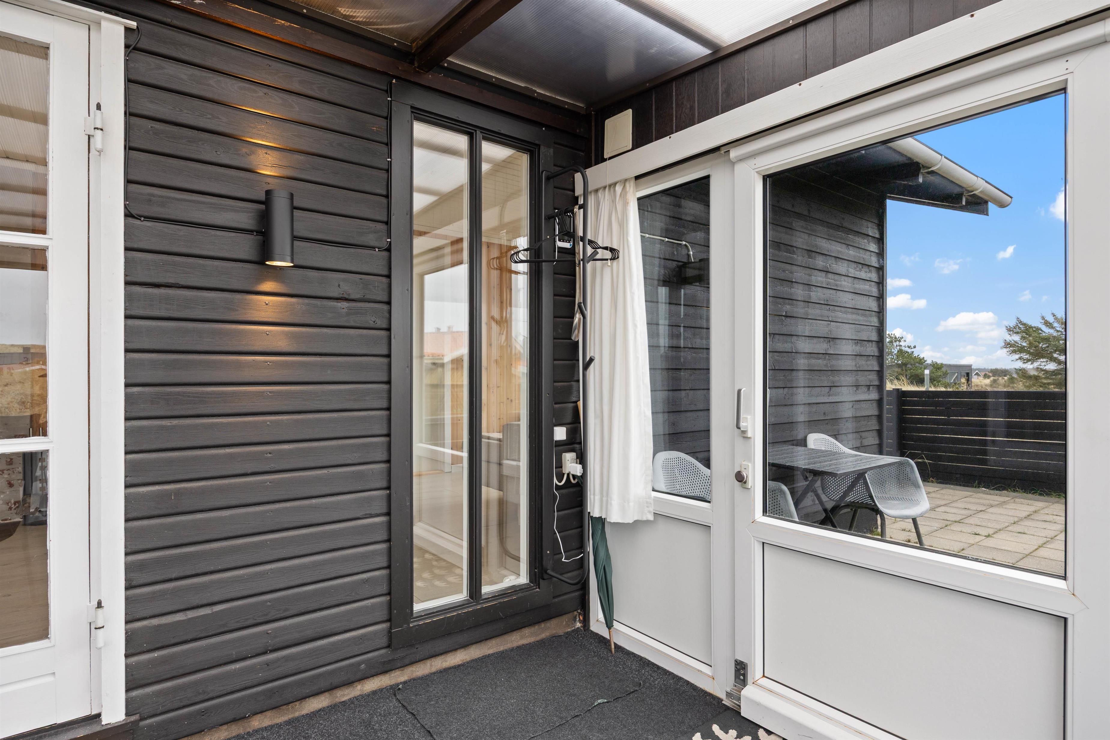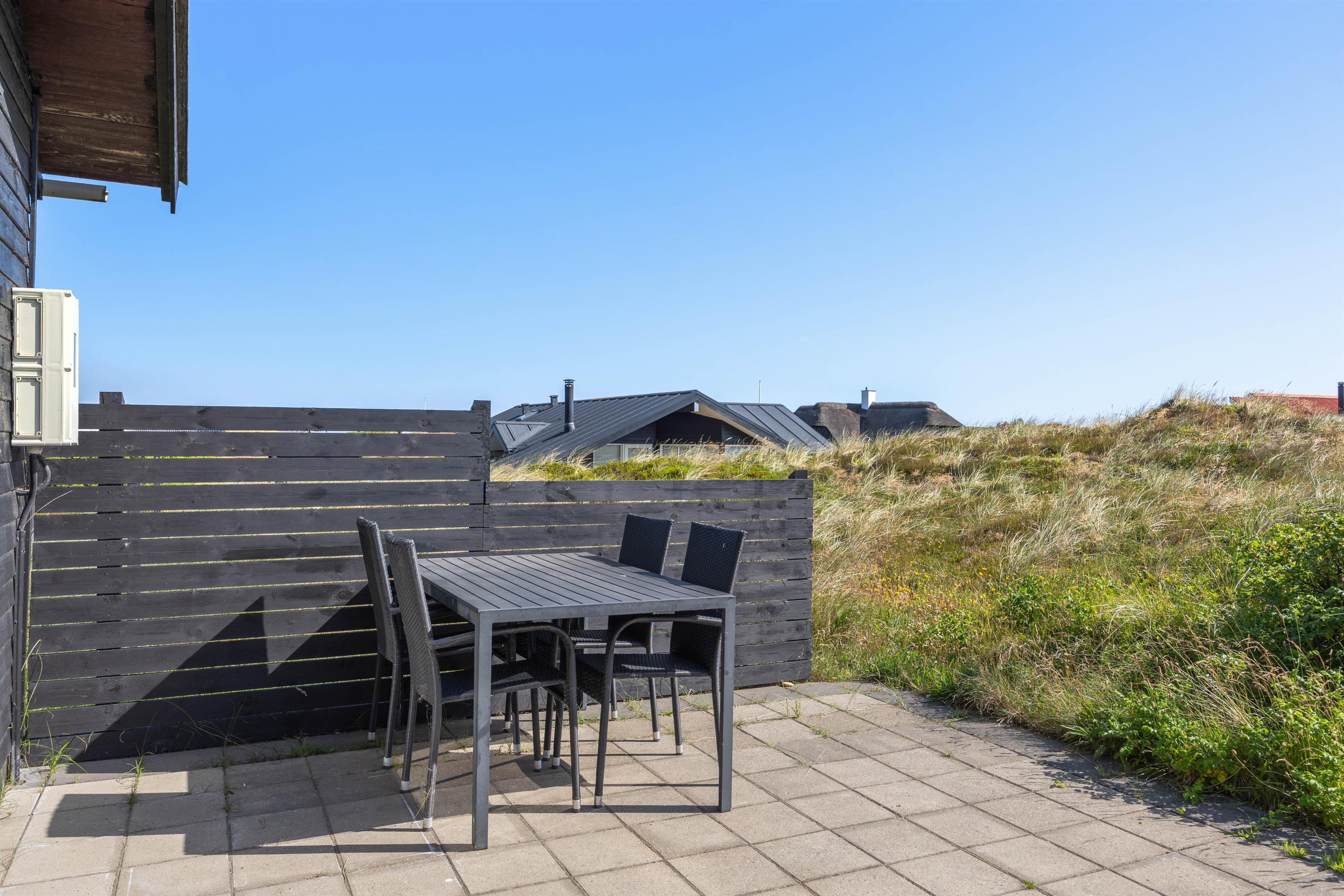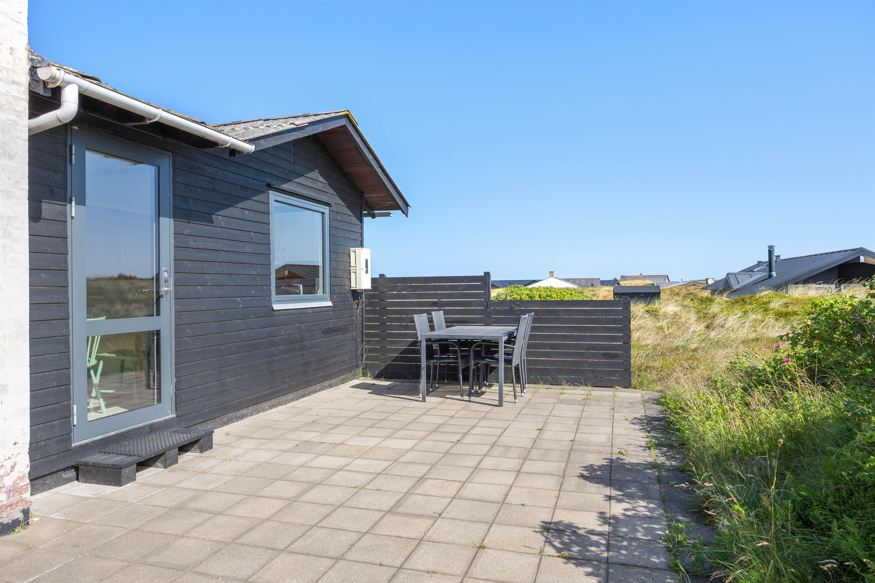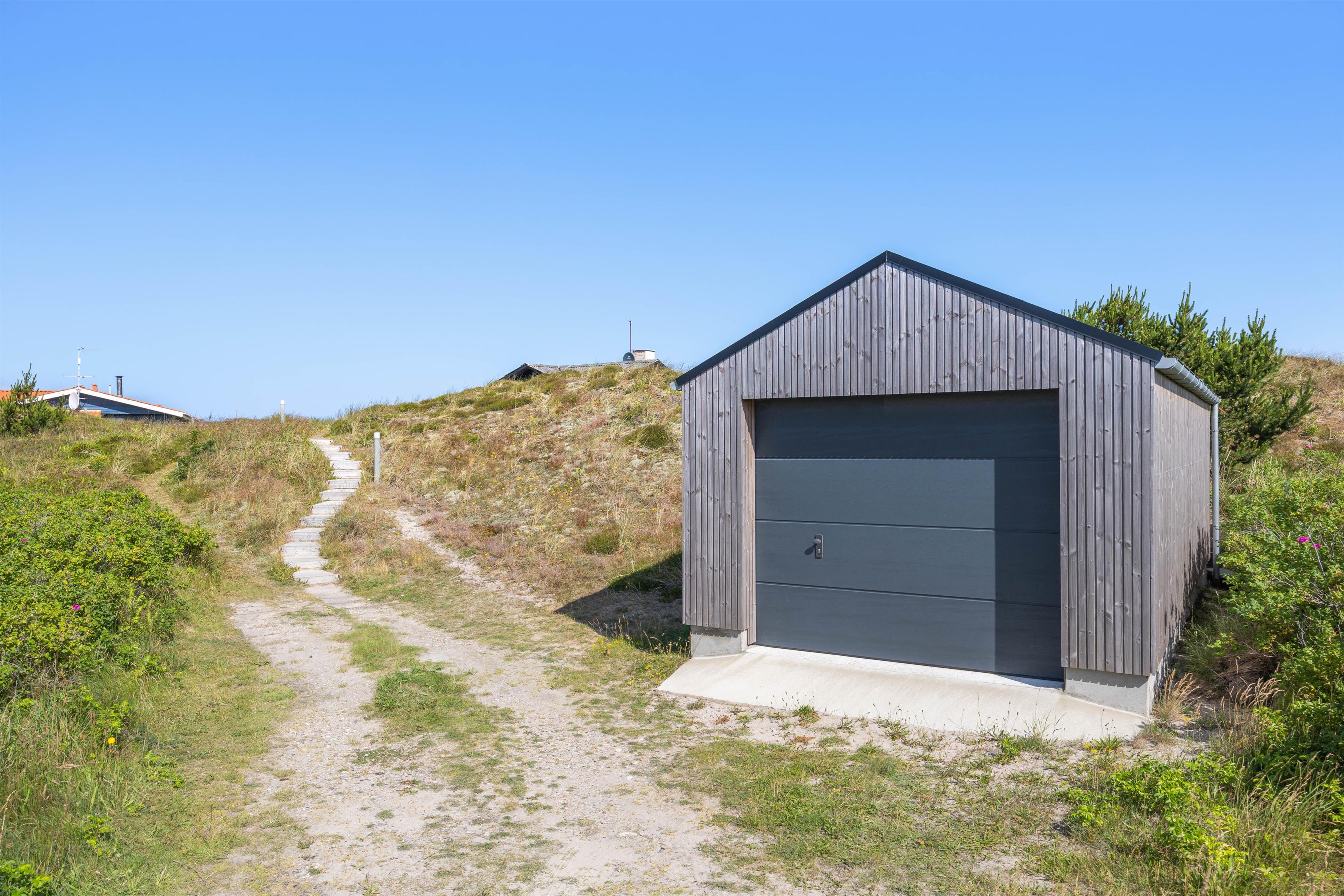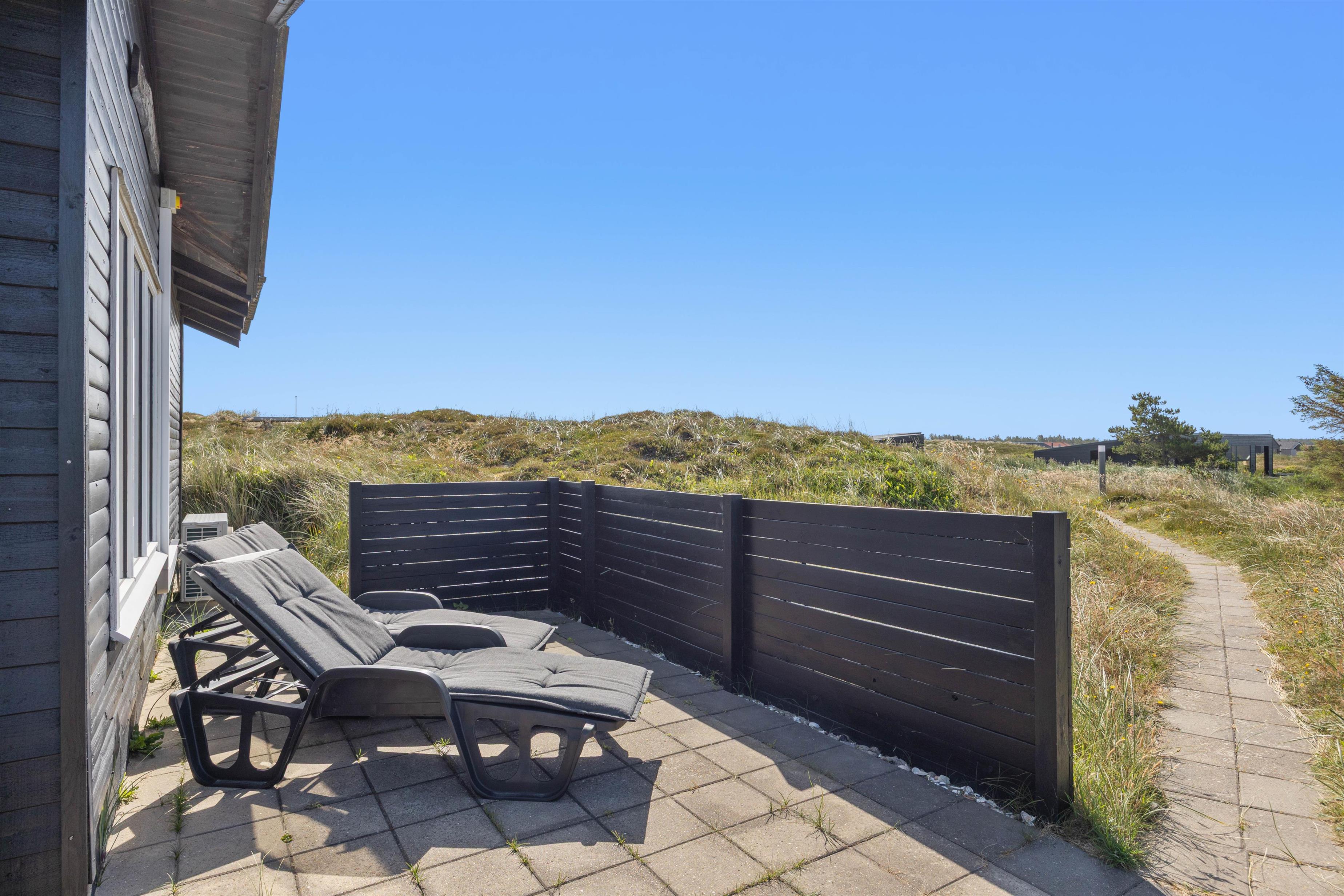 Feriehuset ligger på en højtliggende og kuperet naturgrund i Bjerregård - tæt på sandstrand og Vesterhavet mod vest, samt indkøbsmuligheder og Ringkøbing Fjord mod øst. Her er en afskærmet terrasse med siddepladser og solvogne. Nyd den farverige himmel under solnedgangen med et glas vin i hånden, mens du sidder på bænken på toppen af en klit.