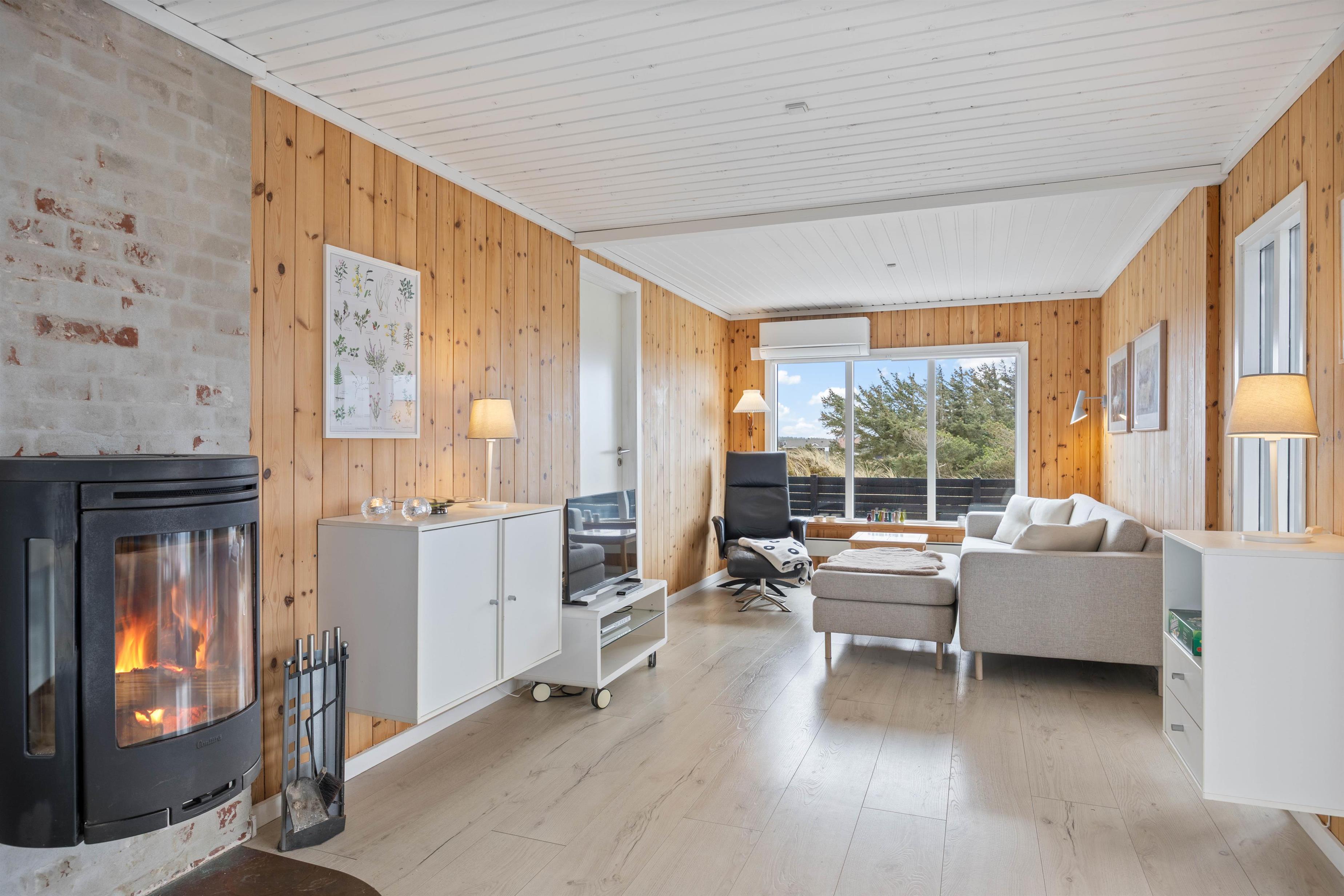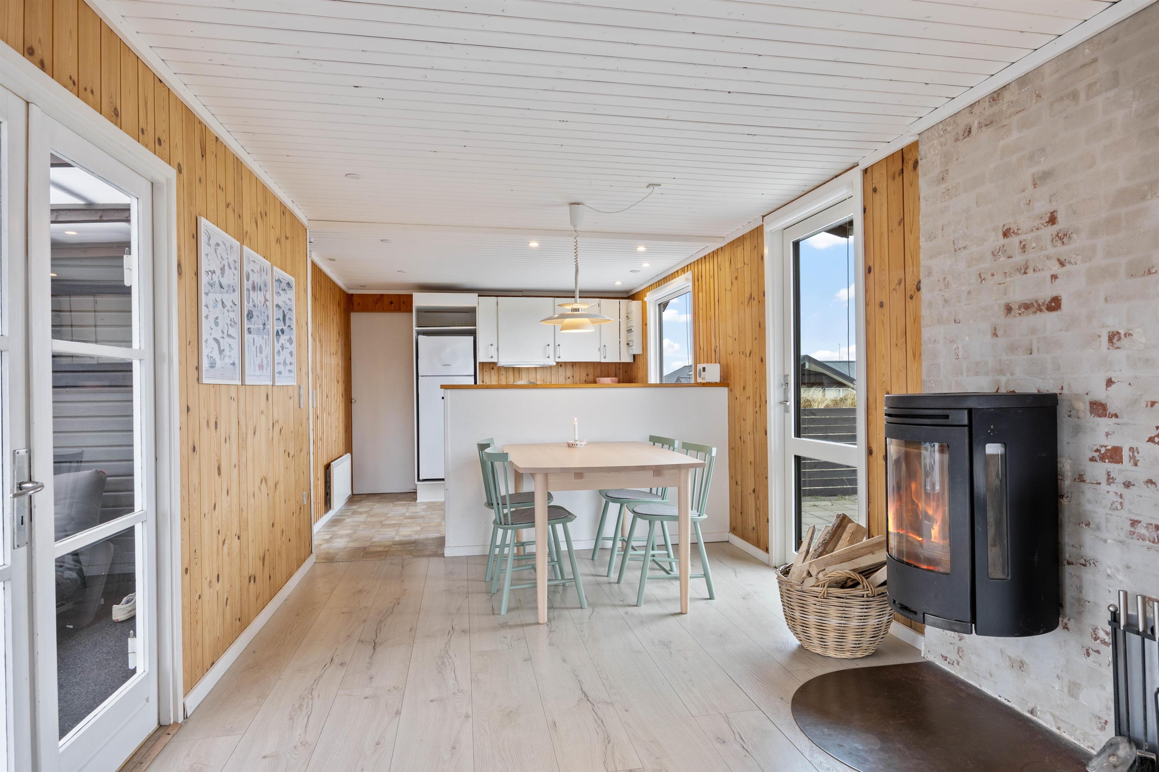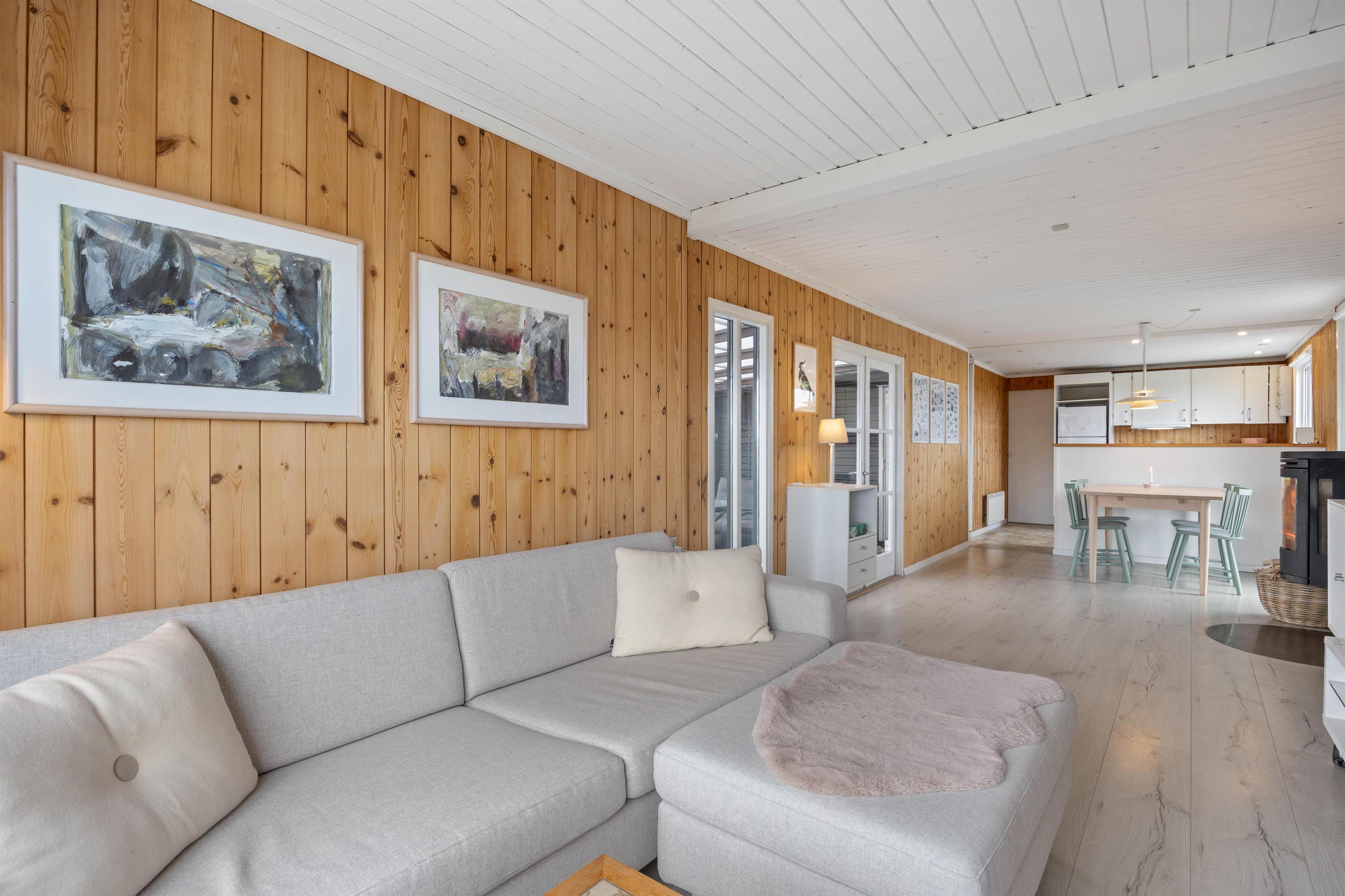 Det hyggelige sommerhus er indrettet med træpaneler og hvidmalede lofter, desuden er der installeret varmepumpe og gratis internet. Fra køkkenafdelingen er der åbent til stue med spiseplads, brændeovn og rustikke lædermøbler.
