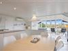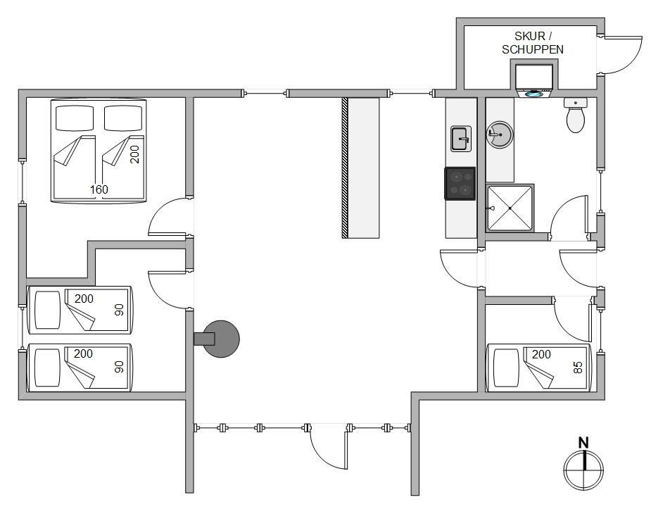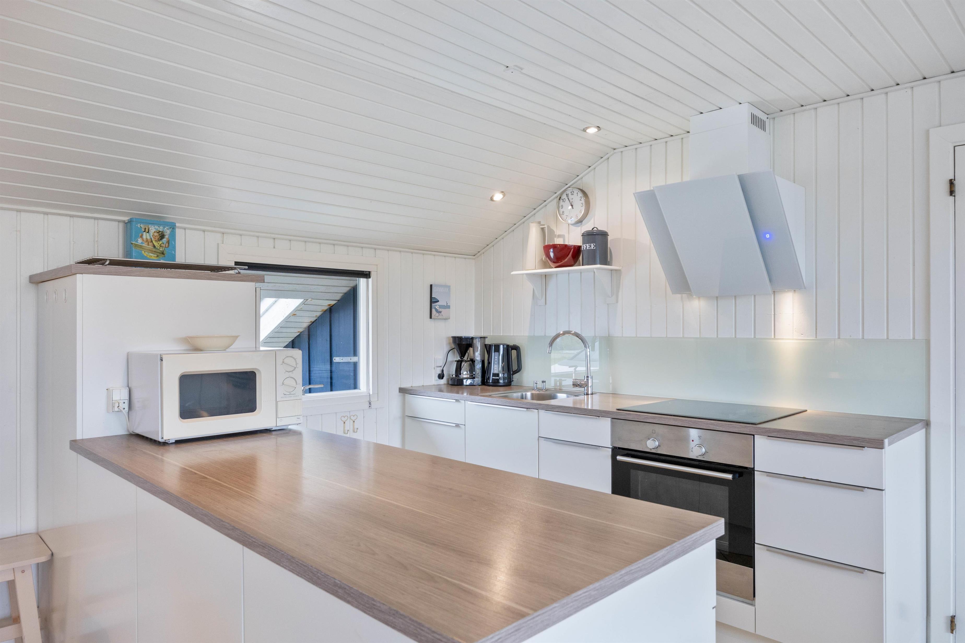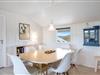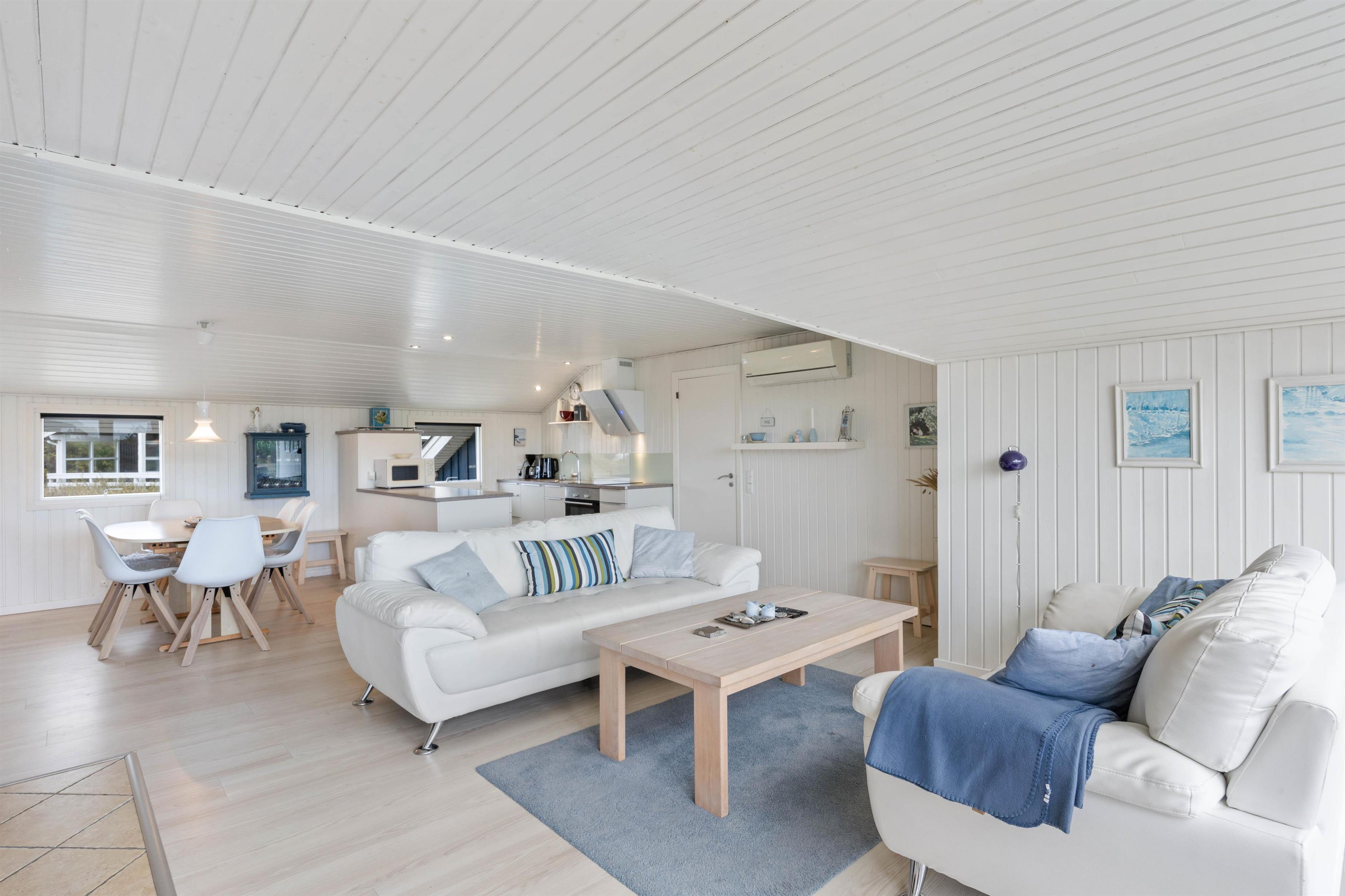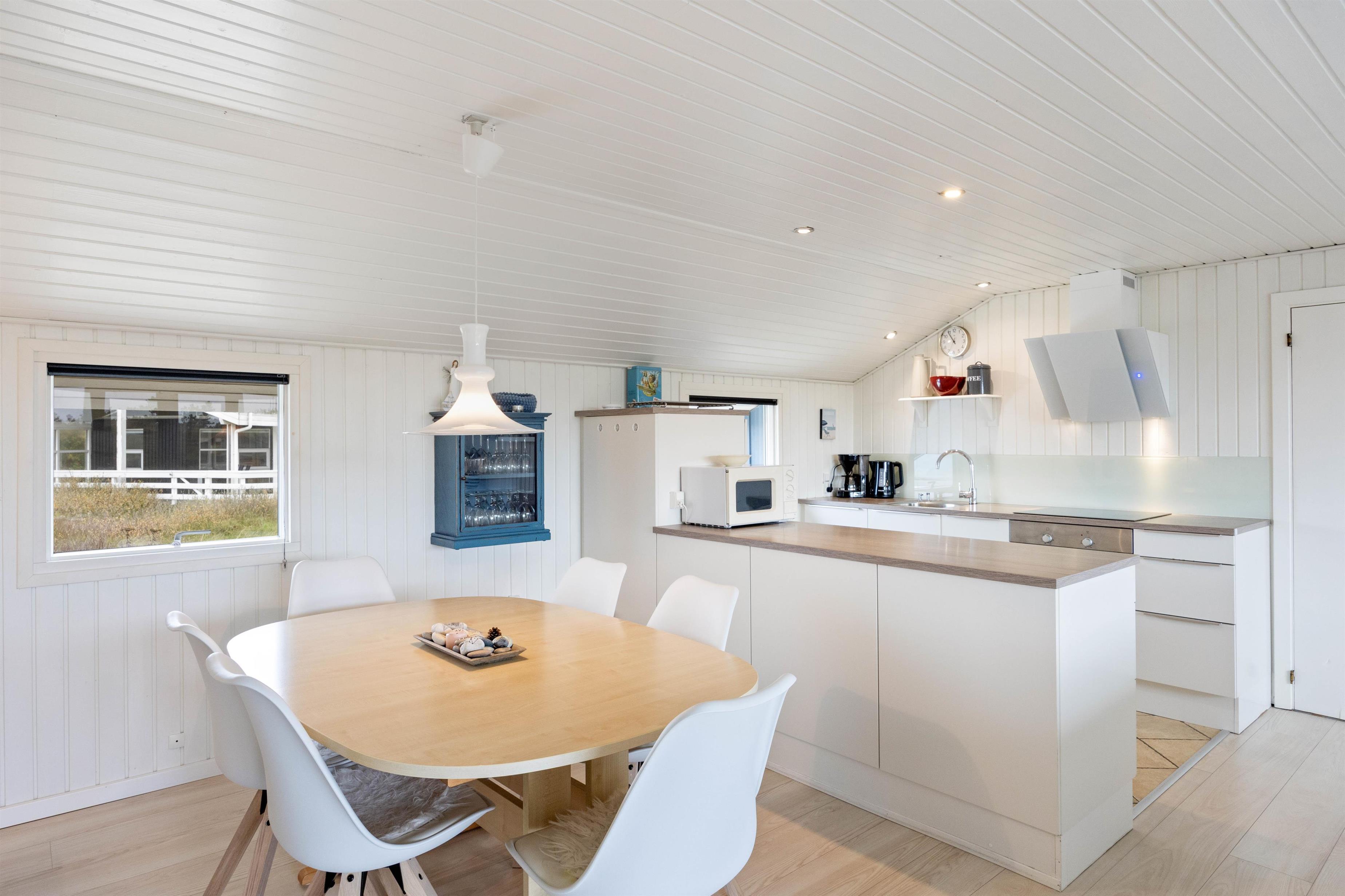 Køkkenet og stuen er i åben forbindelse, hvilket skaber en lys og rummelig atmosfære, hvor hele familien eller gruppen kan samles og nyde hinandens selskab. Den åbne planløsning gør det nemt at tilberede mad, mens I stadig kan være en del af samtalerne i stuen. Stuen fungerer som det naturlige samlingspunkt i sommerhuset, hvor I kan slappe af og hygge jer sammen. Den indbydende atmosfære skabes ikke kun af den lyse indretning, men også af den hyggelige brændeovn, som både varmer stuen effektivt op og giver en hyggelig stemning. For ekstra komfort er der også en energibesparende varmepumpe.